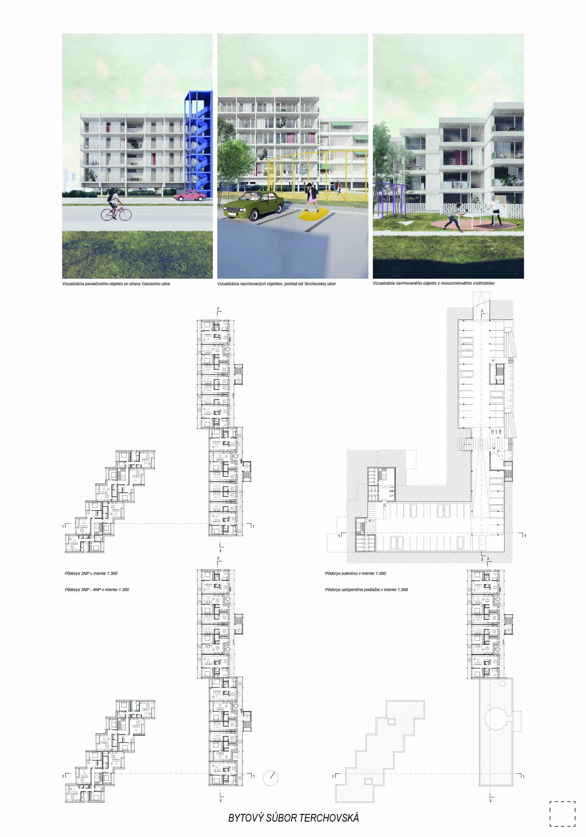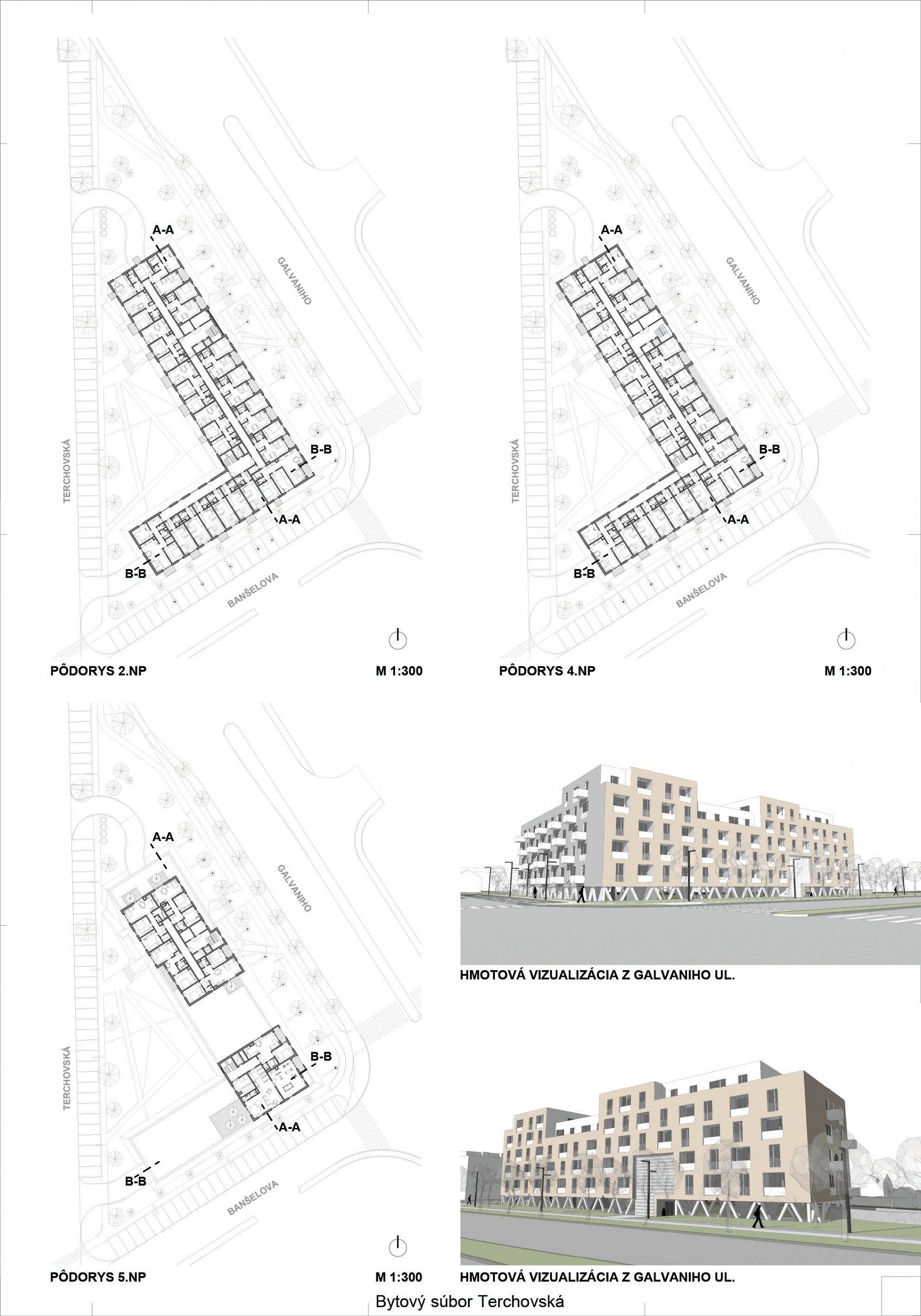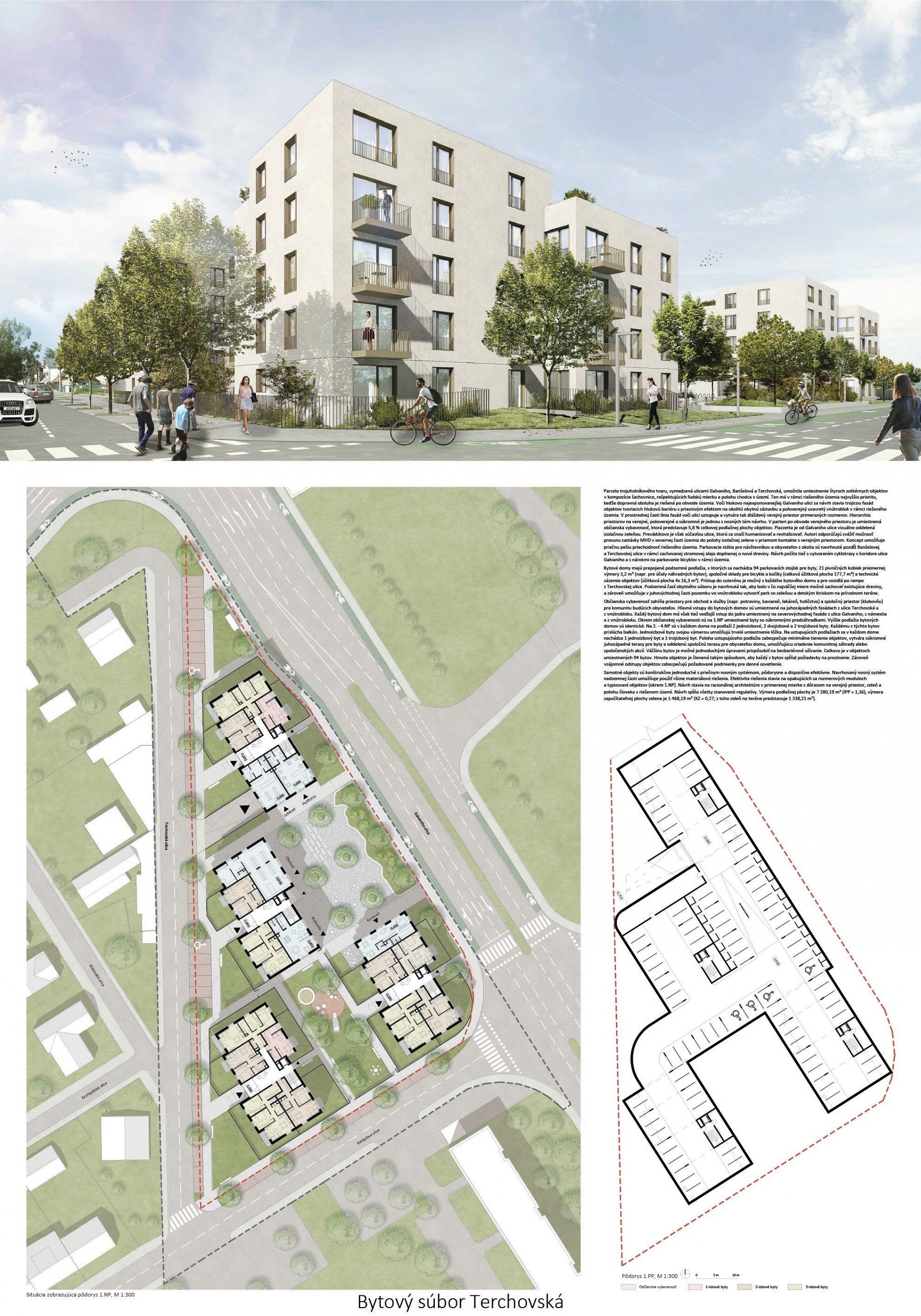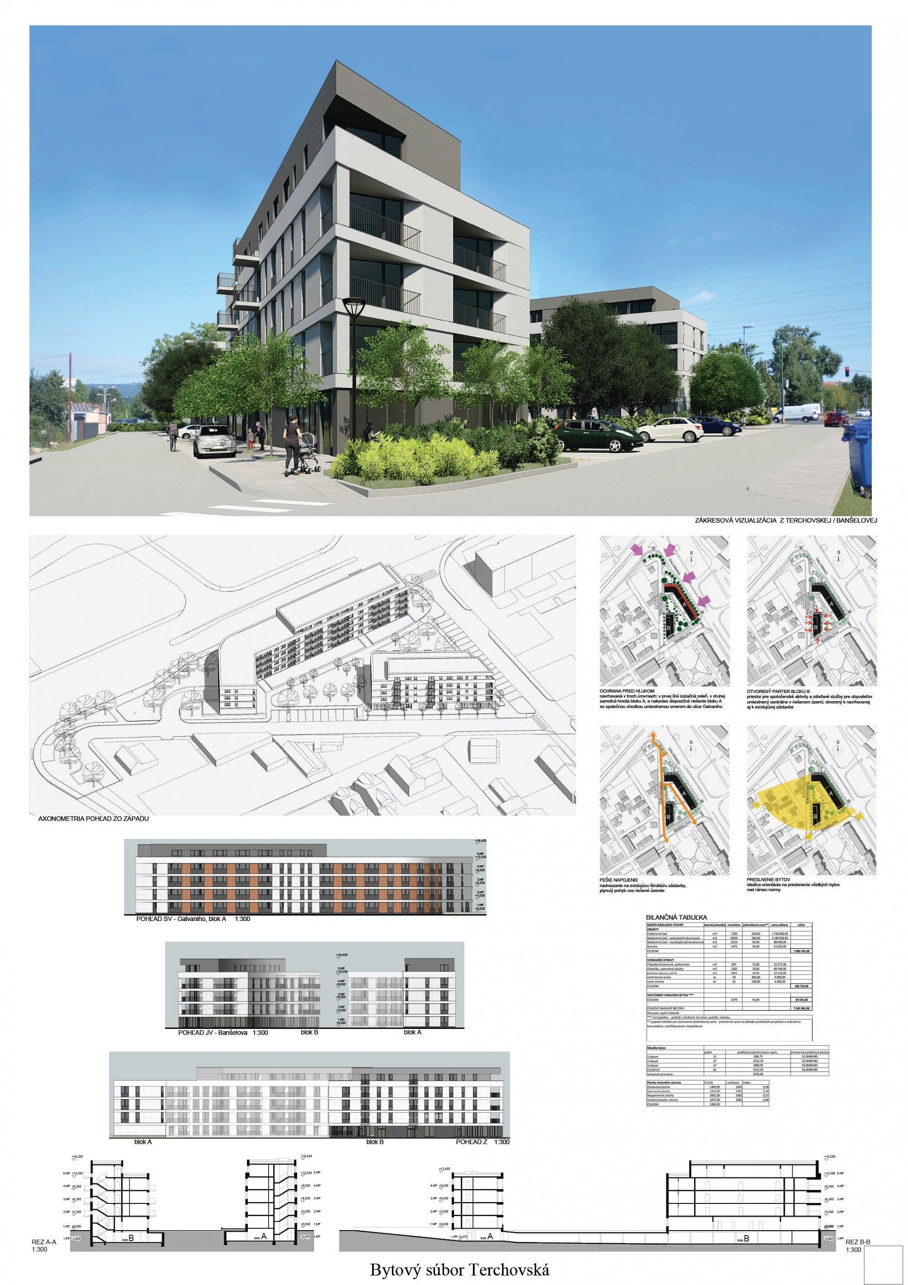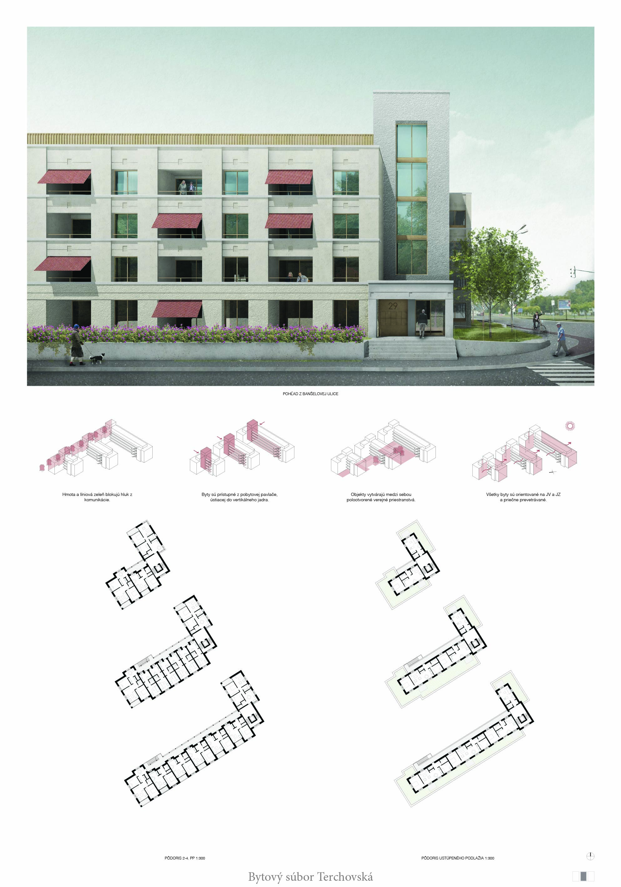 Pri víťaznom návrhu vyzdvihujeme predovšetkým vynikajúce urbanistické riešenie a citlivé začlenenie do územia. Bariérový pavlačový dom odtieňuje hluk z Galvaniho ulice a logicky dopĺňa rad štvorpodlažných panelových domov. Zároveň sa však ku koridoru Galvaniho ulice nestavia chrbtom, keď na oboch priečeliach autori umiestnili priestory vybavenosti. Správnosť tohto rozhodnutia potvrdzuje aj úprava a zvládnutie čelného priestoru pri križovatke Rožňavská - Galvaniho ulica. Skupina menších domov v západnej časti pozemku reaguje na mierku priľahlej zástavby a vytvára tak priepustné poloverejné priestory, ktoré nadväzujú na obdobné priestory medzi panelovými bytovými domami na juhovýchodnej strane Banšelovej ulice. Autori navyše vhodne umiestňujú vjazd do podzemnej halovej garáže do Banšelovej ulice, čím odľahčujú dynamickú dopravu v Terchovskej ulici a potvrdzujú jej status vedľajšej ukľudnenej slepej ulice.
