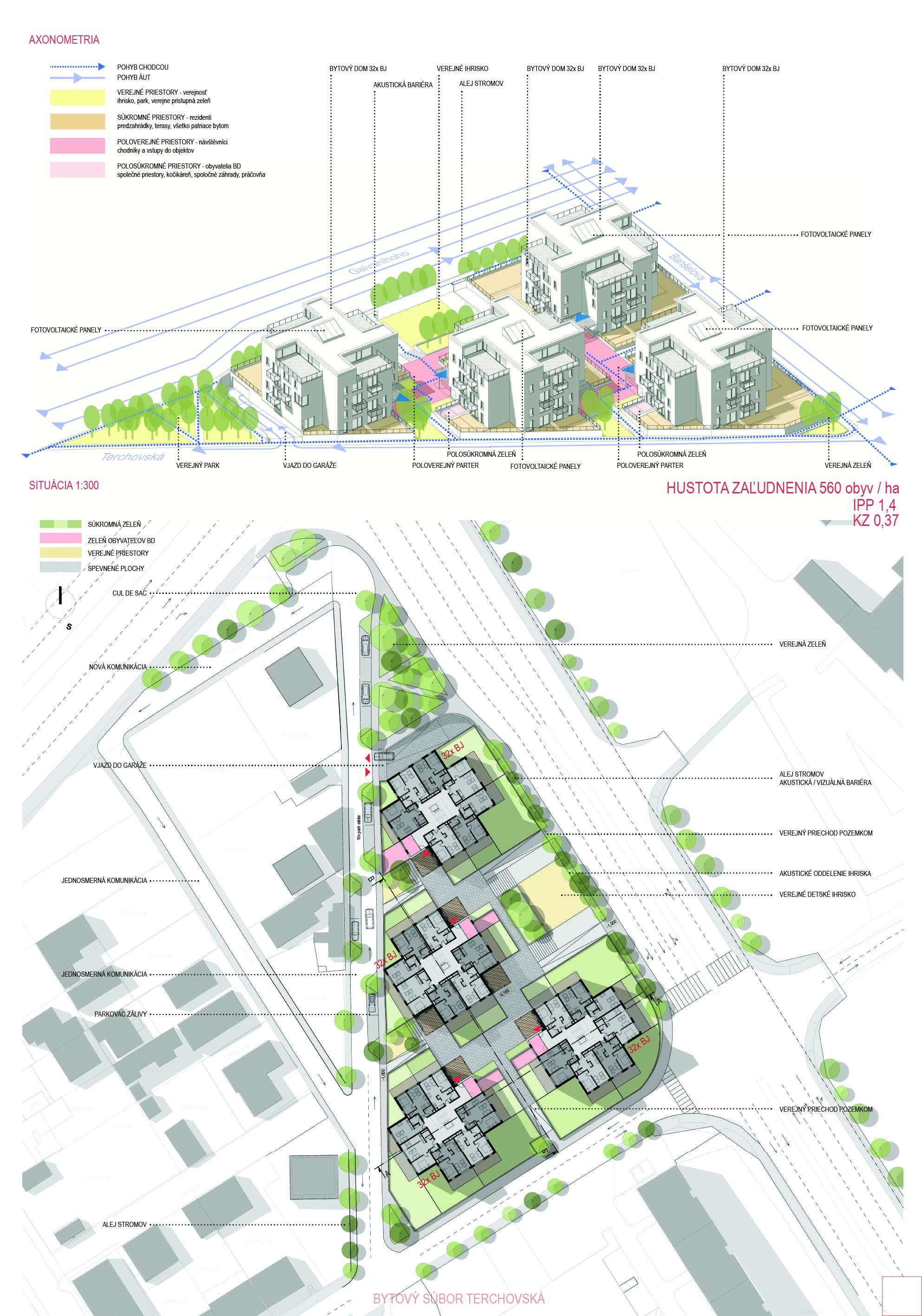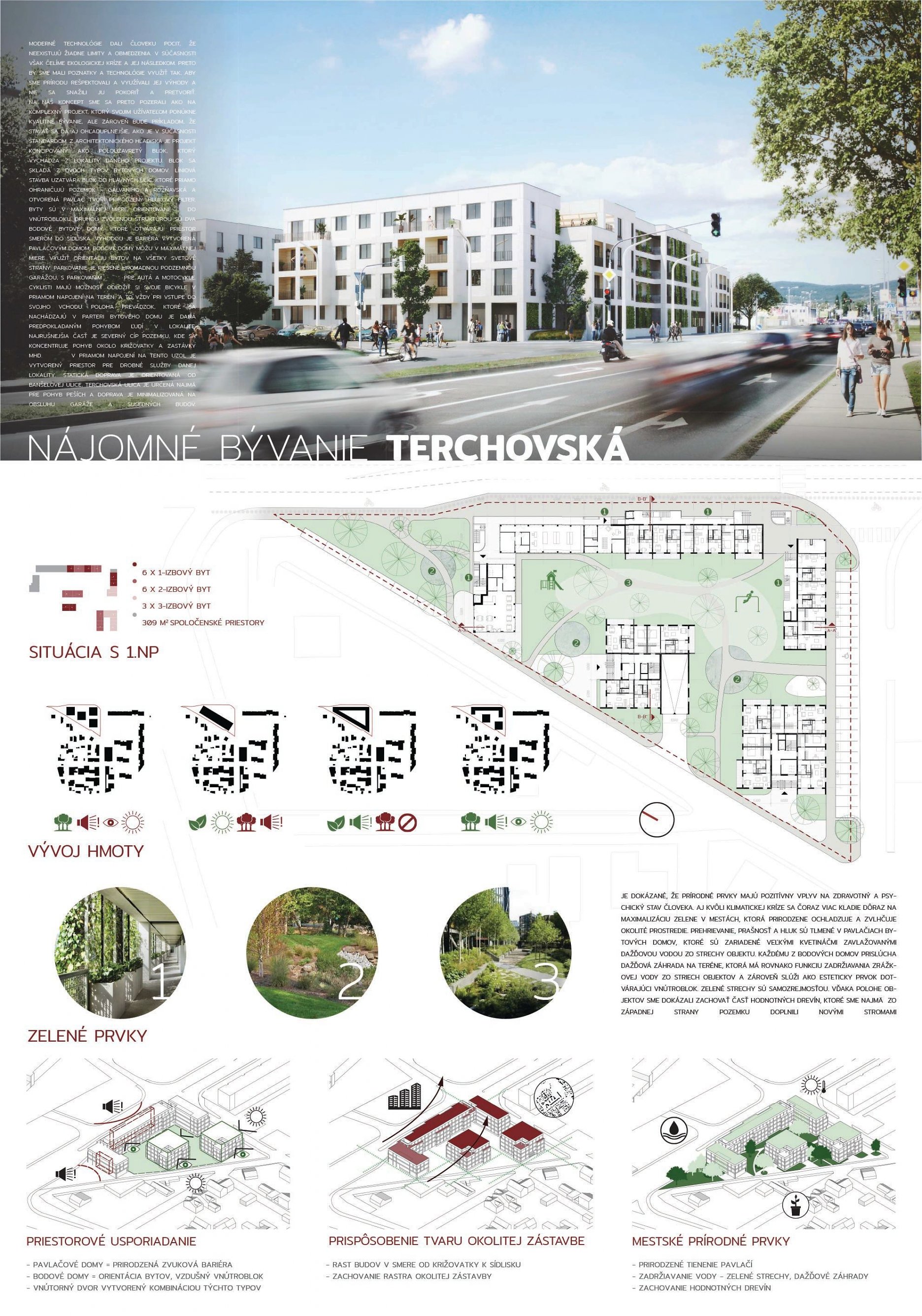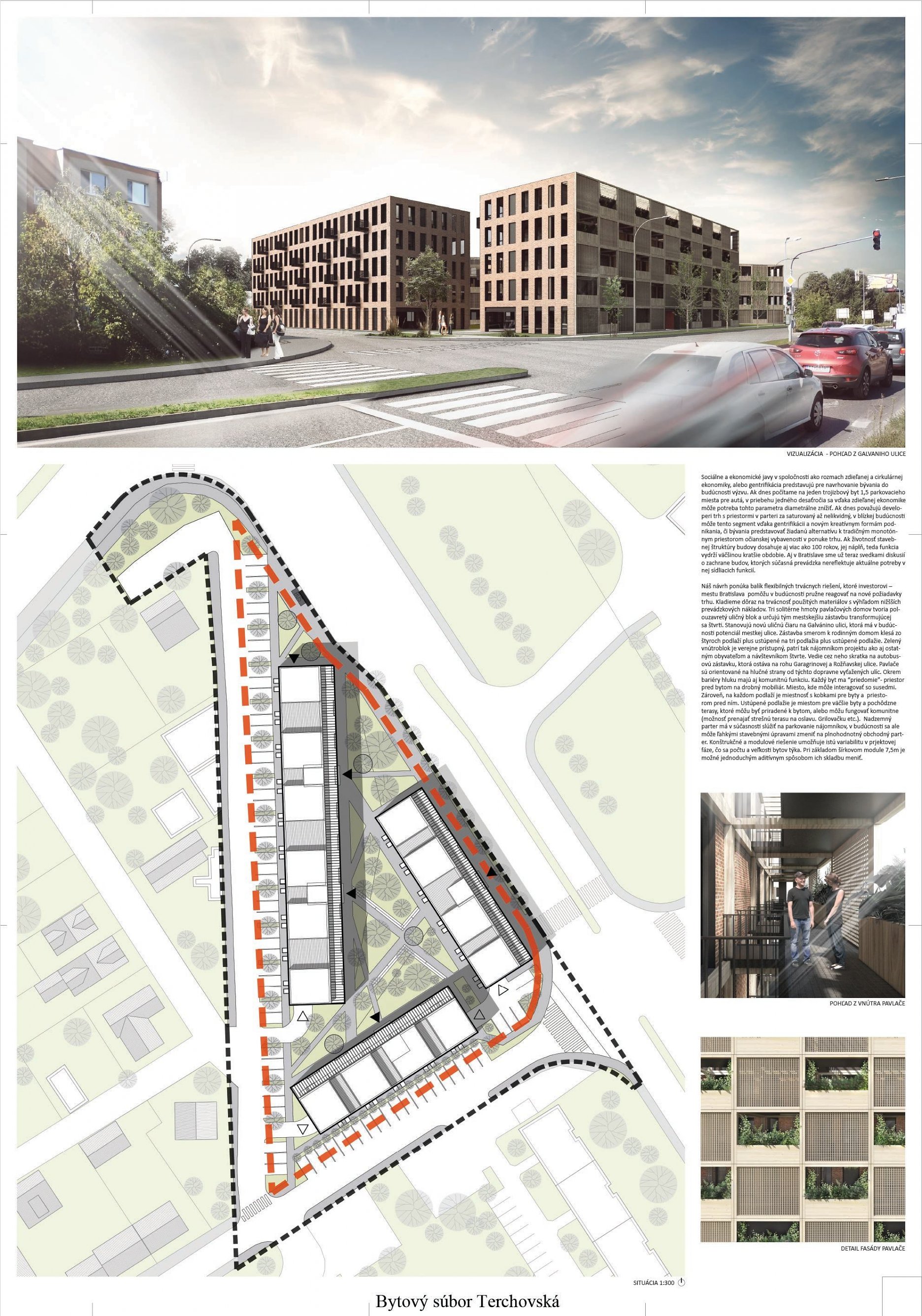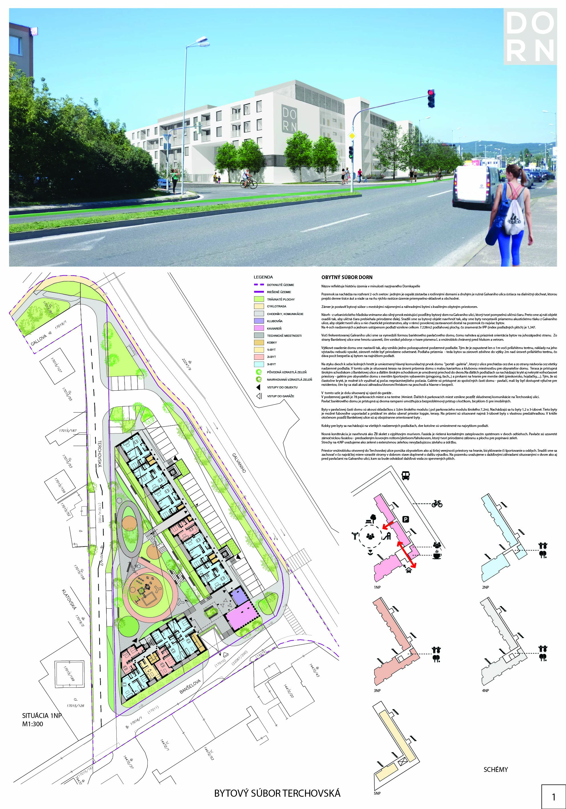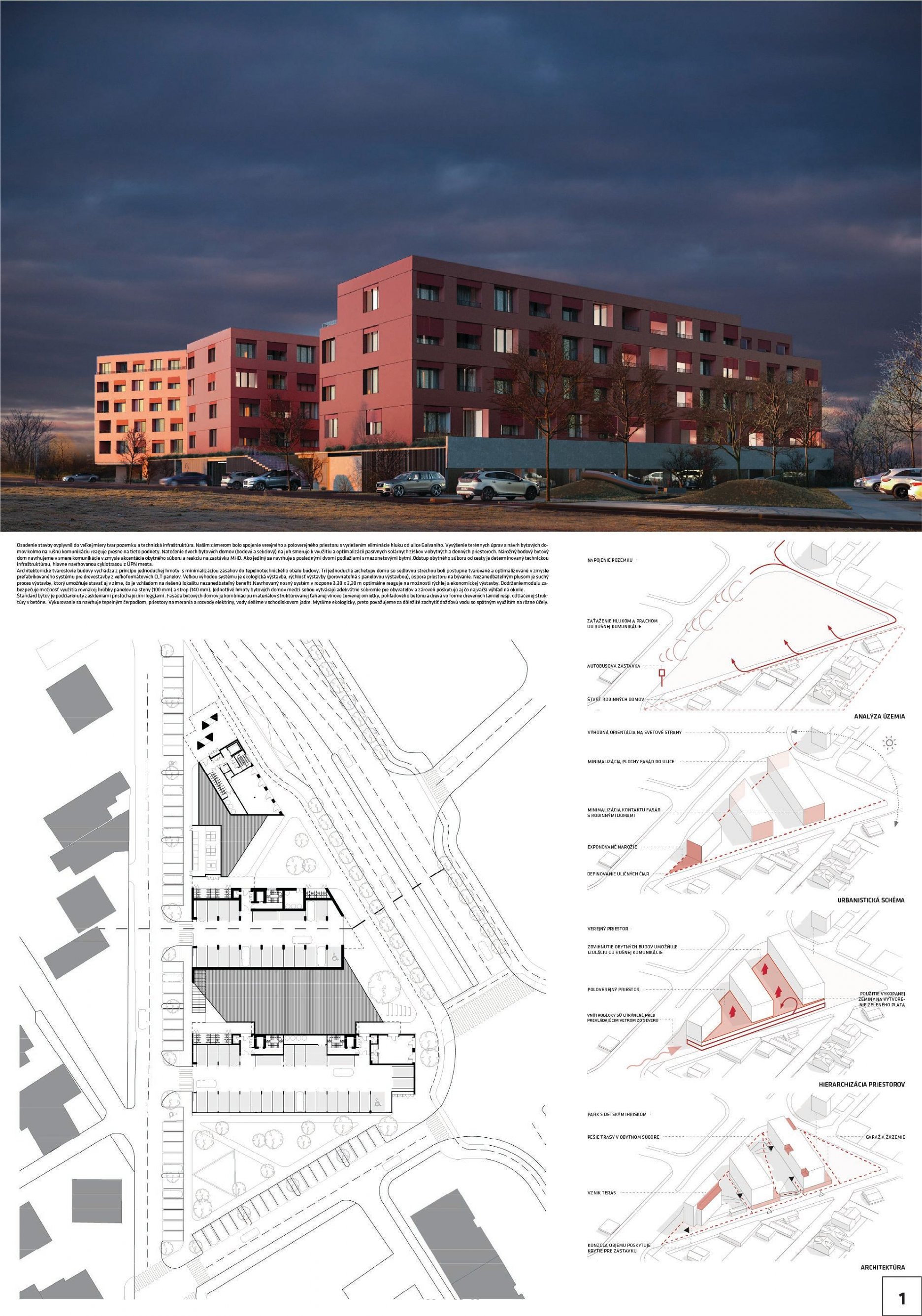 Pri víťaznom návrhu vyzdvihujeme predovšetkým vynikajúce urbanistické riešenie a citlivé začlenenie do územia. Bariérový pavlačový dom odtieňuje hluk z Galvaniho ulice a logicky dopĺňa rad štvorpodlažných panelových domov. Zároveň sa však ku koridoru Galvaniho ulice nestavia chrbtom, keď na oboch priečeliach autori umiestnili priestory vybavenosti. Správnosť tohto rozhodnutia potvrdzuje aj úprava a zvládnutie čelného priestoru pri križovatke Rožňavská - Galvaniho ulica. Skupina menších domov v západnej časti pozemku reaguje na mierku priľahlej zástavby a vytvára tak priepustné poloverejné priestory, ktoré nadväzujú na obdobné priestory medzi panelovými bytovými domami na juhovýchodnej strane Banšelovej ulice. Autori navyše vhodne umiestňujú vjazd do podzemnej halovej garáže do Banšelovej ulice, čím odľahčujú dynamickú dopravu v Terchovskej ulici a potvrdzujú jej status vedľajšej ukľudnenej slepej ulice.