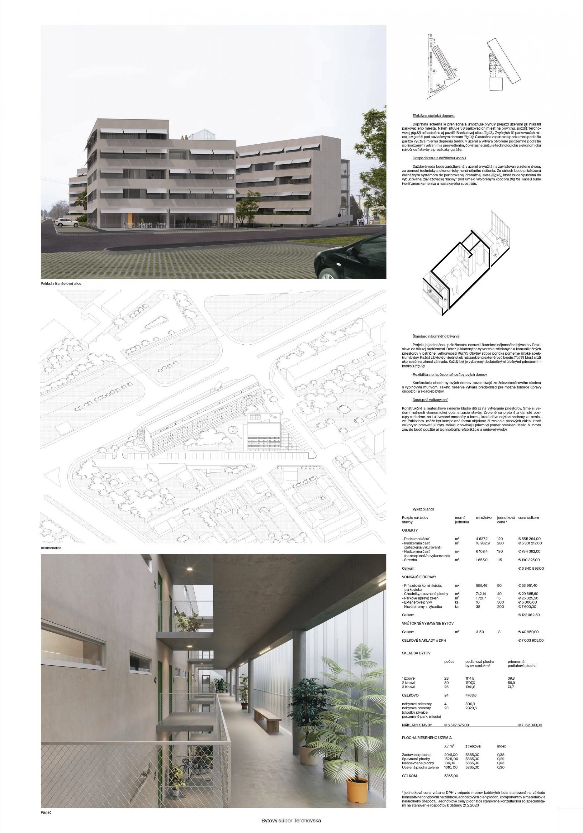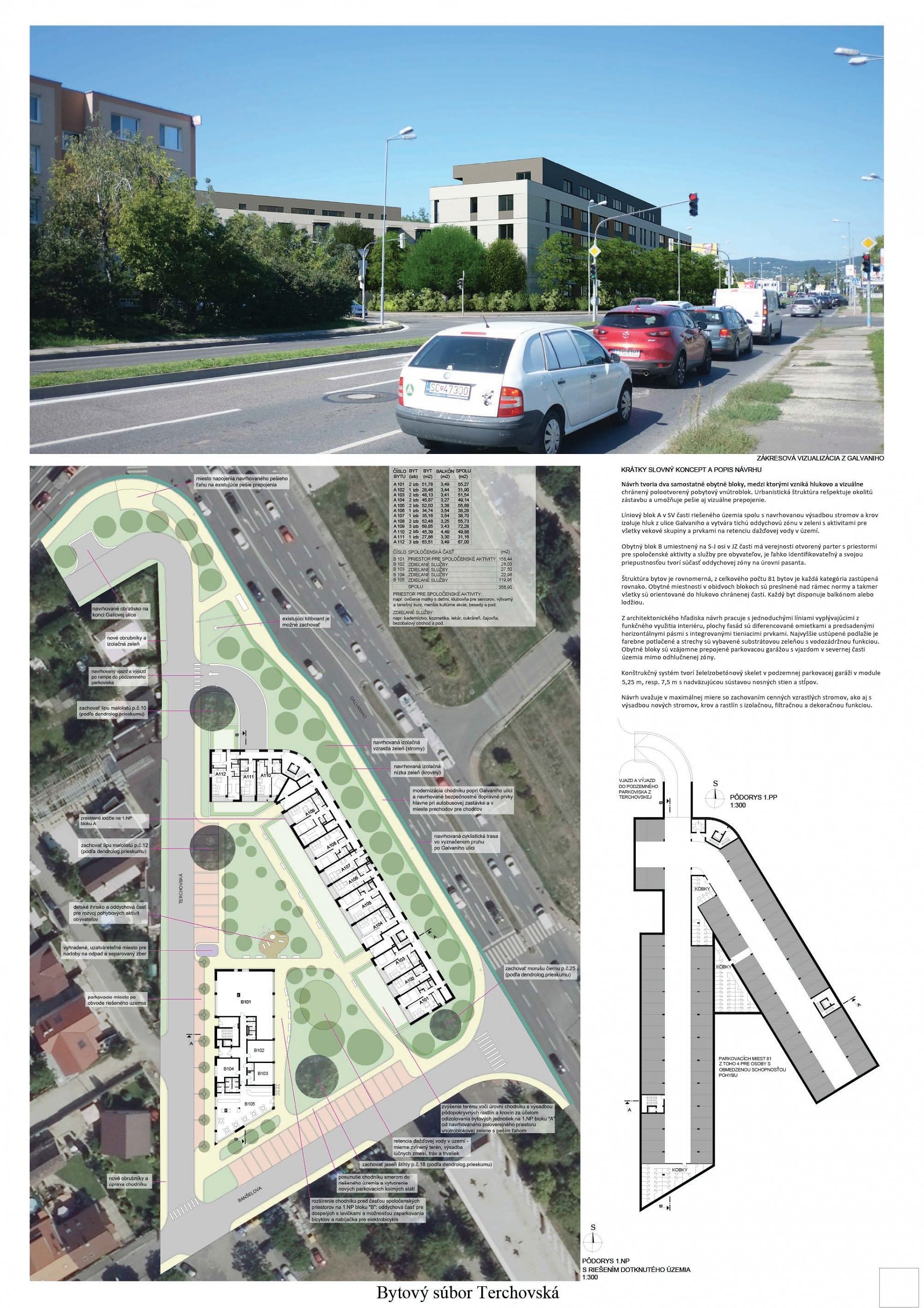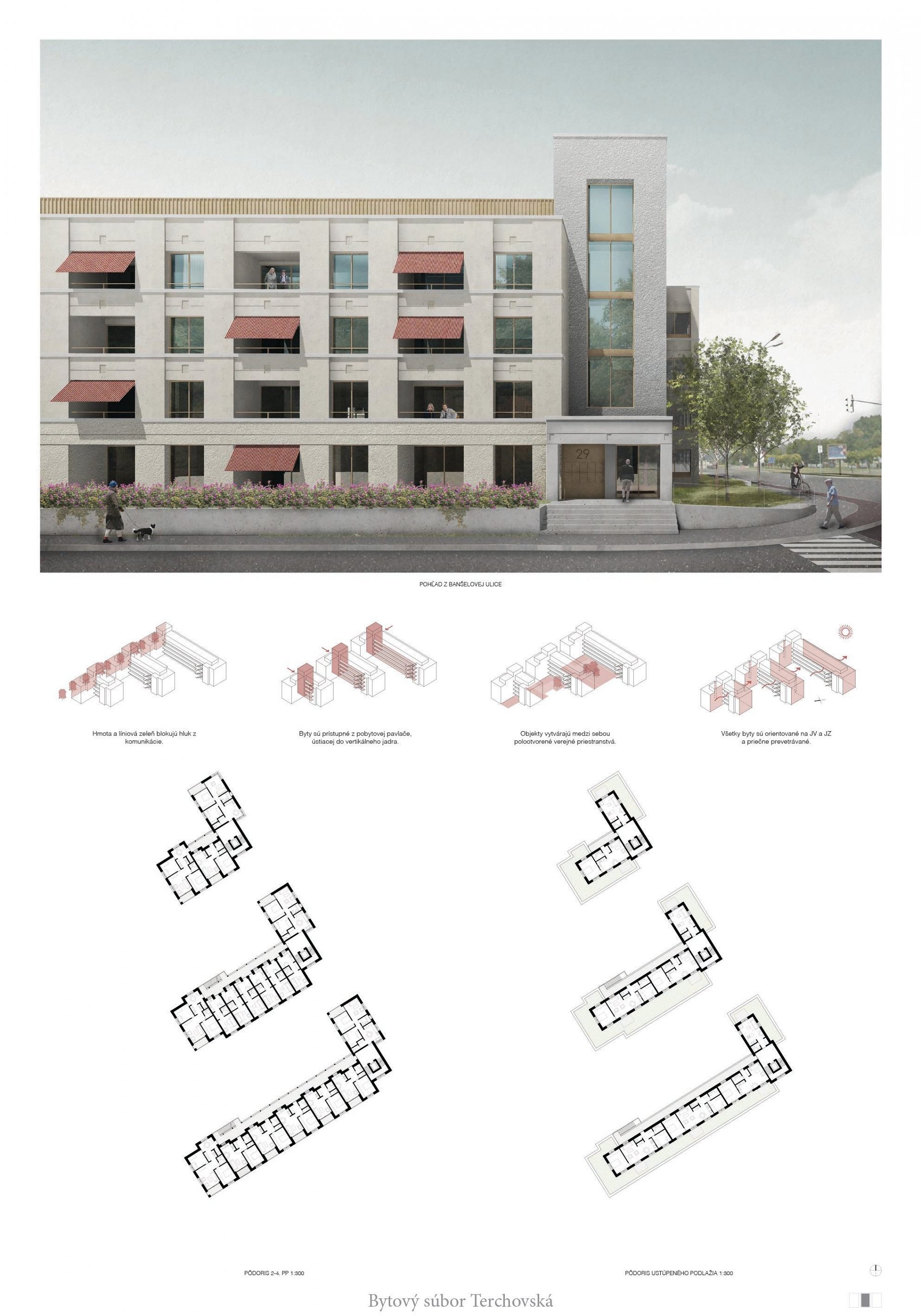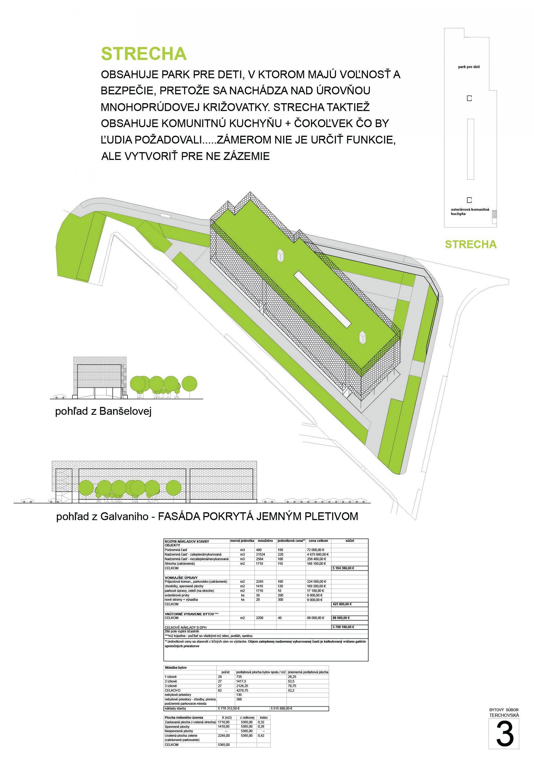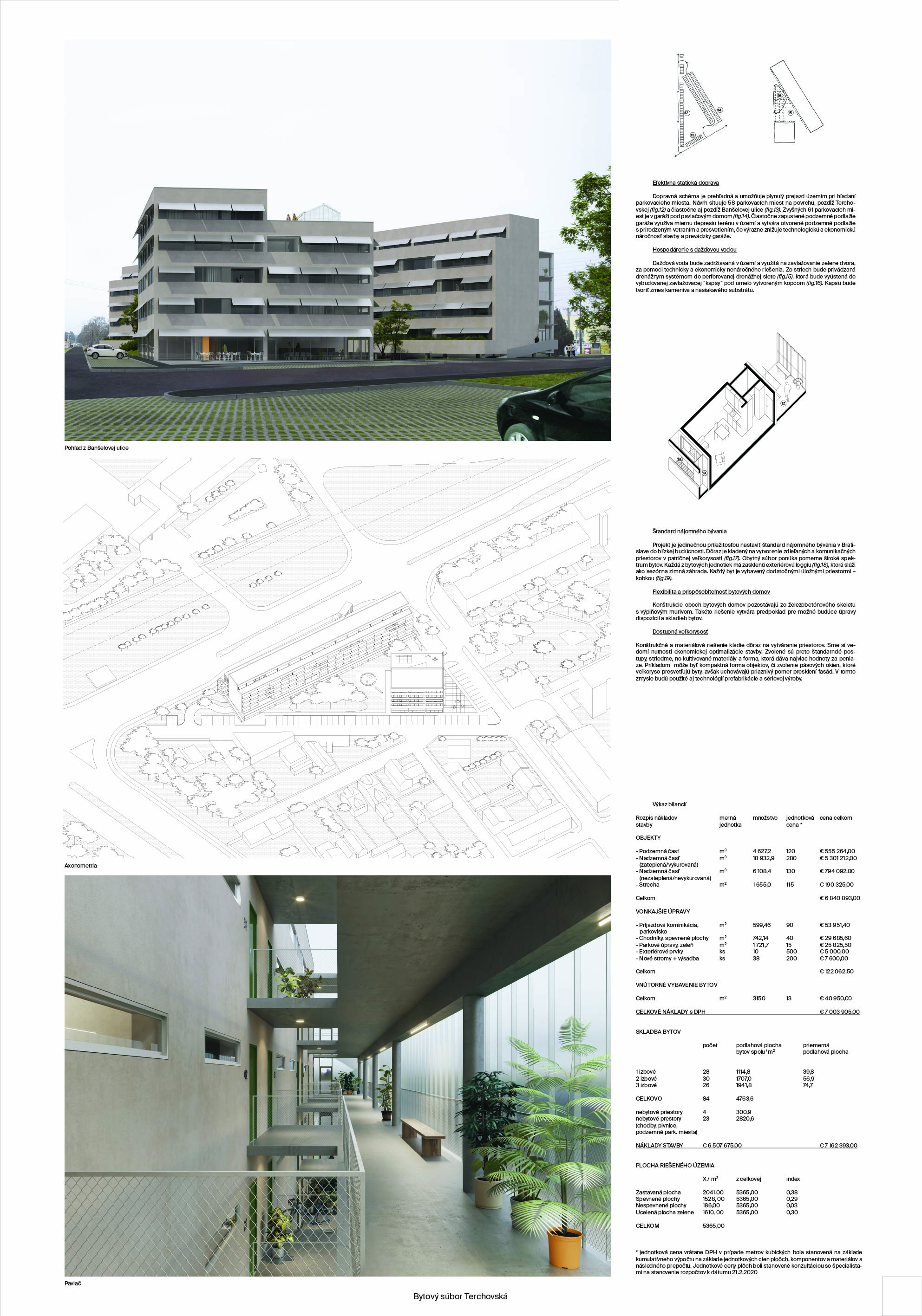 Pri víťaznom návrhu vyzdvihujeme predovšetkým vynikajúce urbanistické riešenie a citlivé začlenenie do územia. Bariérový pavlačový dom odtieňuje hluk z Galvaniho ulice a logicky dopĺňa rad štvorpodlažných panelových domov. Zároveň sa však ku koridoru Galvaniho ulice nestavia chrbtom, keď na oboch priečeliach autori umiestnili priestory vybavenosti. Správnosť tohto rozhodnutia potvrdzuje aj úprava a zvládnutie čelného priestoru pri križovatke Rožňavská - Galvaniho ulica. Skupina menších domov v západnej časti pozemku reaguje na mierku priľahlej zástavby a vytvára tak priepustné poloverejné priestory, ktoré nadväzujú na obdobné priestory medzi panelovými bytovými domami na juhovýchodnej strane Banšelovej ulice. Autori navyše vhodne umiestňujú vjazd do podzemnej halovej garáže do Banšelovej ulice, čím odľahčujú dynamickú dopravu v Terchovskej ulici a potvrdzujú jej status vedľajšej ukľudnenej slepej ulice.