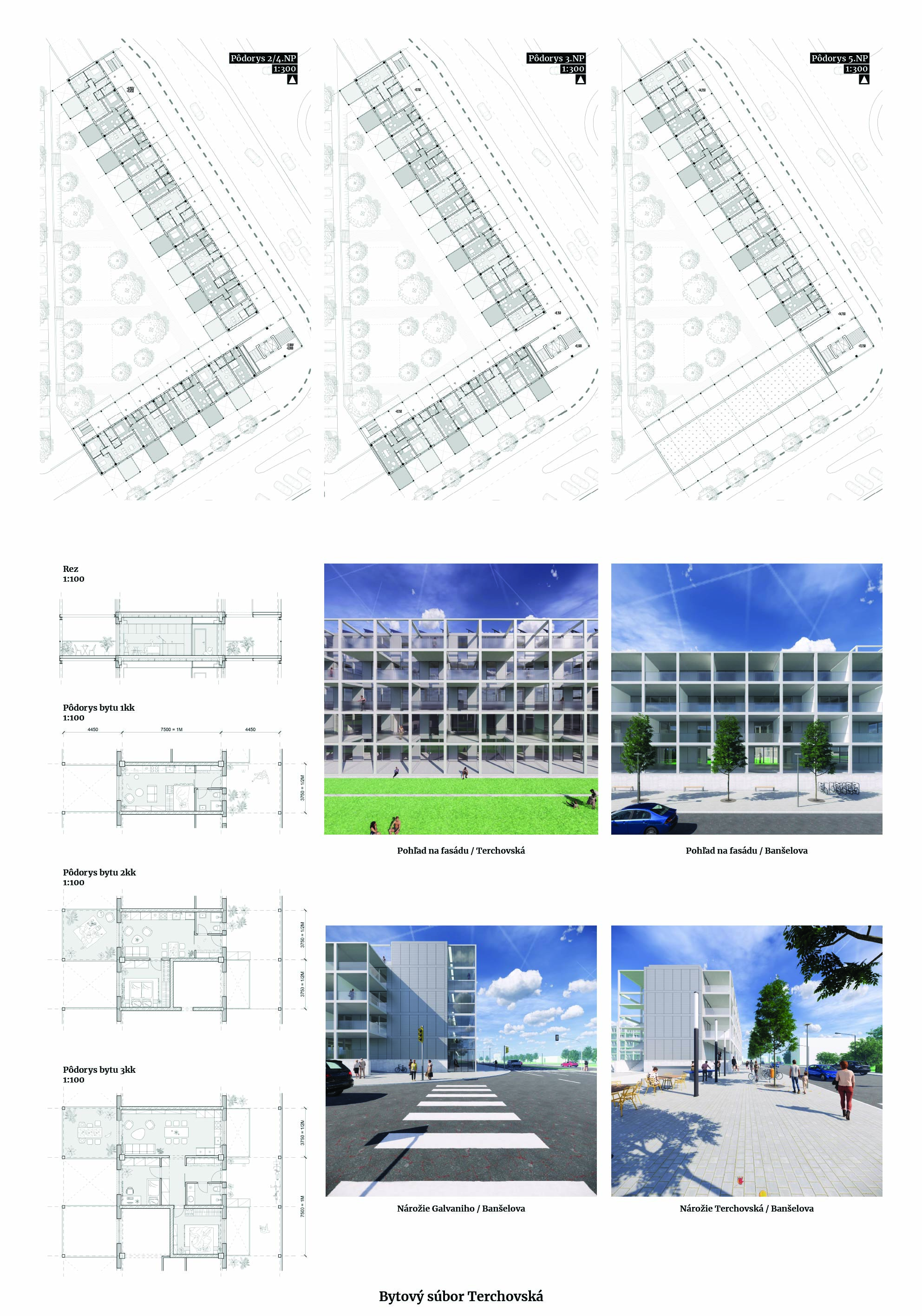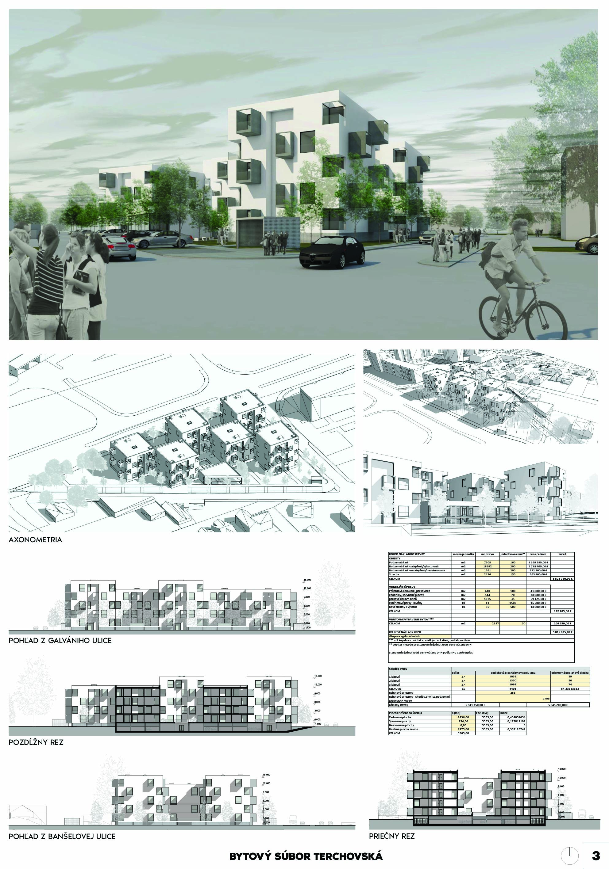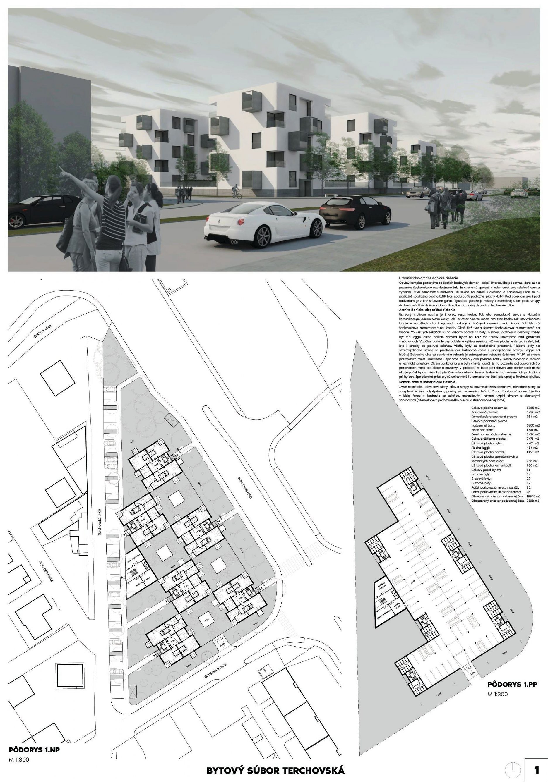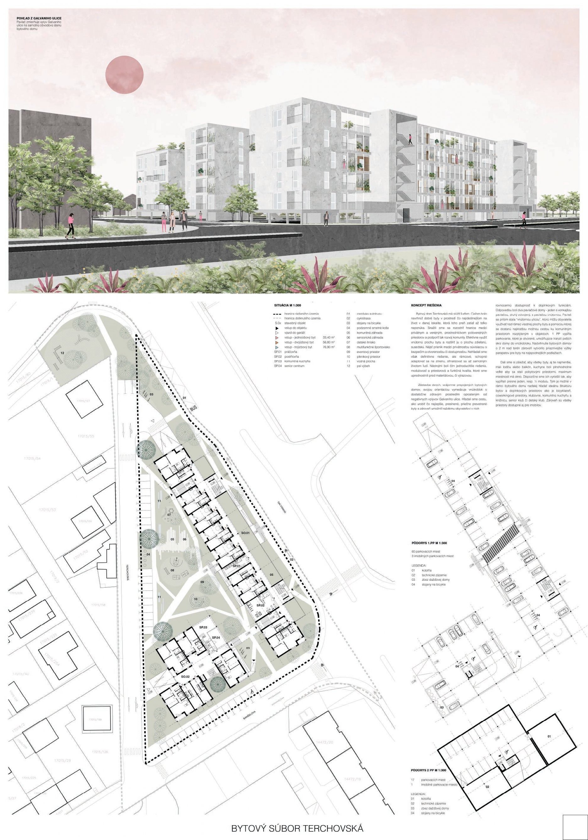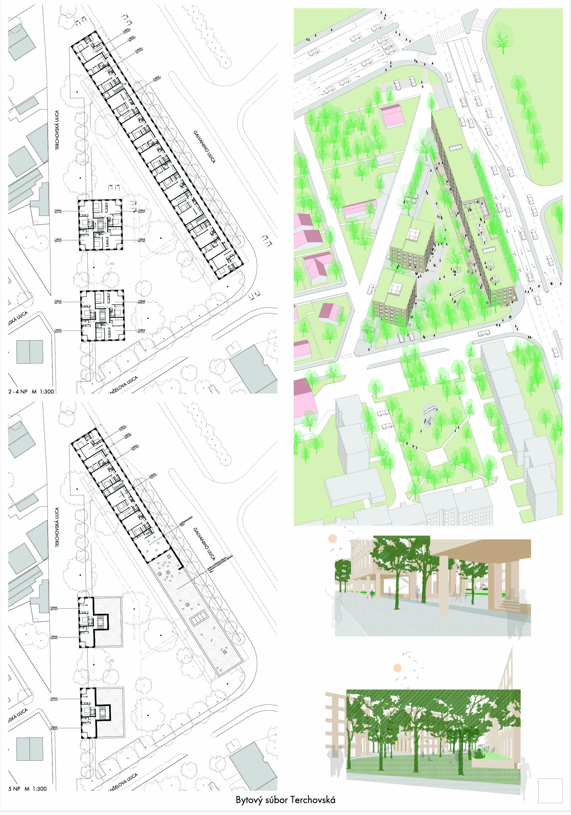Pri víťaznom návrhu vyzdvihujeme predovšetkým vynikajúce urbanistické riešenie a citlivé začlenenie do územia. Bariérový pavlačový dom odtieňuje hluk z Galvaniho ulice a logicky dopĺňa rad štvorpodlažných panelových domov. Zároveň sa však ku koridoru Galvaniho ulice nestavia chrbtom, keď na oboch priečeliach autori umiestnili priestory vybavenosti. Správnosť tohto rozhodnutia potvrdzuje aj úprava a zvládnutie čelného priestoru pri križovatke Rožňavská - Galvaniho ulica. Skupina menších domov v západnej časti pozemku reaguje na mierku priľahlej zástavby a vytvára tak priepustné poloverejné priestory, ktoré nadväzujú na obdobné priestory medzi panelovými bytovými domami na juhovýchodnej strane Banšelovej ulice. Autori navyše vhodne umiestňujú vjazd do podzemnej halovej garáže do Banšelovej ulice, čím odľahčujú dynamickú dopravu v Terchovskej ulici a potvrdzujú jej status vedľajšej ukľudnenej slepej ulice.