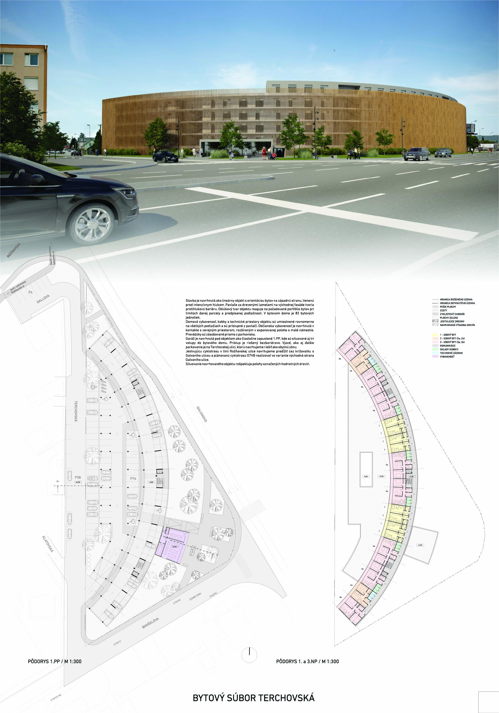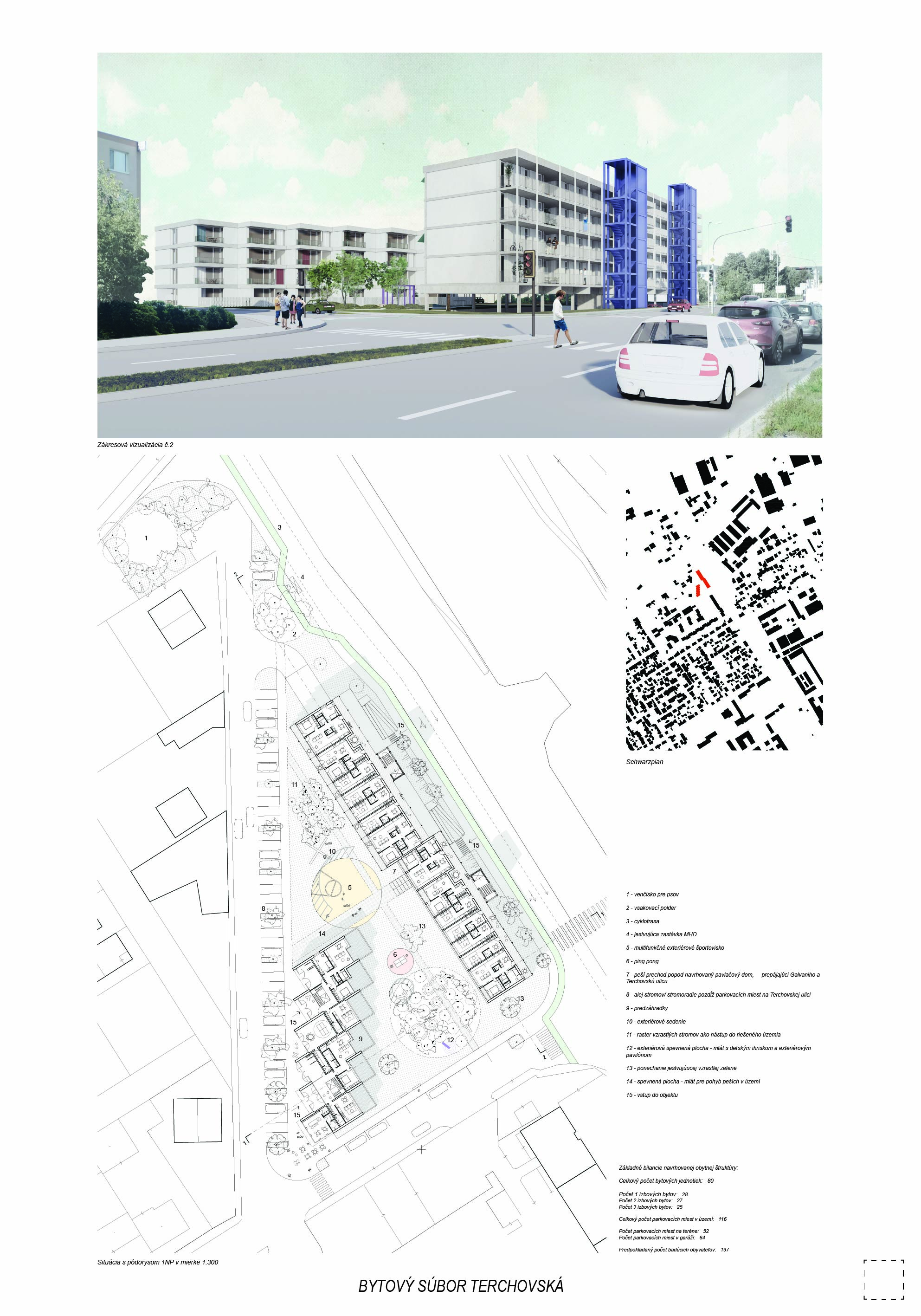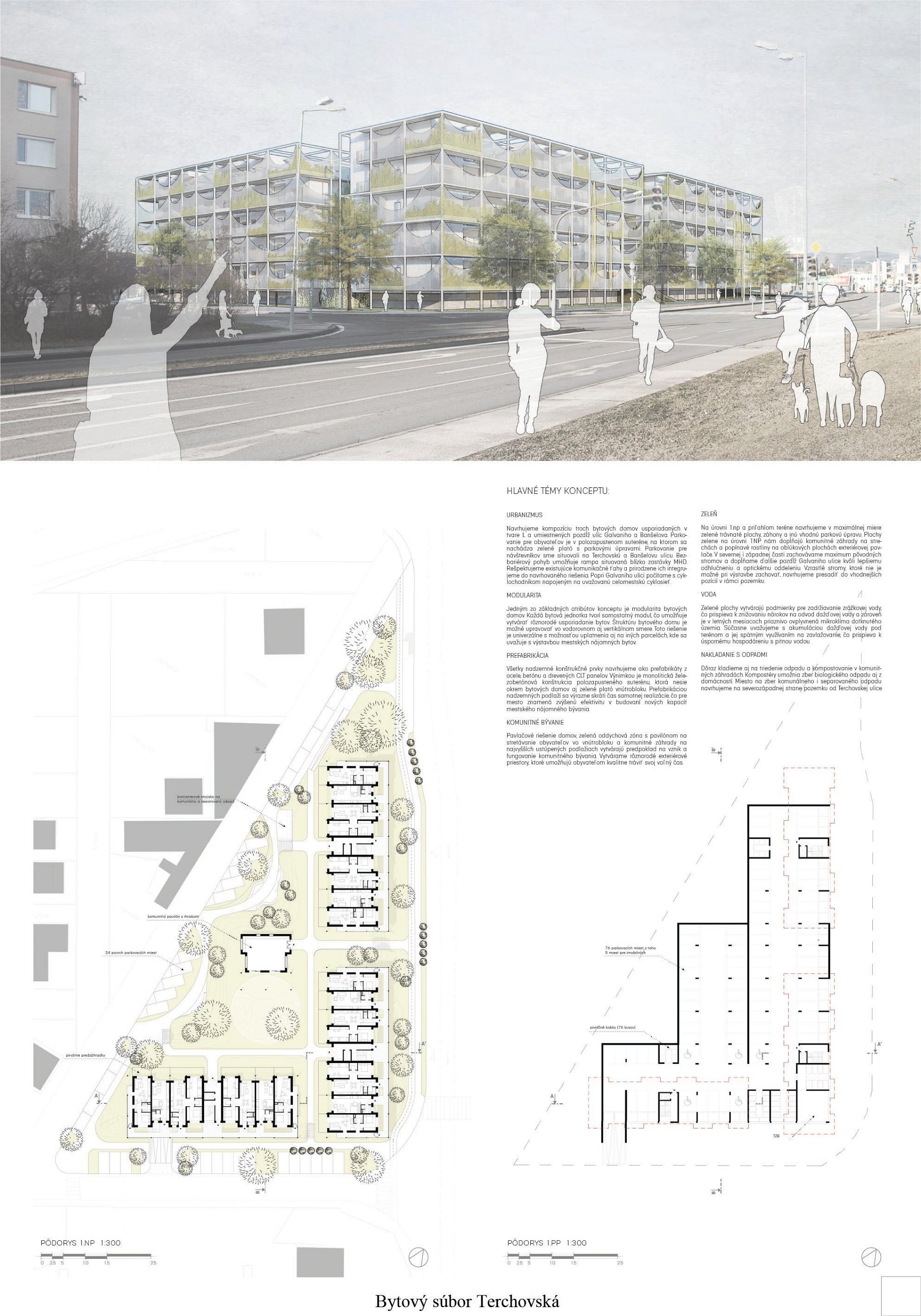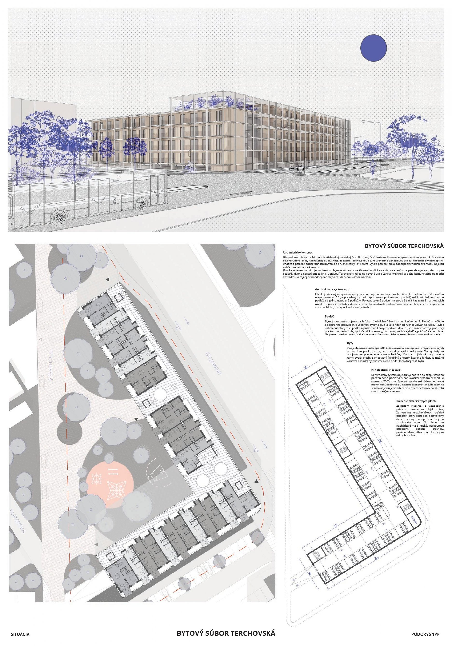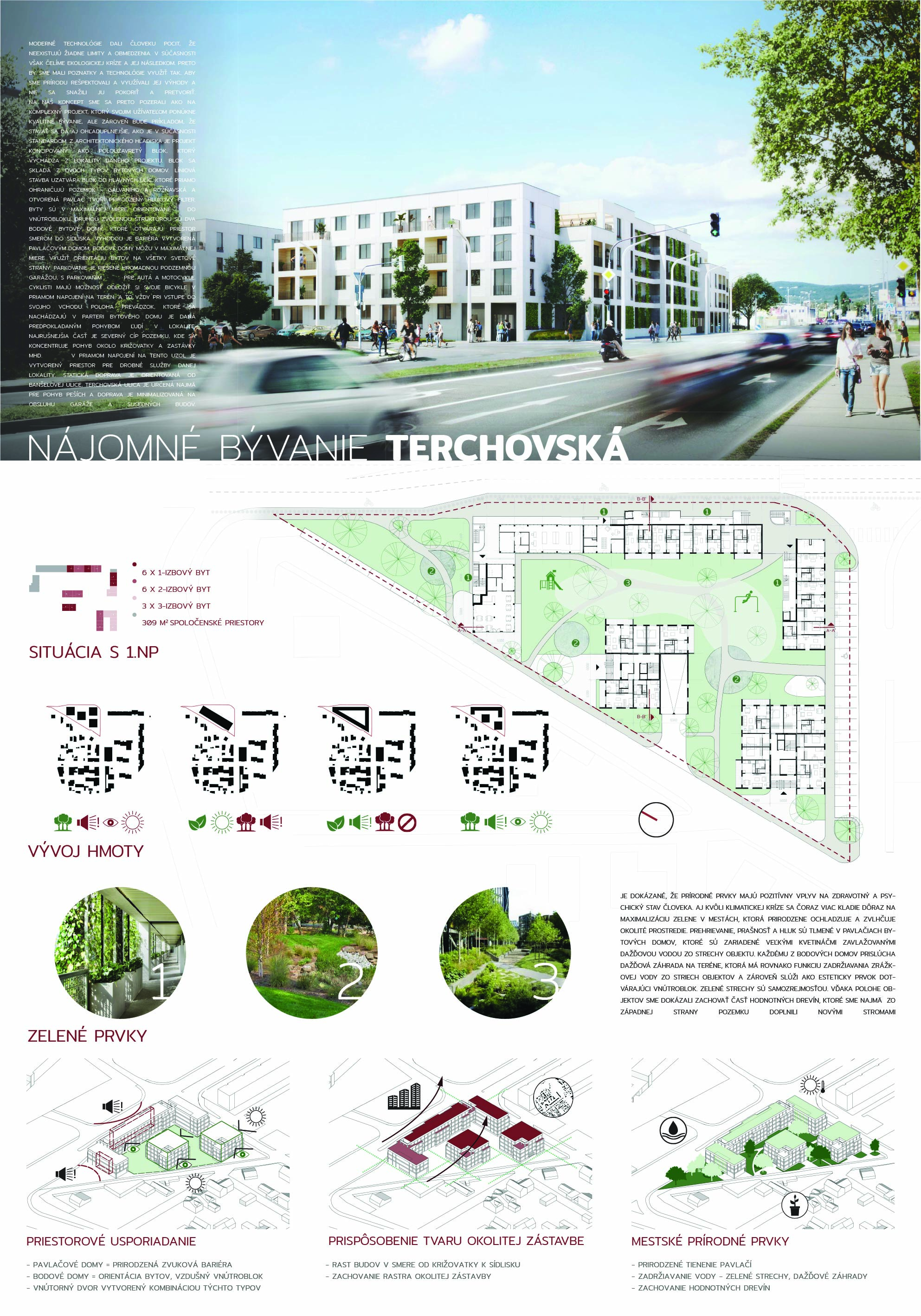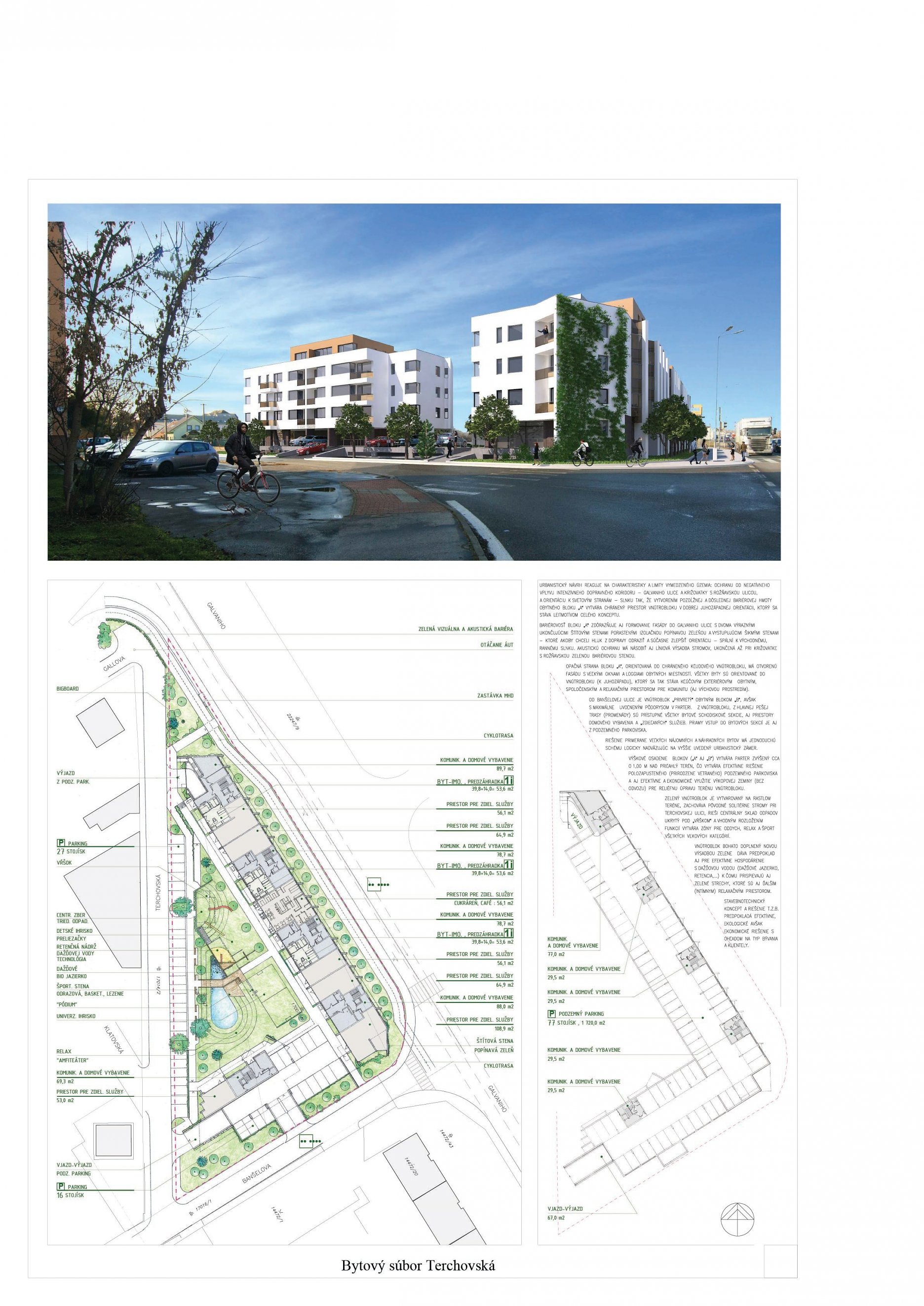 Pri víťaznom návrhu vyzdvihujeme predovšetkým vynikajúce urbanistické riešenie a citlivé začlenenie do územia. Bariérový pavlačový dom odtieňuje hluk z Galvaniho ulice a logicky dopĺňa rad štvorpodlažných panelových domov. Zároveň sa však ku koridoru Galvaniho ulice nestavia chrbtom, keď na oboch priečeliach autori umiestnili priestory vybavenosti. Správnosť tohto rozhodnutia potvrdzuje aj úprava a zvládnutie čelného priestoru pri križovatke Rožňavská - Galvaniho ulica. Skupina menších domov v západnej časti pozemku reaguje na mierku priľahlej zástavby a vytvára tak priepustné poloverejné priestory, ktoré nadväzujú na obdobné priestory medzi panelovými bytovými domami na juhovýchodnej strane Banšelovej ulice. Autori navyše vhodne umiestňujú vjazd do podzemnej halovej garáže do Banšelovej ulice, čím odľahčujú dynamickú dopravu v Terchovskej ulici a potvrdzujú jej status vedľajšej ukľudnenej slepej ulice.