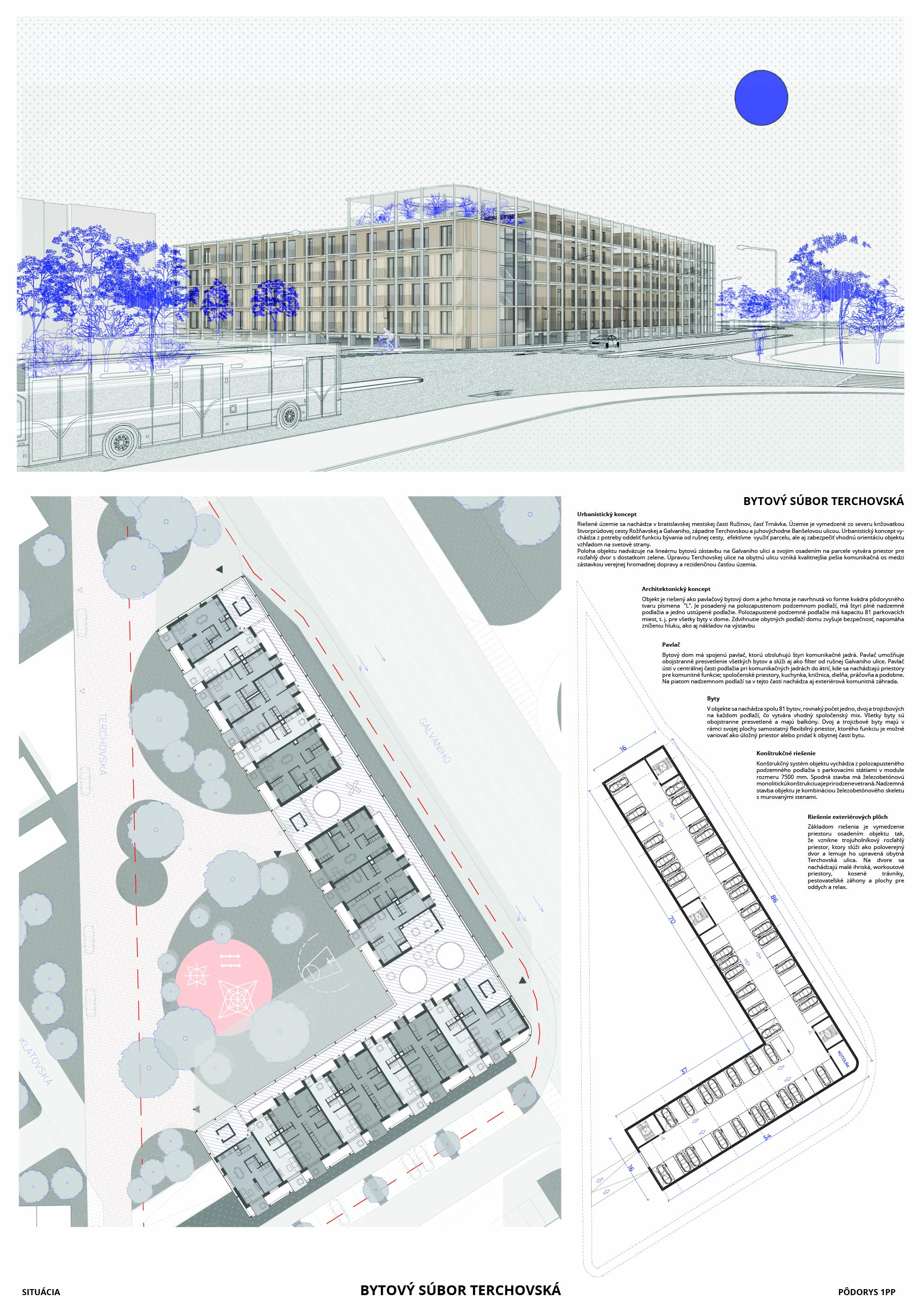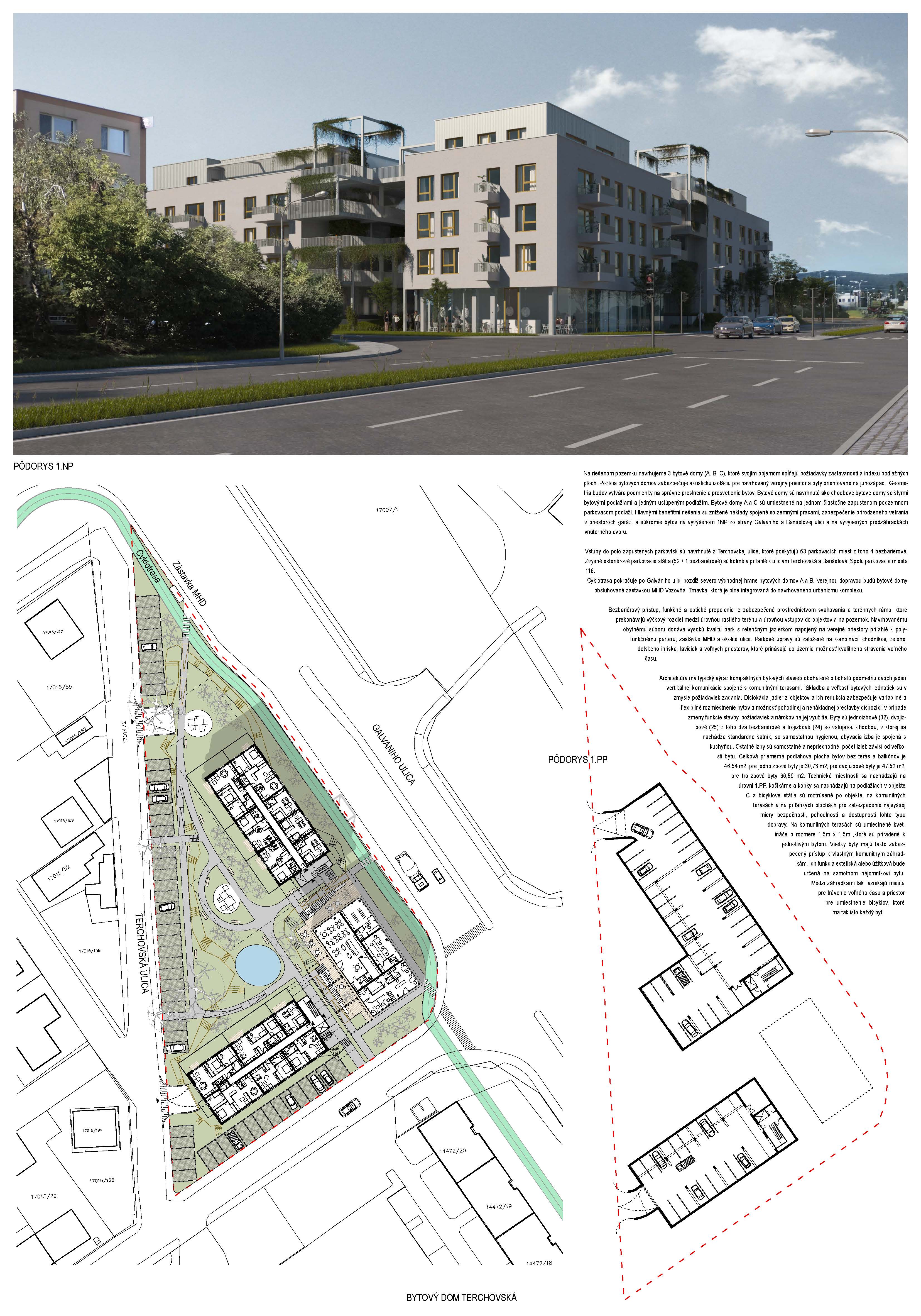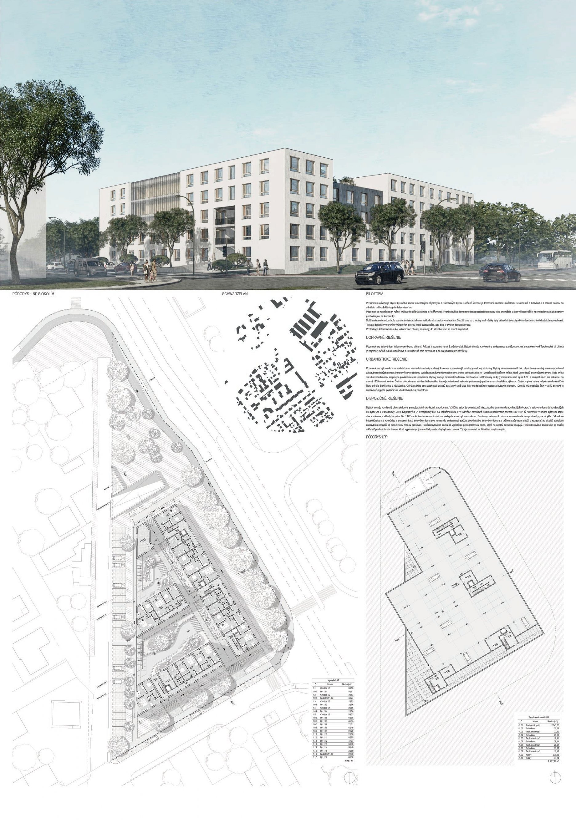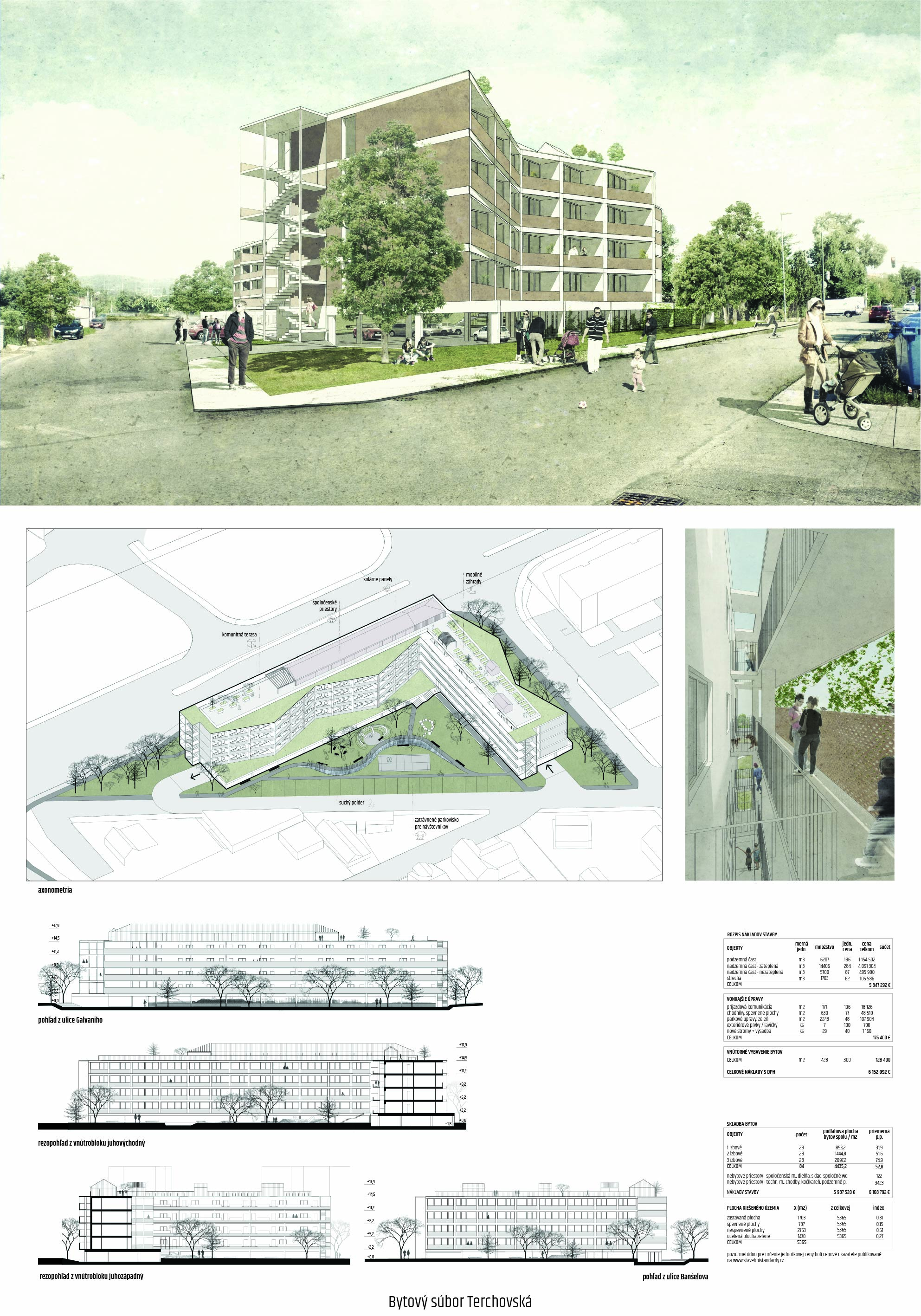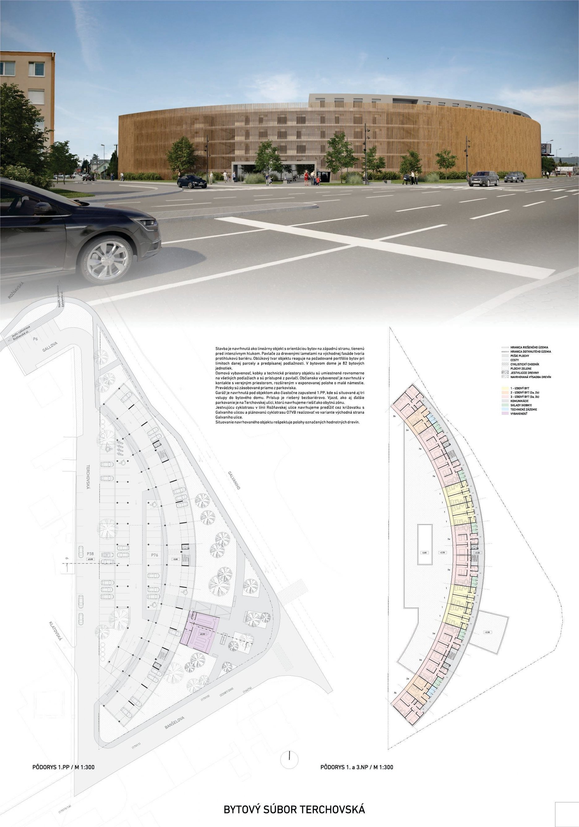 Pri víťaznom návrhu vyzdvihujeme predovšetkým vynikajúce urbanistické riešenie a citlivé začlenenie do územia. Bariérový pavlačový dom odtieňuje hluk z Galvaniho ulice a logicky dopĺňa rad štvorpodlažných panelových domov. Zároveň sa však ku koridoru Galvaniho ulice nestavia chrbtom, keď na oboch priečeliach autori umiestnili priestory vybavenosti. Správnosť tohto rozhodnutia potvrdzuje aj úprava a zvládnutie čelného priestoru pri križovatke Rožňavská - Galvaniho ulica. Skupina menších domov v západnej časti pozemku reaguje na mierku priľahlej zástavby a vytvára tak priepustné poloverejné priestory, ktoré nadväzujú na obdobné priestory medzi panelovými bytovými domami na juhovýchodnej strane Banšelovej ulice. Autori navyše vhodne umiestňujú vjazd do podzemnej halovej garáže do Banšelovej ulice, čím odľahčujú dynamickú dopravu v Terchovskej ulici a potvrdzujú jej status vedľajšej ukľudnenej slepej ulice.