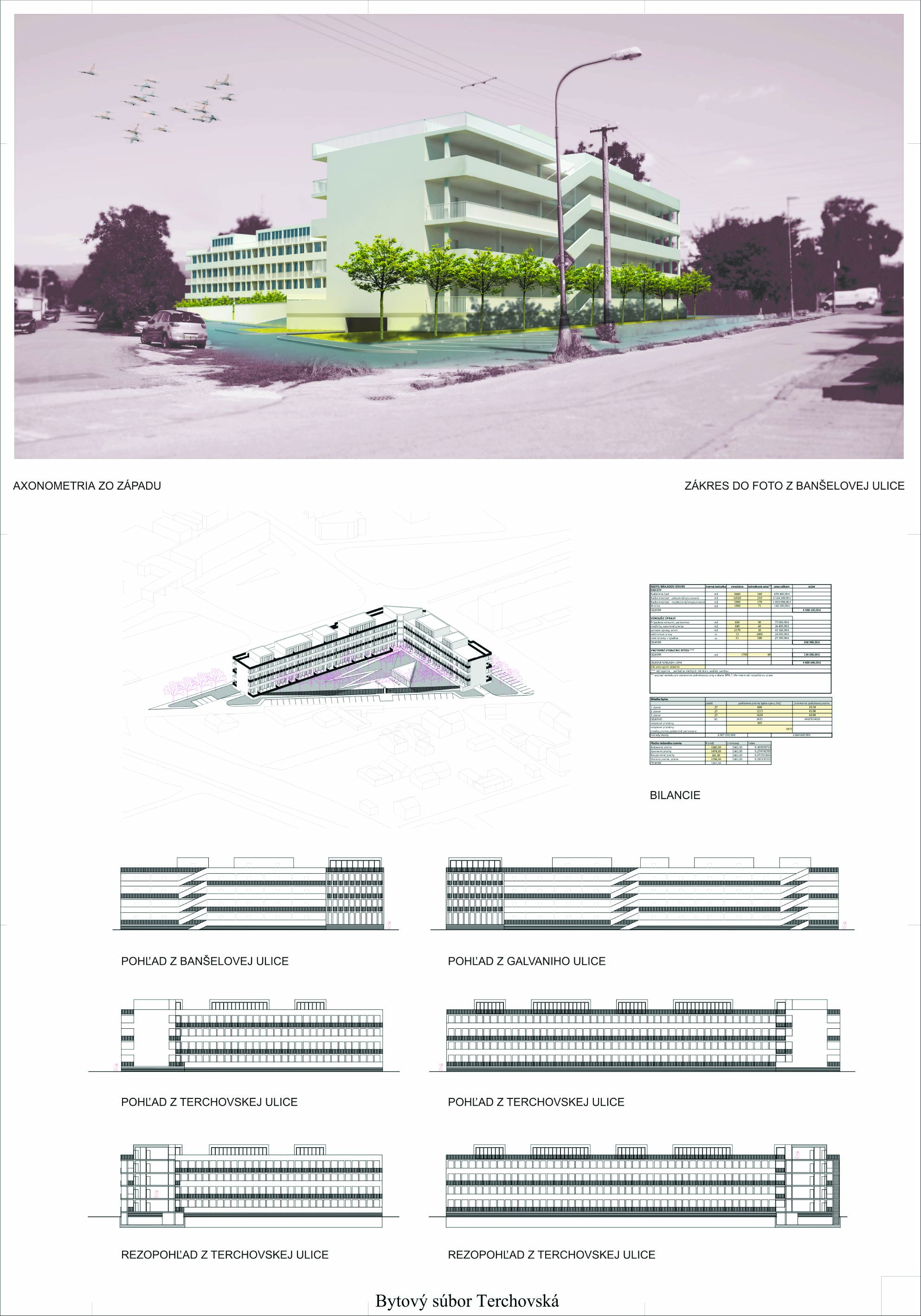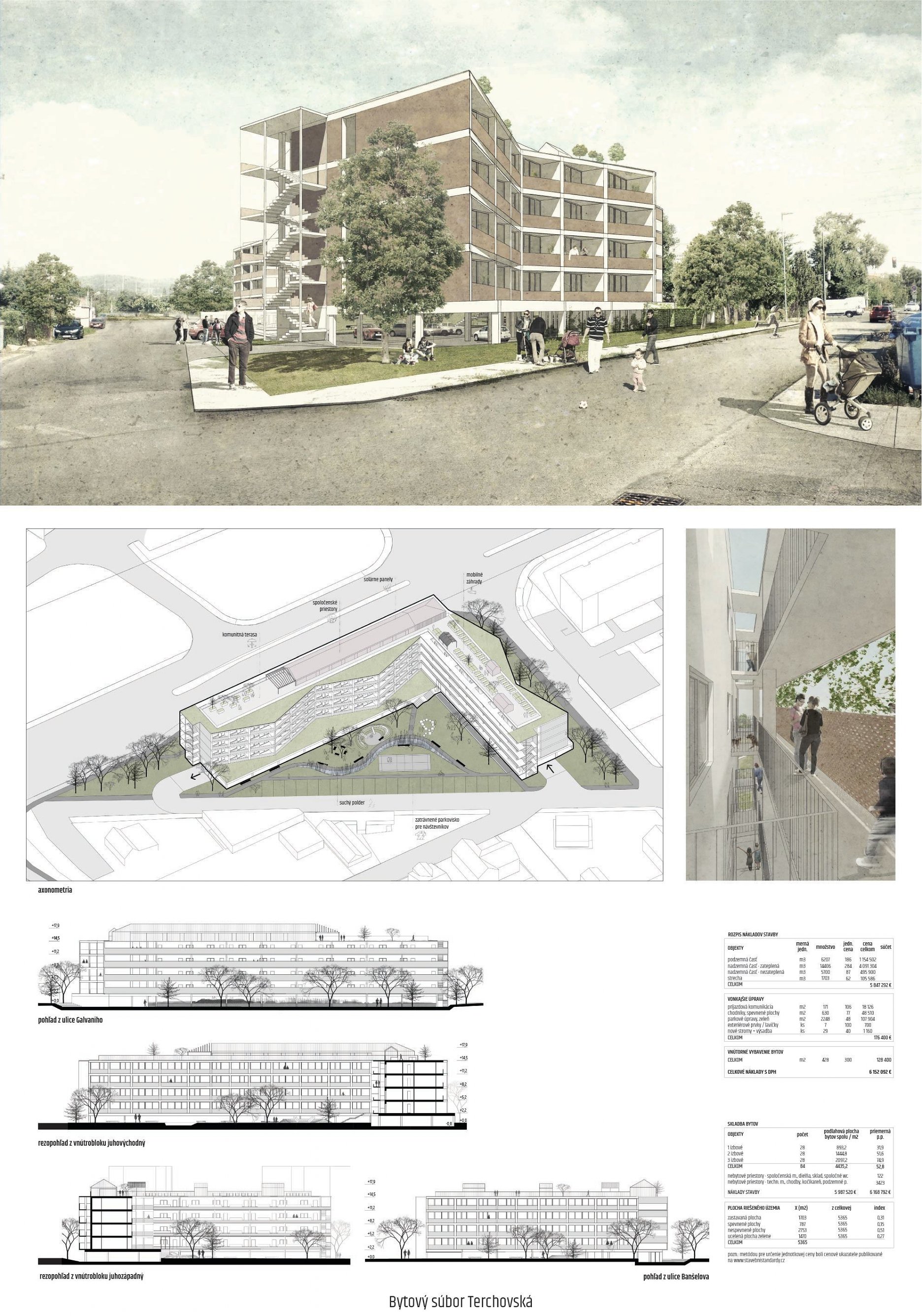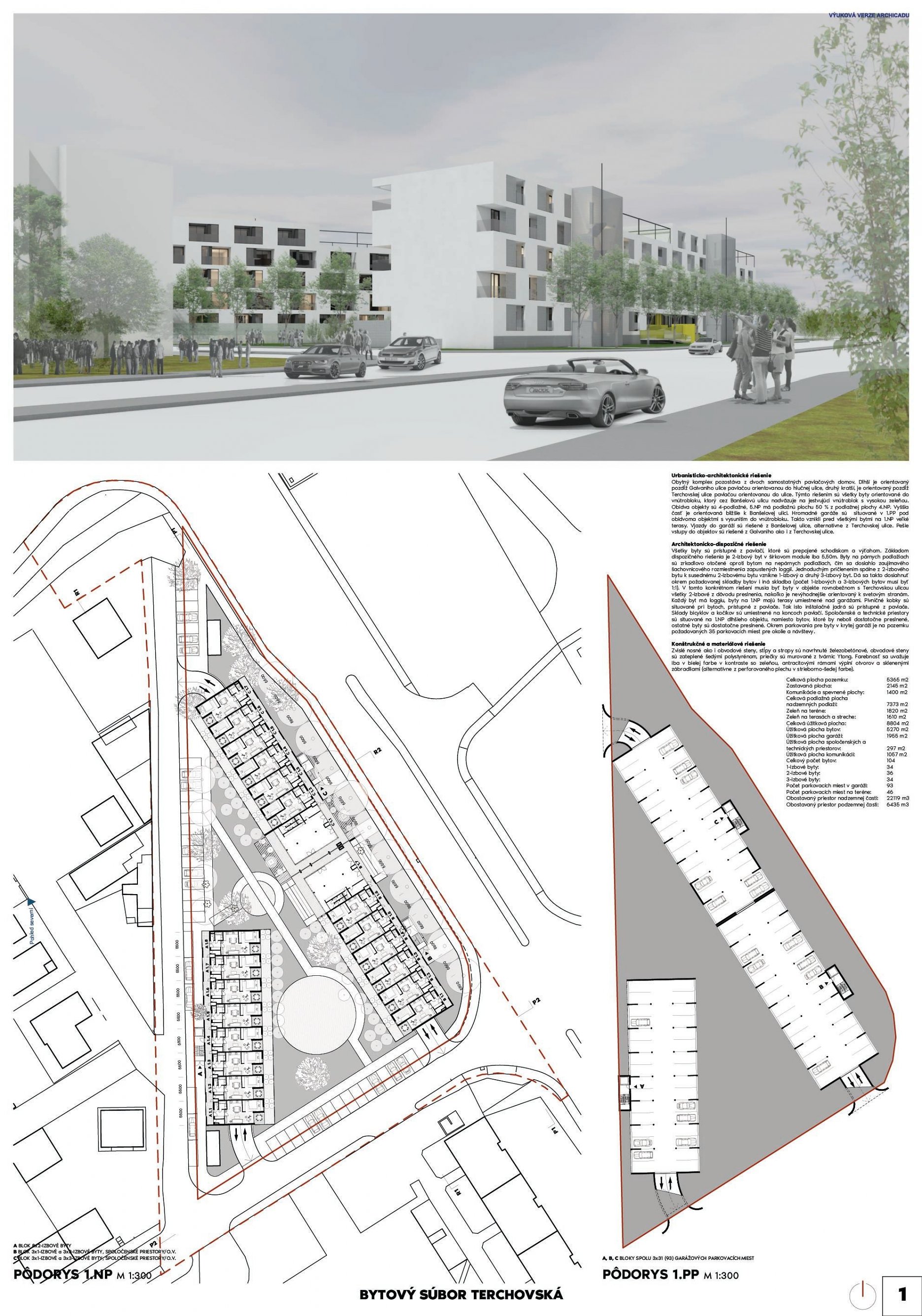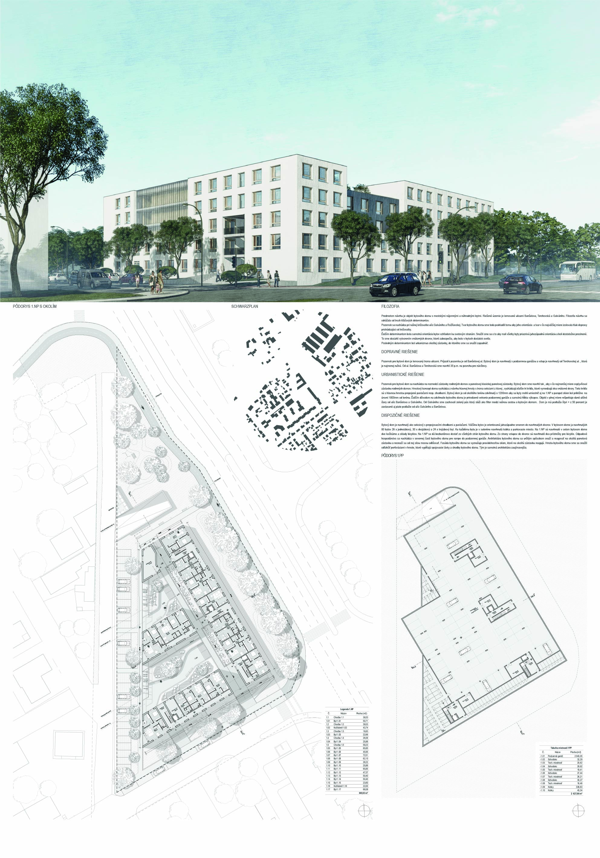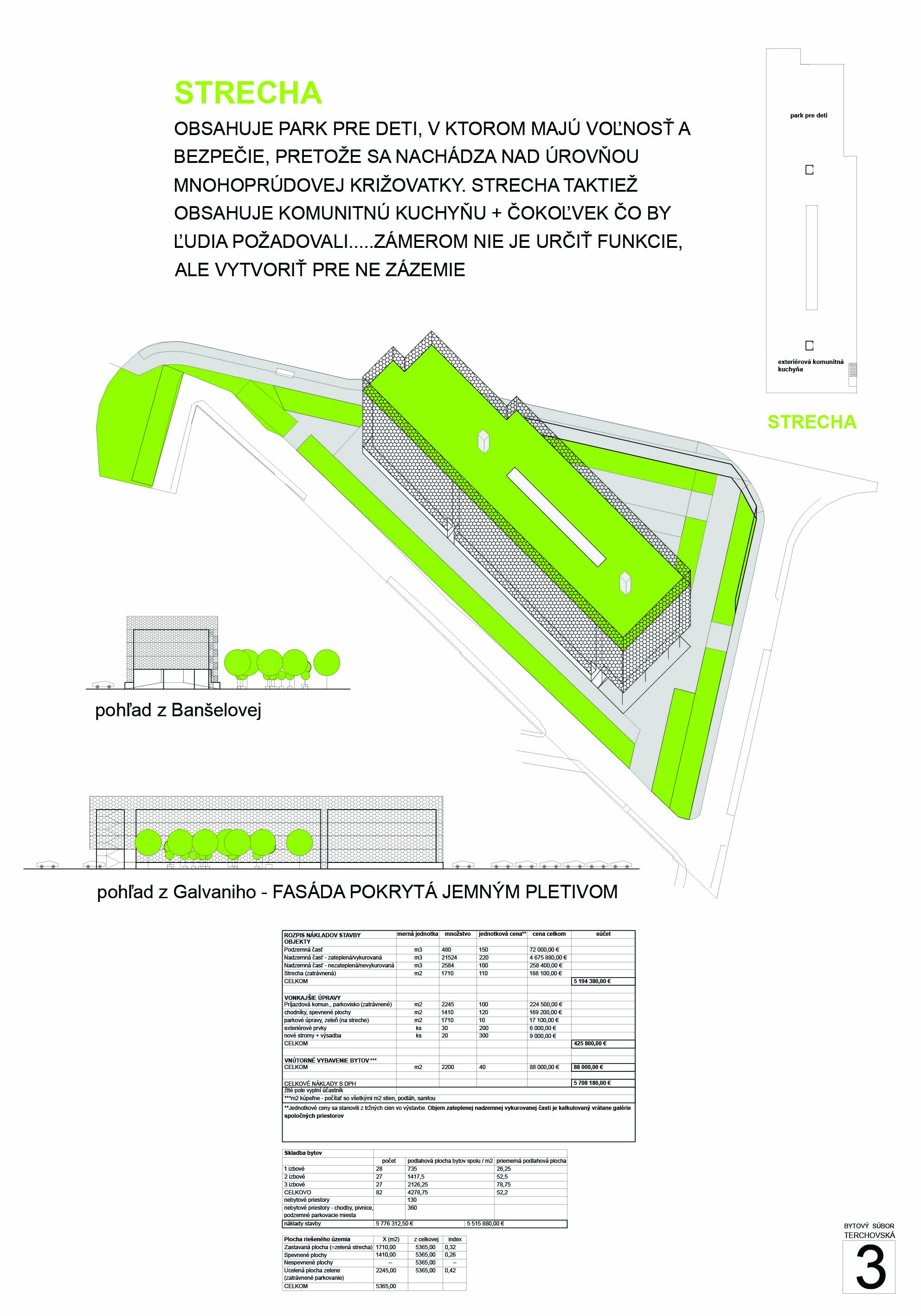 Pri víťaznom návrhu vyzdvihujeme predovšetkým vynikajúce urbanistické riešenie a citlivé začlenenie do územia. Bariérový pavlačový dom odtieňuje hluk z Galvaniho ulice a logicky dopĺňa rad štvorpodlažných panelových domov. Zároveň sa však ku koridoru Galvaniho ulice nestavia chrbtom, keď na oboch priečeliach autori umiestnili priestory vybavenosti. Správnosť tohto rozhodnutia potvrdzuje aj úprava a zvládnutie čelného priestoru pri križovatke Rožňavská - Galvaniho ulica. Skupina menších domov v západnej časti pozemku reaguje na mierku priľahlej zástavby a vytvára tak priepustné poloverejné priestory, ktoré nadväzujú na obdobné priestory medzi panelovými bytovými domami na juhovýchodnej strane Banšelovej ulice. Autori navyše vhodne umiestňujú vjazd do podzemnej halovej garáže do Banšelovej ulice, čím odľahčujú dynamickú dopravu v Terchovskej ulici a potvrdzujú jej status vedľajšej ukľudnenej slepej ulice.