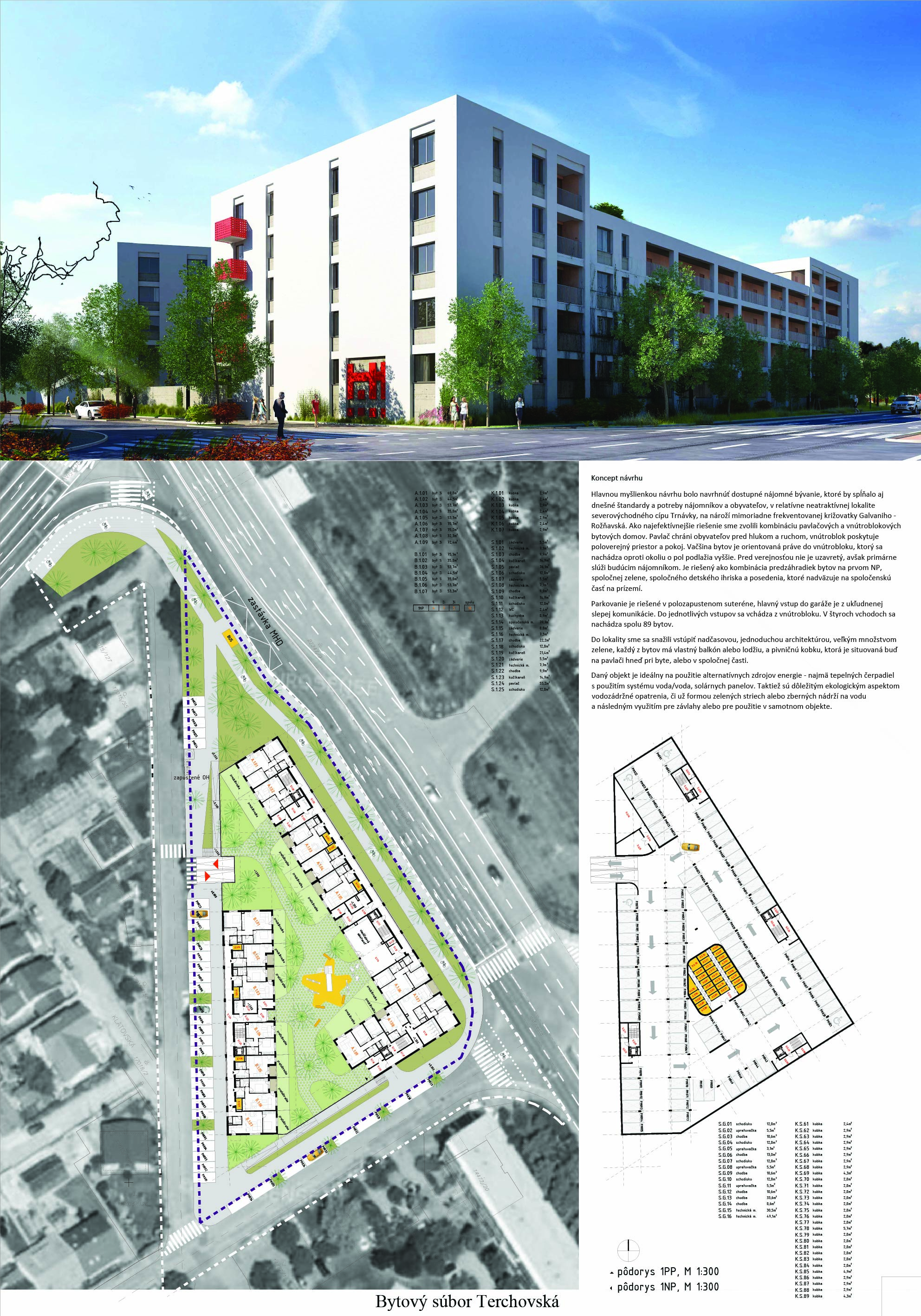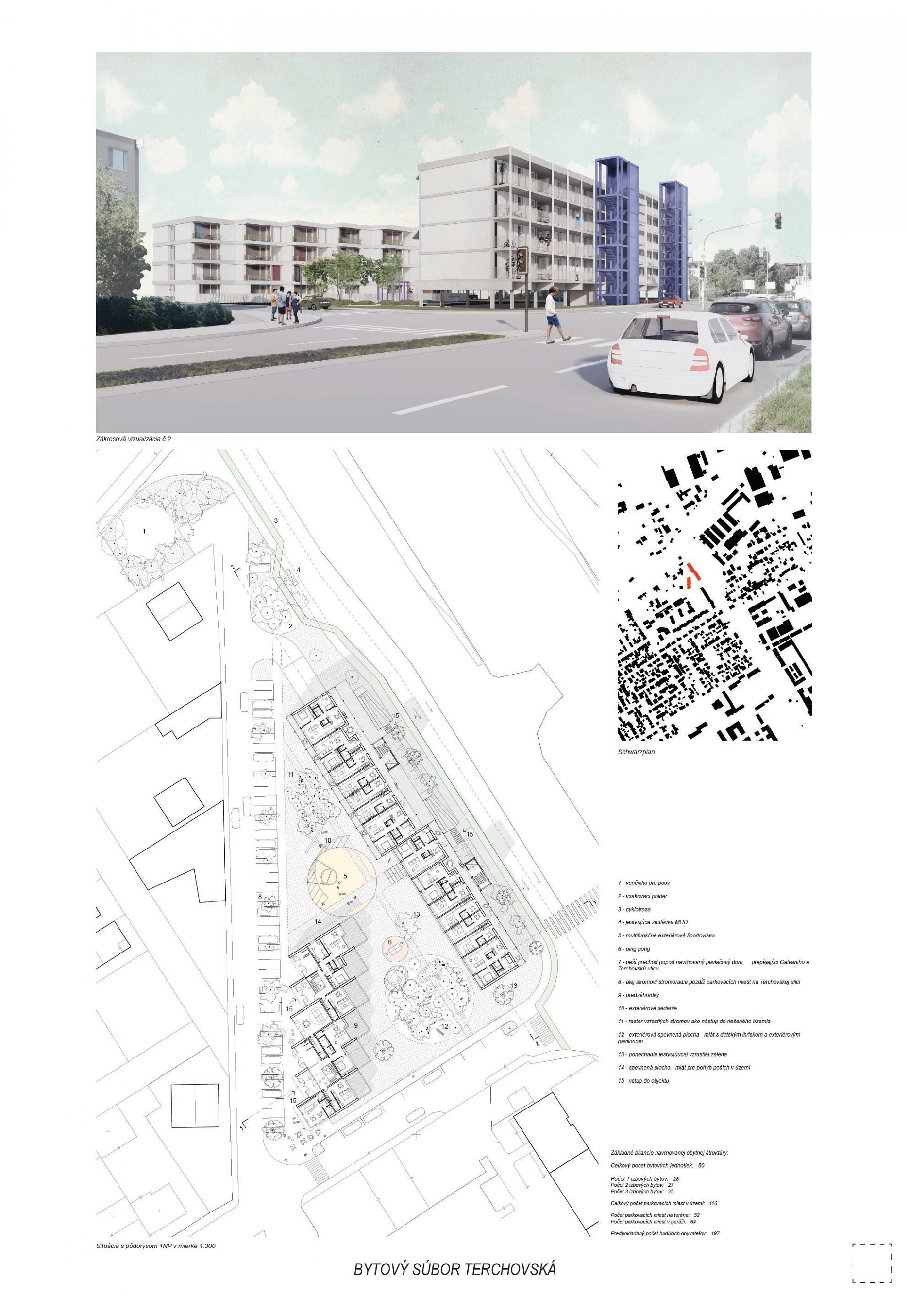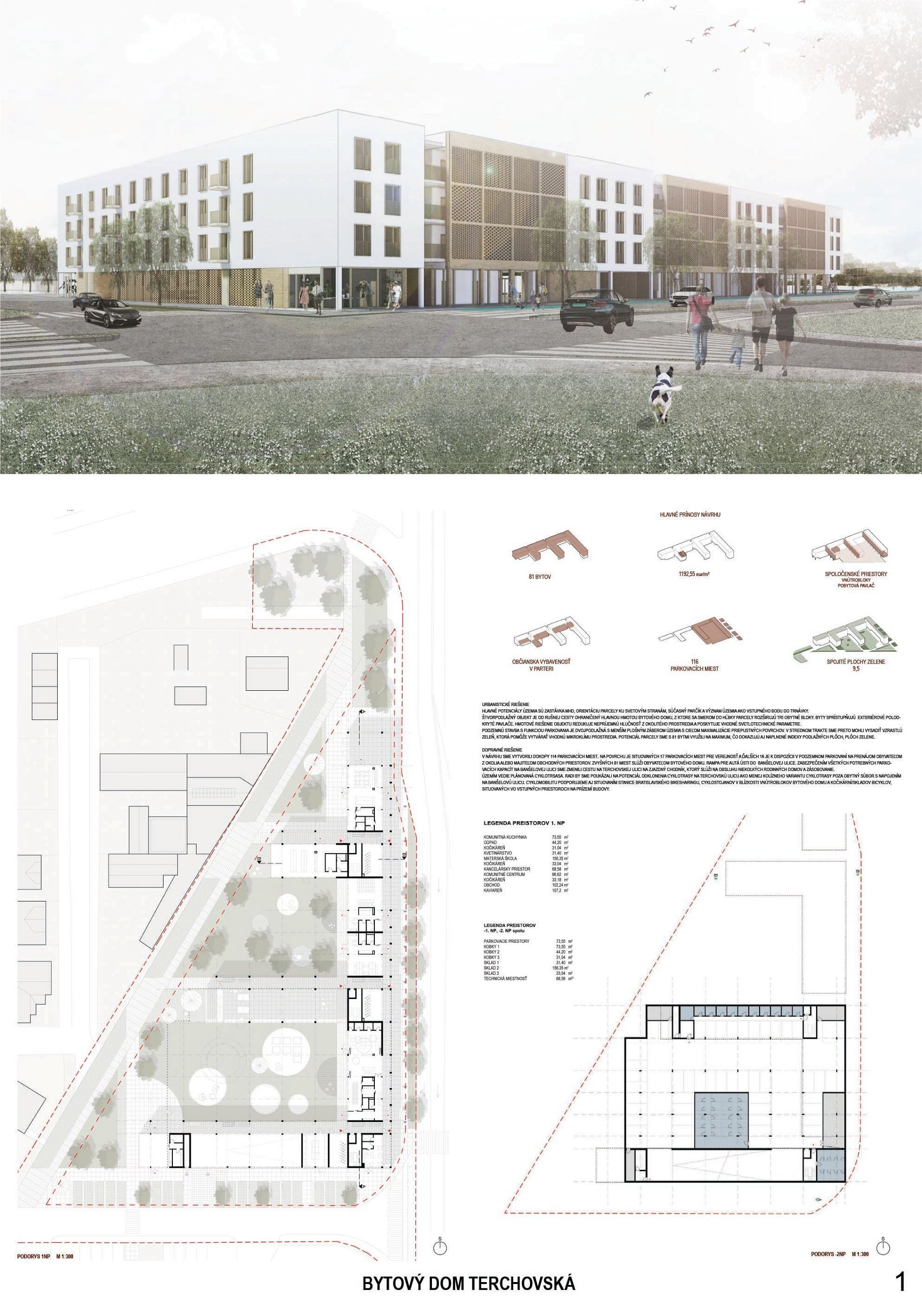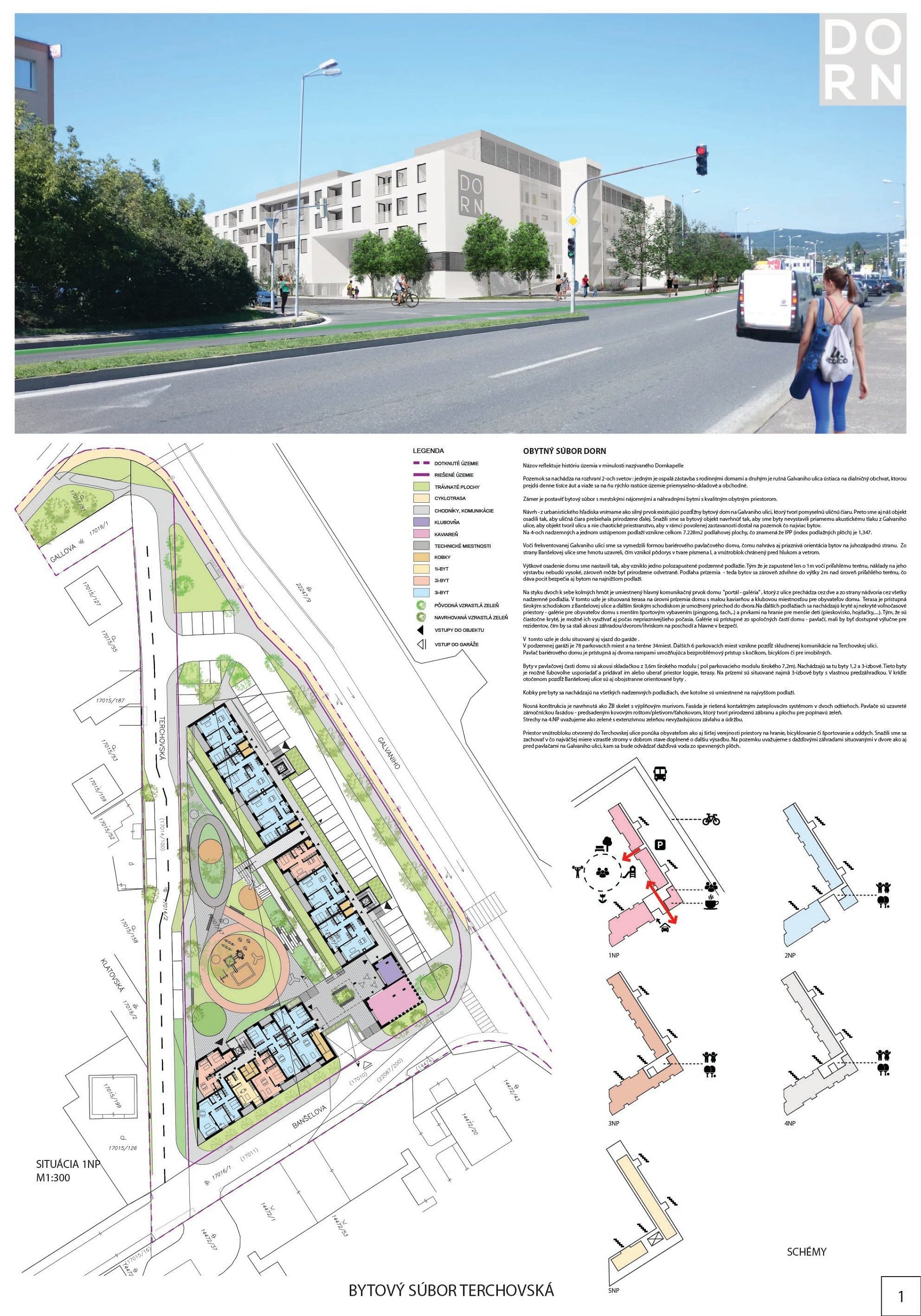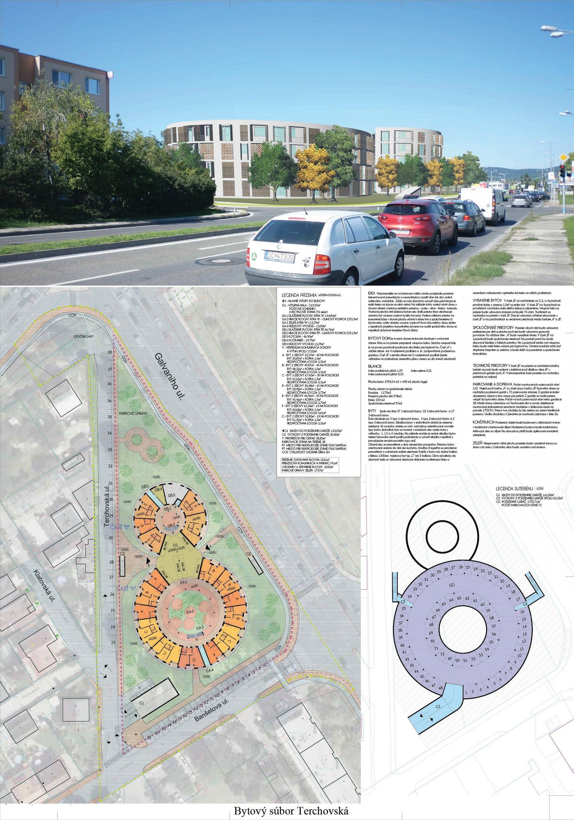 Pri víťaznom návrhu vyzdvihujeme predovšetkým vynikajúce urbanistické riešenie a citlivé začlenenie do územia. Bariérový pavlačový dom odtieňuje hluk z Galvaniho ulice a logicky dopĺňa rad štvorpodlažných panelových domov. Zároveň sa však ku koridoru Galvaniho ulice nestavia chrbtom, keď na oboch priečeliach autori umiestnili priestory vybavenosti. Správnosť tohto rozhodnutia potvrdzuje aj úprava a zvládnutie čelného priestoru pri križovatke Rožňavská - Galvaniho ulica. Skupina menších domov v západnej časti pozemku reaguje na mierku priľahlej zástavby a vytvára tak priepustné poloverejné priestory, ktoré nadväzujú na obdobné priestory medzi panelovými bytovými domami na juhovýchodnej strane Banšelovej ulice. Autori navyše vhodne umiestňujú vjazd do podzemnej halovej garáže do Banšelovej ulice, čím odľahčujú dynamickú dopravu v Terchovskej ulici a potvrdzujú jej status vedľajšej ukľudnenej slepej ulice.