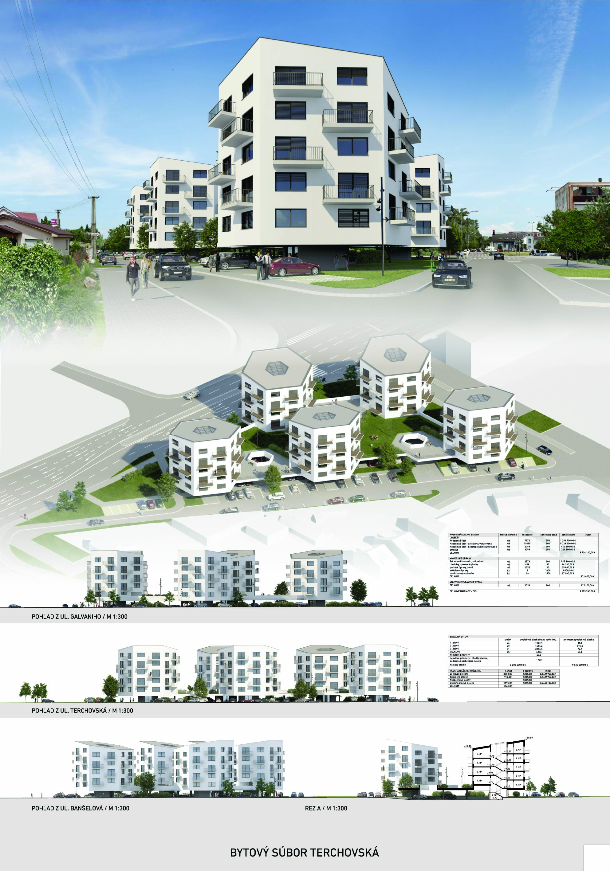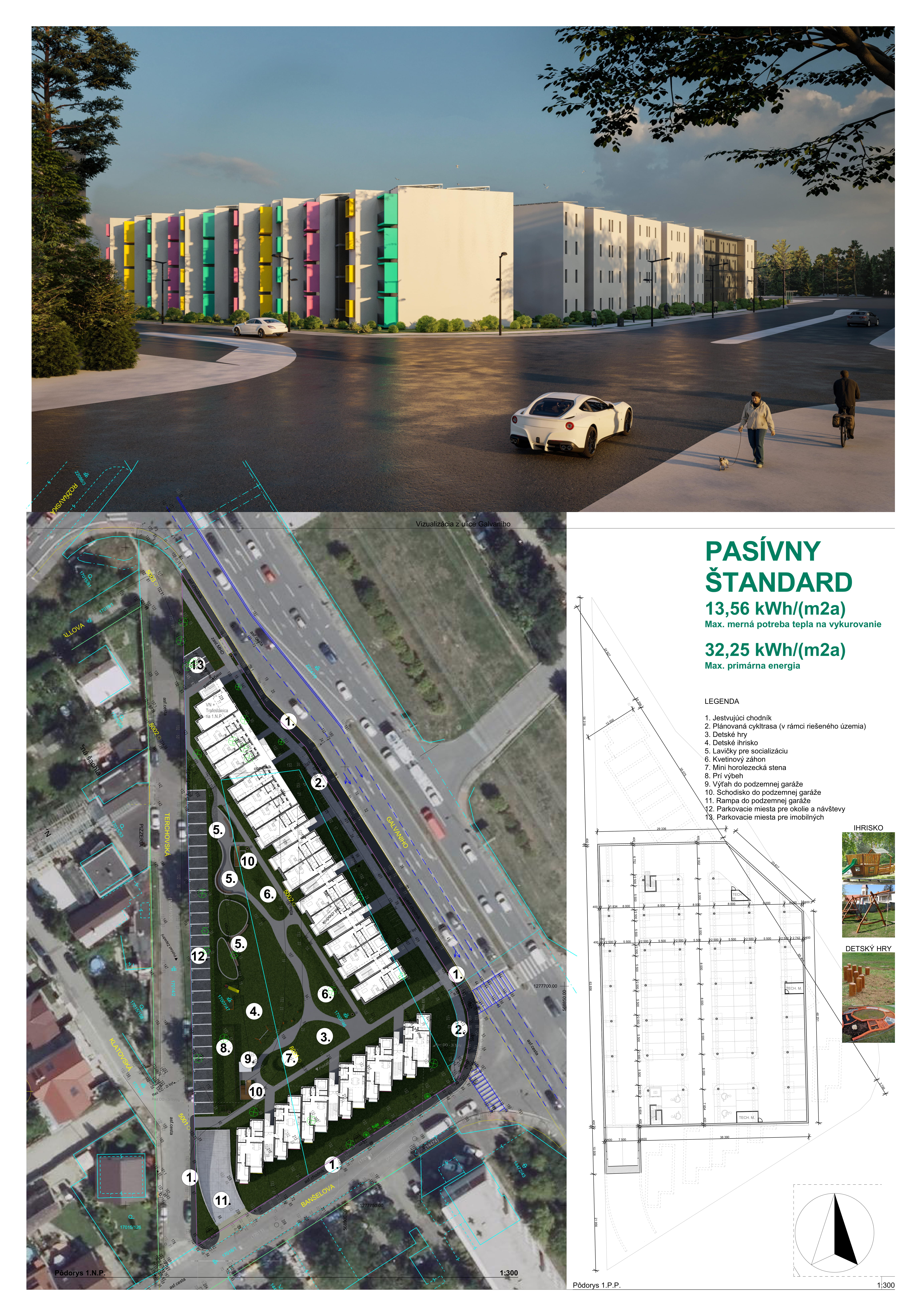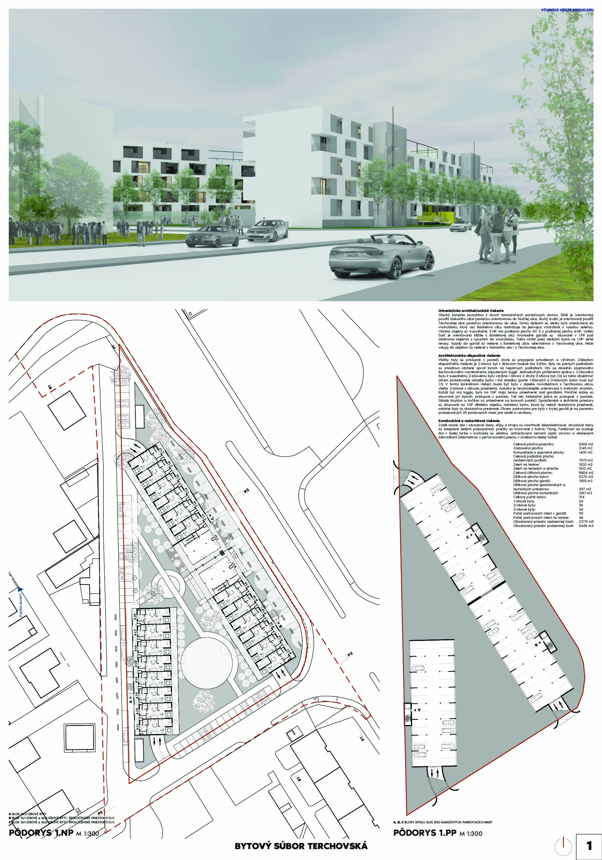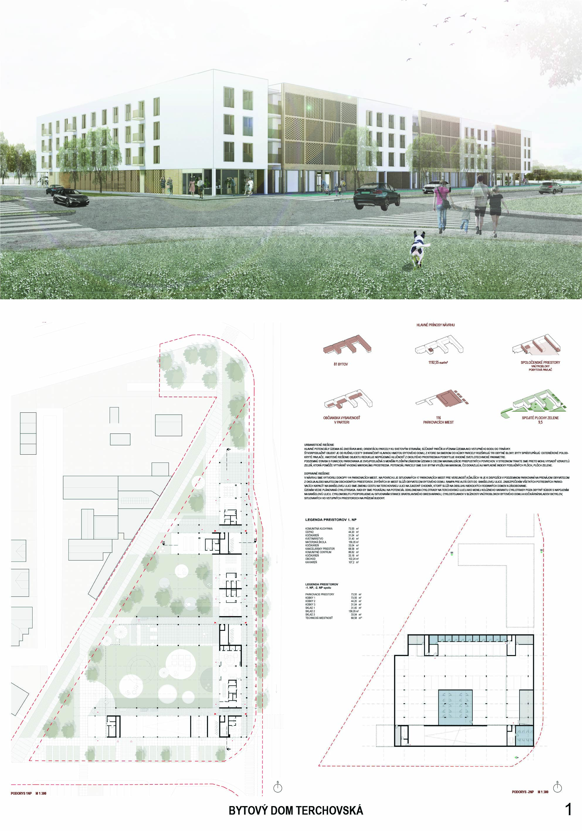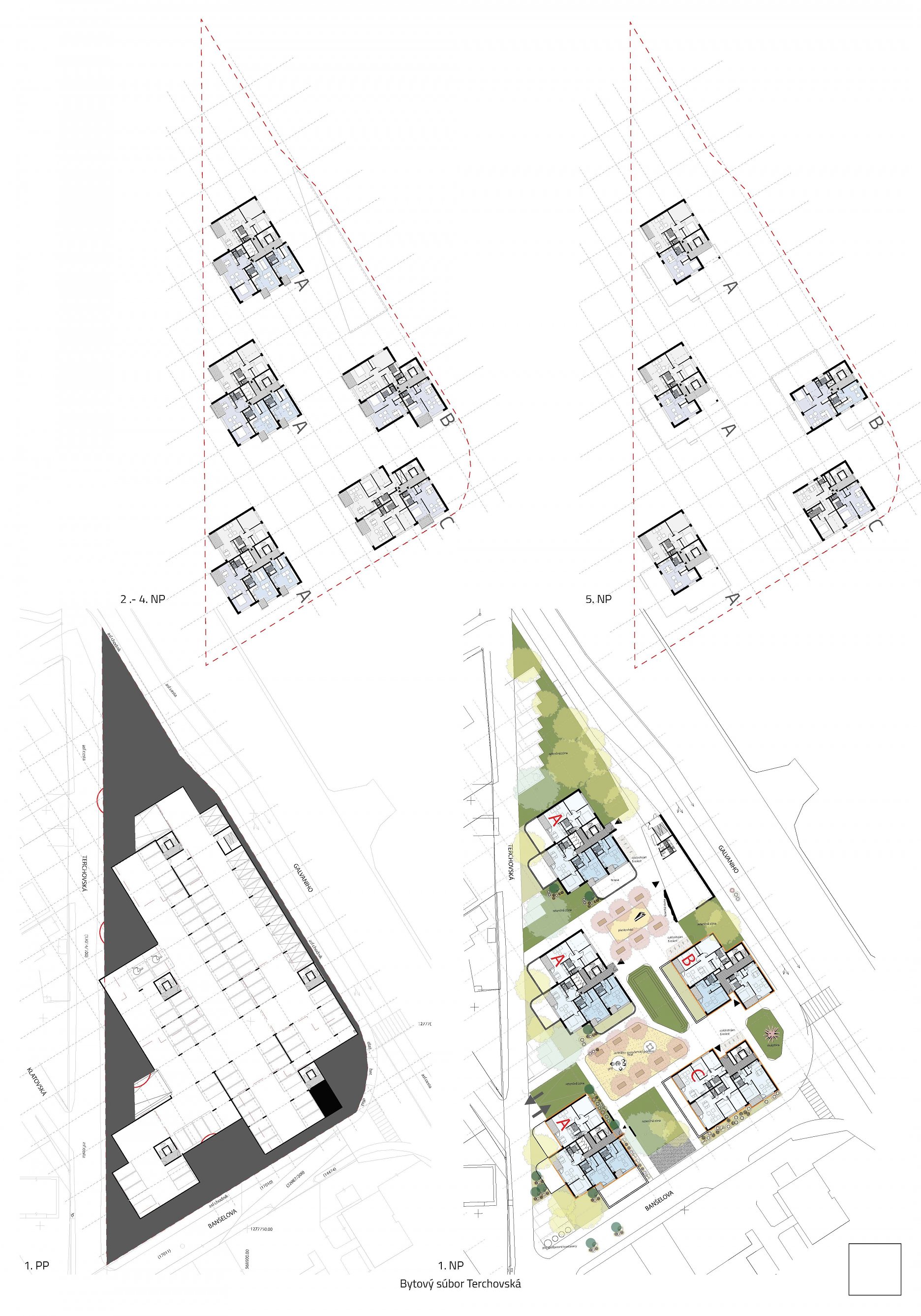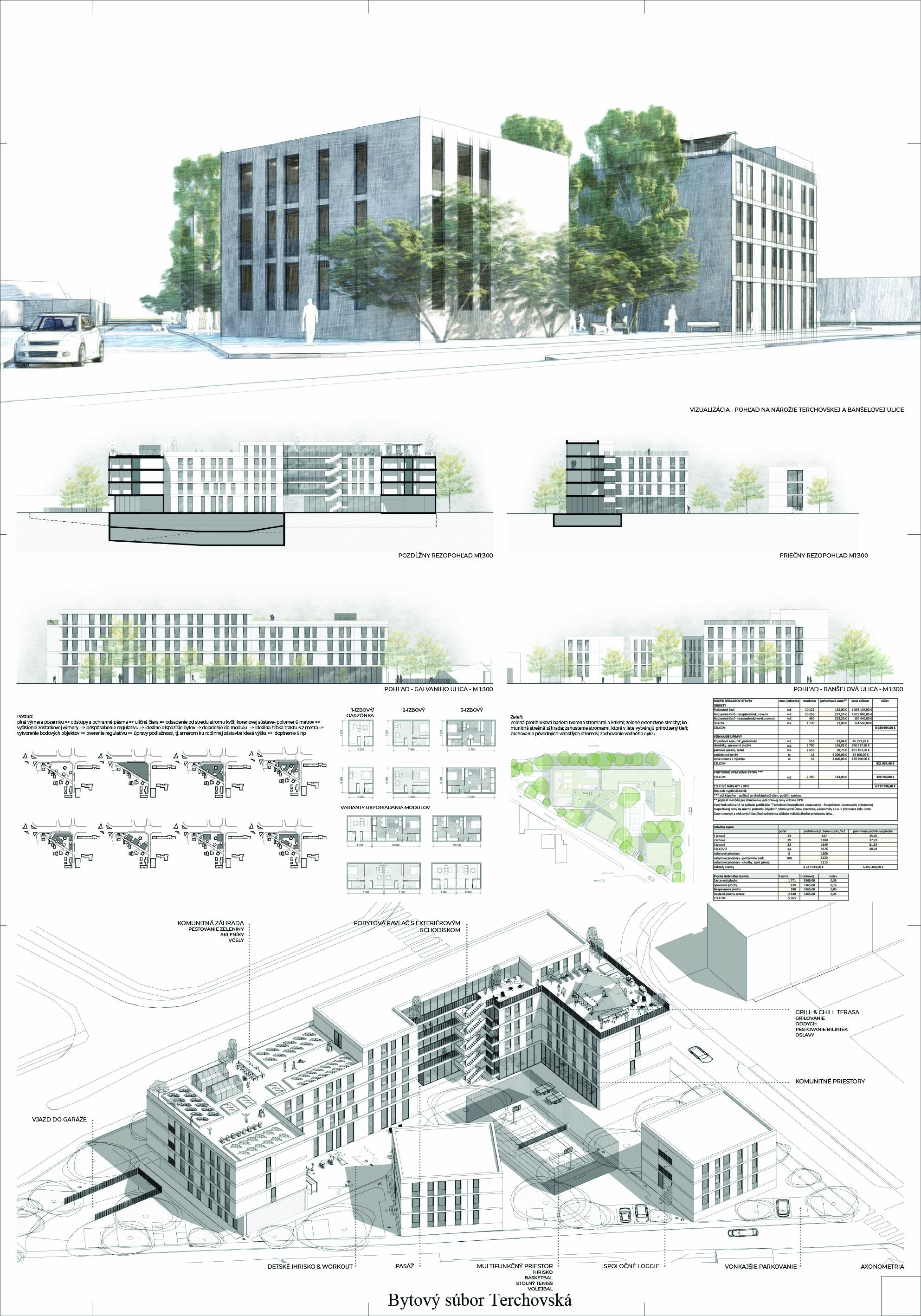 Pri víťaznom návrhu vyzdvihujeme predovšetkým vynikajúce urbanistické riešenie a citlivé začlenenie do územia. Bariérový pavlačový dom odtieňuje hluk z Galvaniho ulice a logicky dopĺňa rad štvorpodlažných panelových domov. Zároveň sa však ku koridoru Galvaniho ulice nestavia chrbtom, keď na oboch priečeliach autori umiestnili priestory vybavenosti. Správnosť tohto rozhodnutia potvrdzuje aj úprava a zvládnutie čelného priestoru pri križovatke Rožňavská - Galvaniho ulica. Skupina menších domov v západnej časti pozemku reaguje na mierku priľahlej zástavby a vytvára tak priepustné poloverejné priestory, ktoré nadväzujú na obdobné priestory medzi panelovými bytovými domami na juhovýchodnej strane Banšelovej ulice. Autori navyše vhodne umiestňujú vjazd do podzemnej halovej garáže do Banšelovej ulice, čím odľahčujú dynamickú dopravu v Terchovskej ulici a potvrdzujú jej status vedľajšej ukľudnenej slepej ulice.