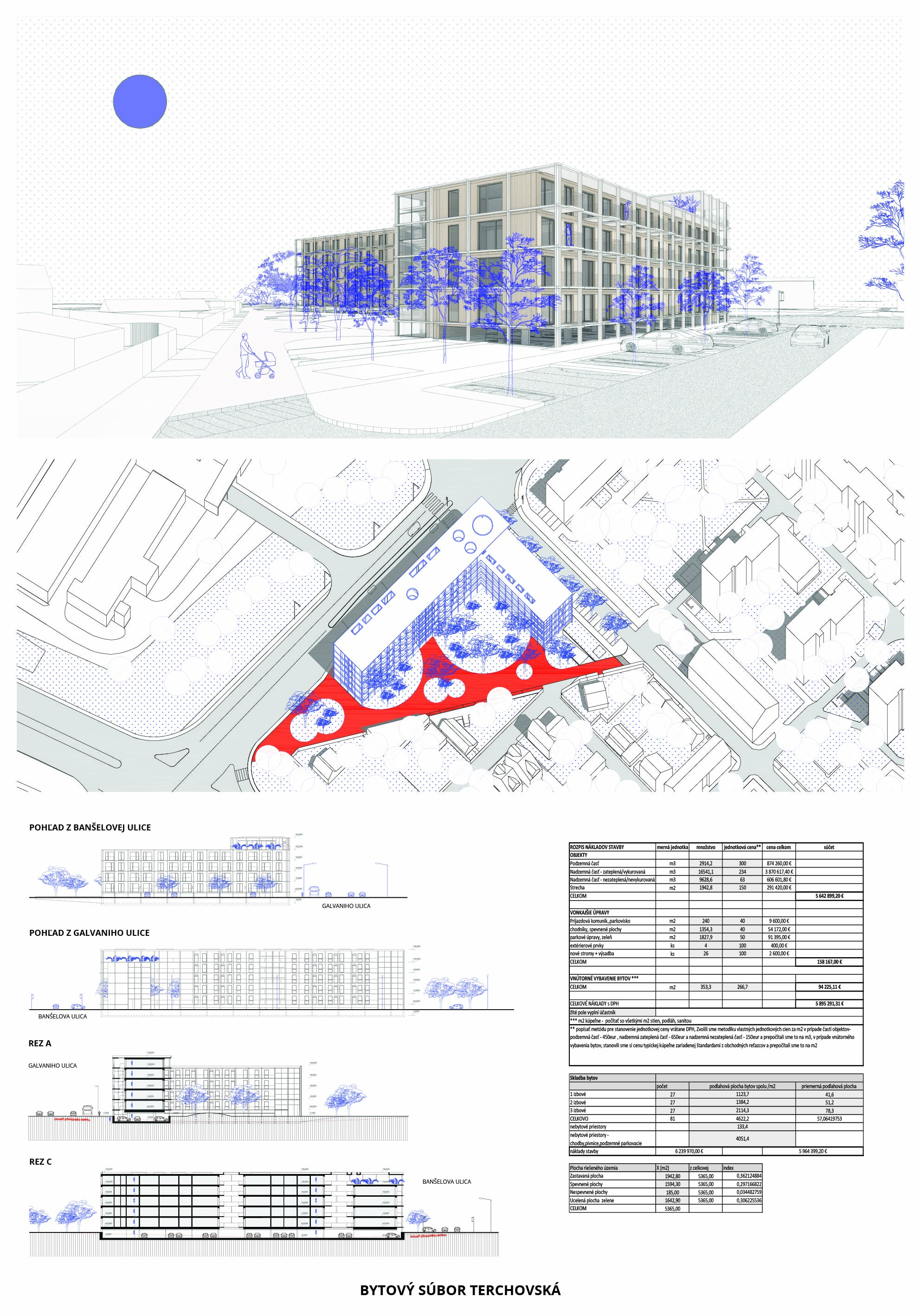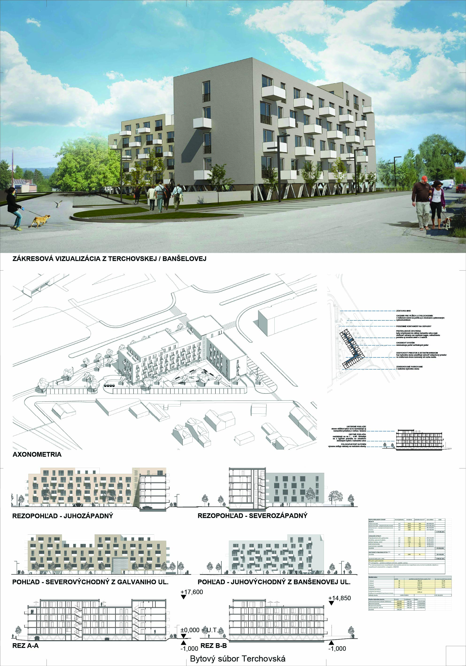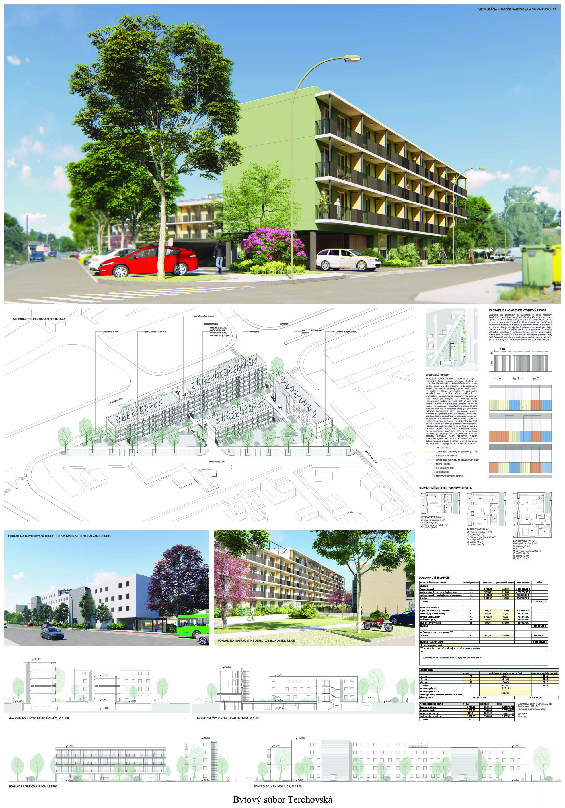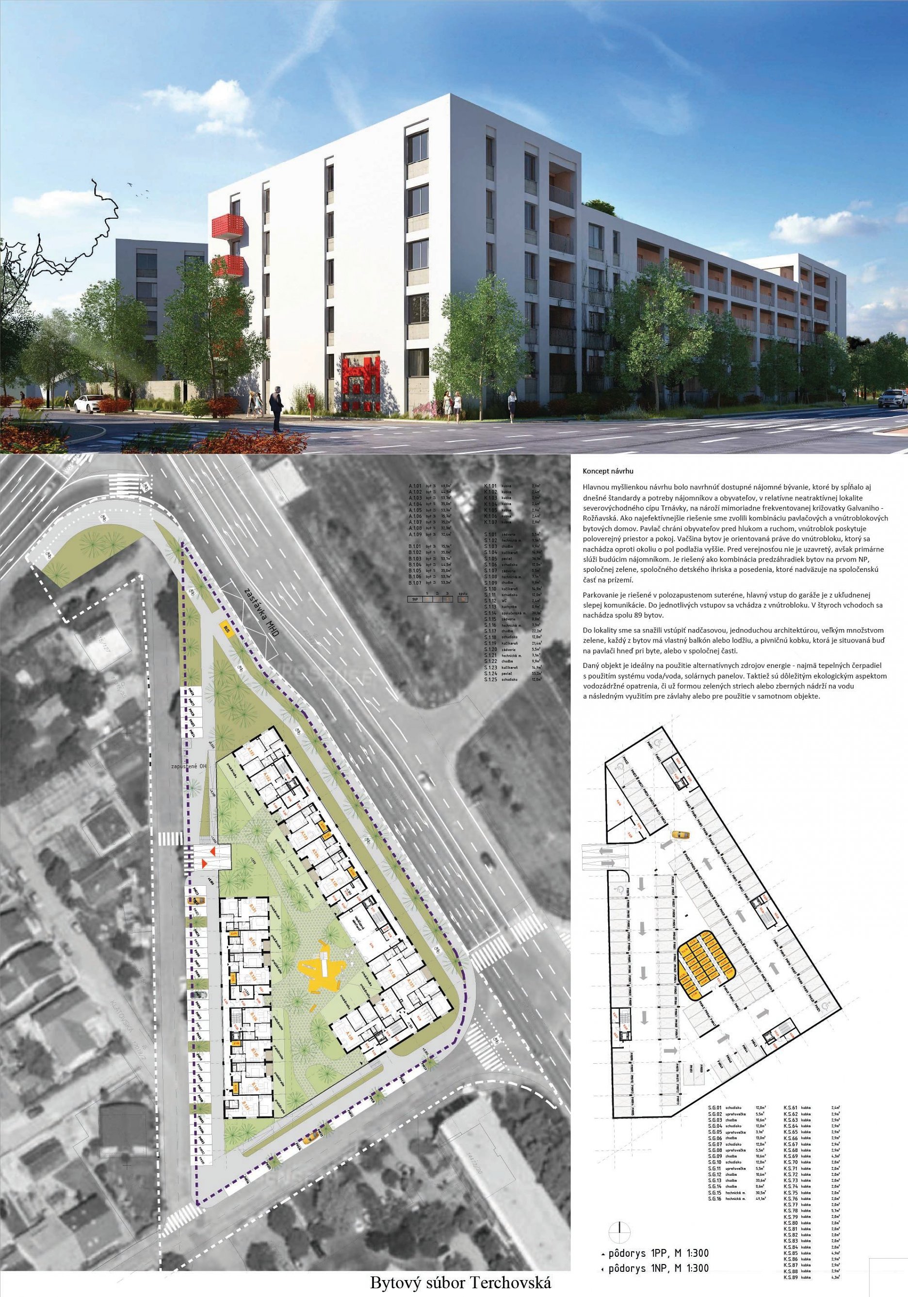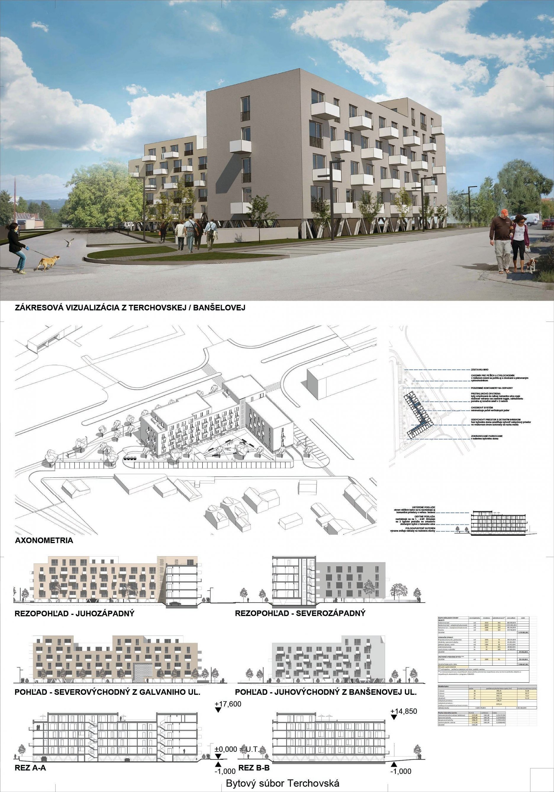 Pri víťaznom návrhu vyzdvihujeme predovšetkým vynikajúce urbanistické riešenie a citlivé začlenenie do územia. Bariérový pavlačový dom odtieňuje hluk z Galvaniho ulice a logicky dopĺňa rad štvorpodlažných panelových domov. Zároveň sa však ku koridoru Galvaniho ulice nestavia chrbtom, keď na oboch priečeliach autori umiestnili priestory vybavenosti. Správnosť tohto rozhodnutia potvrdzuje aj úprava a zvládnutie čelného priestoru pri križovatke Rožňavská - Galvaniho ulica. Skupina menších domov v západnej časti pozemku reaguje na mierku priľahlej zástavby a vytvára tak priepustné poloverejné priestory, ktoré nadväzujú na obdobné priestory medzi panelovými bytovými domami na juhovýchodnej strane Banšelovej ulice. Autori navyše vhodne umiestňujú vjazd do podzemnej halovej garáže do Banšelovej ulice, čím odľahčujú dynamickú dopravu v Terchovskej ulici a potvrdzujú jej status vedľajšej ukľudnenej slepej ulice.