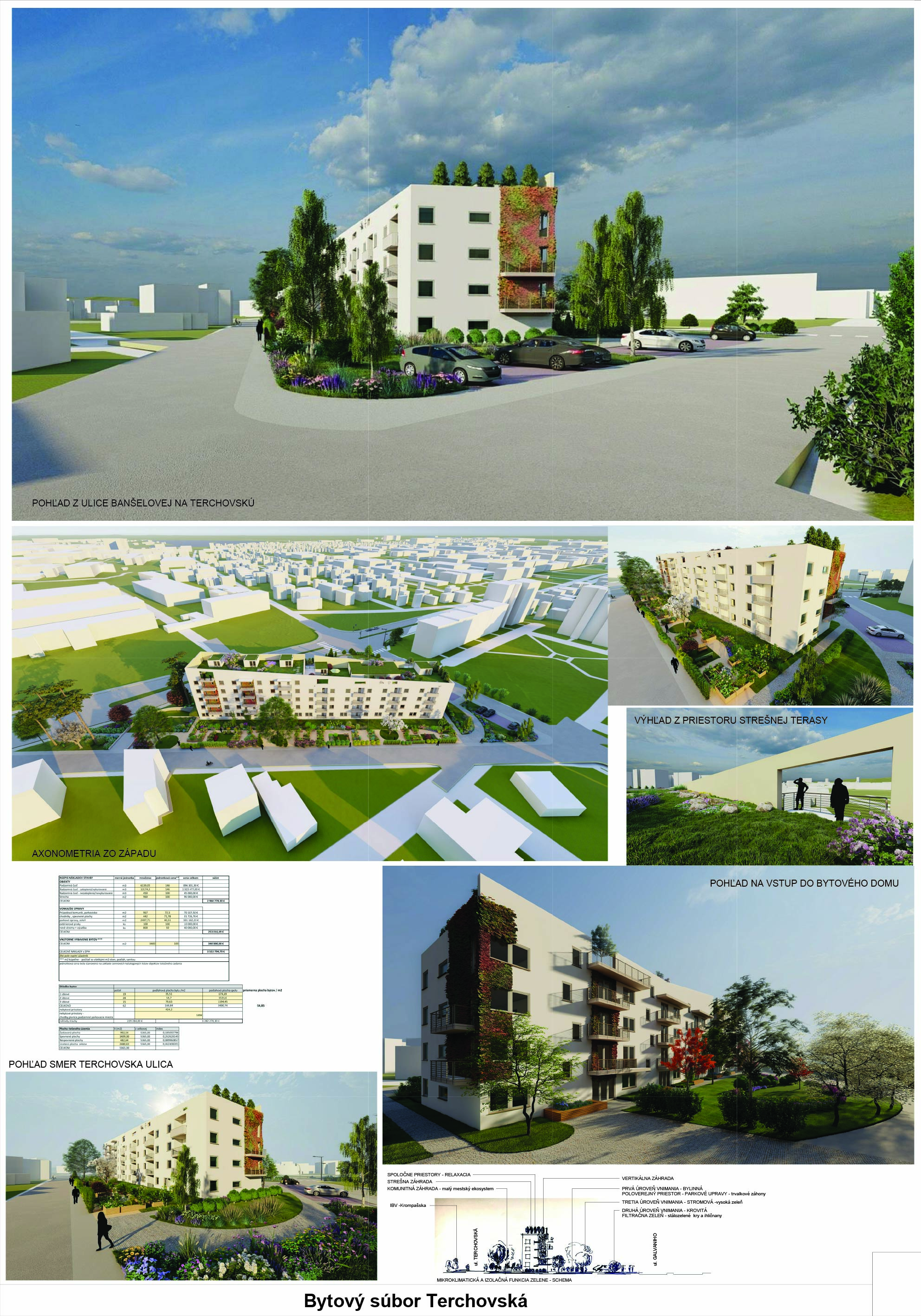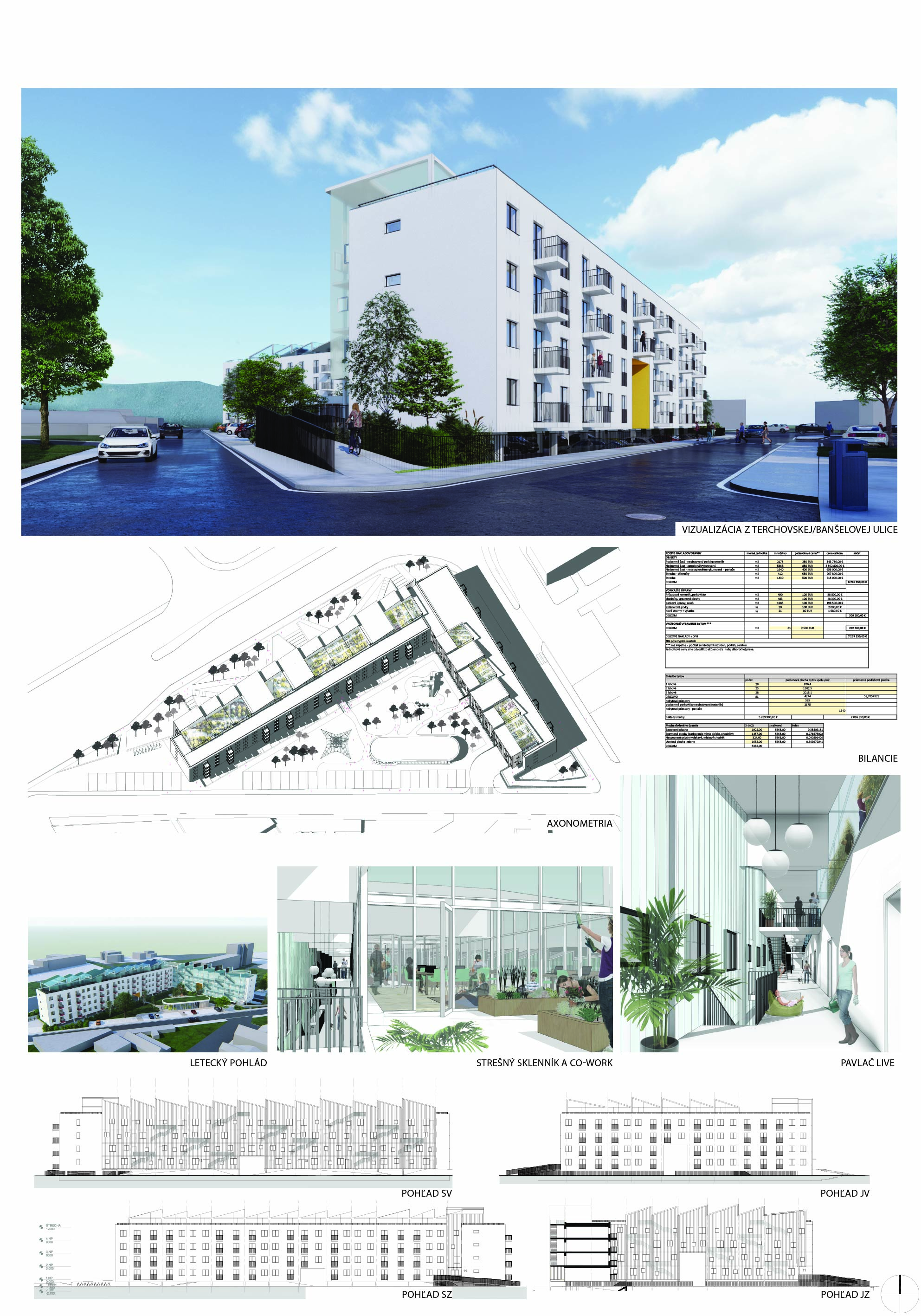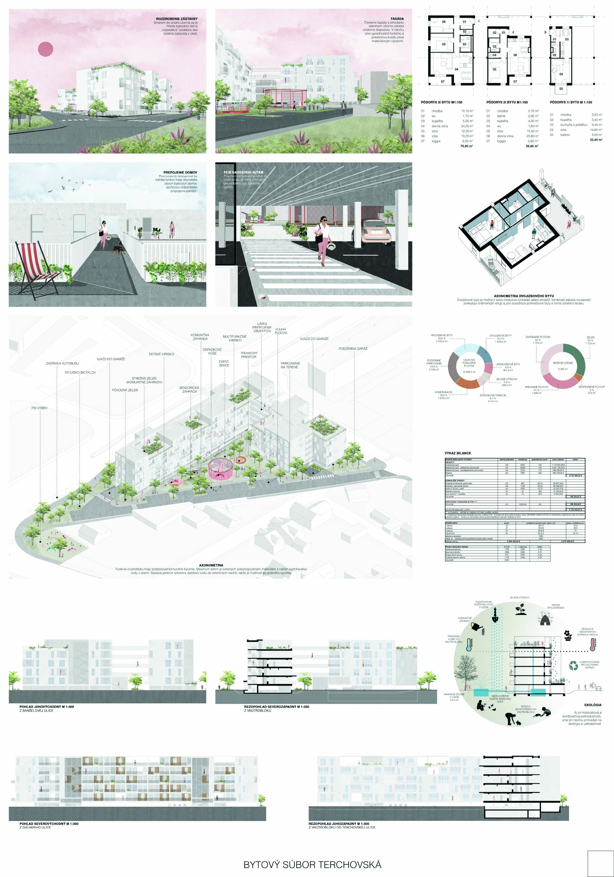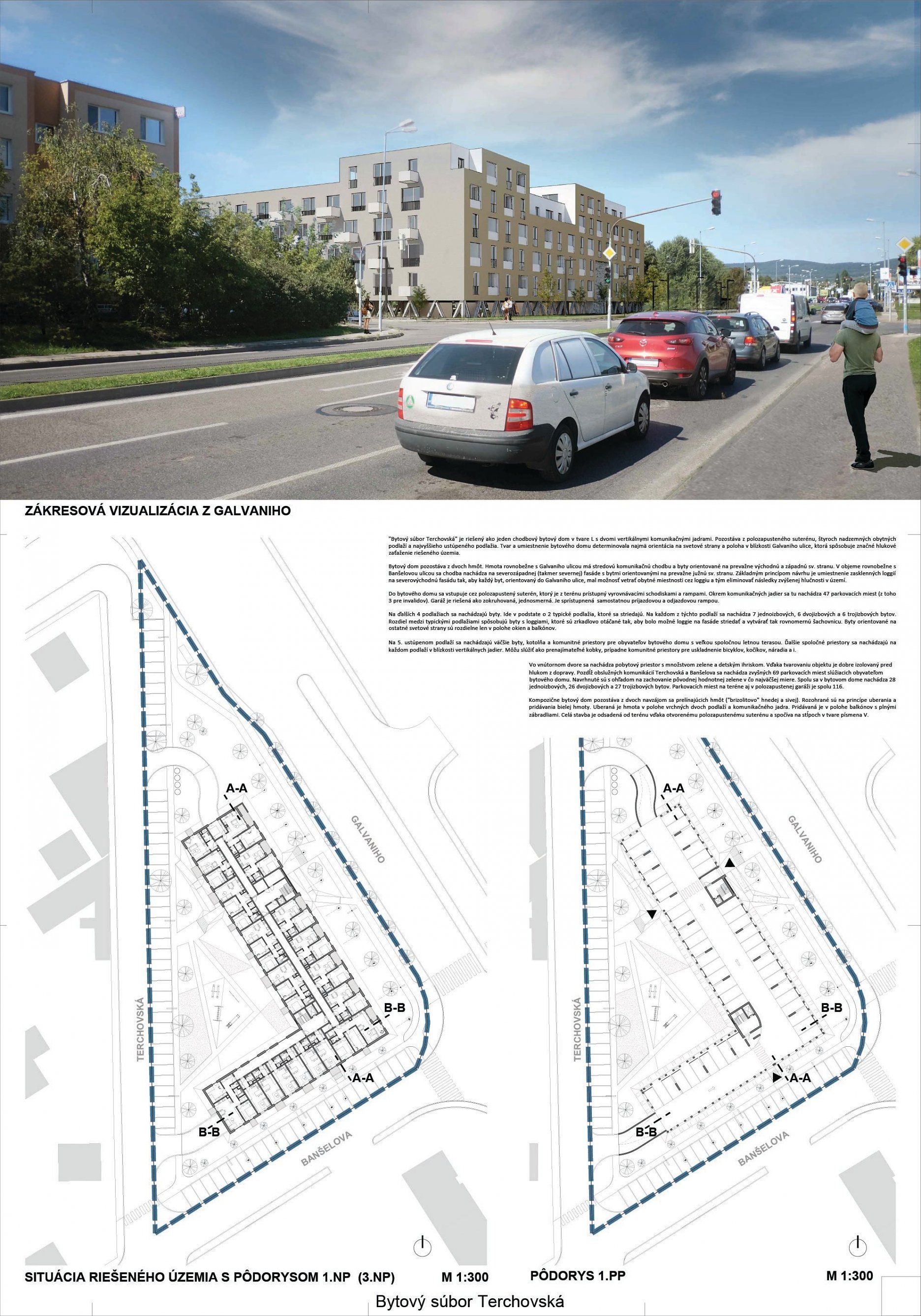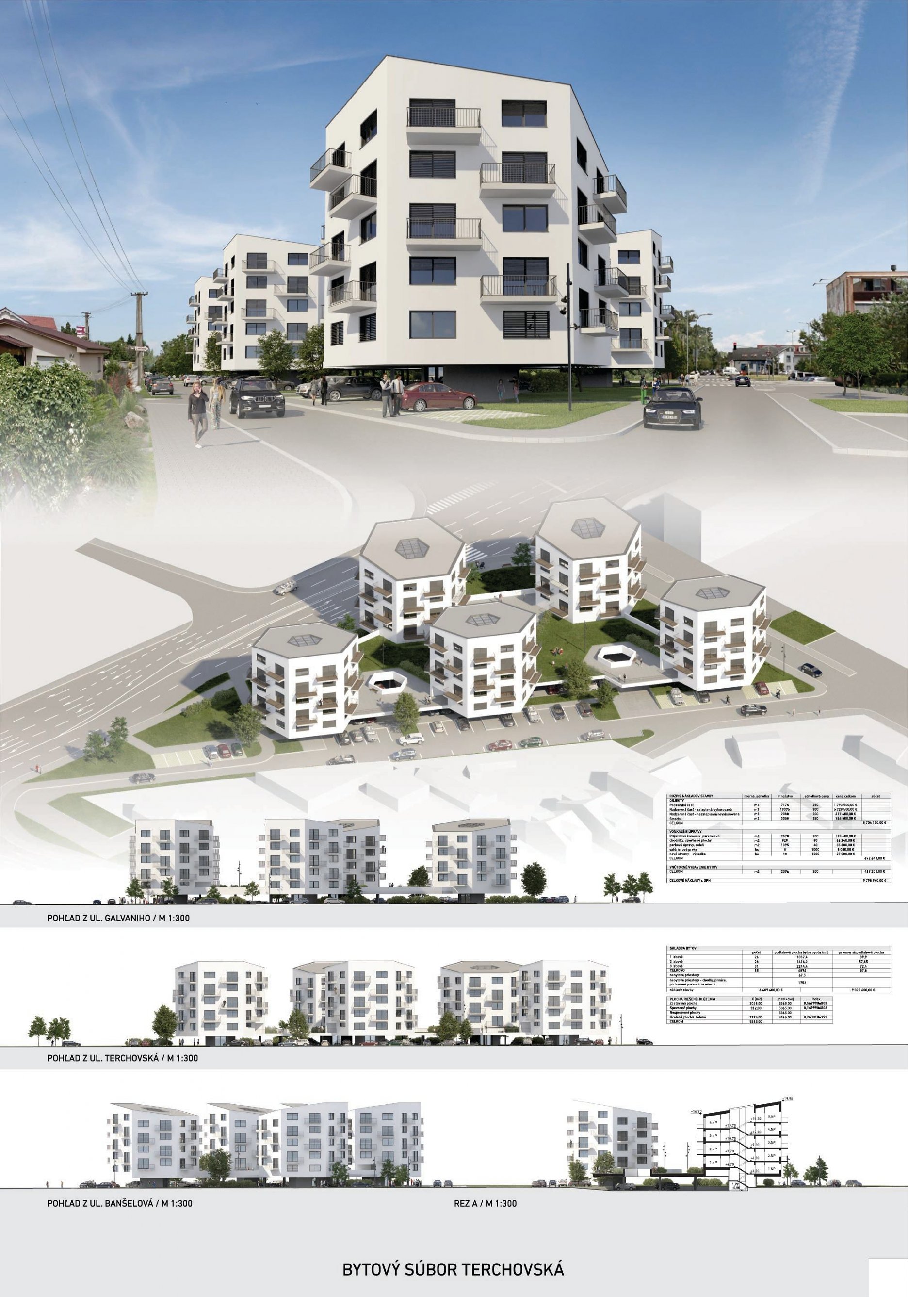 Pri víťaznom návrhu vyzdvihujeme predovšetkým vynikajúce urbanistické riešenie a citlivé začlenenie do územia. Bariérový pavlačový dom odtieňuje hluk z Galvaniho ulice a logicky dopĺňa rad štvorpodlažných panelových domov. Zároveň sa však ku koridoru Galvaniho ulice nestavia chrbtom, keď na oboch priečeliach autori umiestnili priestory vybavenosti. Správnosť tohto rozhodnutia potvrdzuje aj úprava a zvládnutie čelného priestoru pri križovatke Rožňavská - Galvaniho ulica. Skupina menších domov v západnej časti pozemku reaguje na mierku priľahlej zástavby a vytvára tak priepustné poloverejné priestory, ktoré nadväzujú na obdobné priestory medzi panelovými bytovými domami na juhovýchodnej strane Banšelovej ulice. Autori navyše vhodne umiestňujú vjazd do podzemnej halovej garáže do Banšelovej ulice, čím odľahčujú dynamickú dopravu v Terchovskej ulici a potvrdzujú jej status vedľajšej ukľudnenej slepej ulice.