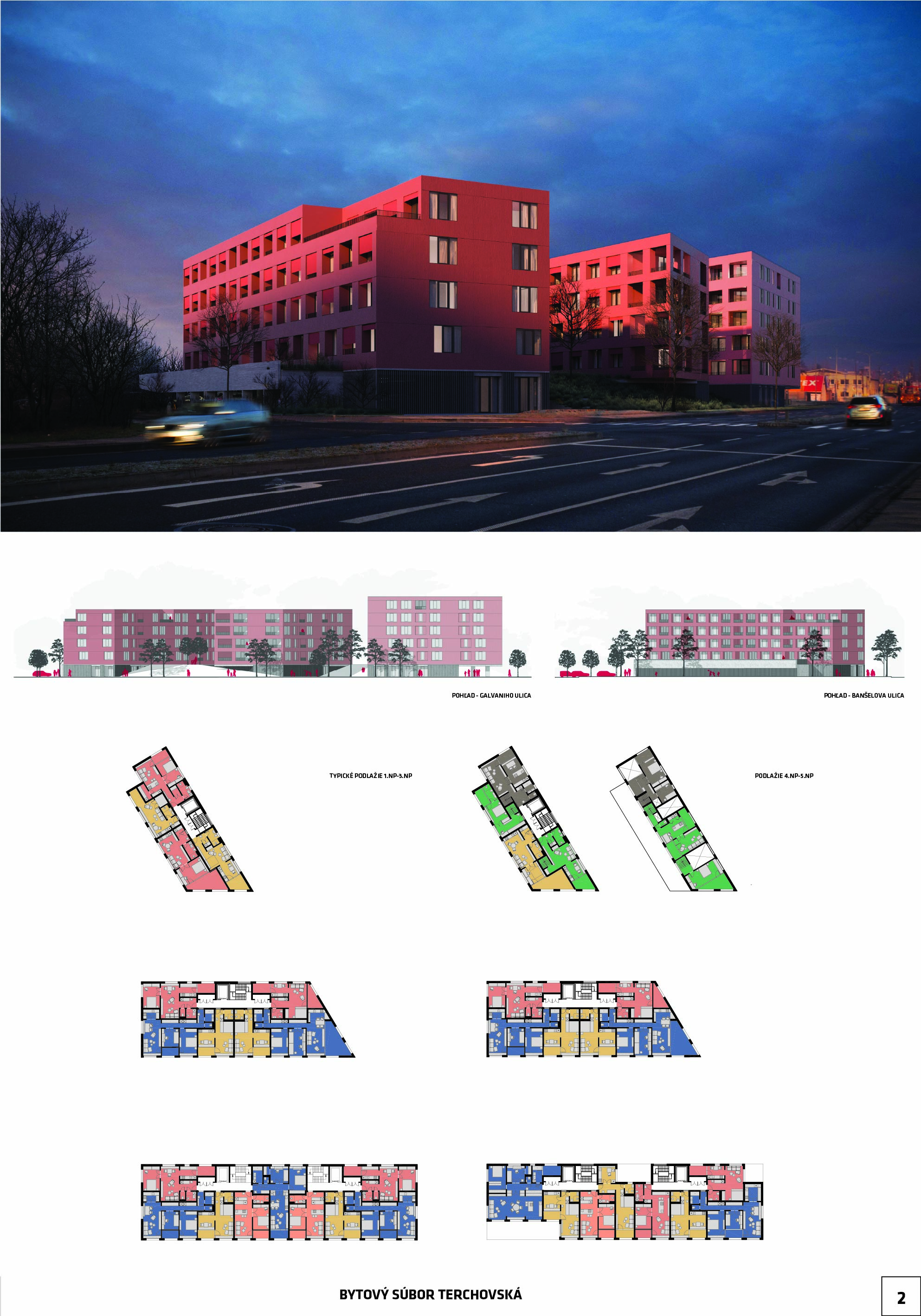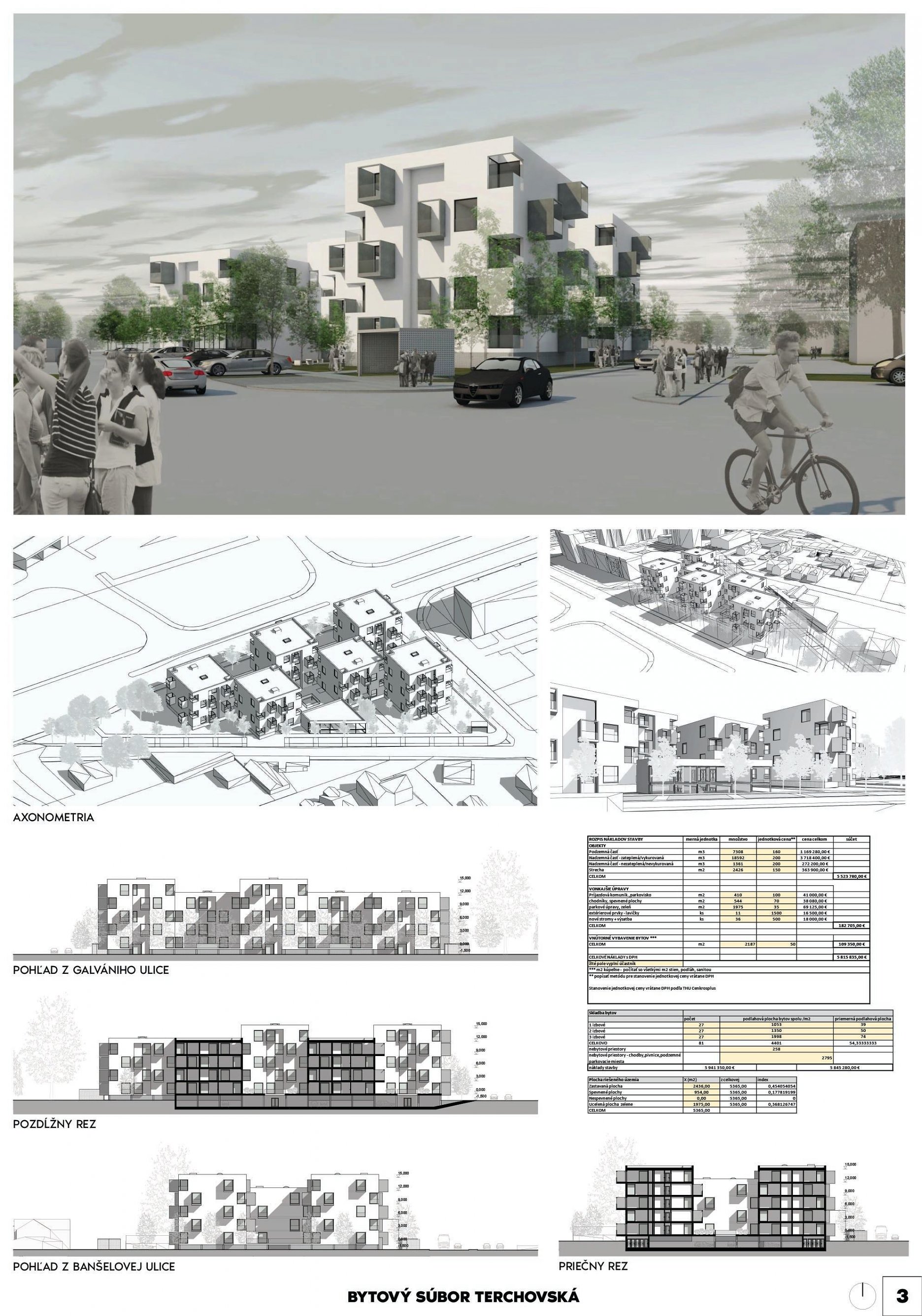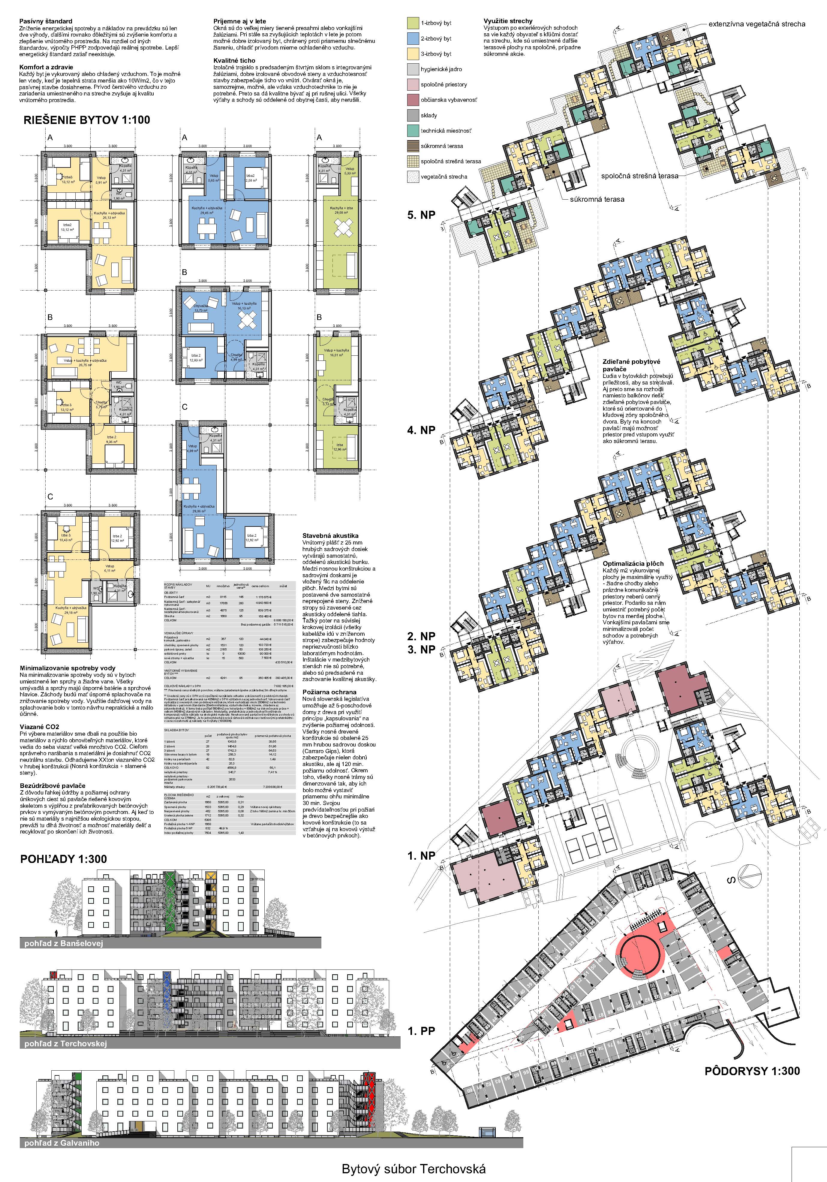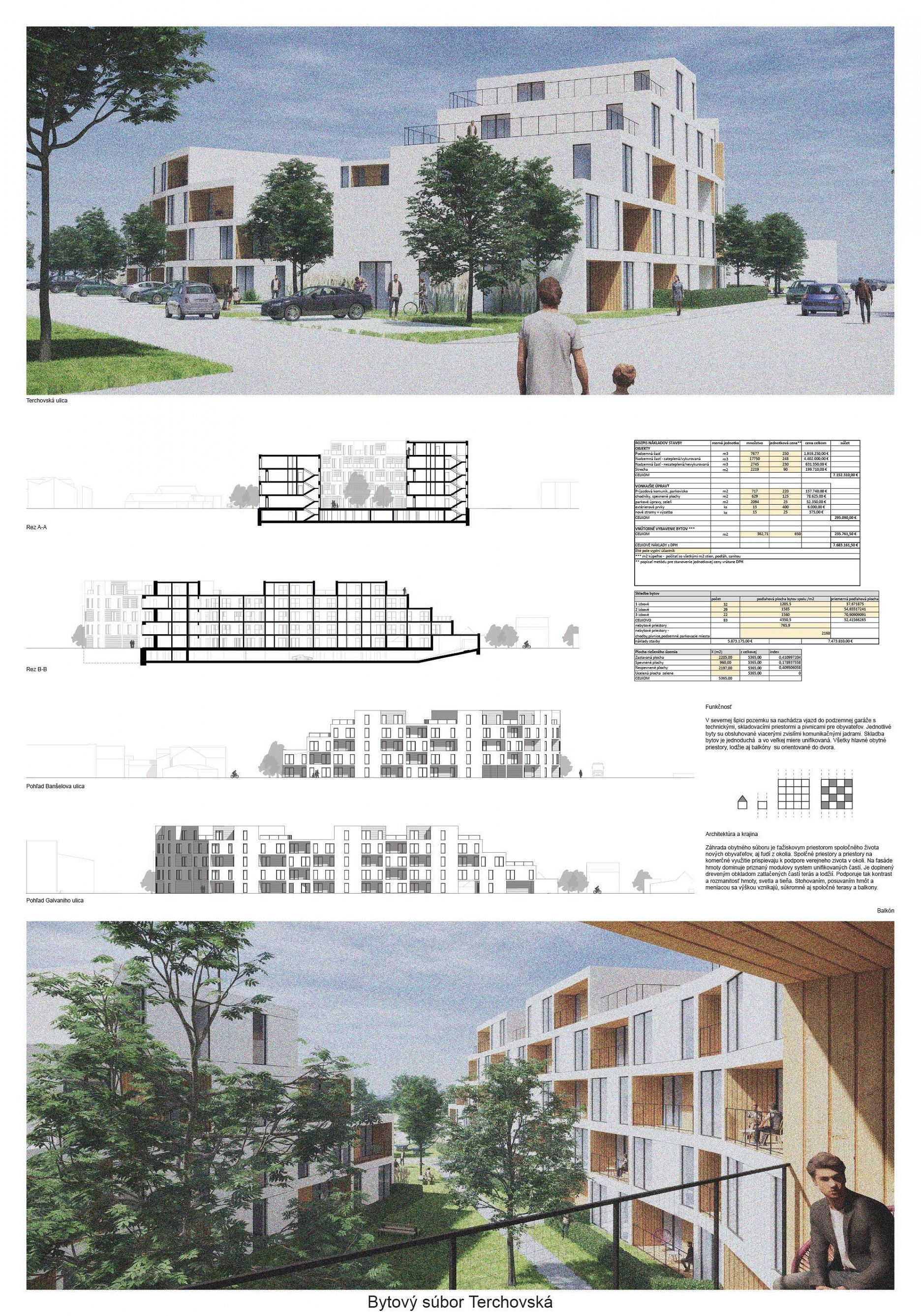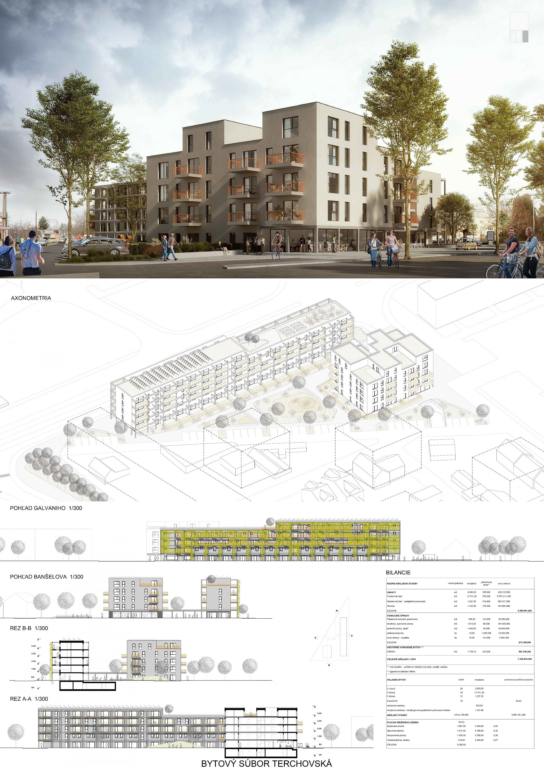 Pri víťaznom návrhu vyzdvihujeme predovšetkým vynikajúce urbanistické riešenie a citlivé začlenenie do územia. Bariérový pavlačový dom odtieňuje hluk z Galvaniho ulice a logicky dopĺňa rad štvorpodlažných panelových domov. Zároveň sa však ku koridoru Galvaniho ulice nestavia chrbtom, keď na oboch priečeliach autori umiestnili priestory vybavenosti. Správnosť tohto rozhodnutia potvrdzuje aj úprava a zvládnutie čelného priestoru pri križovatke Rožňavská - Galvaniho ulica. Skupina menších domov v západnej časti pozemku reaguje na mierku priľahlej zástavby a vytvára tak priepustné poloverejné priestory, ktoré nadväzujú na obdobné priestory medzi panelovými bytovými domami na juhovýchodnej strane Banšelovej ulice. Autori navyše vhodne umiestňujú vjazd do podzemnej halovej garáže do Banšelovej ulice, čím odľahčujú dynamickú dopravu v Terchovskej ulici a potvrdzujú jej status vedľajšej ukľudnenej slepej ulice.