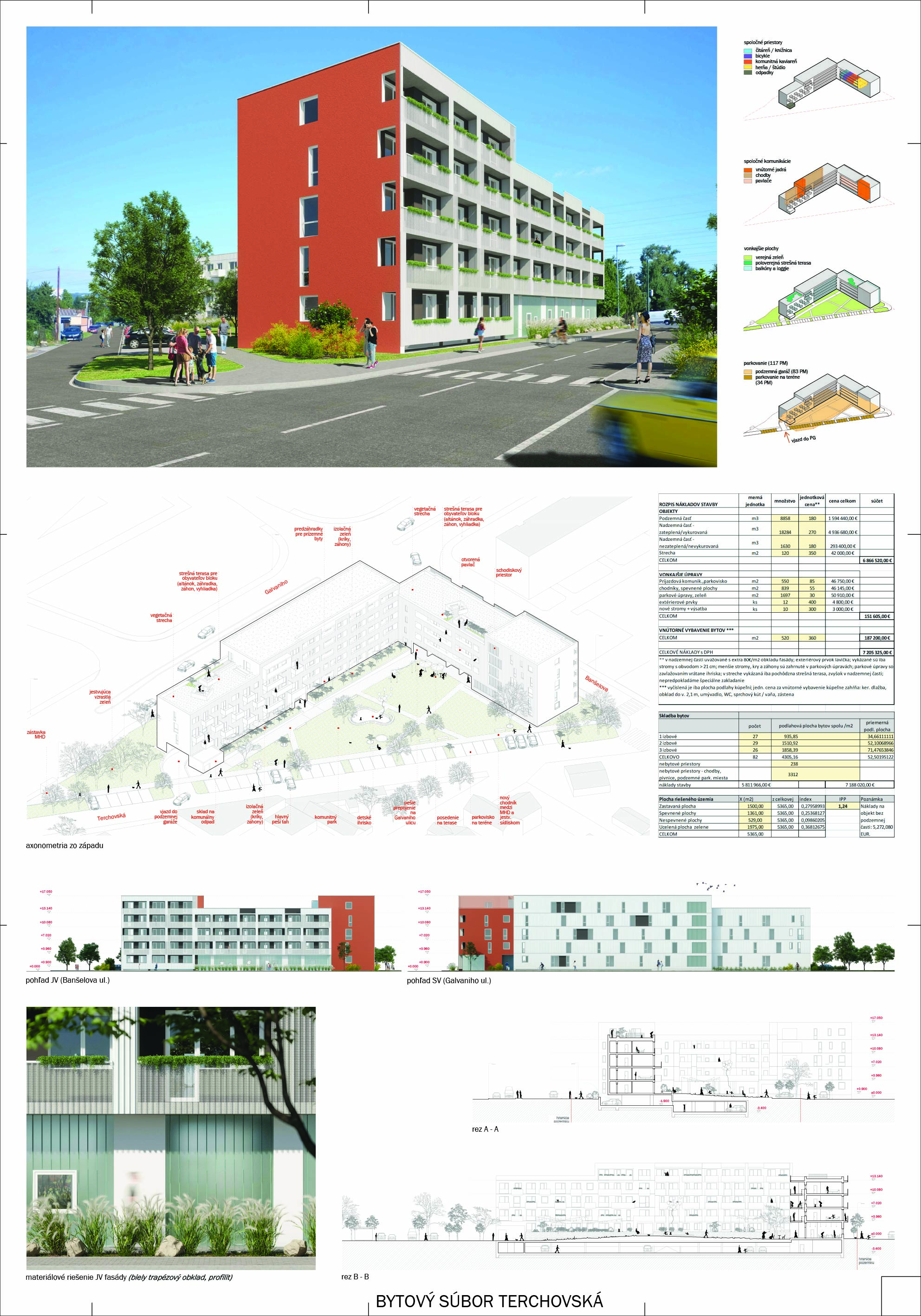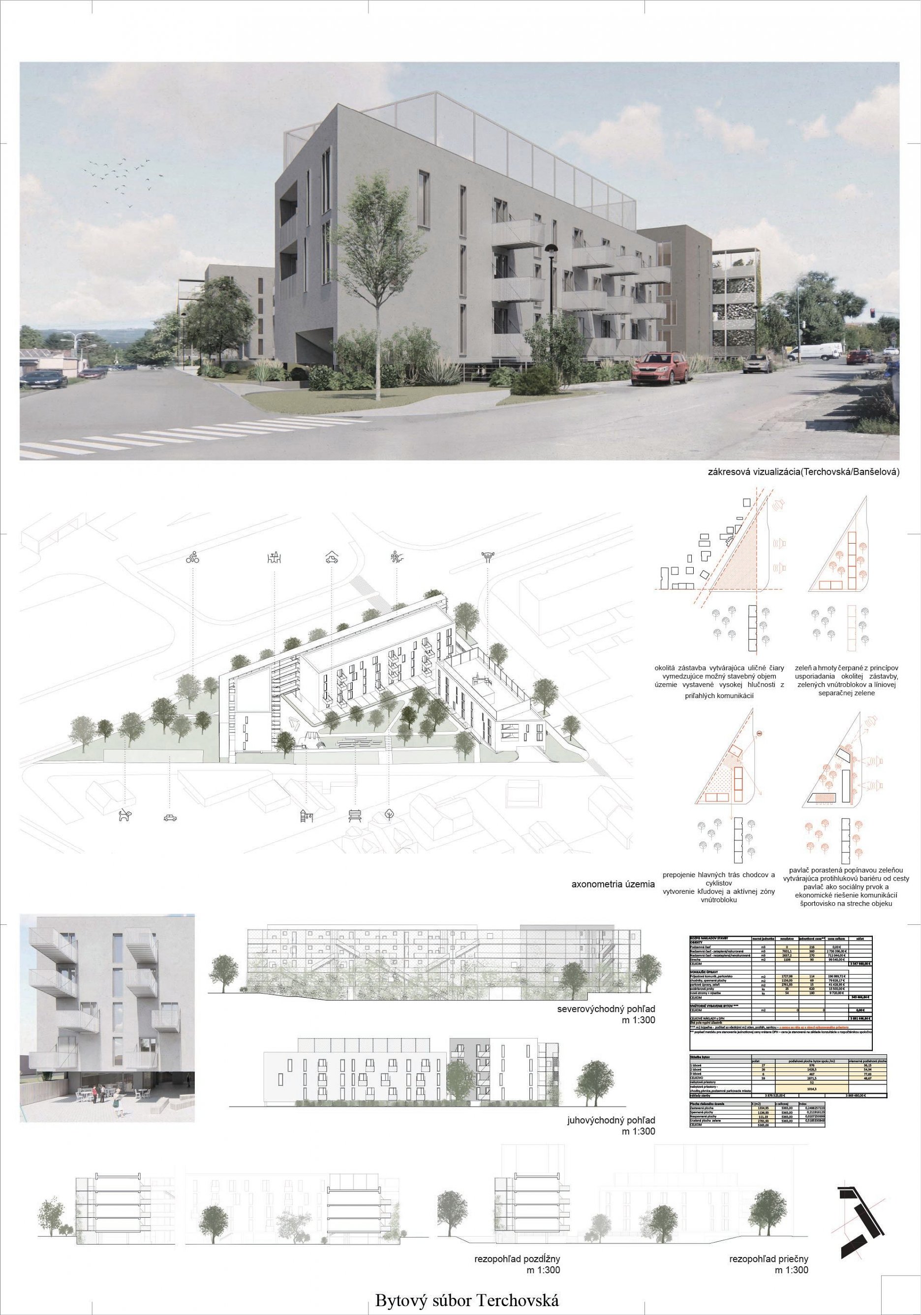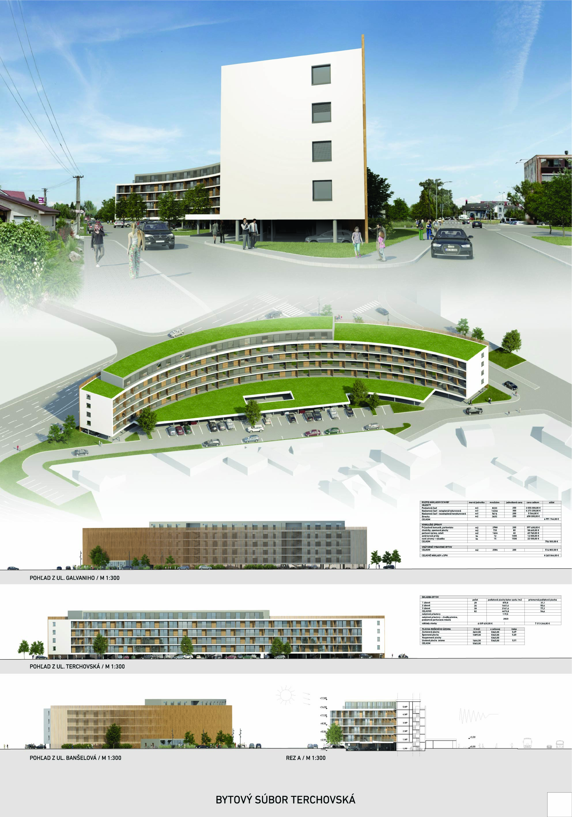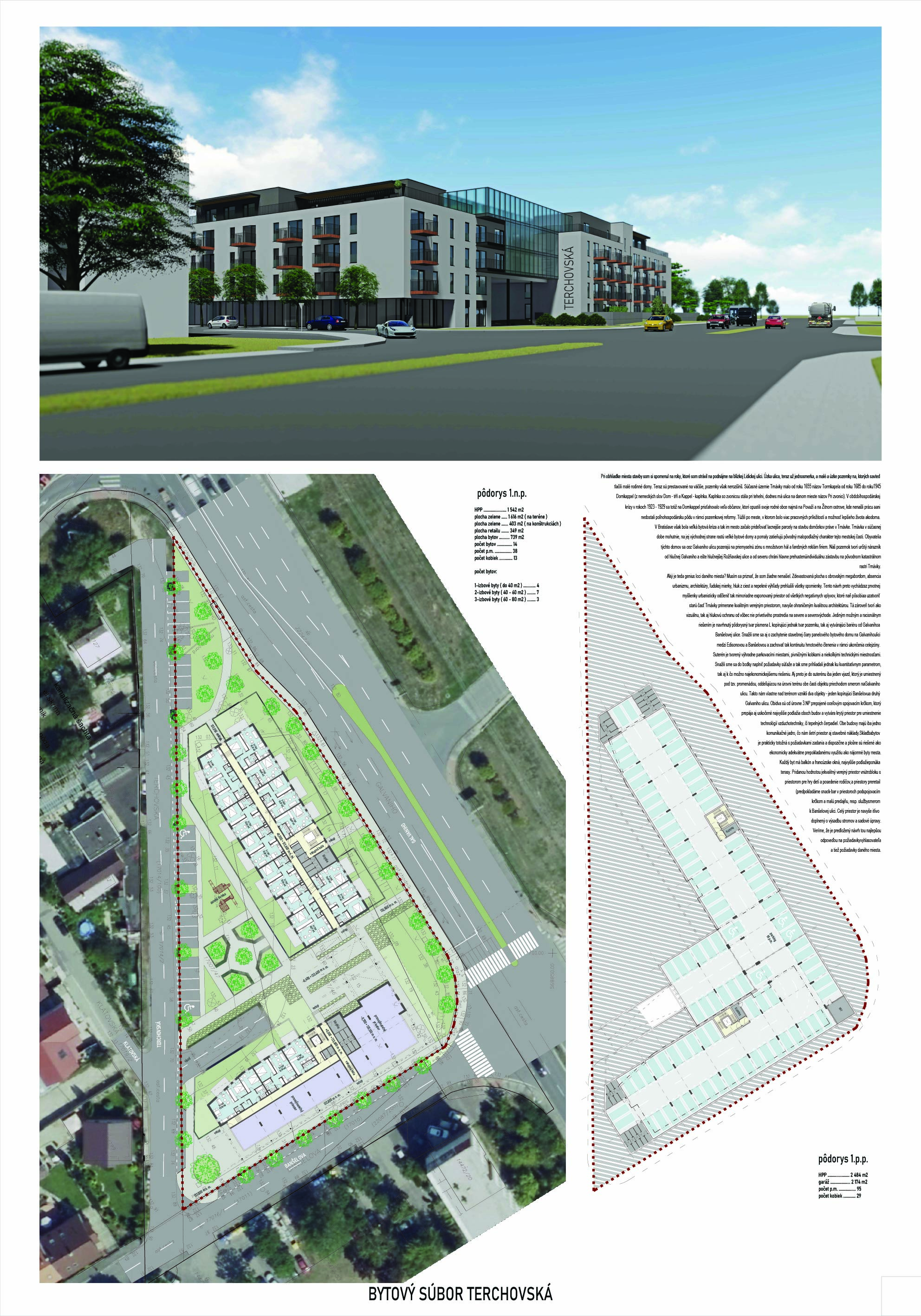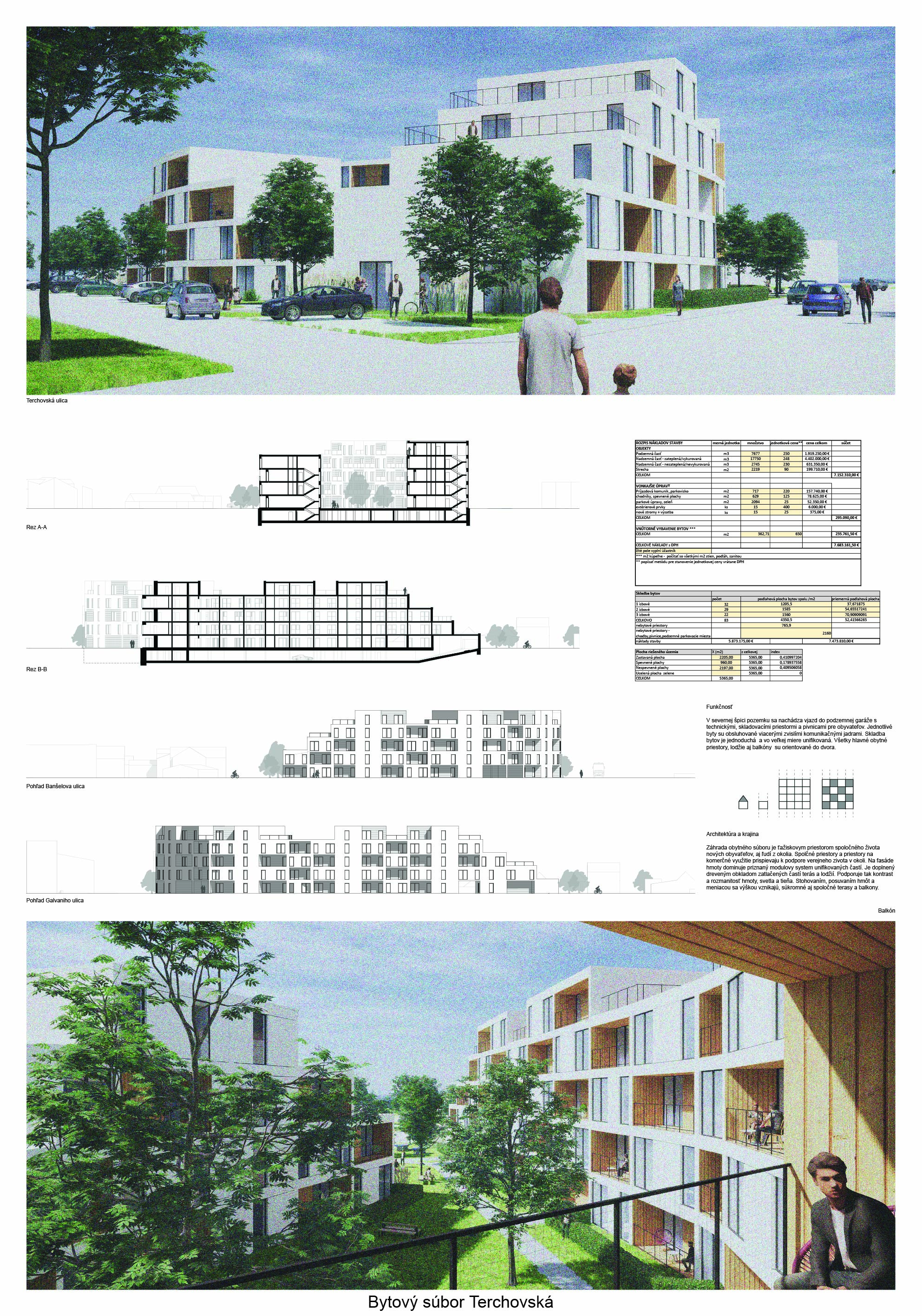 Pri víťaznom návrhu vyzdvihujeme predovšetkým vynikajúce urbanistické riešenie a citlivé začlenenie do územia. Bariérový pavlačový dom odtieňuje hluk z Galvaniho ulice a logicky dopĺňa rad štvorpodlažných panelových domov. Zároveň sa však ku koridoru Galvaniho ulice nestavia chrbtom, keď na oboch priečeliach autori umiestnili priestory vybavenosti. Správnosť tohto rozhodnutia potvrdzuje aj úprava a zvládnutie čelného priestoru pri križovatke Rožňavská - Galvaniho ulica. Skupina menších domov v západnej časti pozemku reaguje na mierku priľahlej zástavby a vytvára tak priepustné poloverejné priestory, ktoré nadväzujú na obdobné priestory medzi panelovými bytovými domami na juhovýchodnej strane Banšelovej ulice. Autori navyše vhodne umiestňujú vjazd do podzemnej halovej garáže do Banšelovej ulice, čím odľahčujú dynamickú dopravu v Terchovskej ulici a potvrdzujú jej status vedľajšej ukľudnenej slepej ulice.