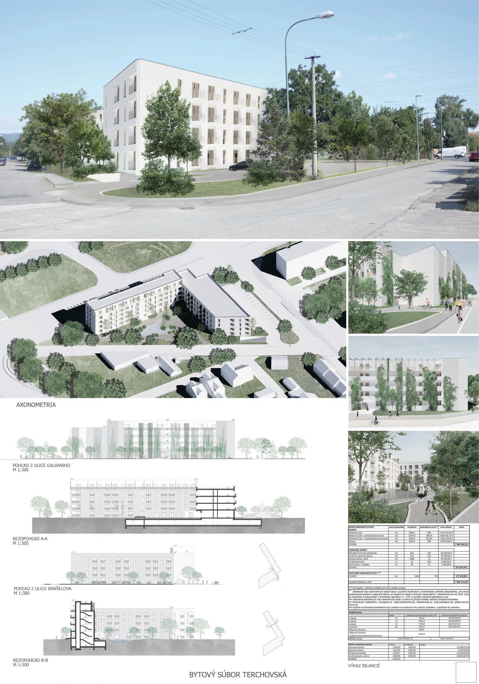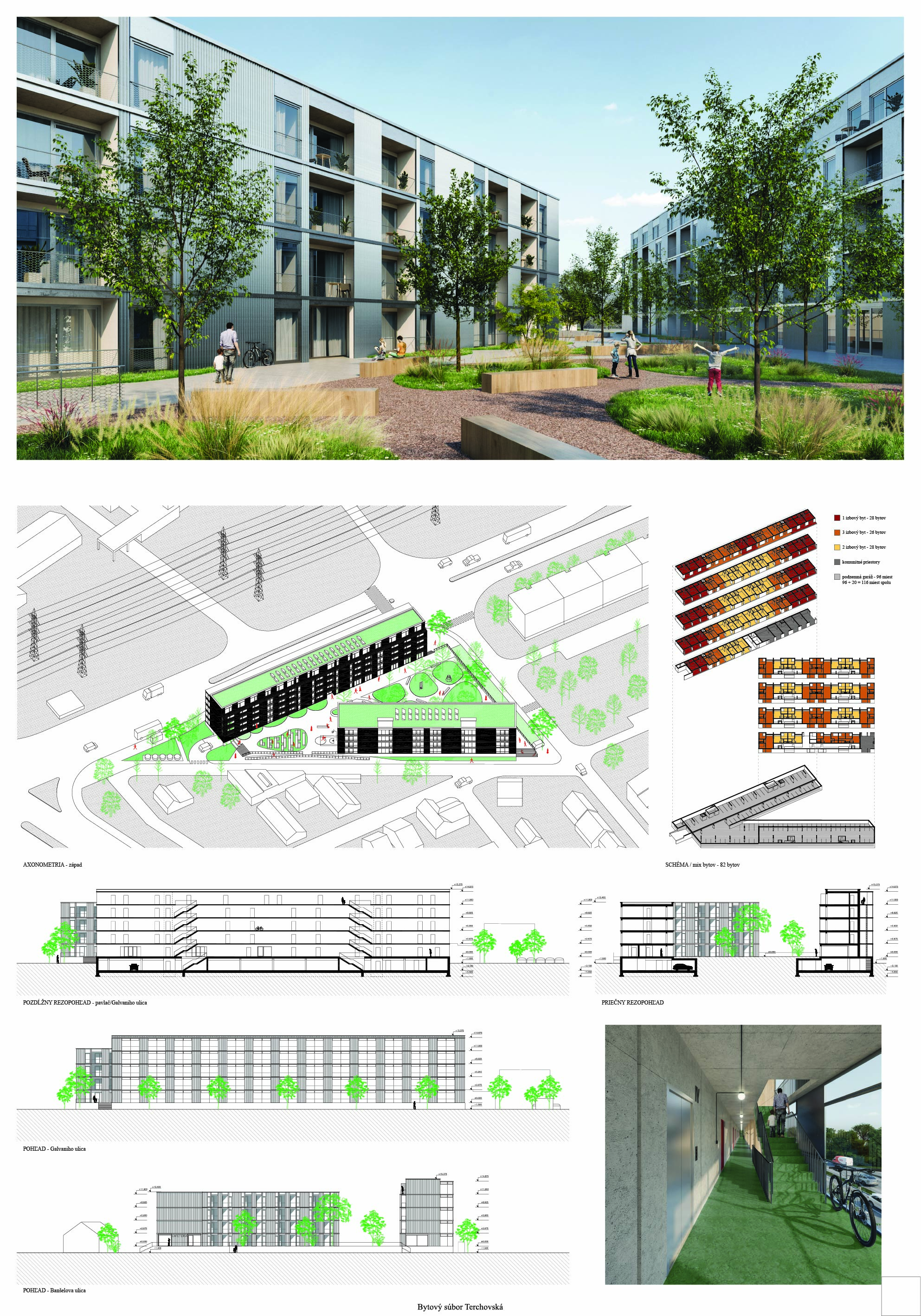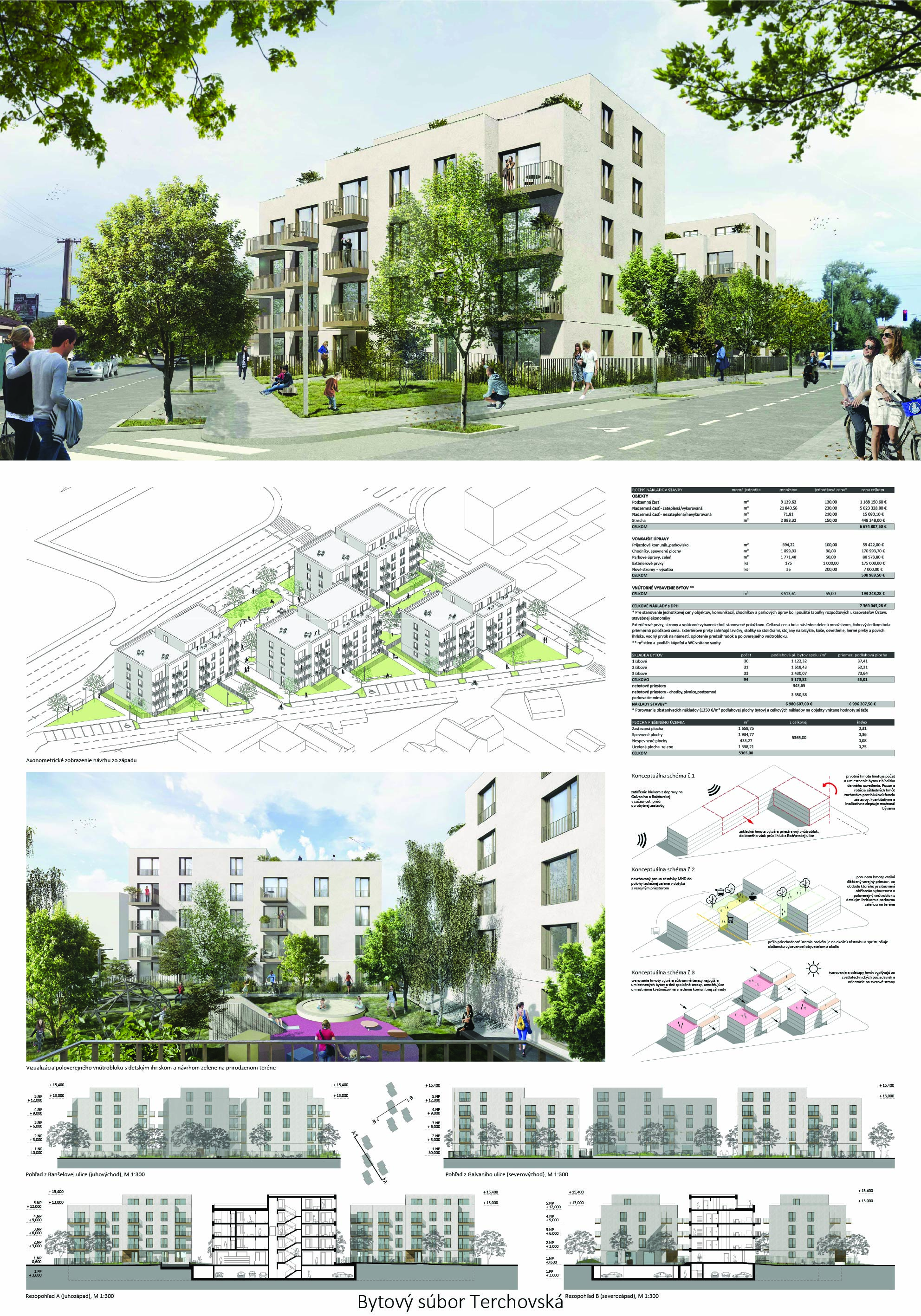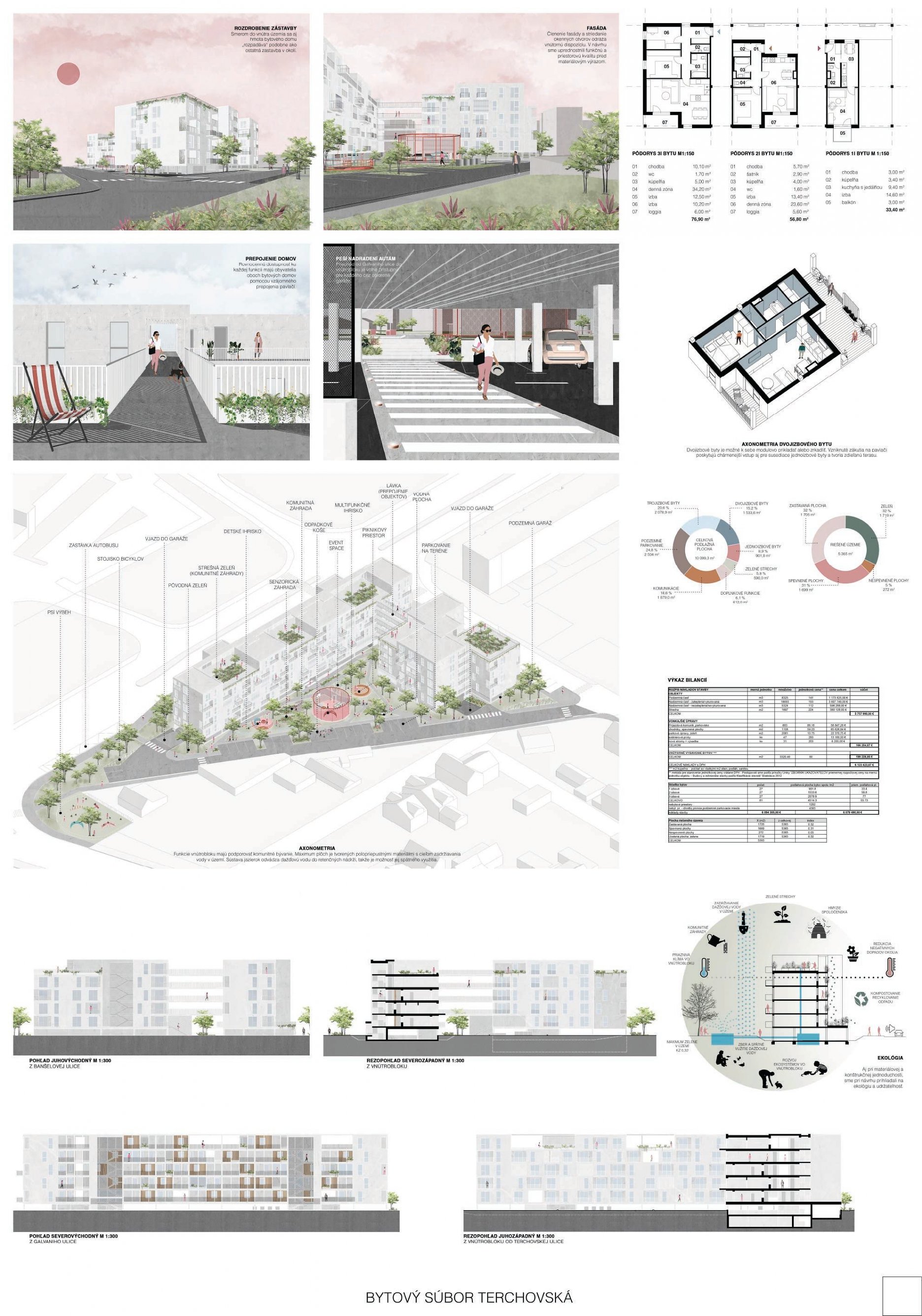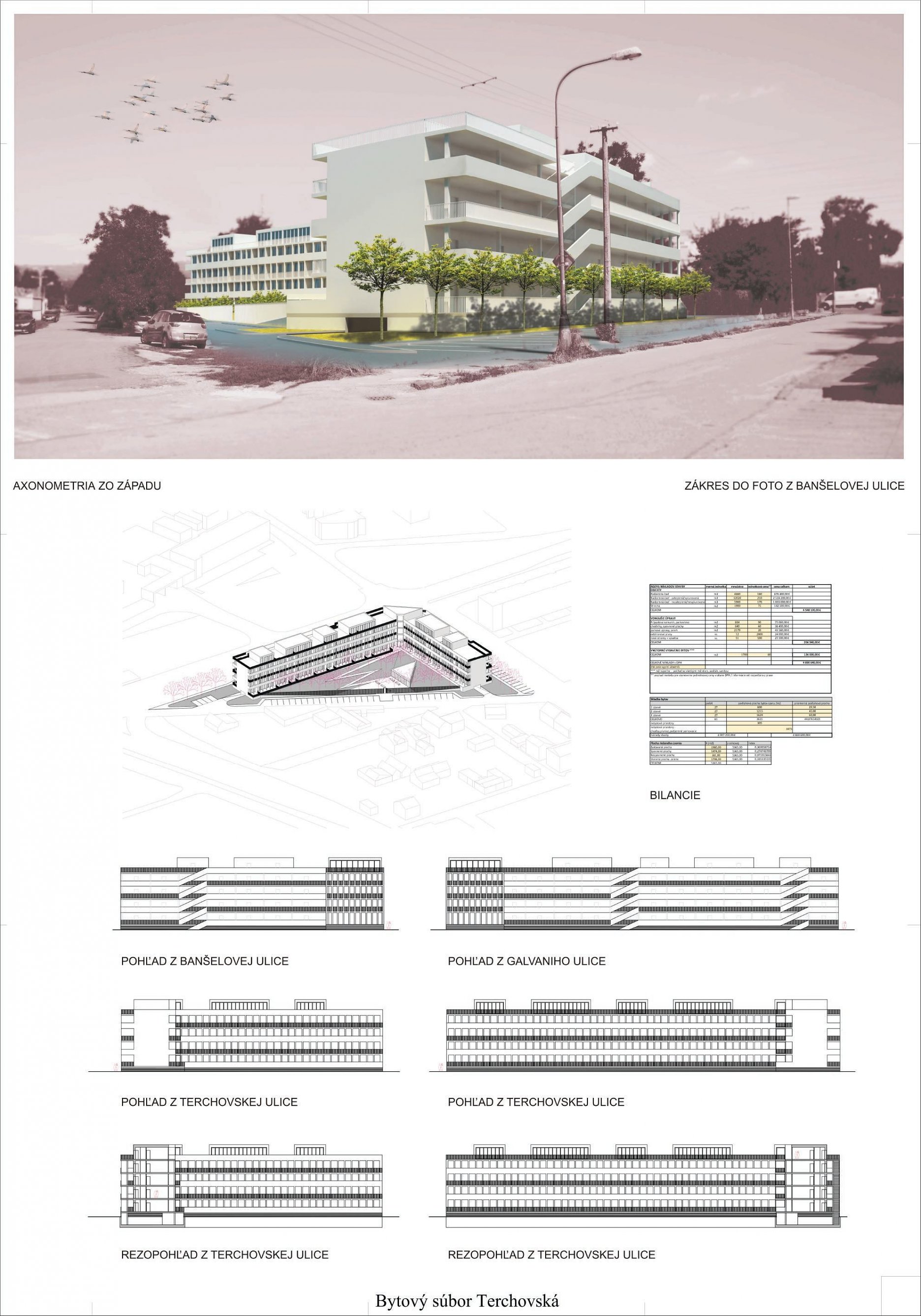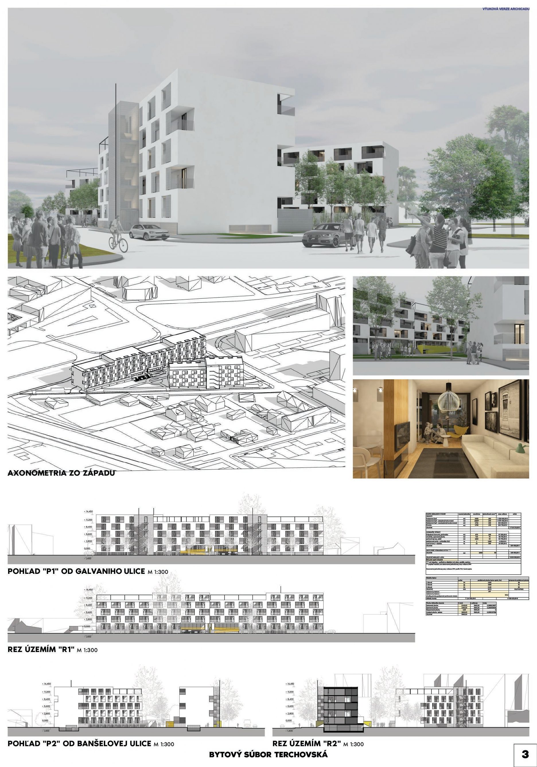 Pri víťaznom návrhu vyzdvihujeme predovšetkým vynikajúce urbanistické riešenie a citlivé začlenenie do územia. Bariérový pavlačový dom odtieňuje hluk z Galvaniho ulice a logicky dopĺňa rad štvorpodlažných panelových domov. Zároveň sa však ku koridoru Galvaniho ulice nestavia chrbtom, keď na oboch priečeliach autori umiestnili priestory vybavenosti. Správnosť tohto rozhodnutia potvrdzuje aj úprava a zvládnutie čelného priestoru pri križovatke Rožňavská - Galvaniho ulica. Skupina menších domov v západnej časti pozemku reaguje na mierku priľahlej zástavby a vytvára tak priepustné poloverejné priestory, ktoré nadväzujú na obdobné priestory medzi panelovými bytovými domami na juhovýchodnej strane Banšelovej ulice. Autori navyše vhodne umiestňujú vjazd do podzemnej halovej garáže do Banšelovej ulice, čím odľahčujú dynamickú dopravu v Terchovskej ulici a potvrdzujú jej status vedľajšej ukľudnenej slepej ulice.