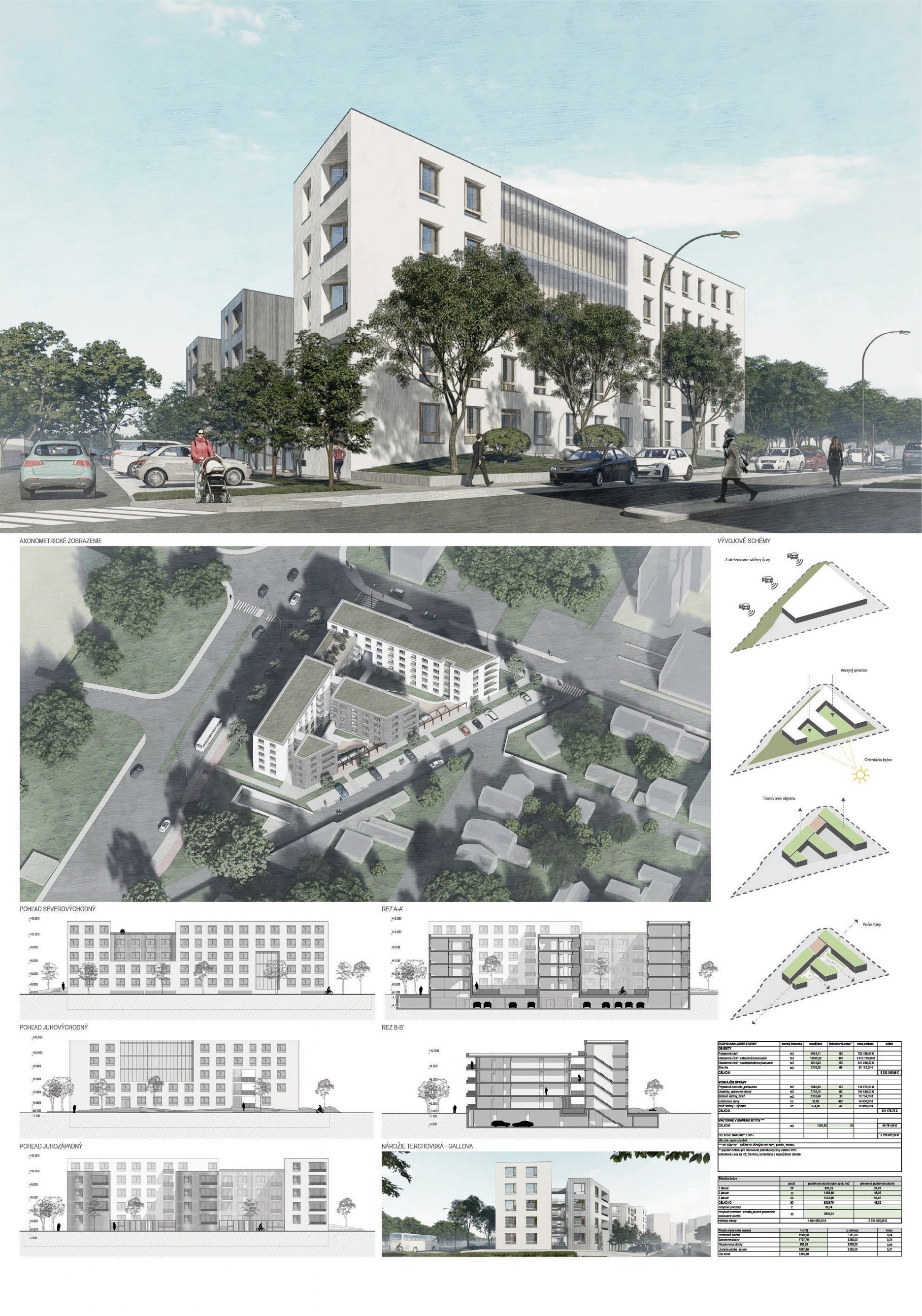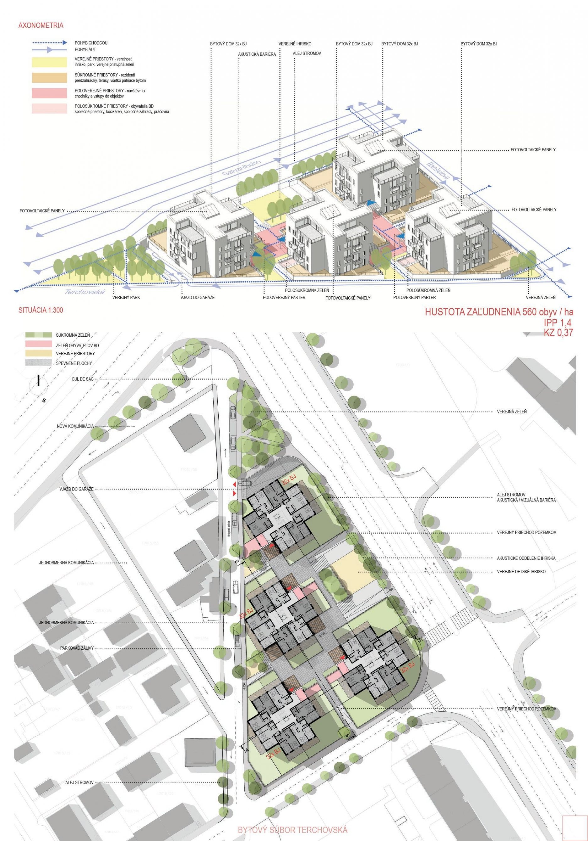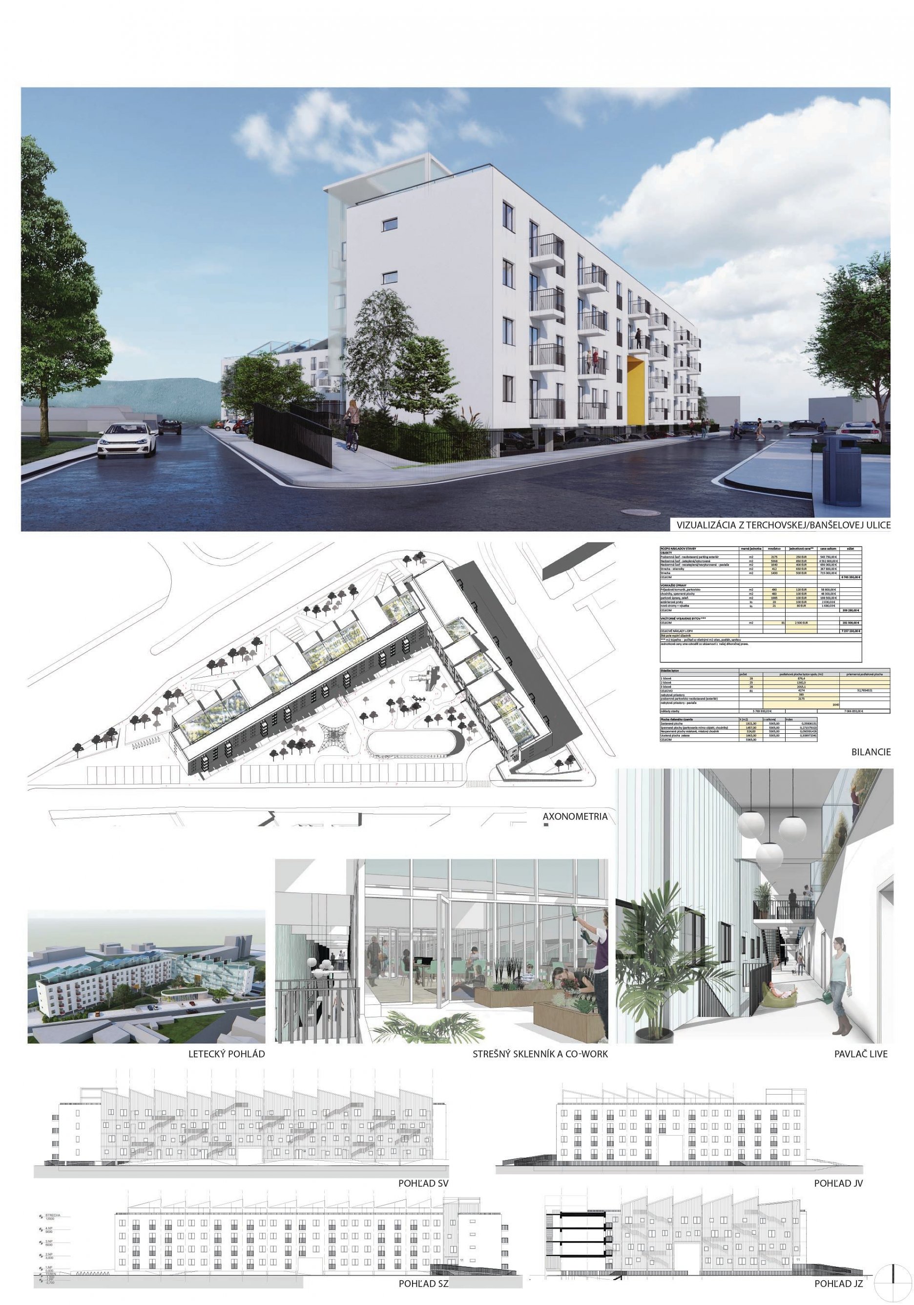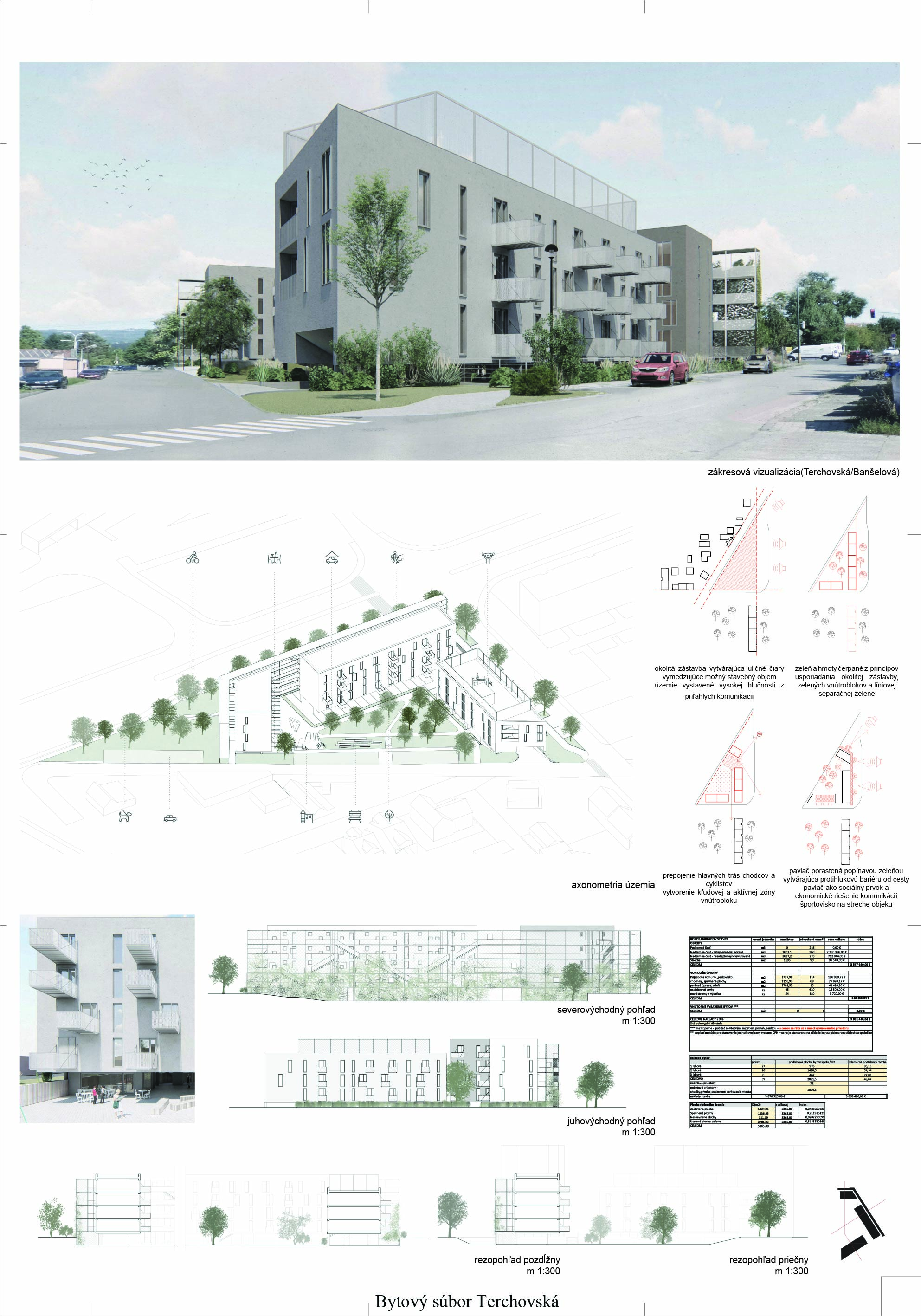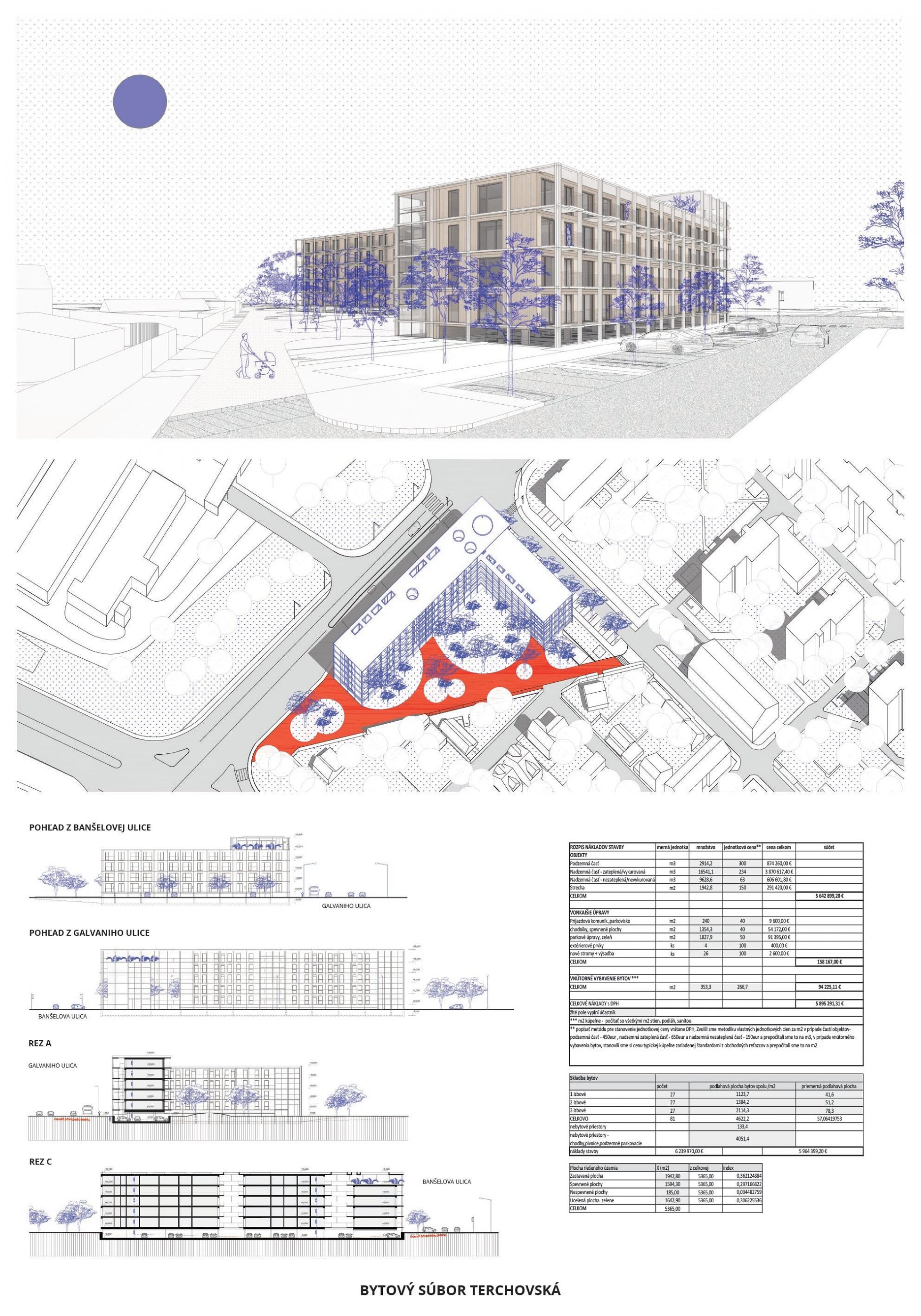 Pri víťaznom návrhu vyzdvihujeme predovšetkým vynikajúce urbanistické riešenie a citlivé začlenenie do územia. Bariérový pavlačový dom odtieňuje hluk z Galvaniho ulice a logicky dopĺňa rad štvorpodlažných panelových domov. Zároveň sa však ku koridoru Galvaniho ulice nestavia chrbtom, keď na oboch priečeliach autori umiestnili priestory vybavenosti. Správnosť tohto rozhodnutia potvrdzuje aj úprava a zvládnutie čelného priestoru pri križovatke Rožňavská - Galvaniho ulica. Skupina menších domov v západnej časti pozemku reaguje na mierku priľahlej zástavby a vytvára tak priepustné poloverejné priestory, ktoré nadväzujú na obdobné priestory medzi panelovými bytovými domami na juhovýchodnej strane Banšelovej ulice. Autori navyše vhodne umiestňujú vjazd do podzemnej halovej garáže do Banšelovej ulice, čím odľahčujú dynamickú dopravu v Terchovskej ulici a potvrdzujú jej status vedľajšej ukľudnenej slepej ulice.