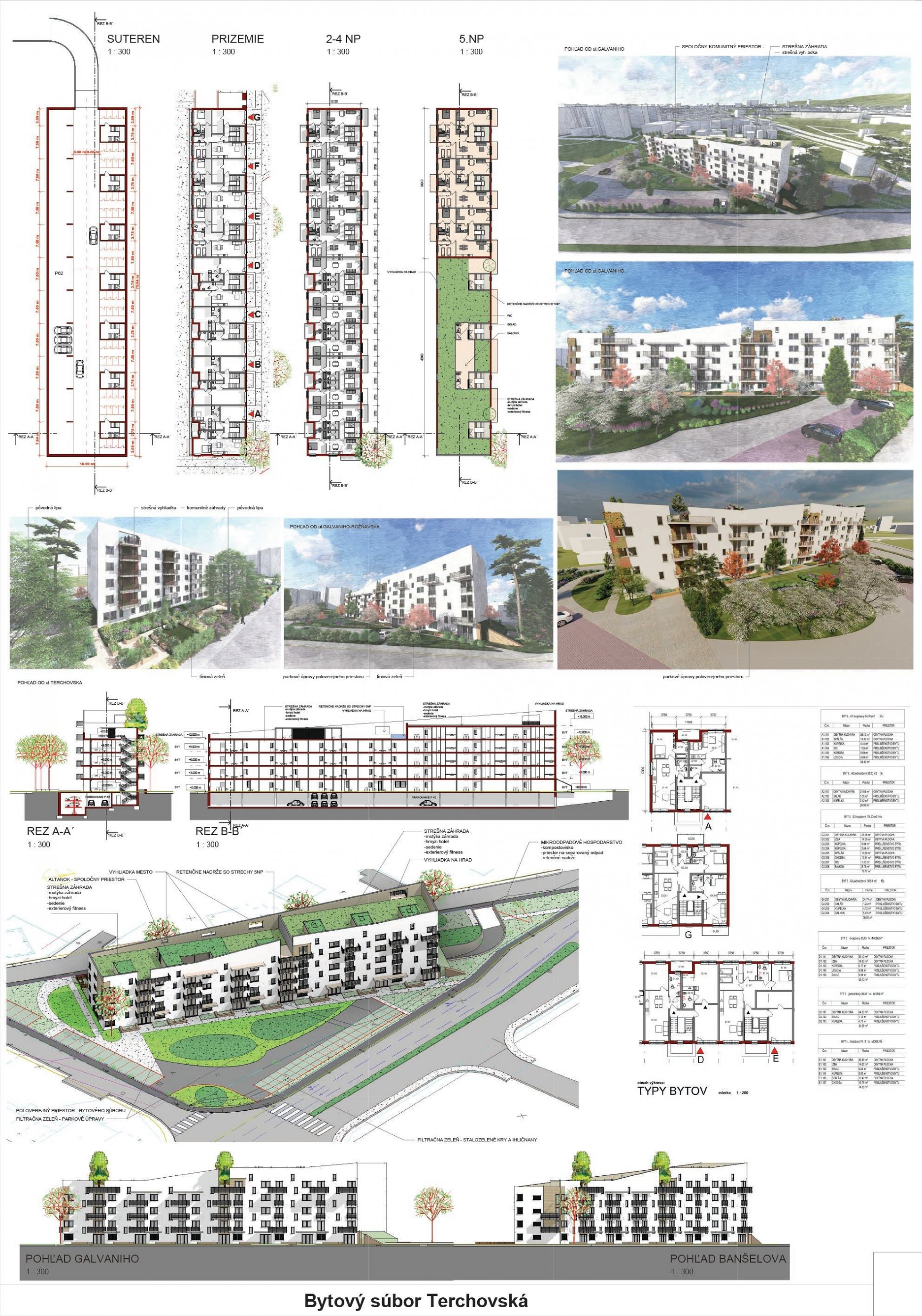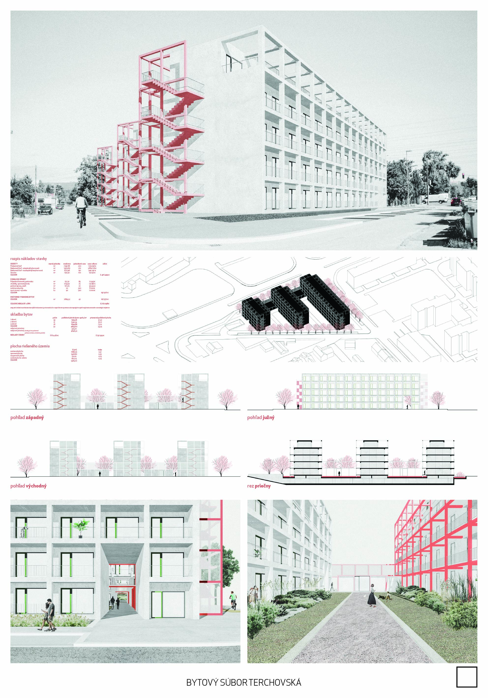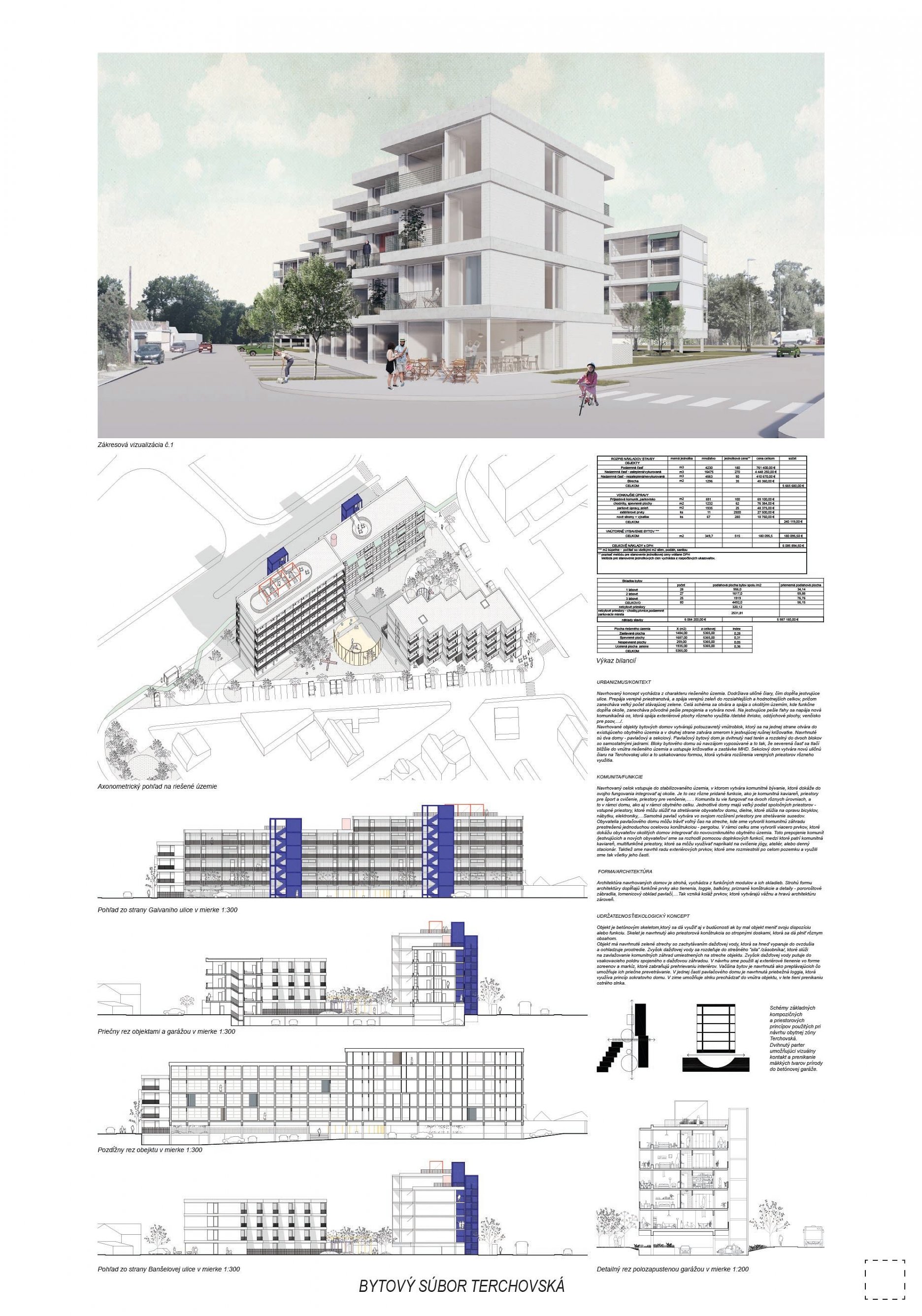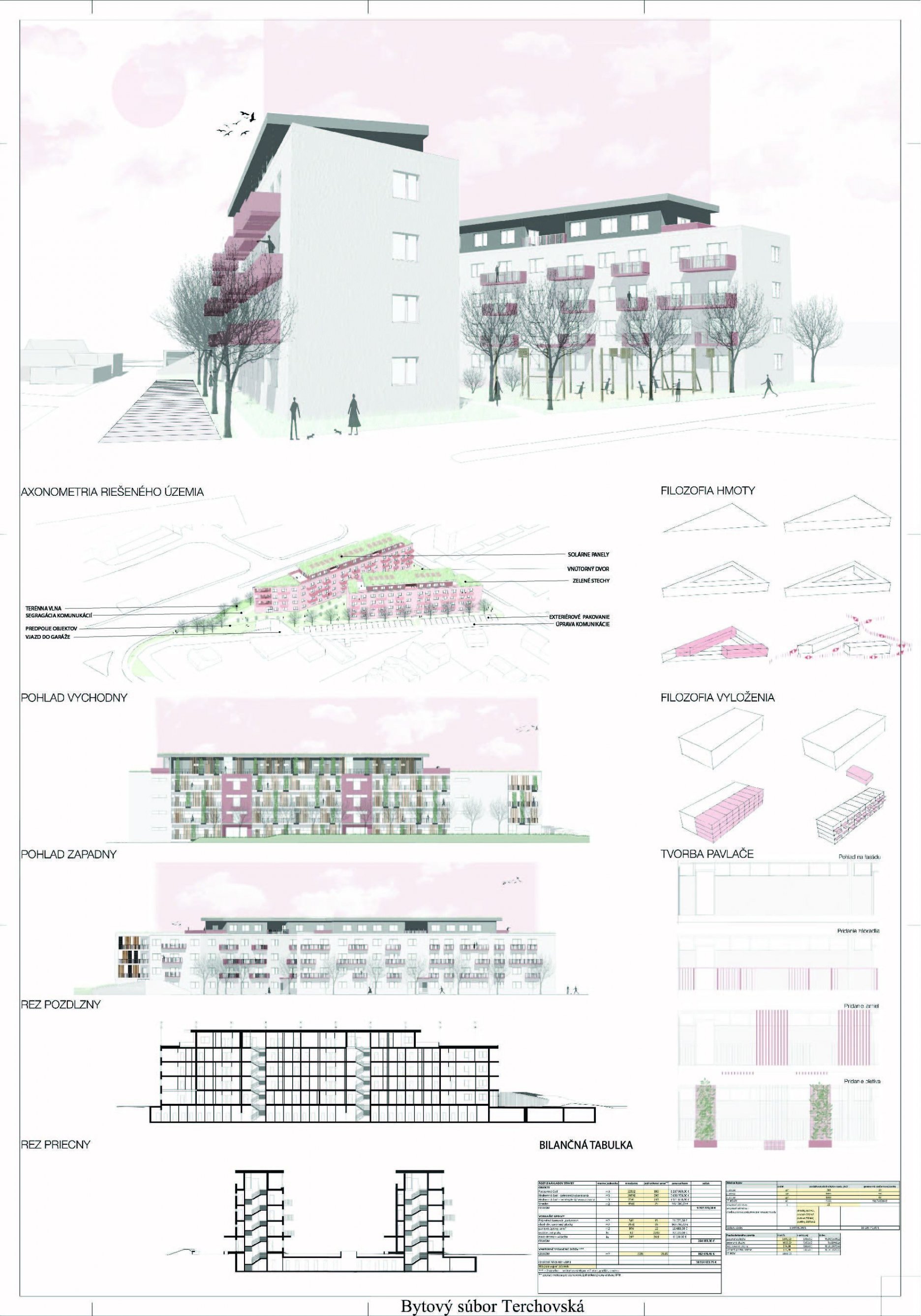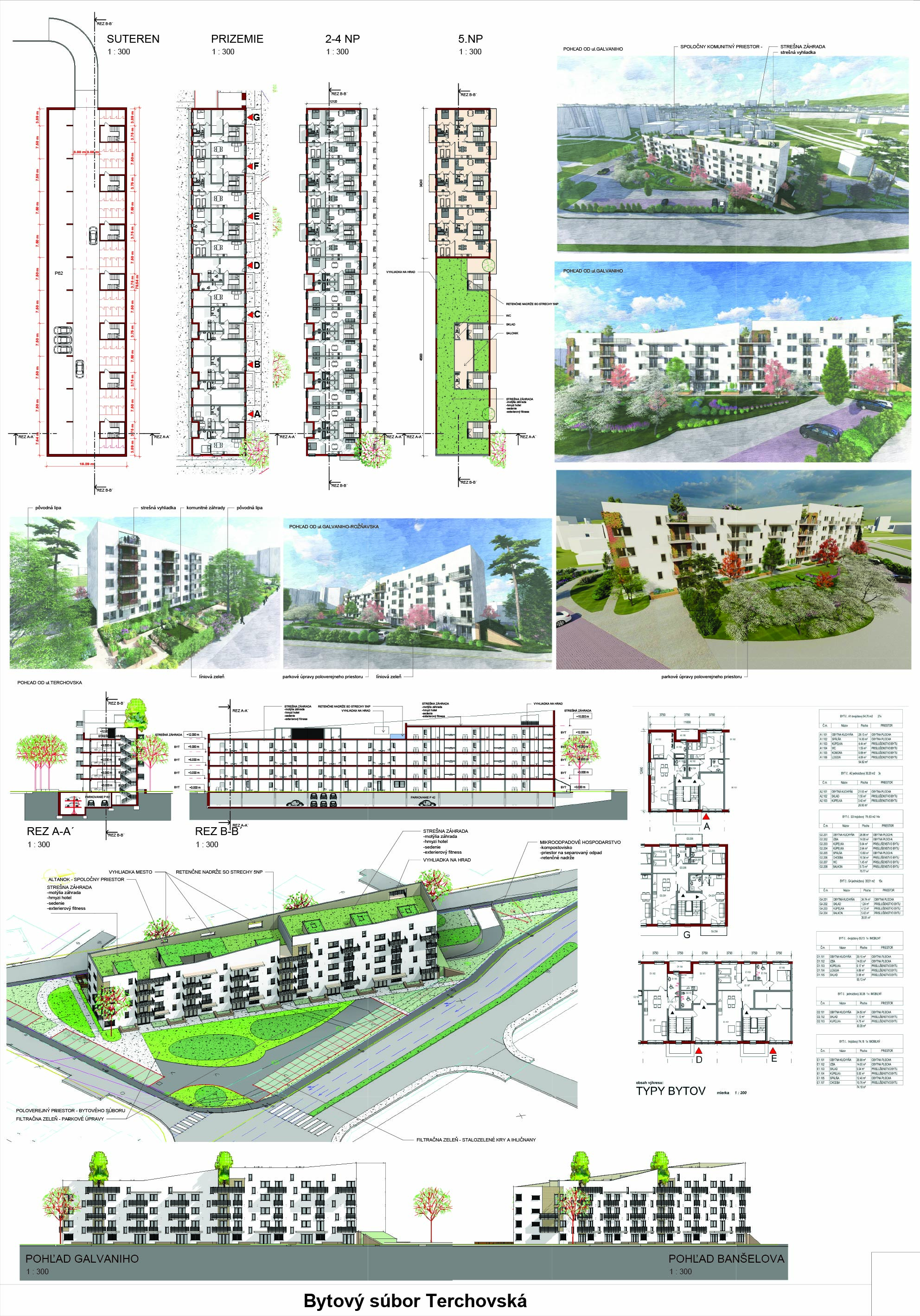 Pri víťaznom návrhu vyzdvihujeme predovšetkým vynikajúce urbanistické riešenie a citlivé začlenenie do územia. Bariérový pavlačový dom odtieňuje hluk z Galvaniho ulice a logicky dopĺňa rad štvorpodlažných panelových domov. Zároveň sa však ku koridoru Galvaniho ulice nestavia chrbtom, keď na oboch priečeliach autori umiestnili priestory vybavenosti. Správnosť tohto rozhodnutia potvrdzuje aj úprava a zvládnutie čelného priestoru pri križovatke Rožňavská - Galvaniho ulica. Skupina menších domov v západnej časti pozemku reaguje na mierku priľahlej zástavby a vytvára tak priepustné poloverejné priestory, ktoré nadväzujú na obdobné priestory medzi panelovými bytovými domami na juhovýchodnej strane Banšelovej ulice. Autori navyše vhodne umiestňujú vjazd do podzemnej halovej garáže do Banšelovej ulice, čím odľahčujú dynamickú dopravu v Terchovskej ulici a potvrdzujú jej status vedľajšej ukľudnenej slepej ulice.