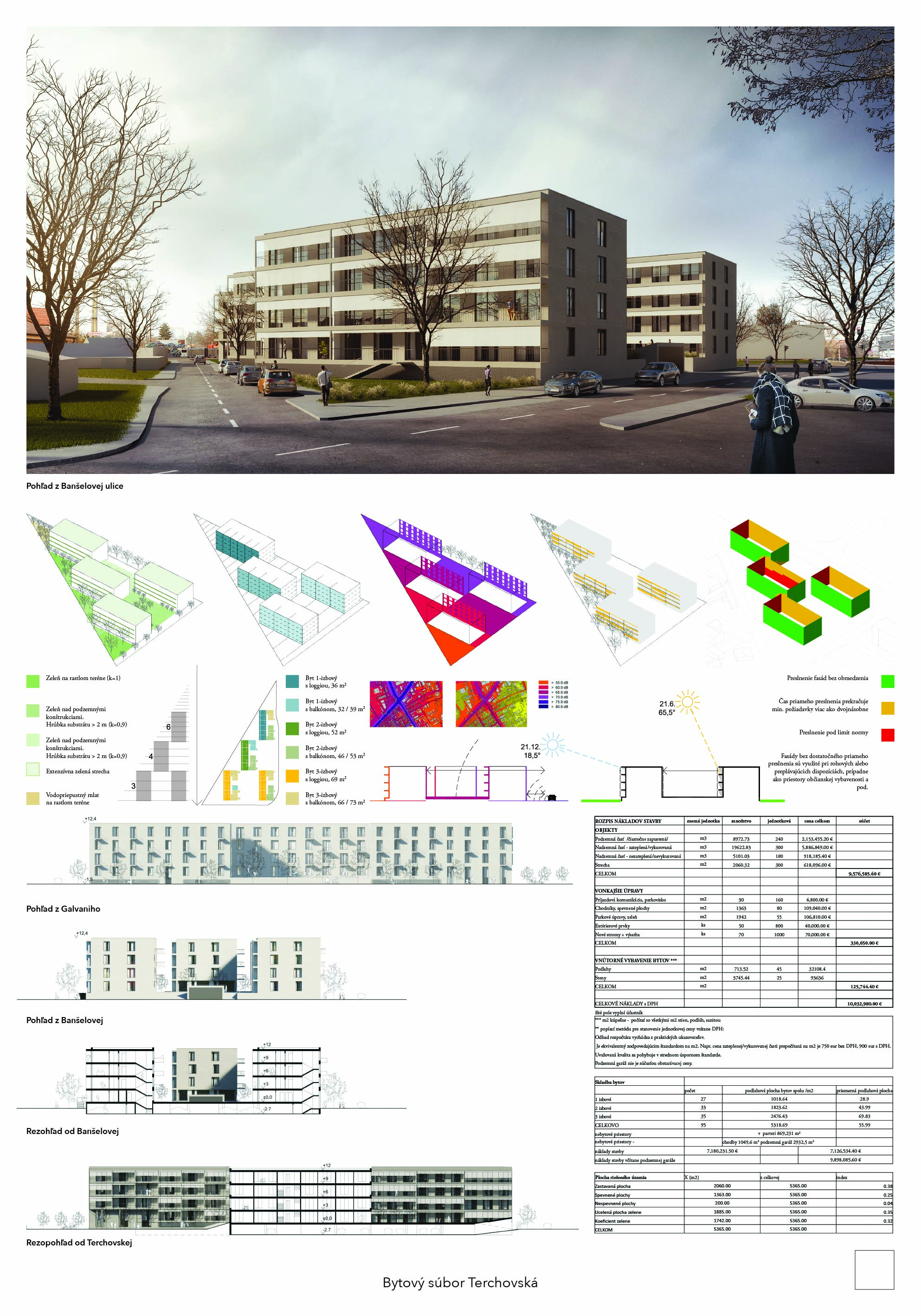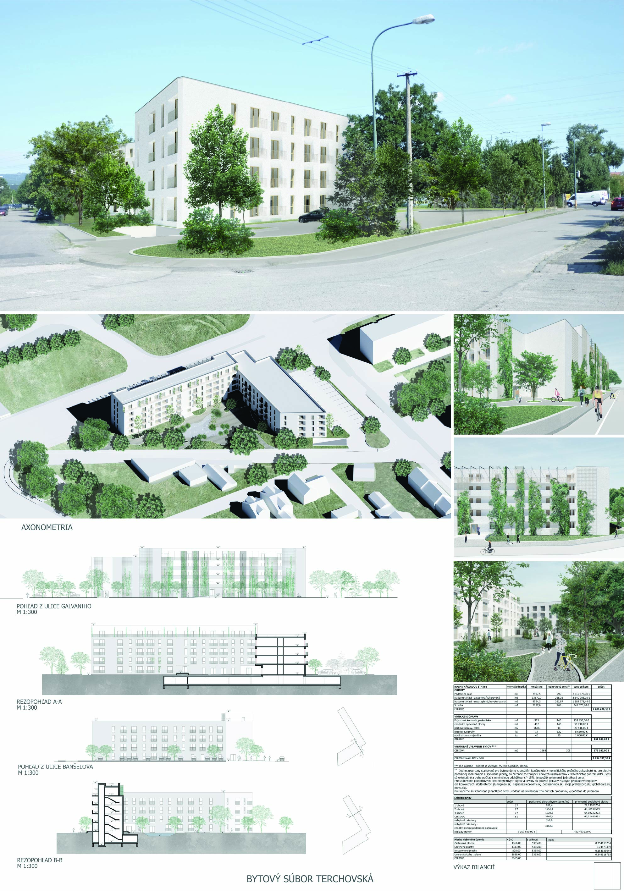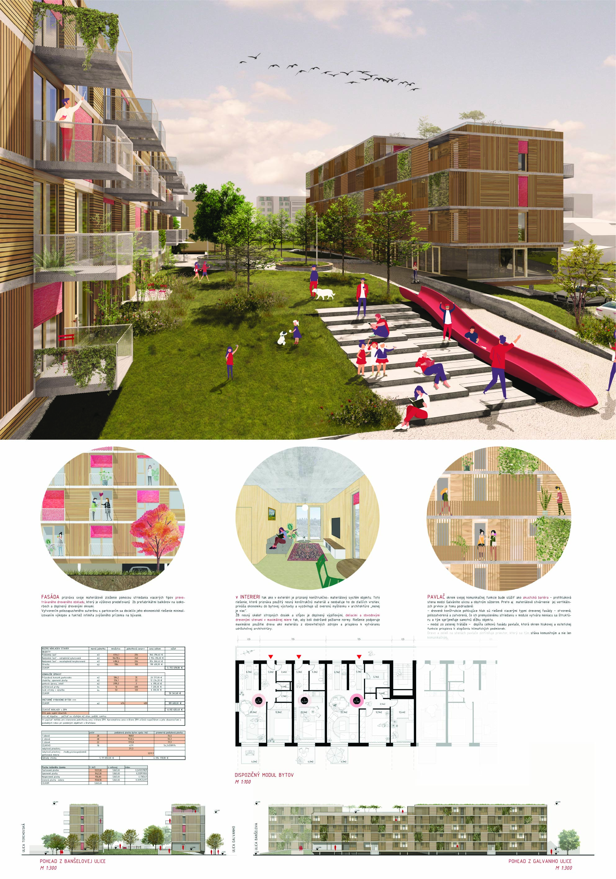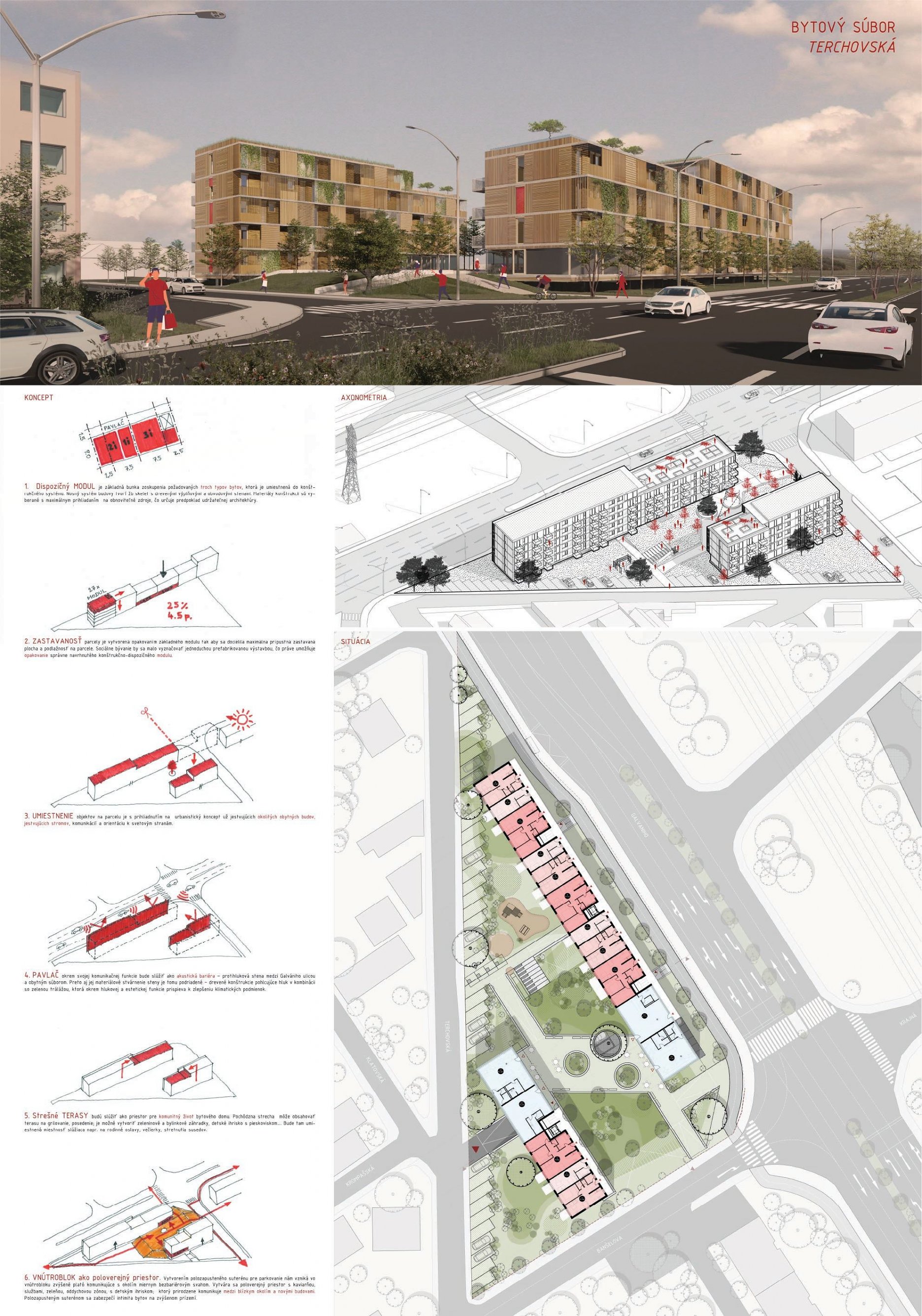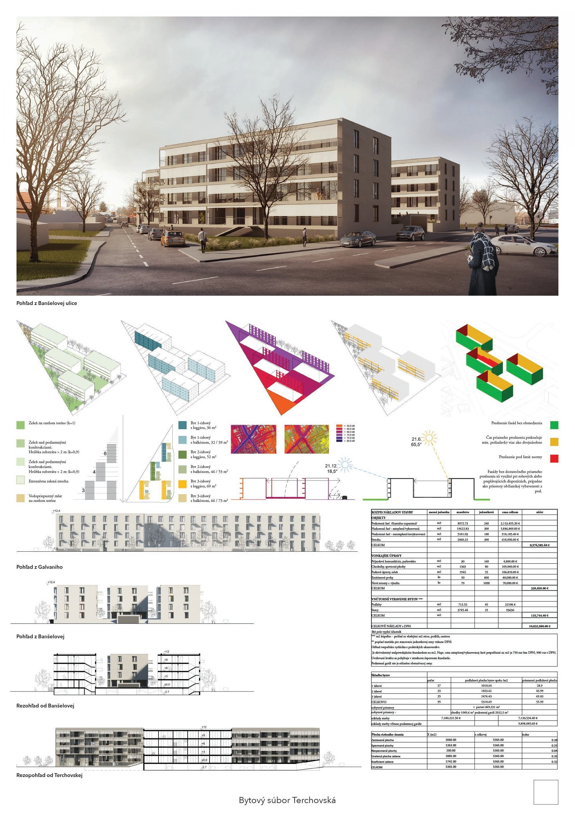Pri víťaznom návrhu vyzdvihujeme predovšetkým vynikajúce urbanistické riešenie a citlivé začlenenie do územia. Bariérový pavlačový dom odtieňuje hluk z Galvaniho ulice a logicky dopĺňa rad štvorpodlažných panelových domov. Zároveň sa však ku koridoru Galvaniho ulice nestavia chrbtom, keď na oboch priečeliach autori umiestnili priestory vybavenosti. Správnosť tohto rozhodnutia potvrdzuje aj úprava a zvládnutie čelného priestoru pri križovatke Rožňavská - Galvaniho ulica. Skupina menších domov v západnej časti pozemku reaguje na mierku priľahlej zástavby a vytvára tak priepustné poloverejné priestory, ktoré nadväzujú na obdobné priestory medzi panelovými bytovými domami na juhovýchodnej strane Banšelovej ulice. Autori navyše vhodne umiestňujú vjazd do podzemnej halovej garáže do Banšelovej ulice, čím odľahčujú dynamickú dopravu v Terchovskej ulici a potvrdzujú jej status vedľajšej ukľudnenej slepej ulice.