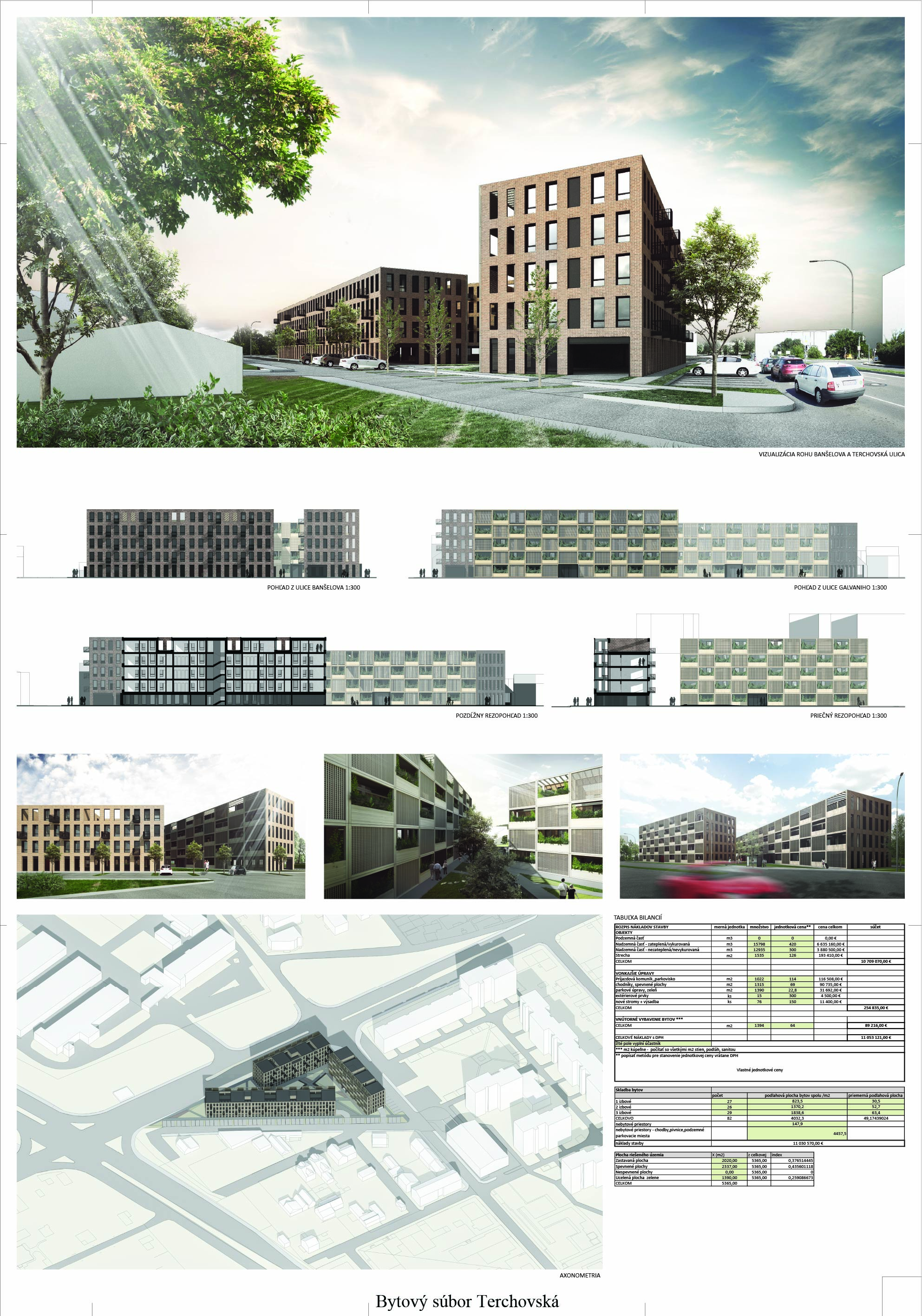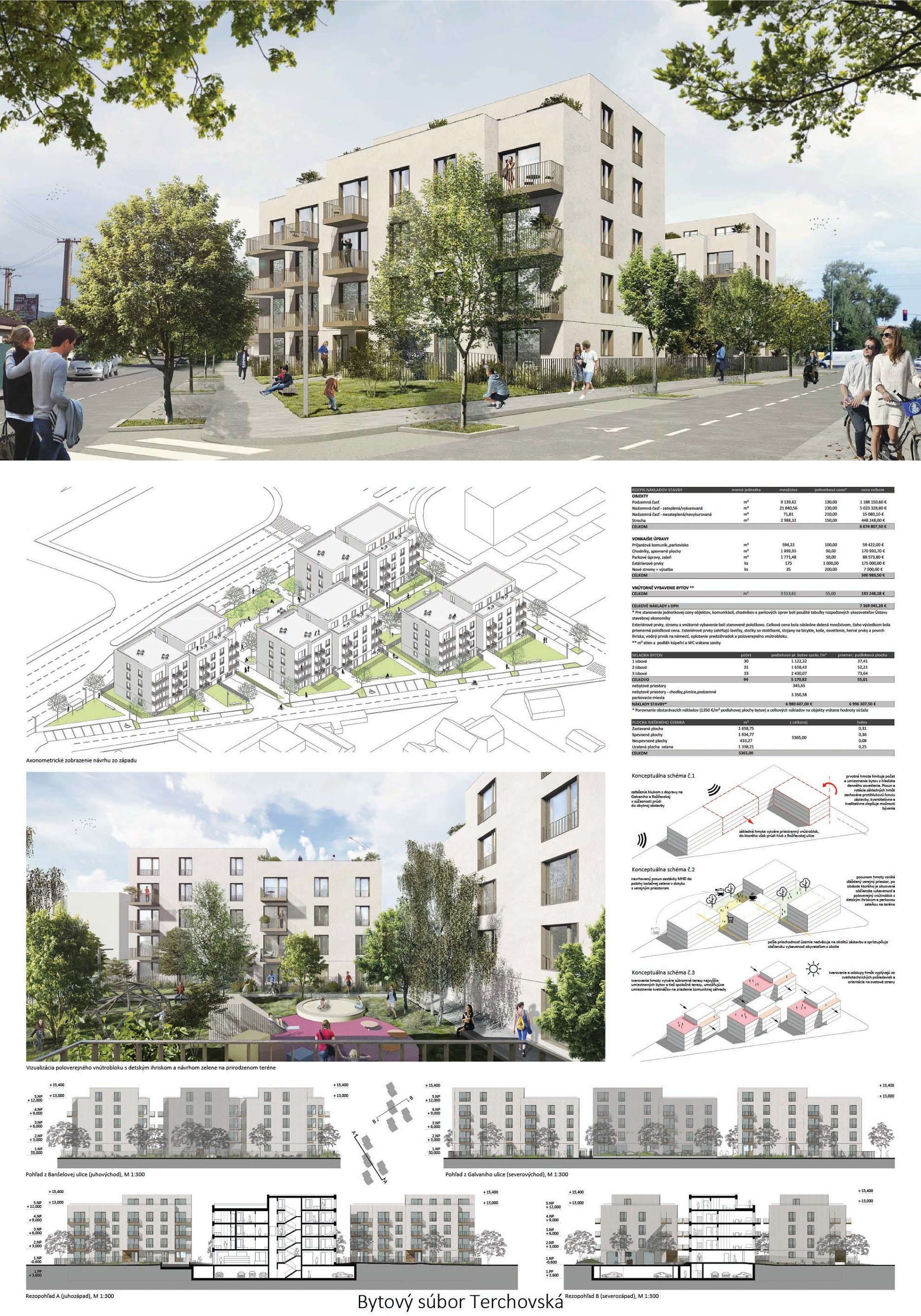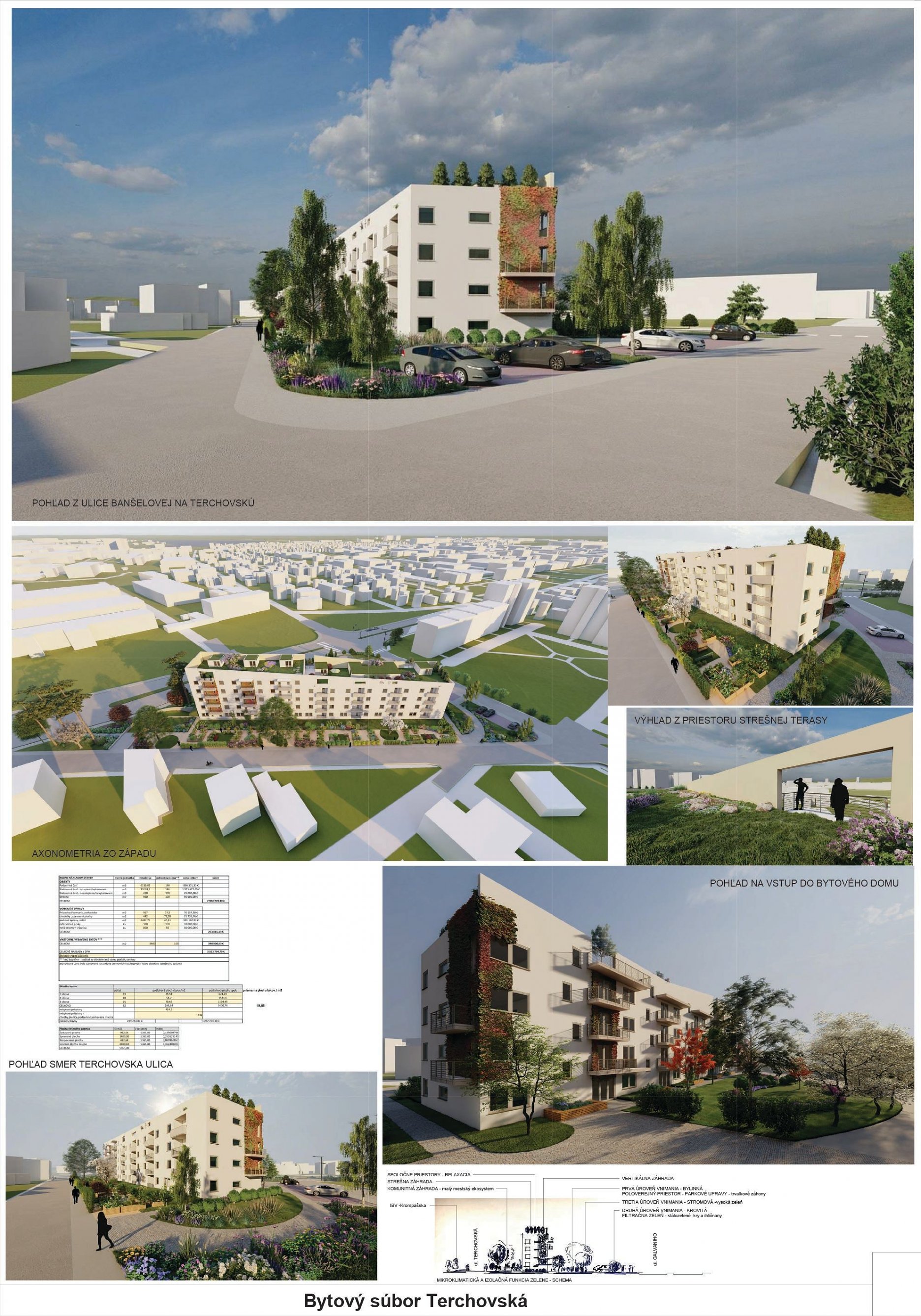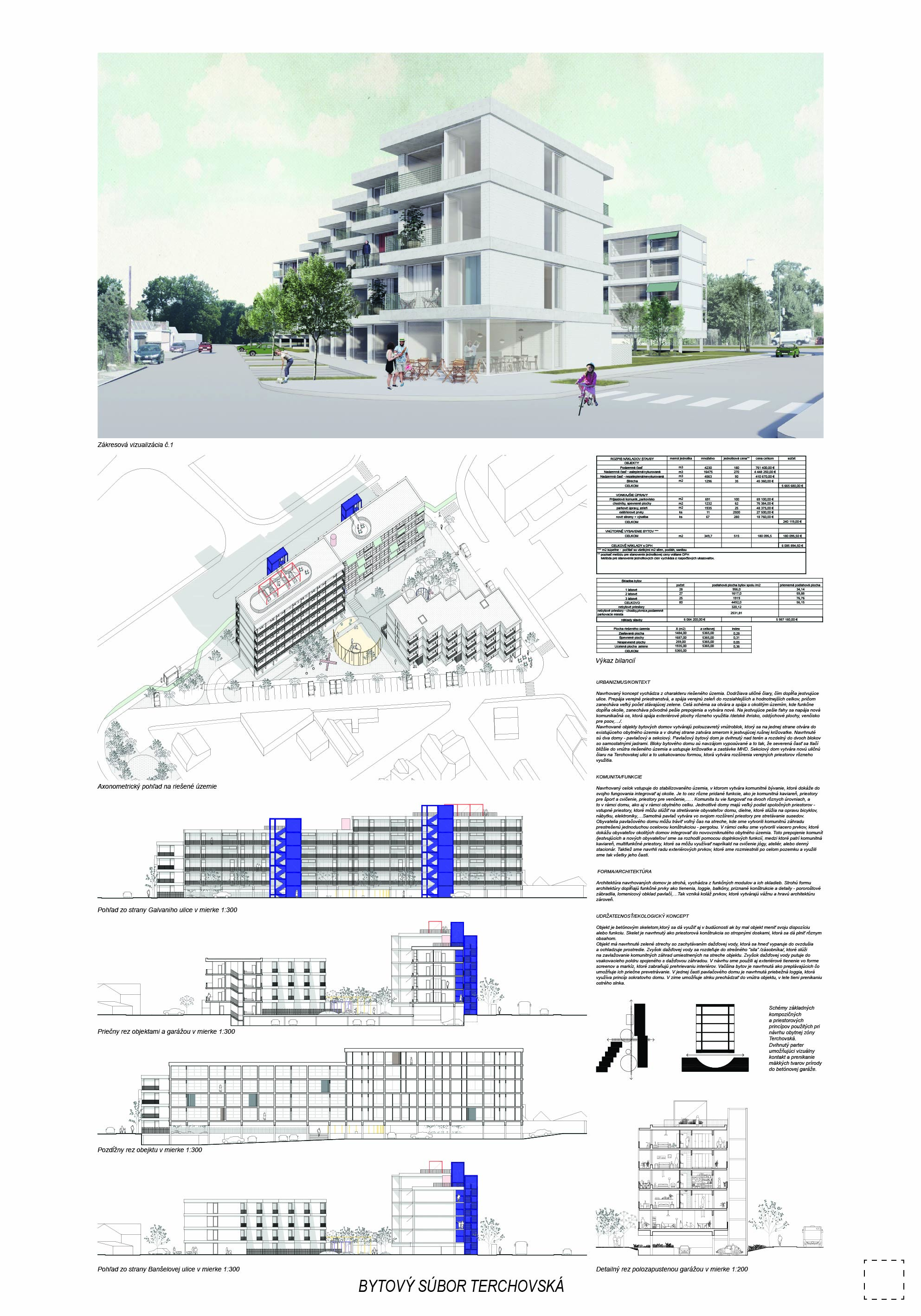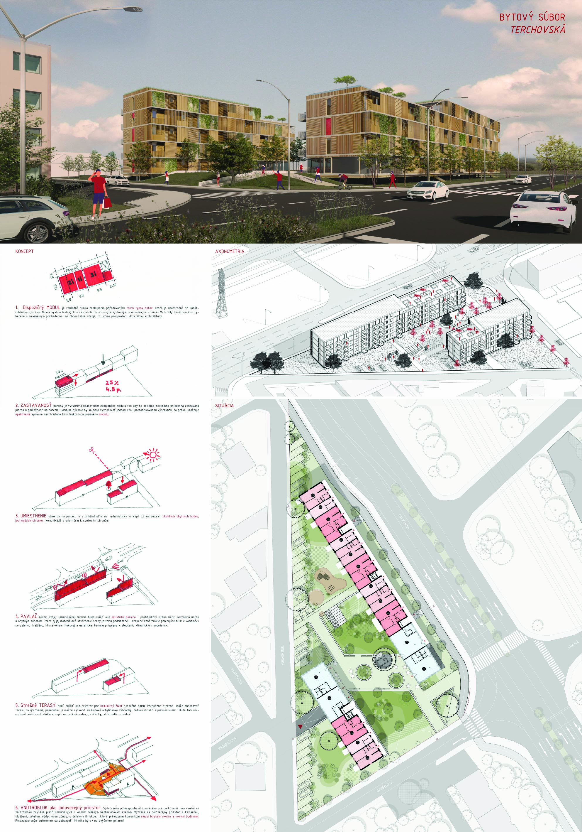 Pri víťaznom návrhu vyzdvihujeme predovšetkým vynikajúce urbanistické riešenie a citlivé začlenenie do územia. Bariérový pavlačový dom odtieňuje hluk z Galvaniho ulice a logicky dopĺňa rad štvorpodlažných panelových domov. Zároveň sa však ku koridoru Galvaniho ulice nestavia chrbtom, keď na oboch priečeliach autori umiestnili priestory vybavenosti. Správnosť tohto rozhodnutia potvrdzuje aj úprava a zvládnutie čelného priestoru pri križovatke Rožňavská - Galvaniho ulica. Skupina menších domov v západnej časti pozemku reaguje na mierku priľahlej zástavby a vytvára tak priepustné poloverejné priestory, ktoré nadväzujú na obdobné priestory medzi panelovými bytovými domami na juhovýchodnej strane Banšelovej ulice. Autori navyše vhodne umiestňujú vjazd do podzemnej halovej garáže do Banšelovej ulice, čím odľahčujú dynamickú dopravu v Terchovskej ulici a potvrdzujú jej status vedľajšej ukľudnenej slepej ulice.