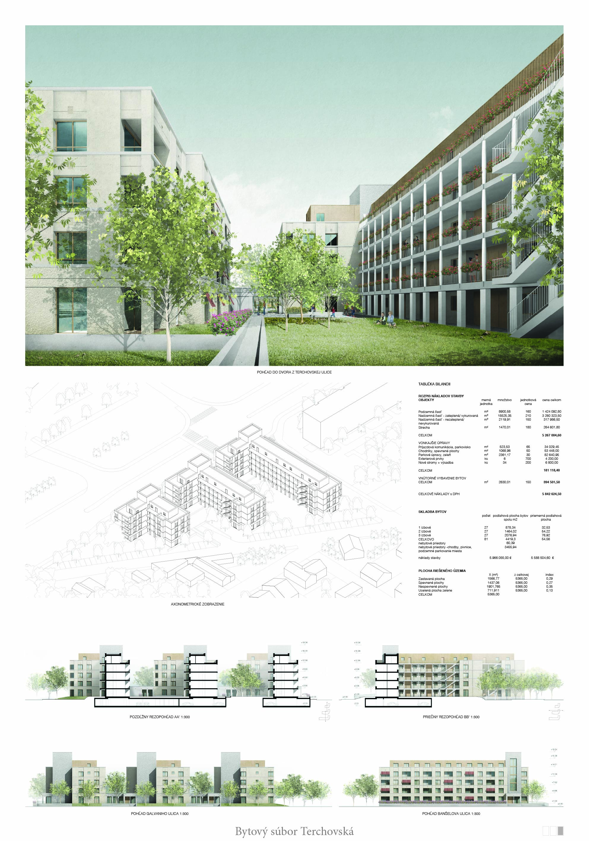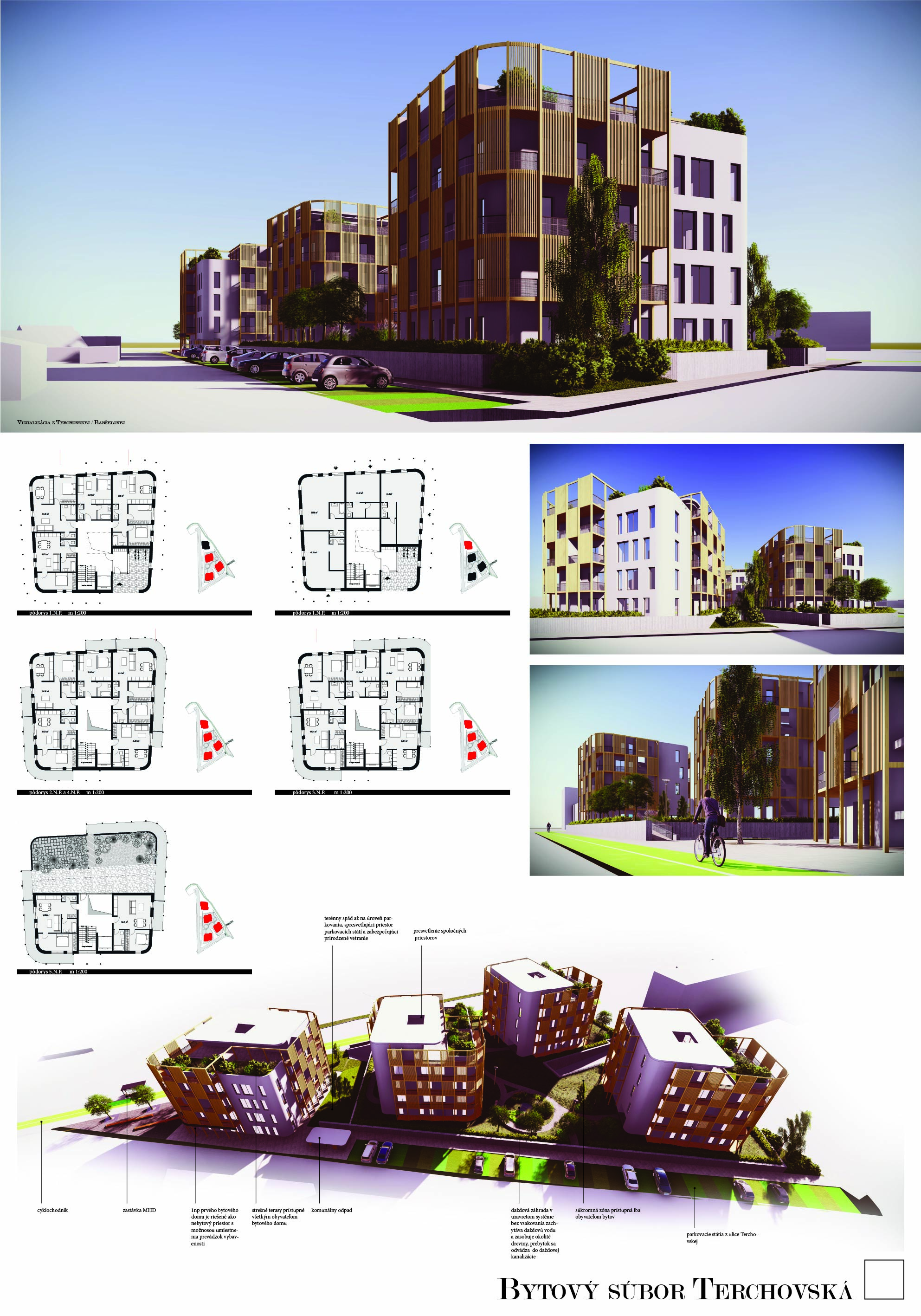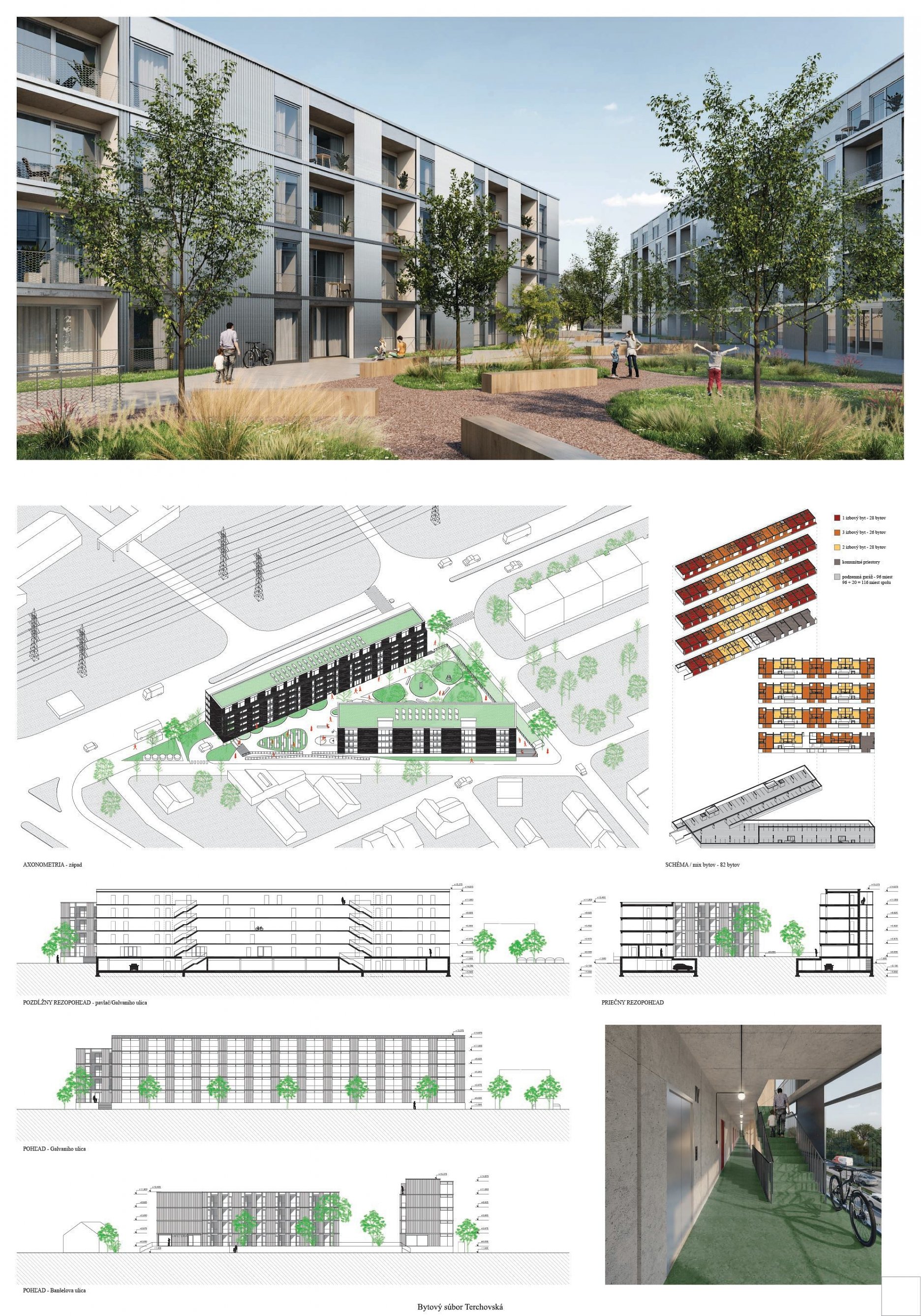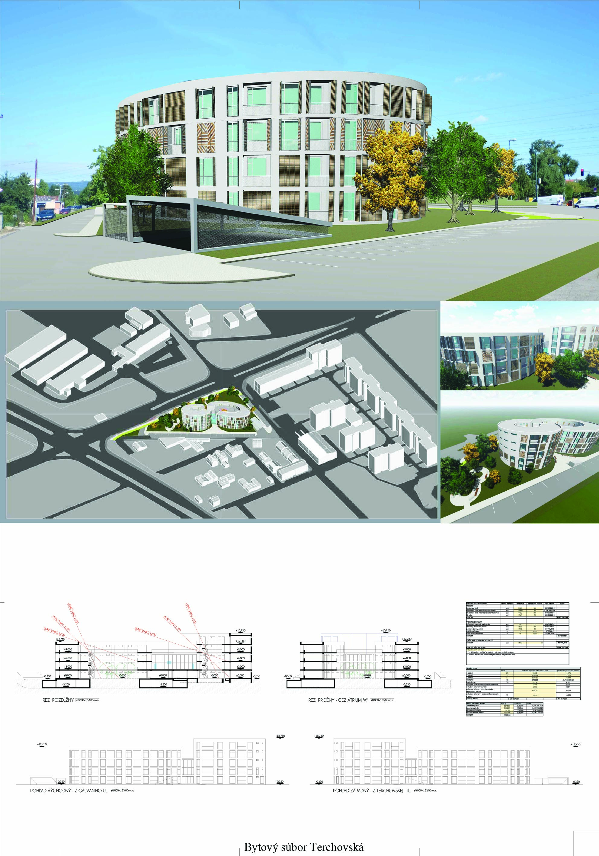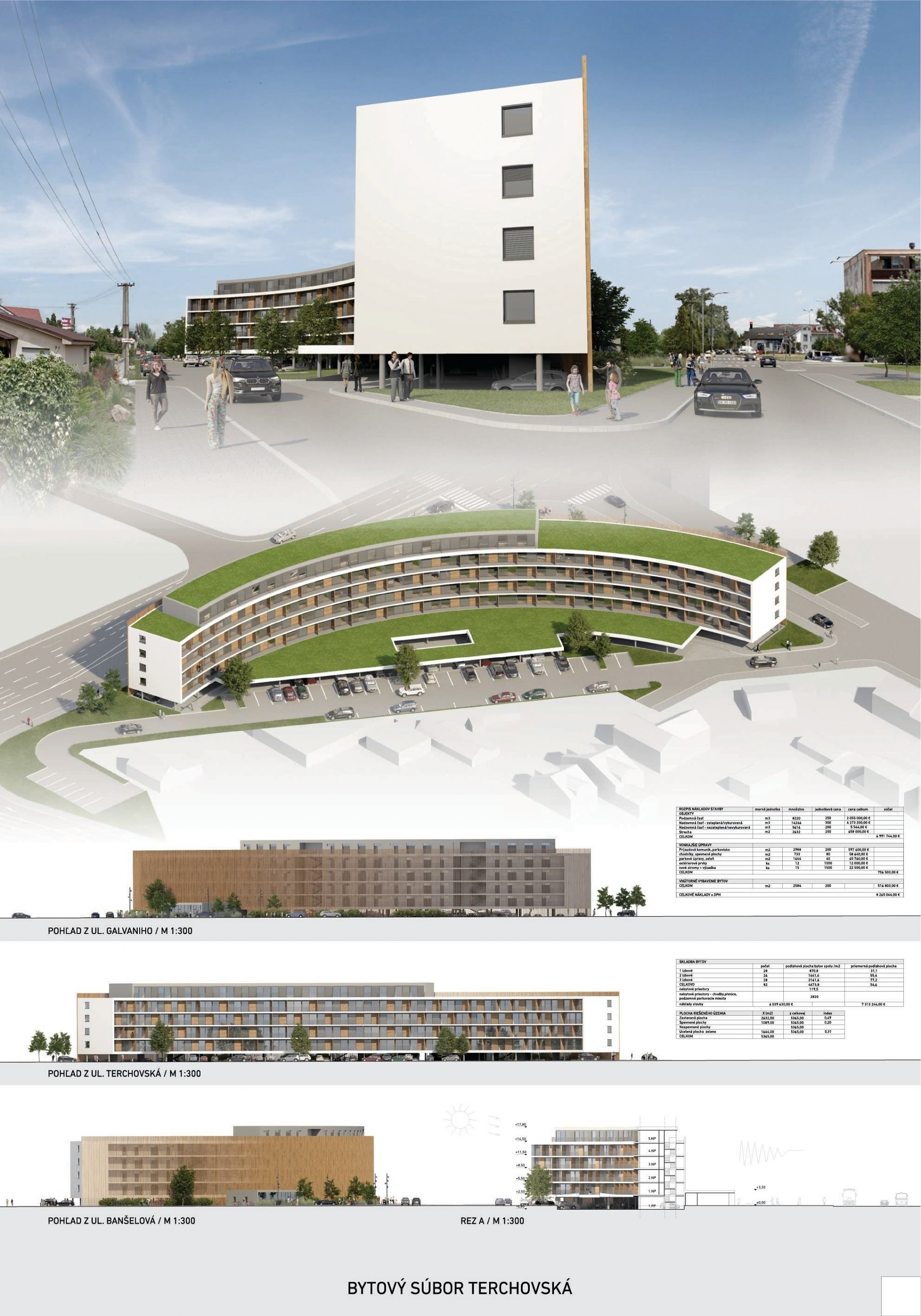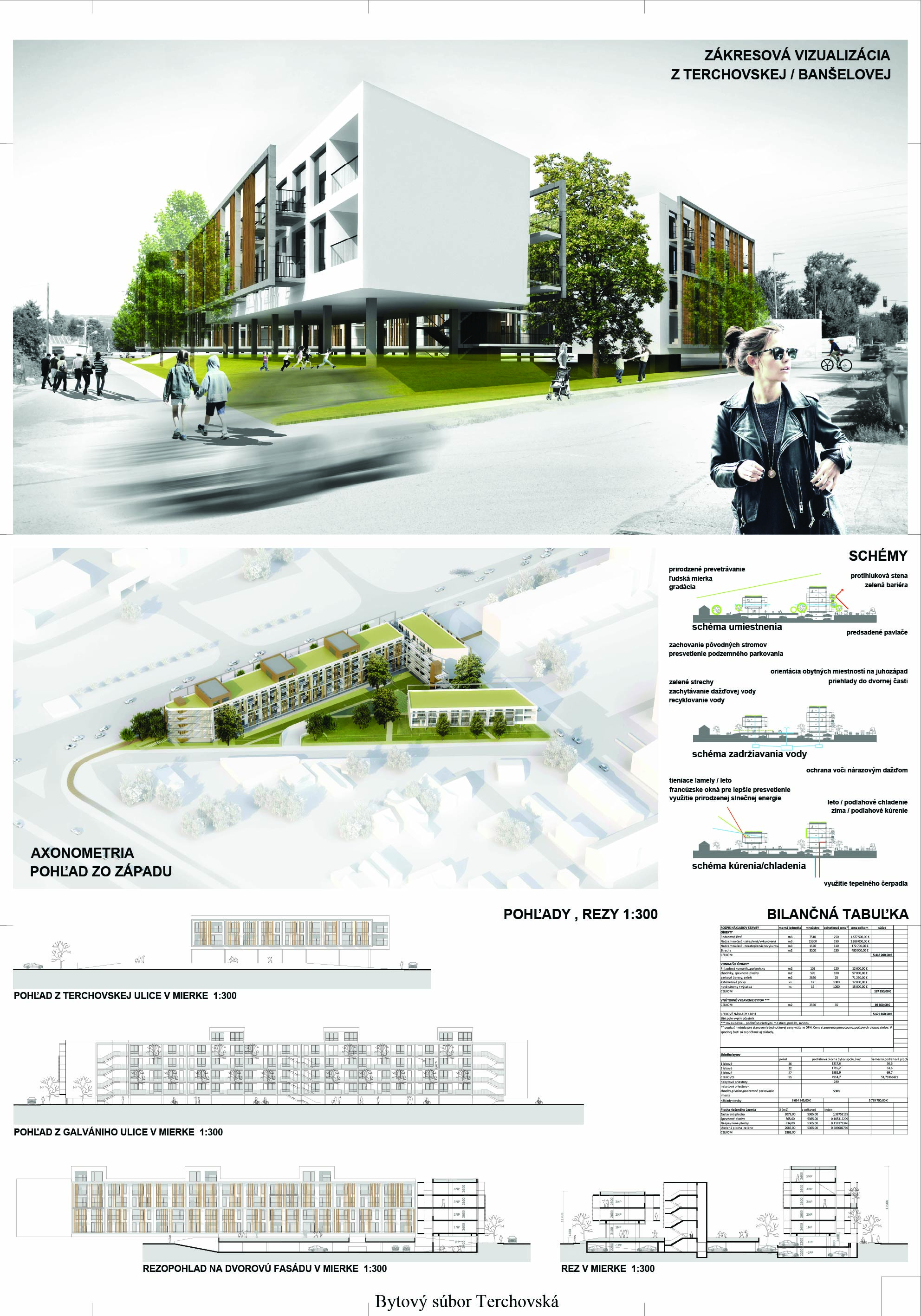 Pri víťaznom návrhu vyzdvihujeme predovšetkým vynikajúce urbanistické riešenie a citlivé začlenenie do územia. Bariérový pavlačový dom odtieňuje hluk z Galvaniho ulice a logicky dopĺňa rad štvorpodlažných panelových domov. Zároveň sa však ku koridoru Galvaniho ulice nestavia chrbtom, keď na oboch priečeliach autori umiestnili priestory vybavenosti. Správnosť tohto rozhodnutia potvrdzuje aj úprava a zvládnutie čelného priestoru pri križovatke Rožňavská - Galvaniho ulica. Skupina menších domov v západnej časti pozemku reaguje na mierku priľahlej zástavby a vytvára tak priepustné poloverejné priestory, ktoré nadväzujú na obdobné priestory medzi panelovými bytovými domami na juhovýchodnej strane Banšelovej ulice. Autori navyše vhodne umiestňujú vjazd do podzemnej halovej garáže do Banšelovej ulice, čím odľahčujú dynamickú dopravu v Terchovskej ulici a potvrdzujú jej status vedľajšej ukľudnenej slepej ulice.