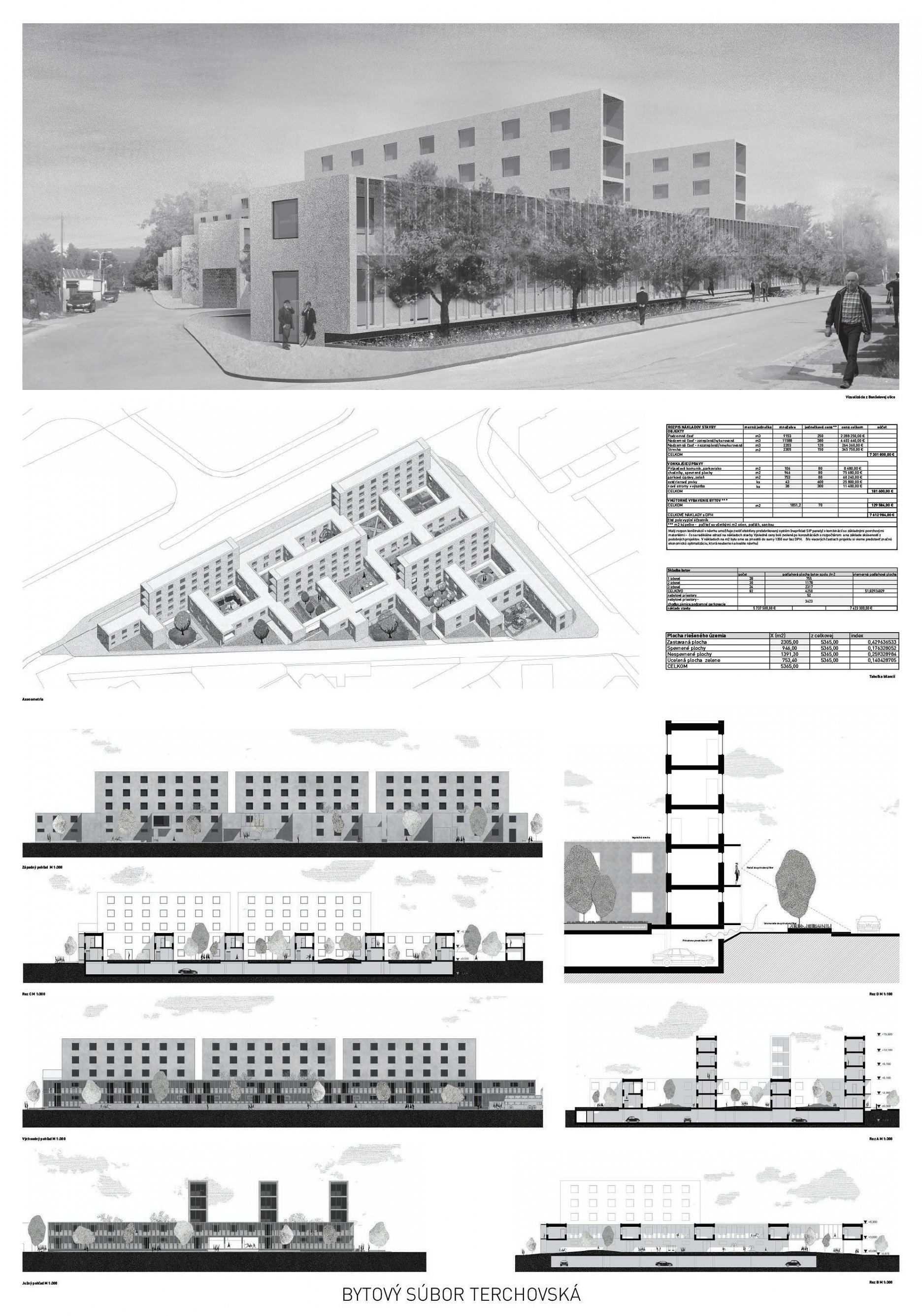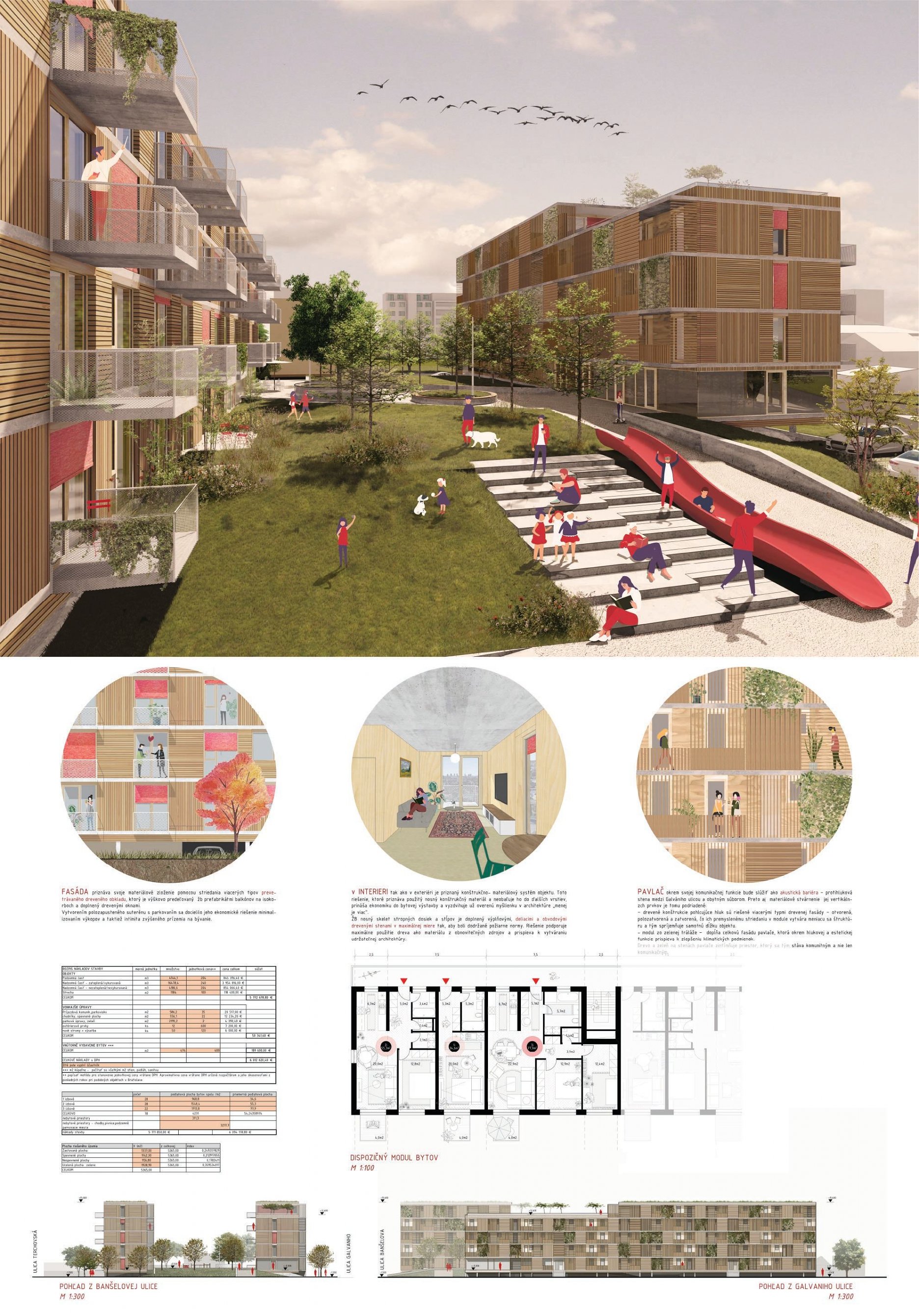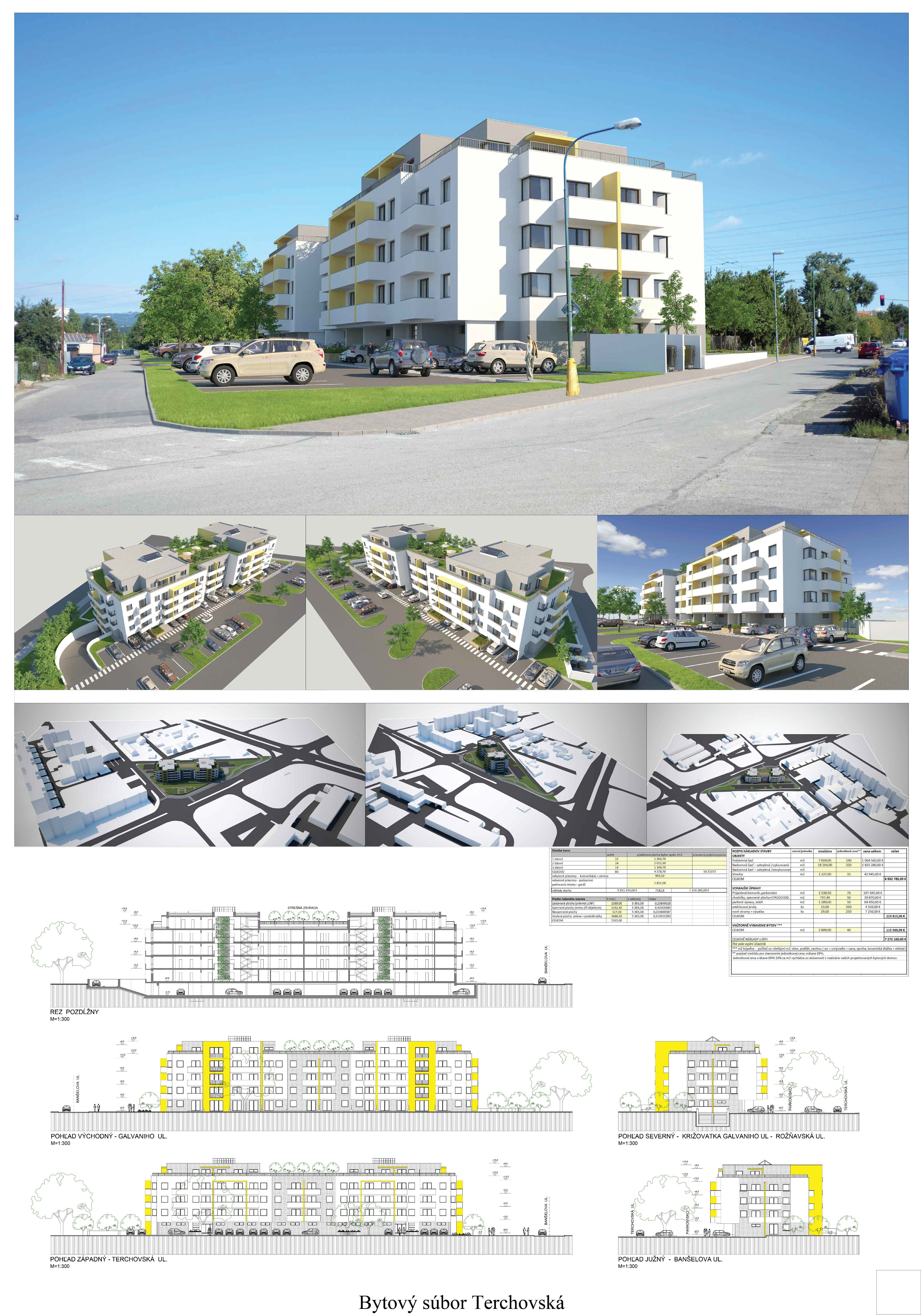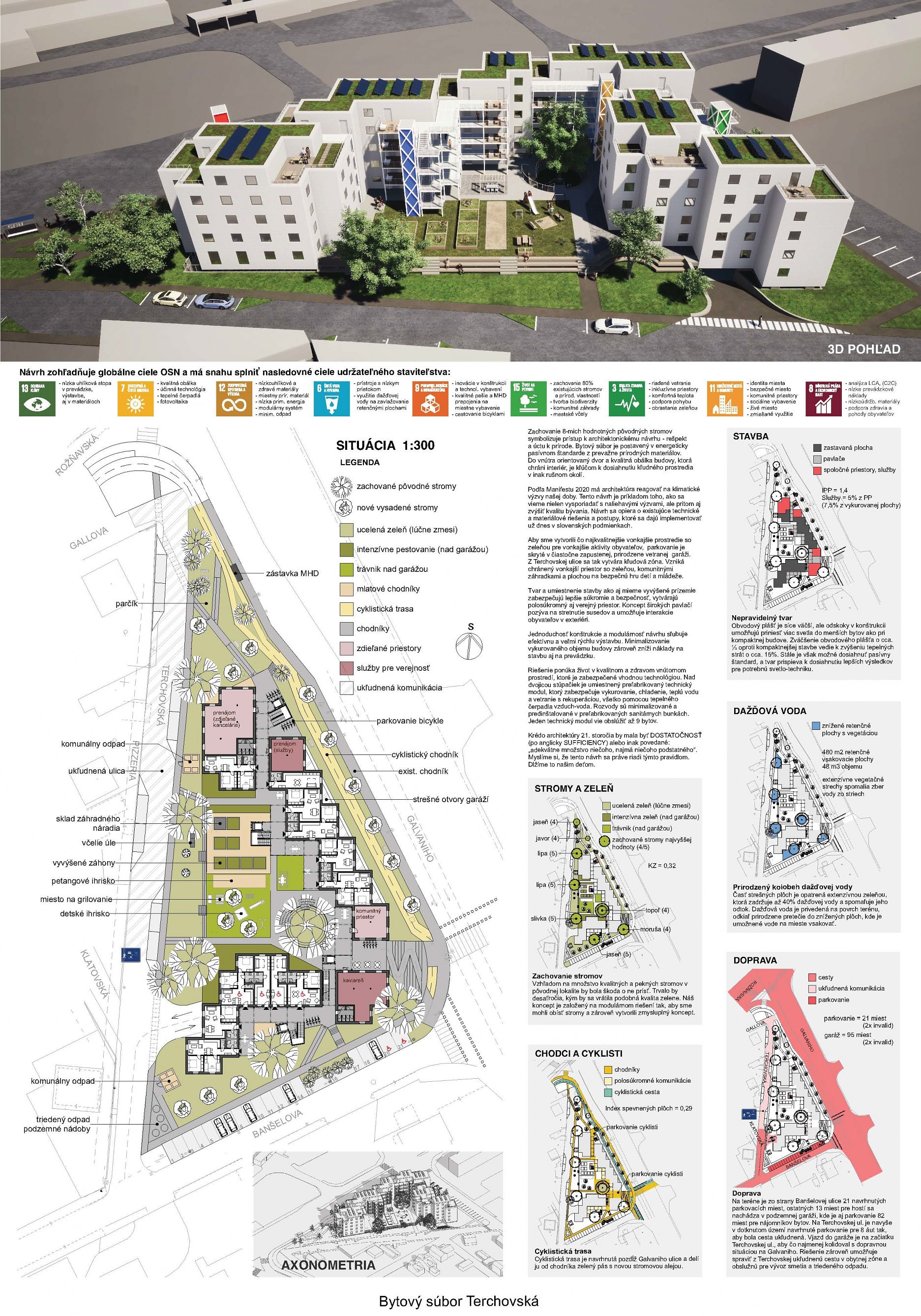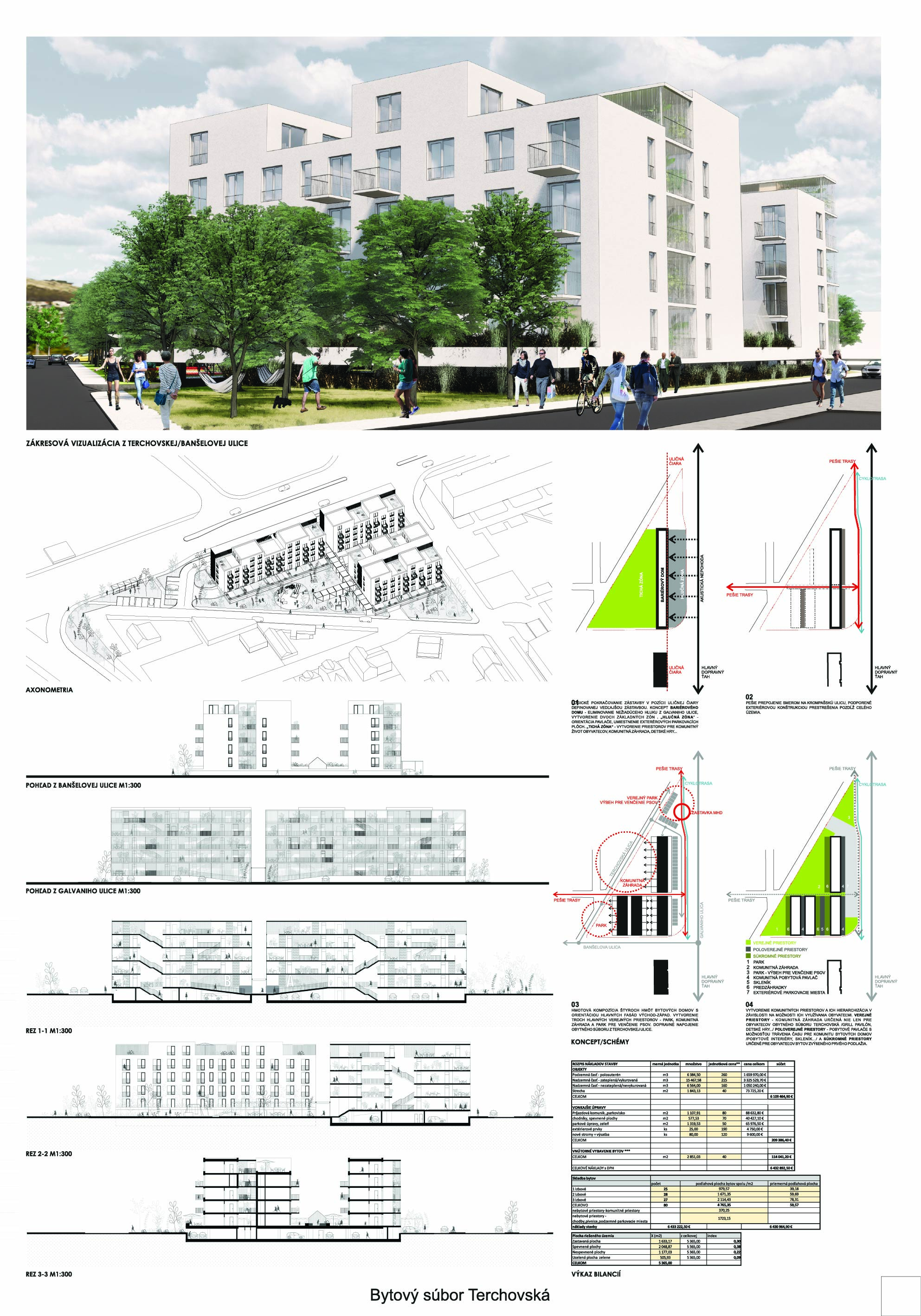 Pri víťaznom návrhu vyzdvihujeme predovšetkým vynikajúce urbanistické riešenie a citlivé začlenenie do územia. Bariérový pavlačový dom odtieňuje hluk z Galvaniho ulice a logicky dopĺňa rad štvorpodlažných panelových domov. Zároveň sa však ku koridoru Galvaniho ulice nestavia chrbtom, keď na oboch priečeliach autori umiestnili priestory vybavenosti. Správnosť tohto rozhodnutia potvrdzuje aj úprava a zvládnutie čelného priestoru pri križovatke Rožňavská - Galvaniho ulica. Skupina menších domov v západnej časti pozemku reaguje na mierku priľahlej zástavby a vytvára tak priepustné poloverejné priestory, ktoré nadväzujú na obdobné priestory medzi panelovými bytovými domami na juhovýchodnej strane Banšelovej ulice. Autori navyše vhodne umiestňujú vjazd do podzemnej halovej garáže do Banšelovej ulice, čím odľahčujú dynamickú dopravu v Terchovskej ulici a potvrdzujú jej status vedľajšej ukľudnenej slepej ulice.