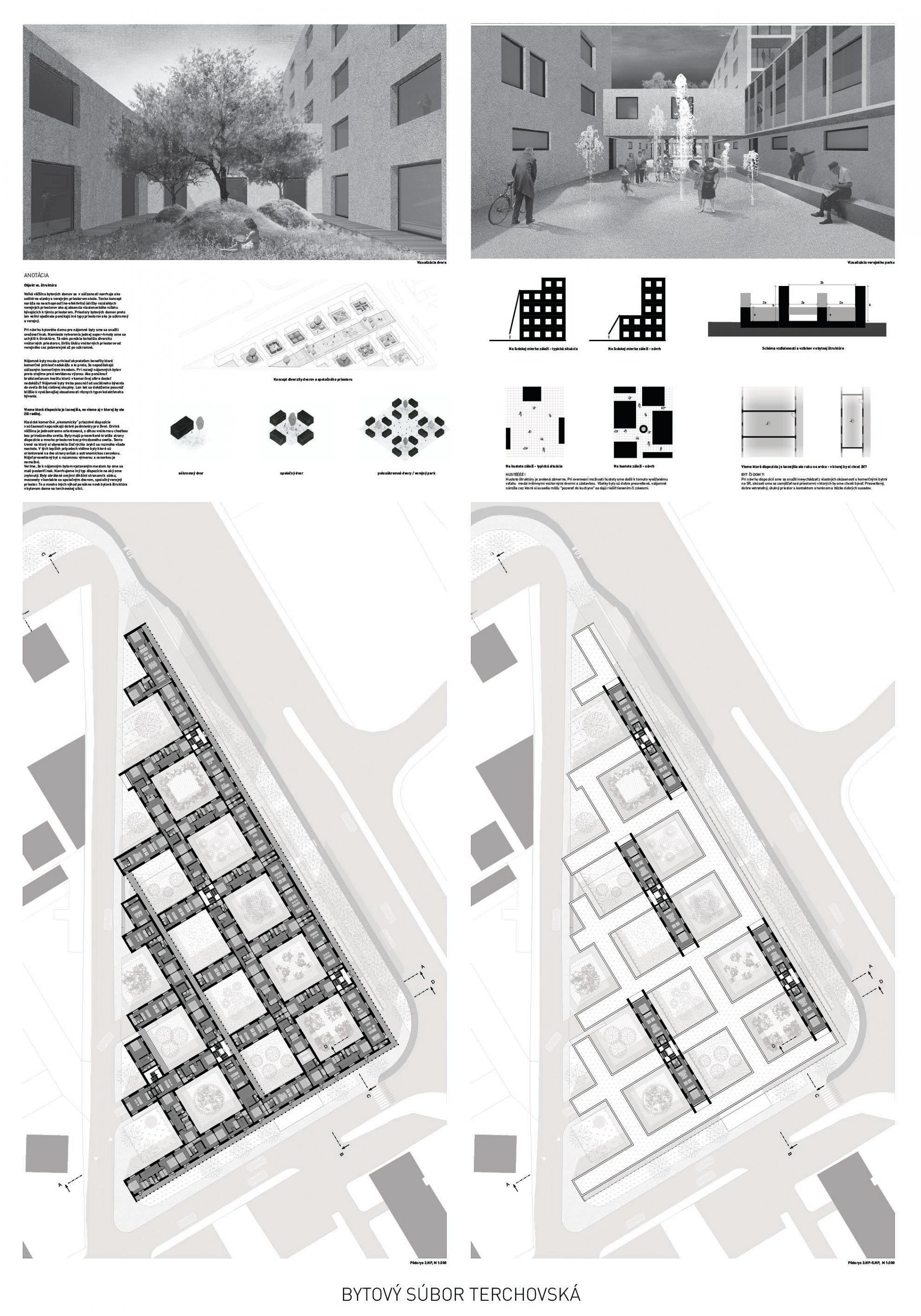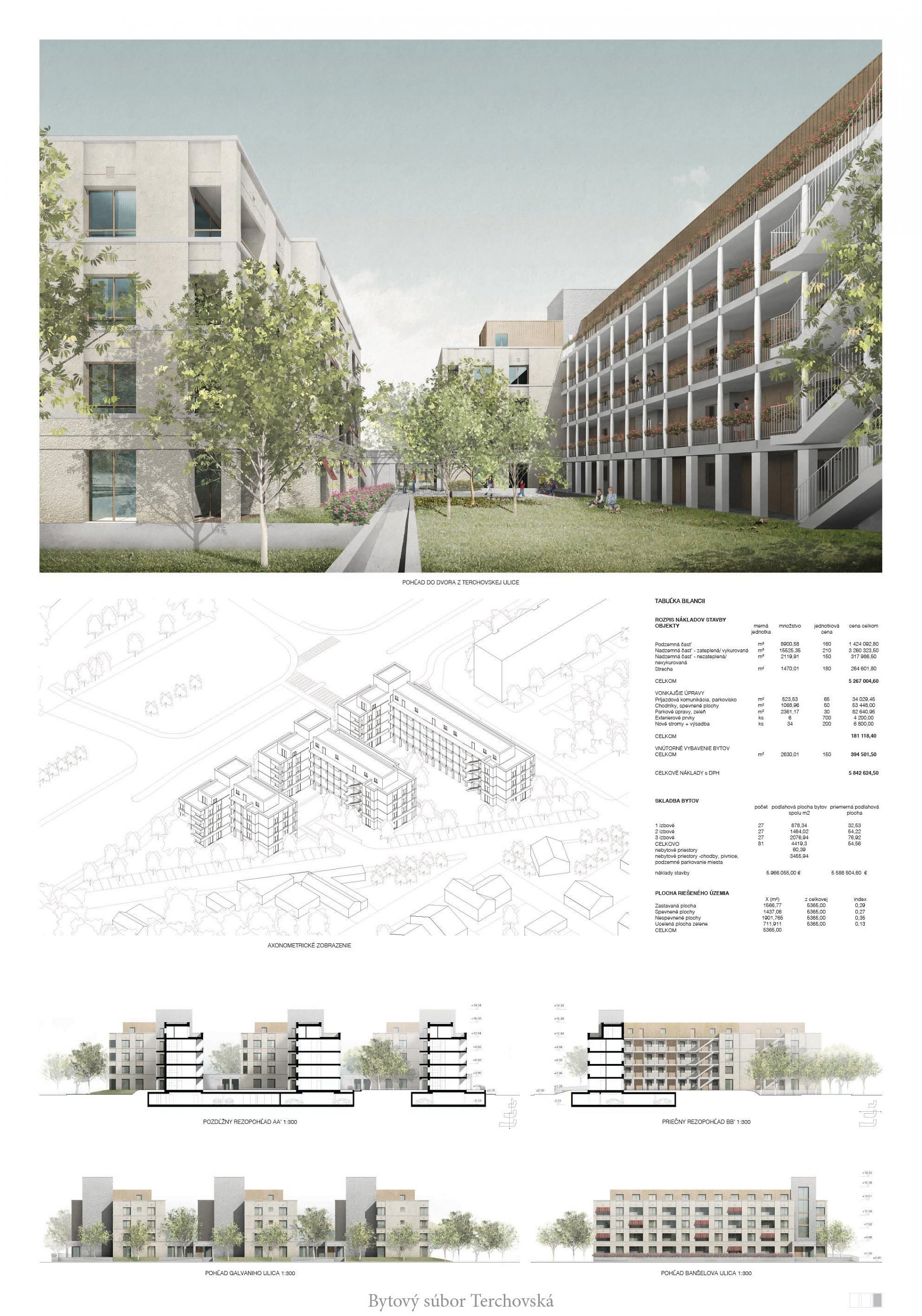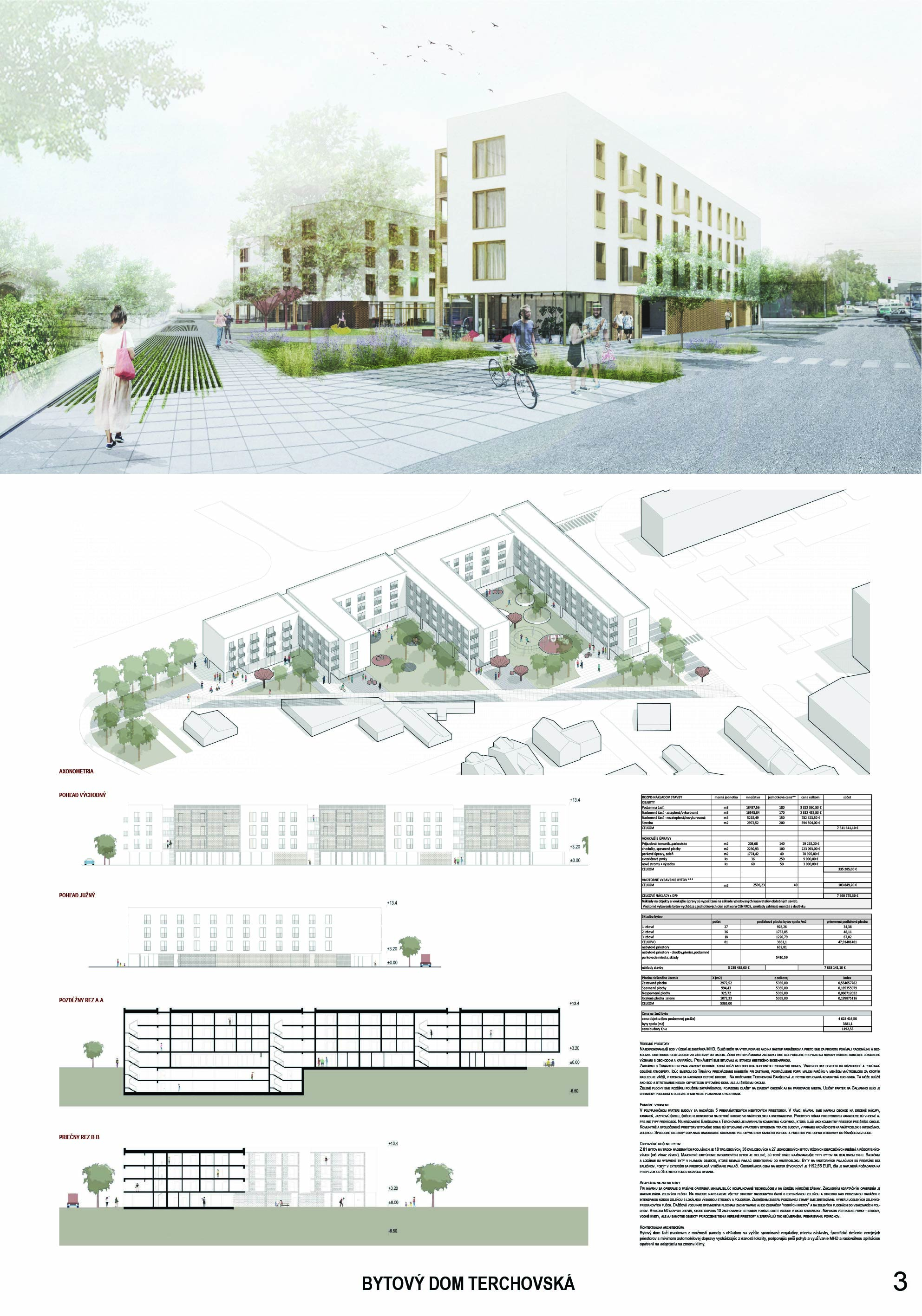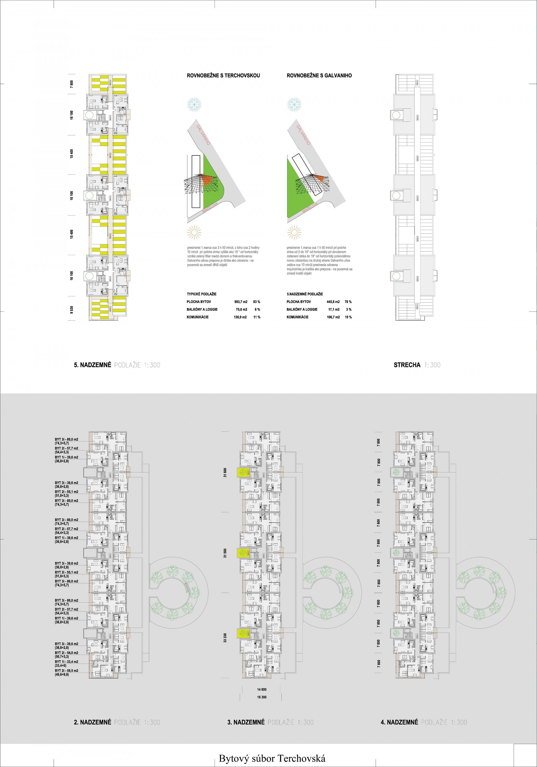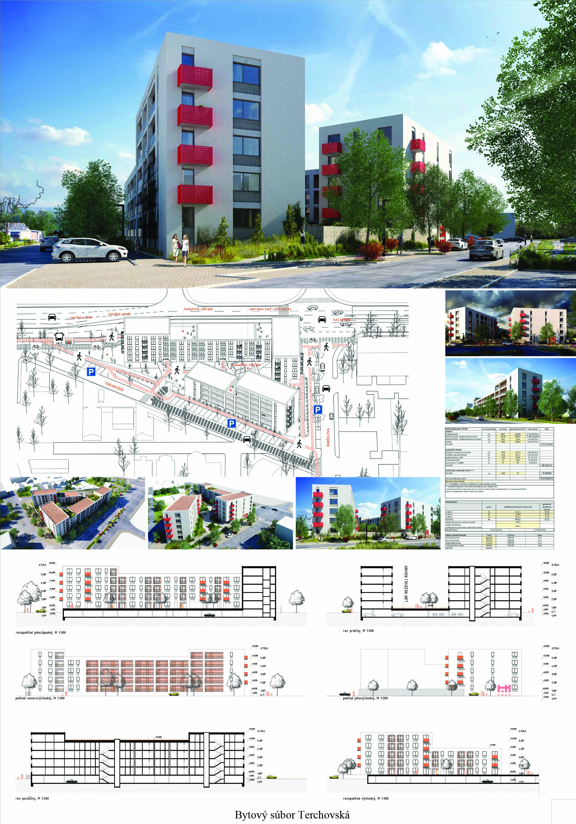 Pri víťaznom návrhu vyzdvihujeme predovšetkým vynikajúce urbanistické riešenie a citlivé začlenenie do územia. Bariérový pavlačový dom odtieňuje hluk z Galvaniho ulice a logicky dopĺňa rad štvorpodlažných panelových domov. Zároveň sa však ku koridoru Galvaniho ulice nestavia chrbtom, keď na oboch priečeliach autori umiestnili priestory vybavenosti. Správnosť tohto rozhodnutia potvrdzuje aj úprava a zvládnutie čelného priestoru pri križovatke Rožňavská - Galvaniho ulica. Skupina menších domov v západnej časti pozemku reaguje na mierku priľahlej zástavby a vytvára tak priepustné poloverejné priestory, ktoré nadväzujú na obdobné priestory medzi panelovými bytovými domami na juhovýchodnej strane Banšelovej ulice. Autori navyše vhodne umiestňujú vjazd do podzemnej halovej garáže do Banšelovej ulice, čím odľahčujú dynamickú dopravu v Terchovskej ulici a potvrdzujú jej status vedľajšej ukľudnenej slepej ulice.