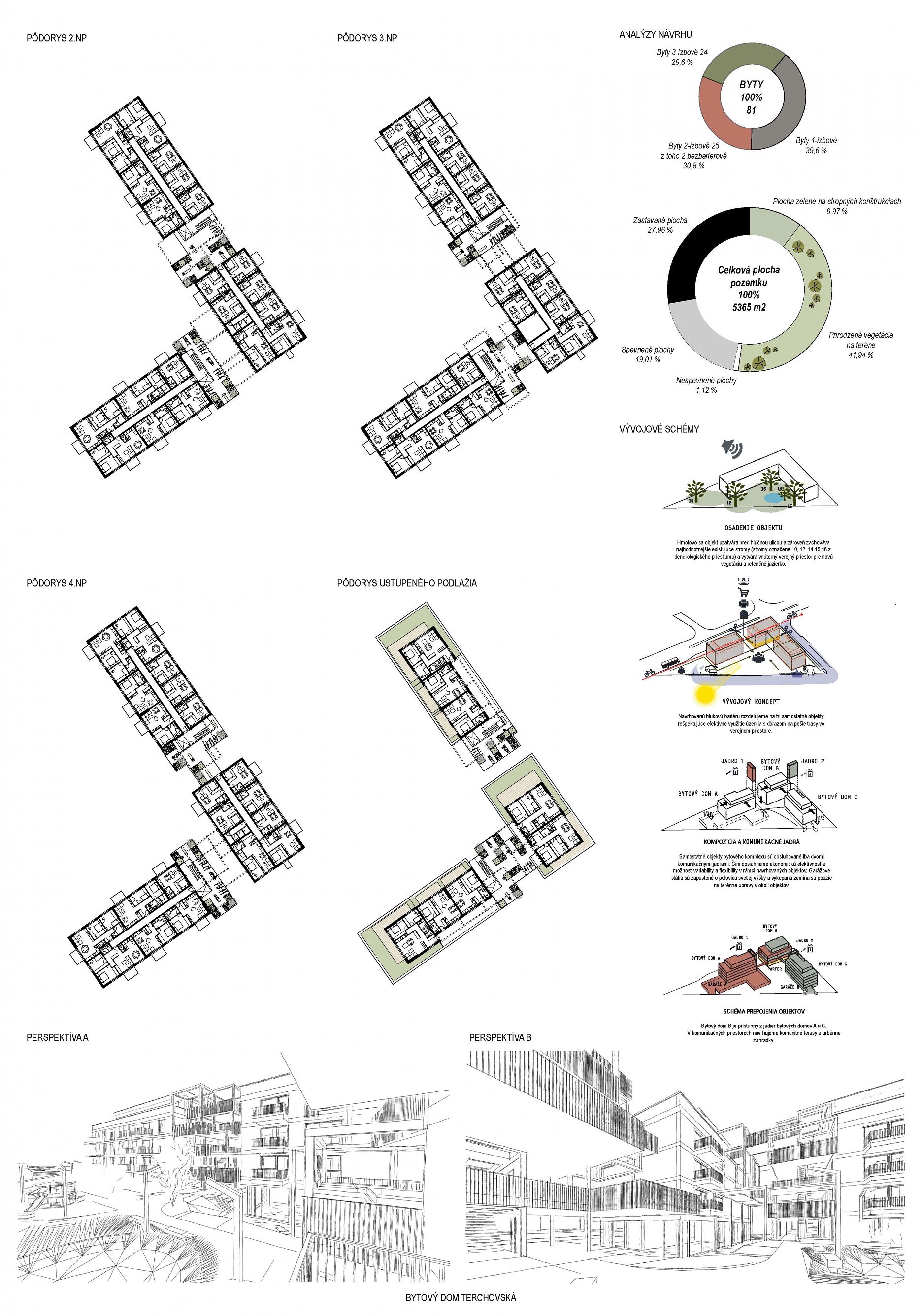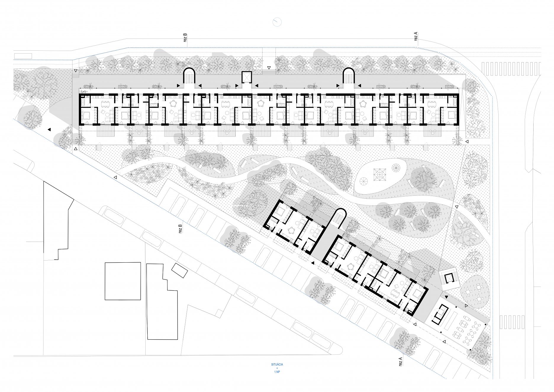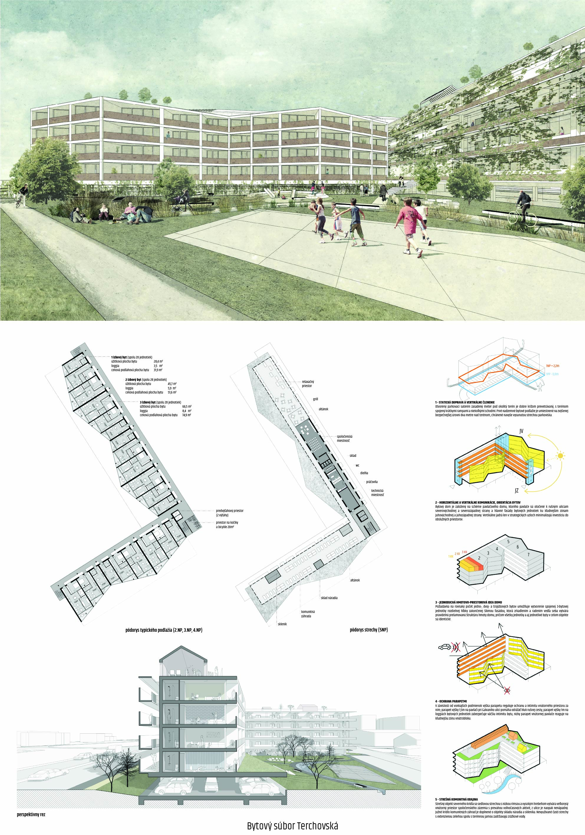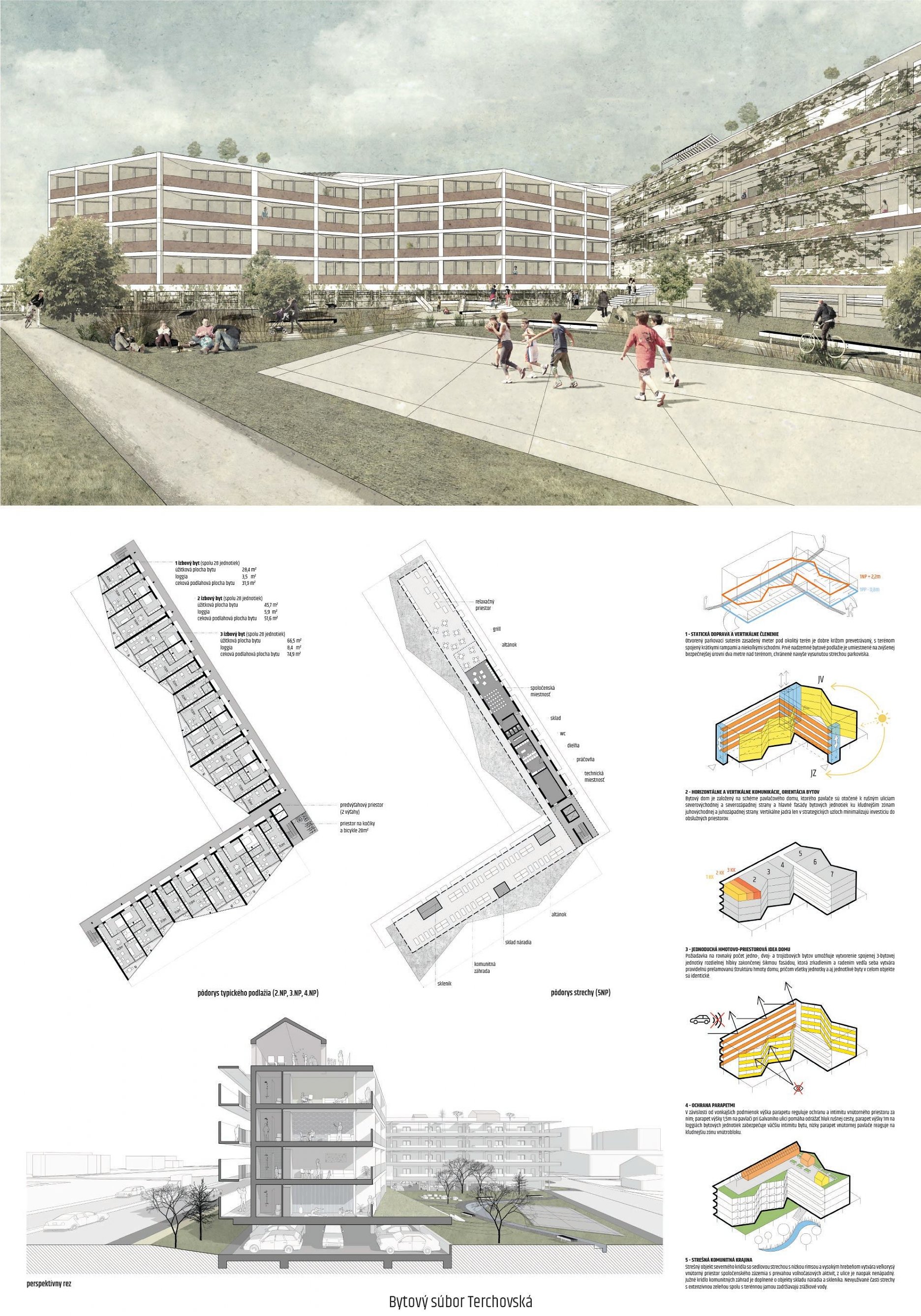 Samotné domy sú lapidárne tak v konštrukčnom, ako aj v dispozičnom riešení, čo považujeme za správne. Popri splnení požadovaných parametrov navrhnutých bytov ponúka riešenie vhodných spoločných a komunitných priestorov.