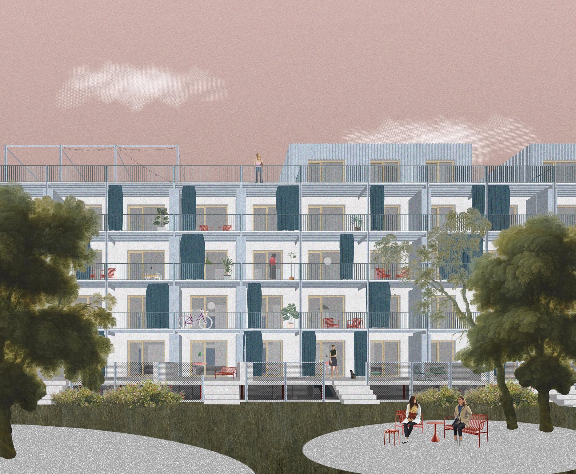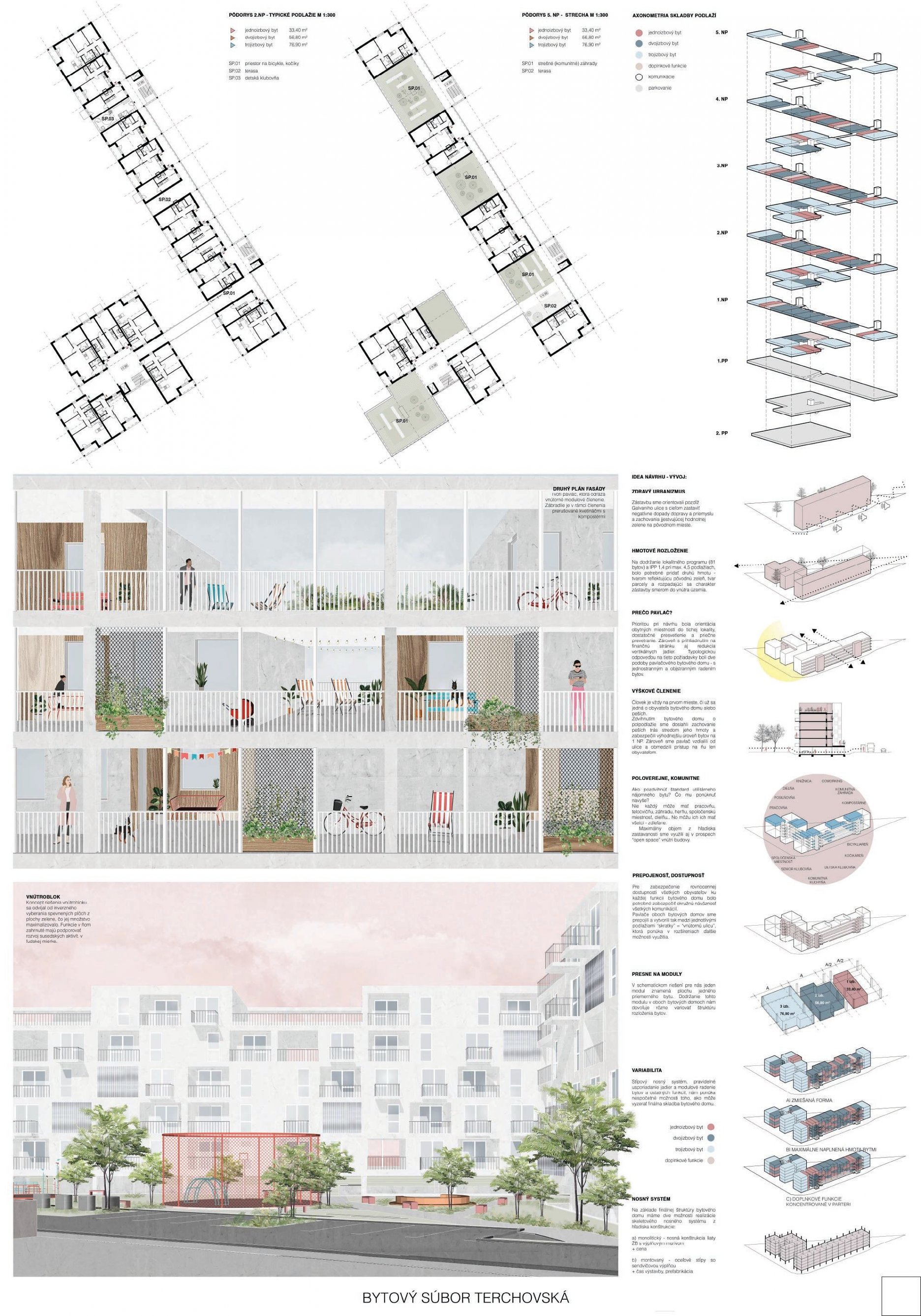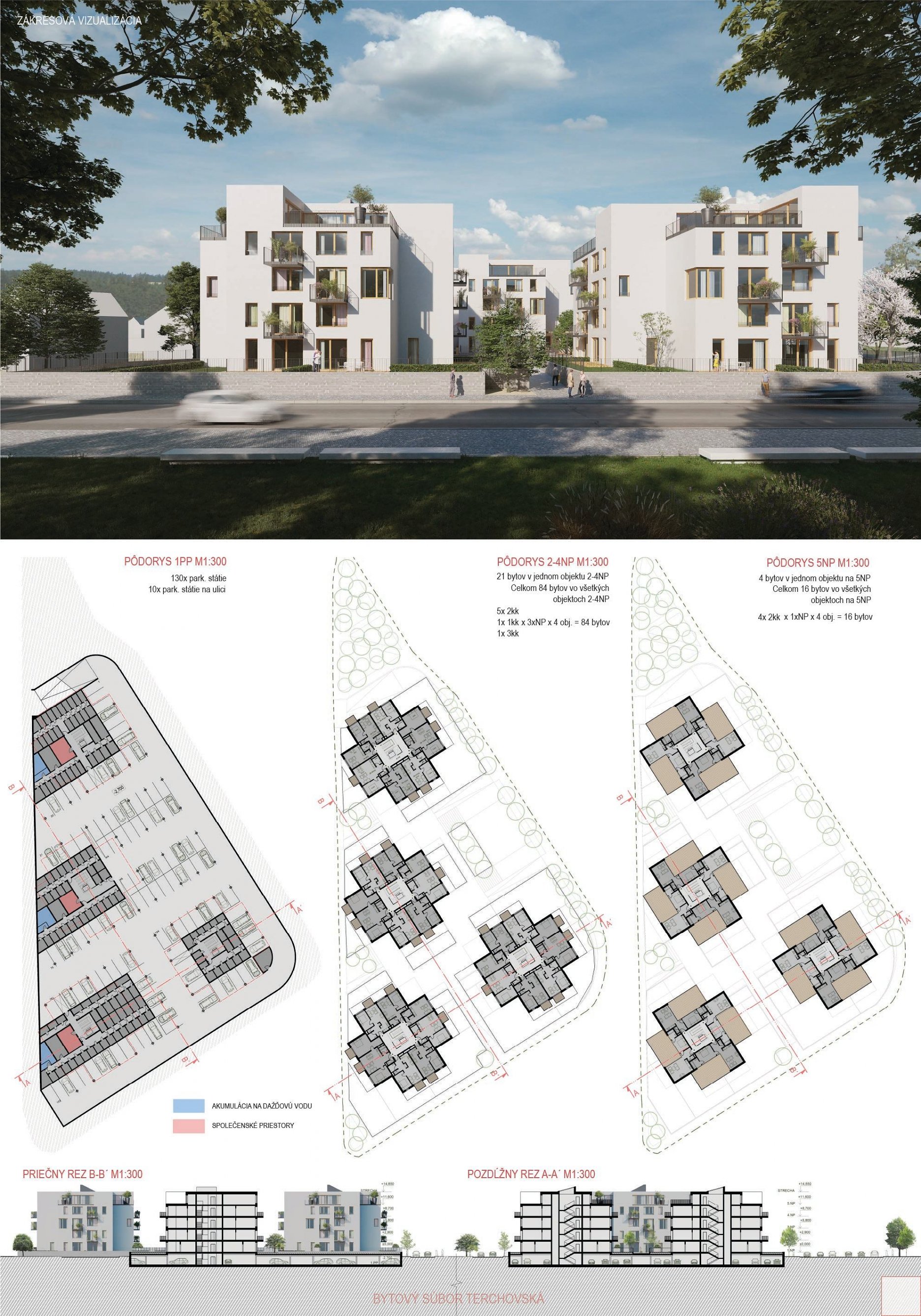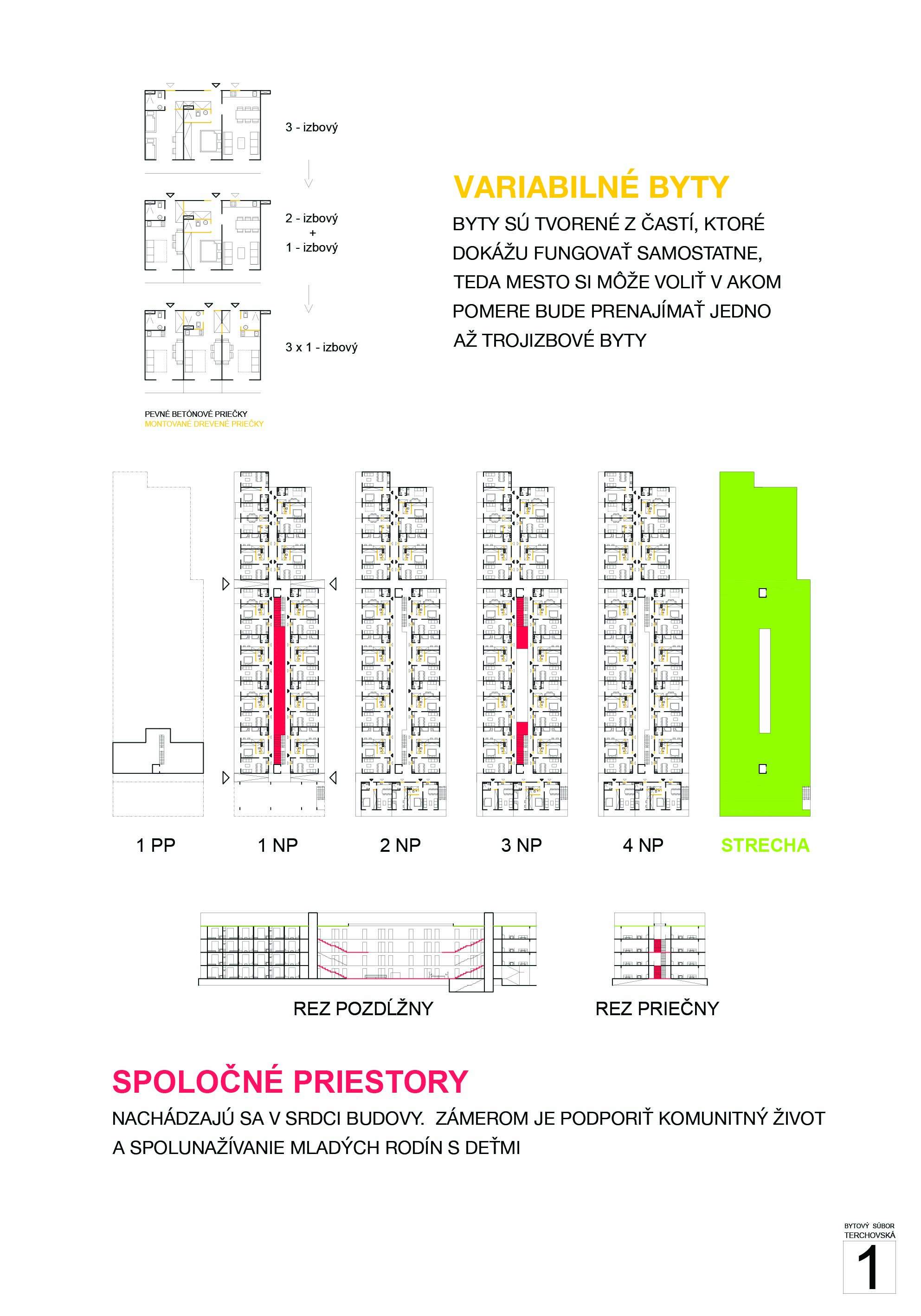Samotné domy sú lapidárne tak v konštrukčnom, ako aj v dispozičnom riešení, čo považujeme za správne. Popri splnení požadovaných parametrov navrhnutých bytov ponúka riešenie vhodných spoločných a komunitných priestorov.