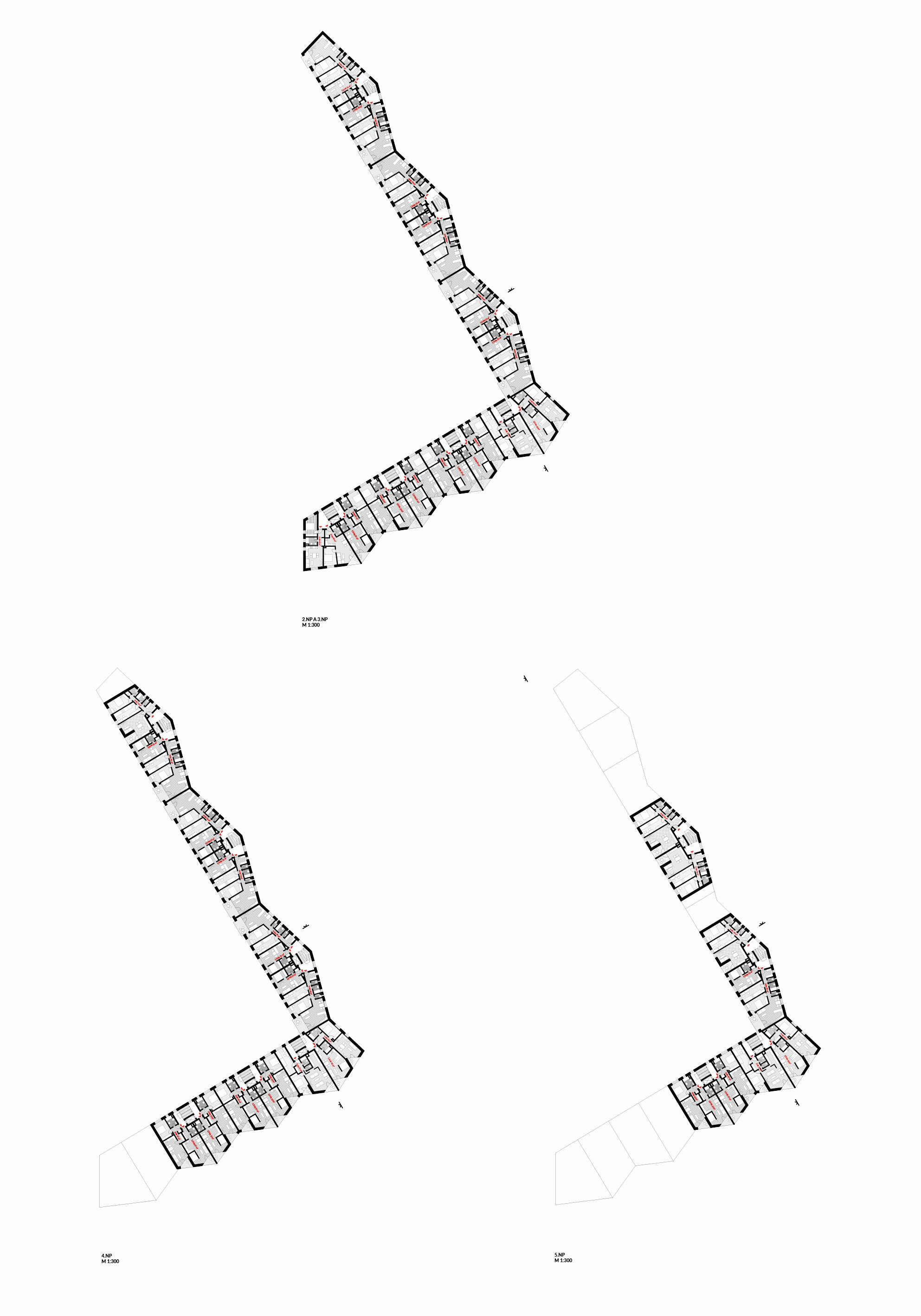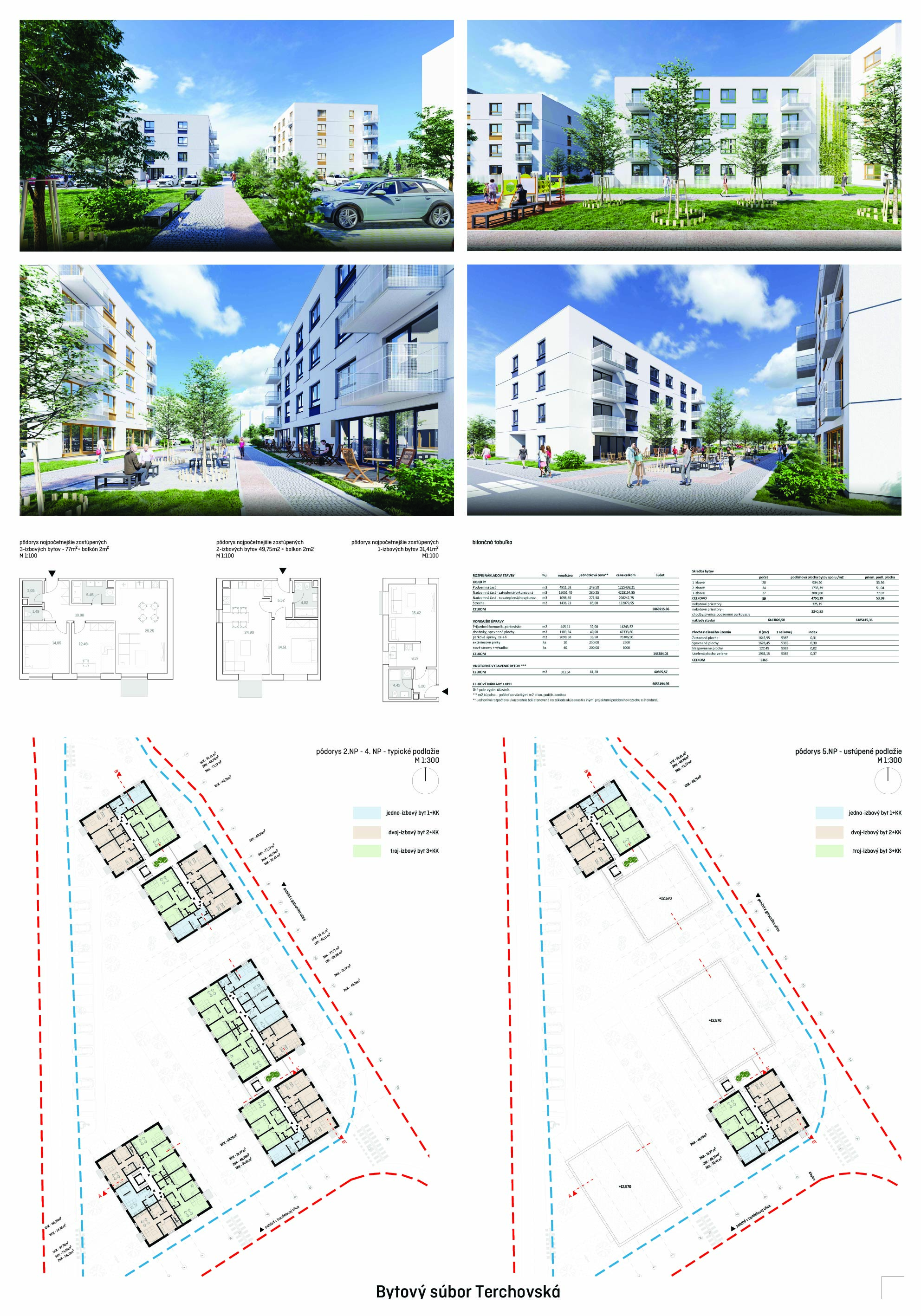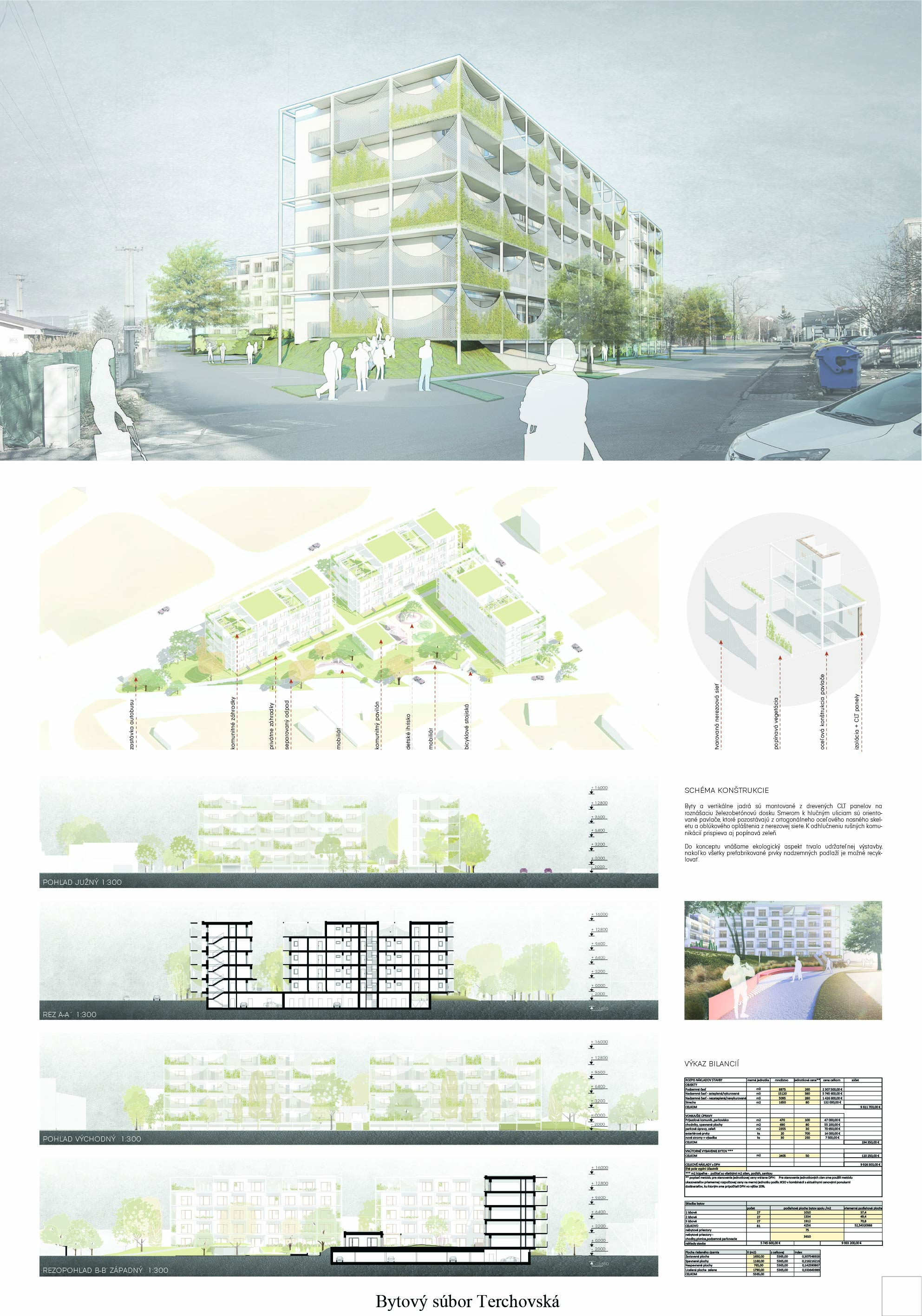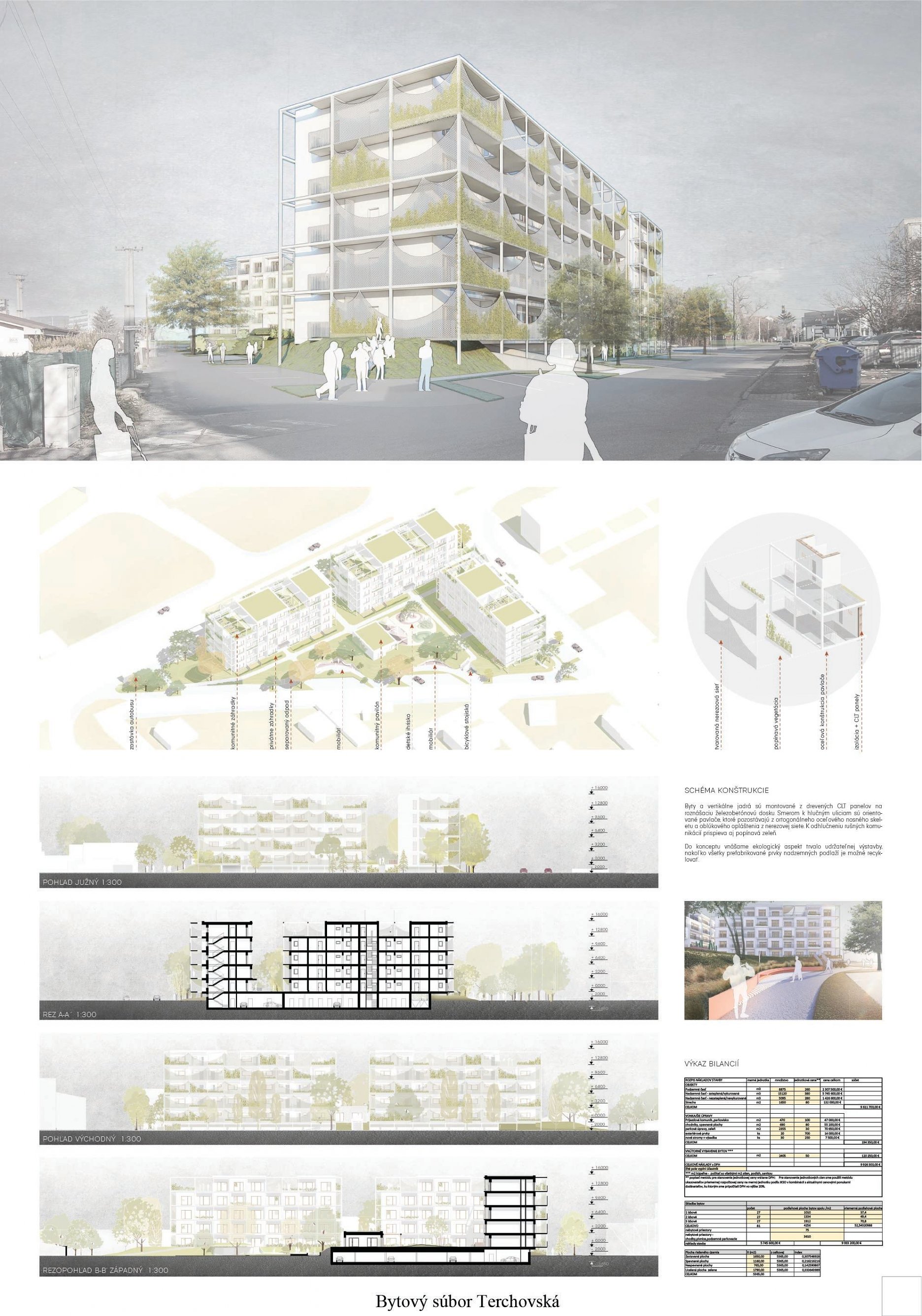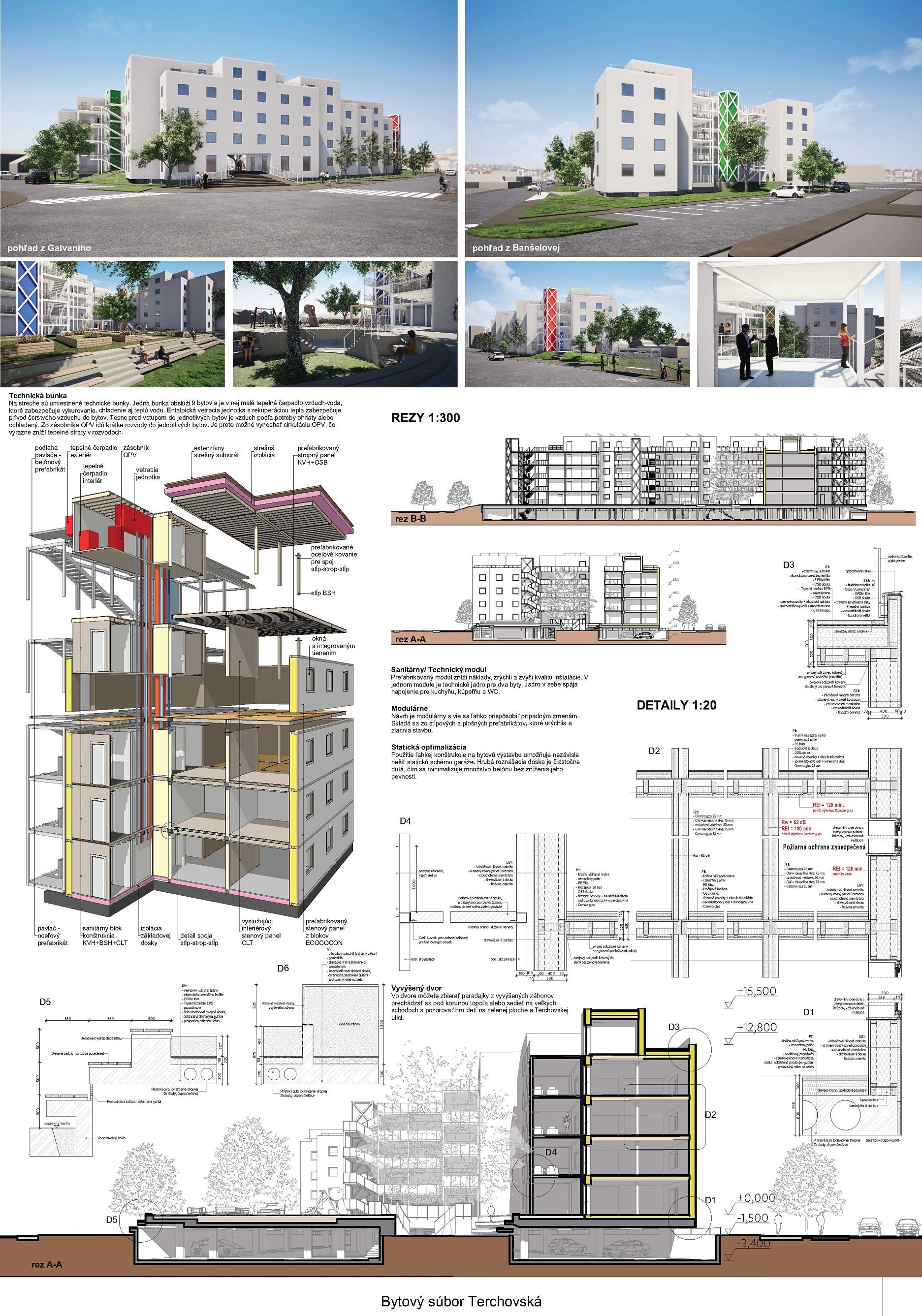 Konštrukčné riešenie domov je lapidárne a vhodné. Traktovanie bytov je tiež správne, samotné dispozičné riešenie jednotlivých bytov, ale umožňuje tiež výrazné zlepšenie. Jednotlivé domy majú správne orientované obytné miestnosti. Kvitujeme návrh predzáhradiek na zvýšenom prízemí. Materiálové vyhotovenie fasád domov si vynútilo dôkladnú diskusiu medzi porotcami. Pozinkované plechy môžu evokovať experimentálne sídlisko Invalidovňa v Prahe, ale aj oceľokôlne na predmestí.