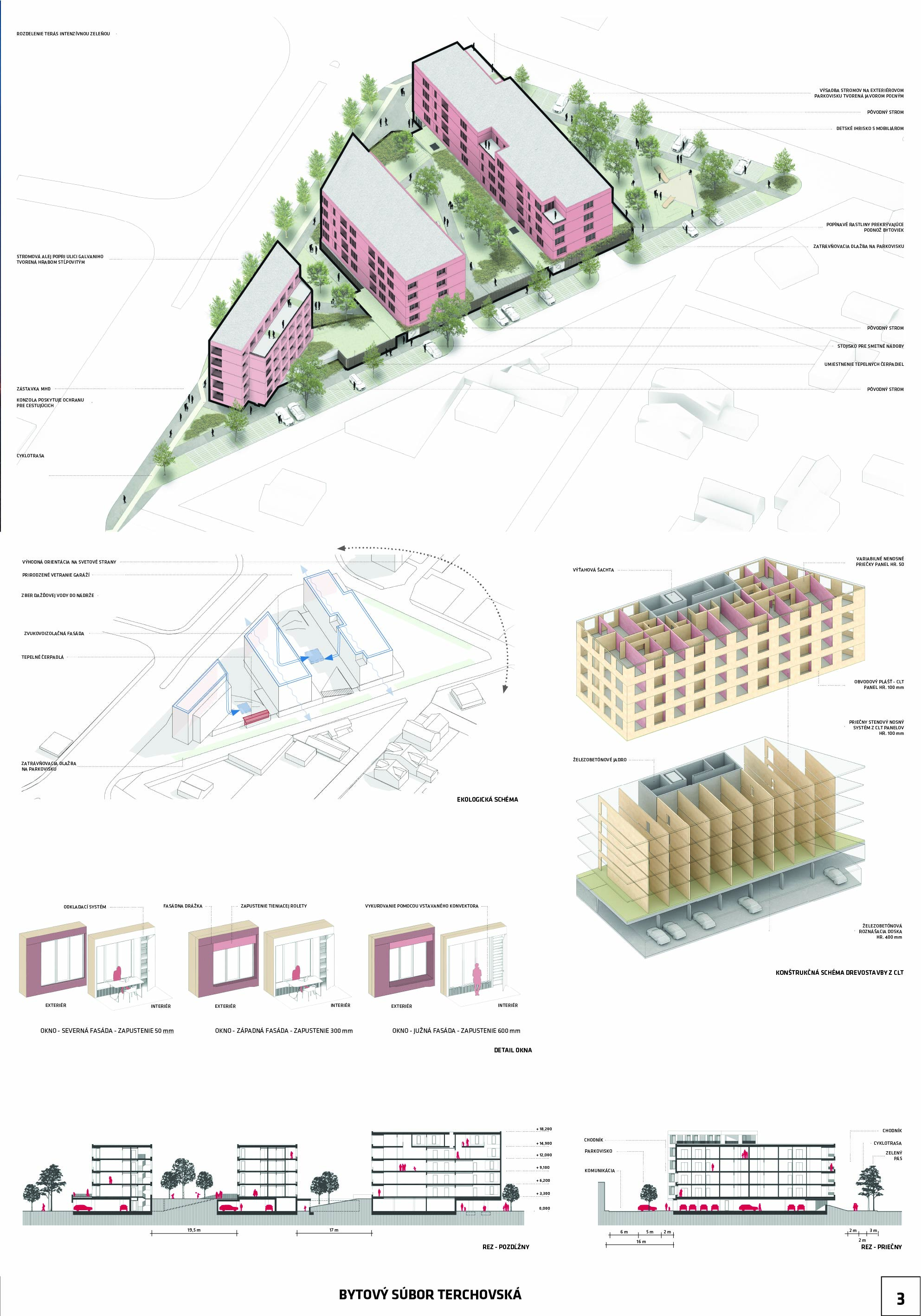 Tretí ocenený návrh nás presvedčil prostým a fungujúcim usporiadaním dvoch pozdĺžnych pavlačových domov, ktoré vhodne využíva základnú konfiguráciu parcely. Park, ktorý medzi domami vzniká, dobre nadväzuje na existujúci park medzi panelovými domami a zároveň umožňuje elegantný priechod parkom ku križovatke Rožňavská - Galvaniho. V situovaní vjazdu do podzemných garáží vidíme, ale priestor na vylepšenie projektu.