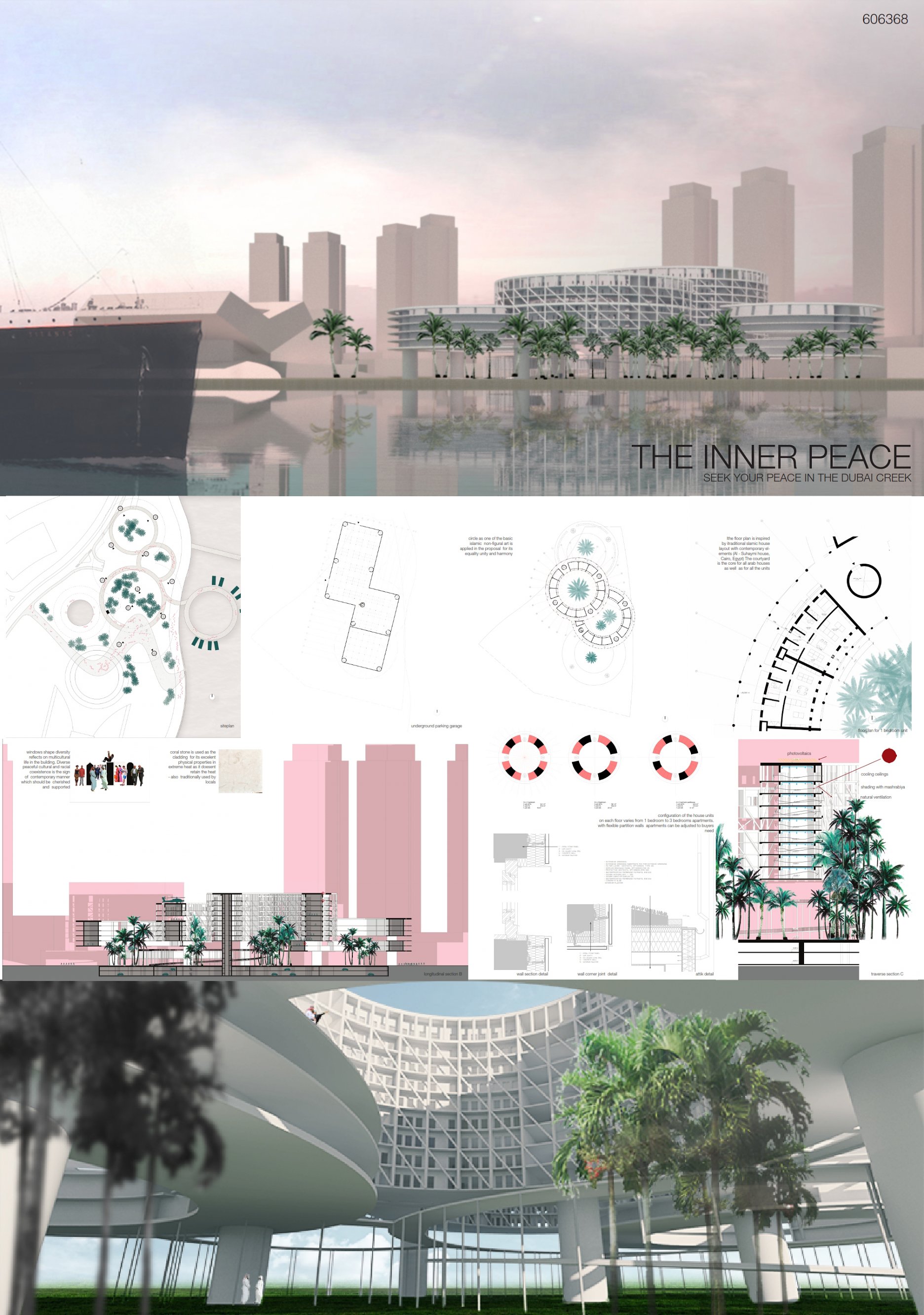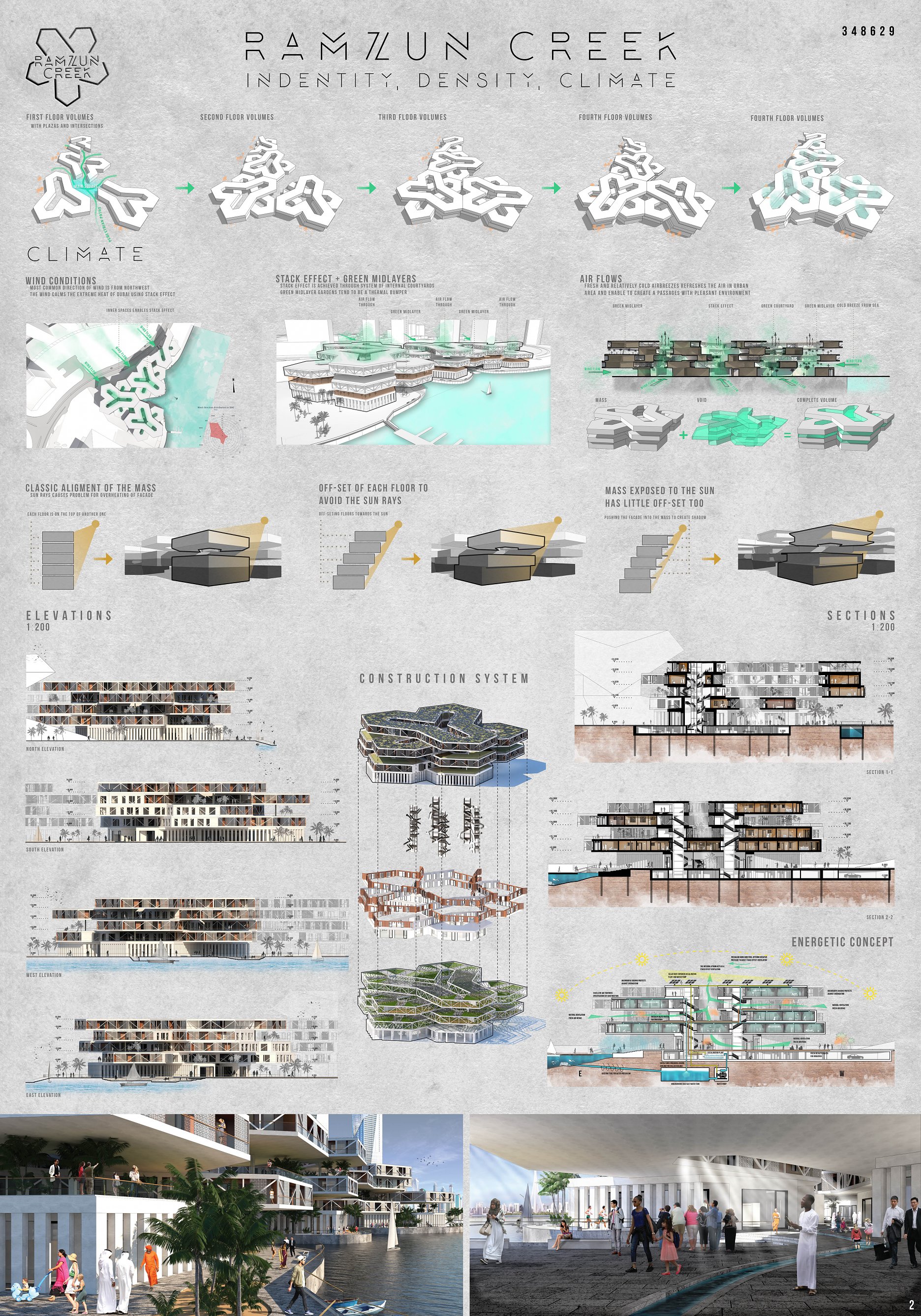 Hodnotenie poroty: Prínos návrhu spočíva v originálnej forme, ktorá je tvorená prepracovanou hmotou a dispozíciou, vychádzajúcou v pôdoryse zo schémy arabskej päť-hviezdice. Návrh ako celok predstavuje ucelenú štruktúru, ktorá v sebe nesie odkaz tradičnej úzkej zatienenej mestskej ulice. Tento princíp tradičnej štruktúry mesta je pretransformovaný do novej modernej rozoberateľnej štruktúry, v ktorej je úzka ulica vytváraná vyberaním z hmoty. Princíp natáčania skladačky s geometrickým tvarom vytvára navonok kompaktnú architektúru „zrastlice“, ktorá je v druhom pláne obohatená o mnoho zatienených pobytových mikropriestorov a vnútorných dvorov, ktoré chránia pred slnkom. Parter je odkazom na štruktúru pôvodných sídel v tejto zemepisnej šírke, kde hra svetla a tieňa je jedným zo znakov tradičnej architektúry.