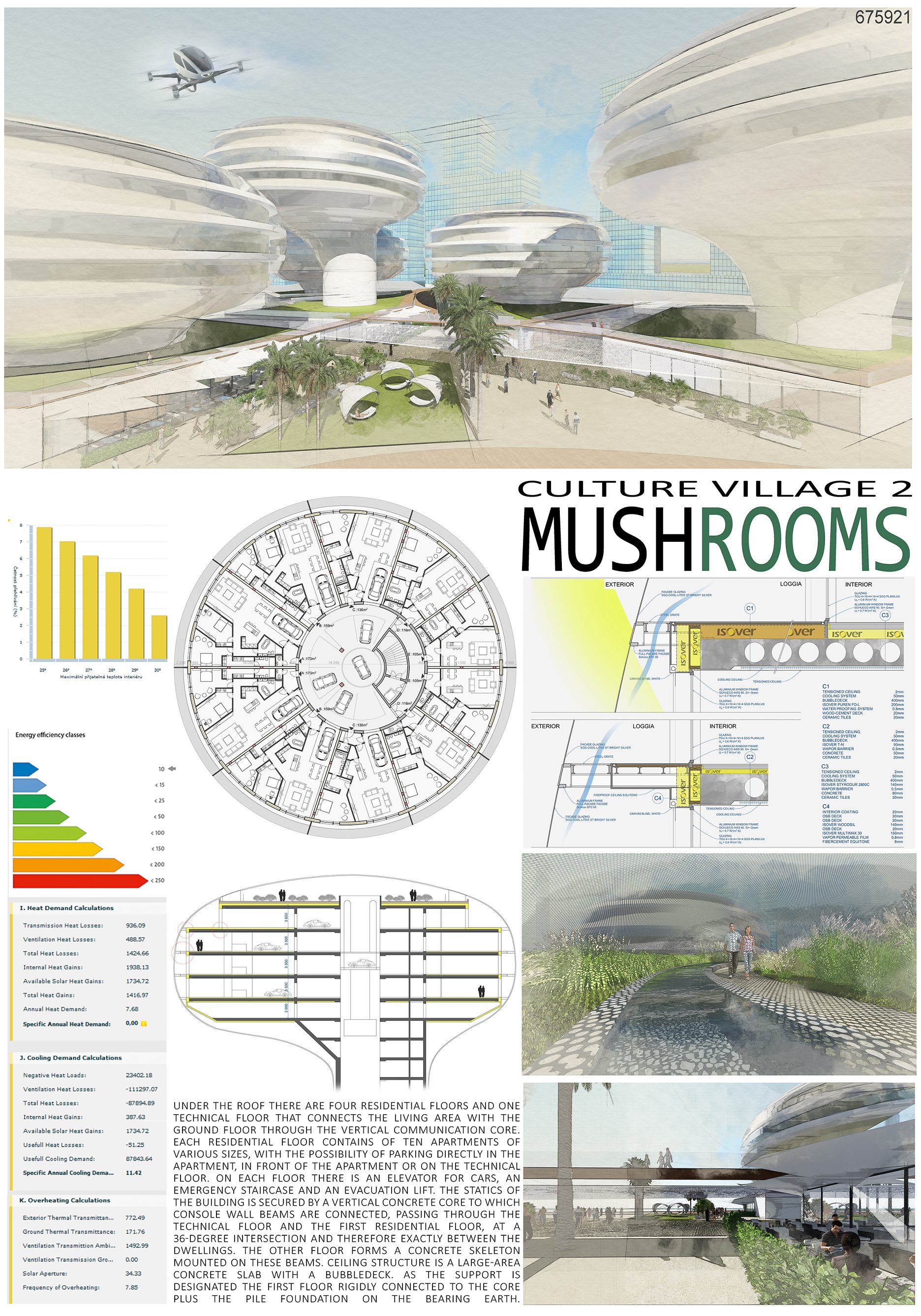 Hodnotenie poroty: Silný koncept bývania je postavený na harmonickej urbanistickej kompozícii expresívne tvarovaných hmôt bytových domov v tvare hríbov s priaznivým faktorom tvaru a minimálnym záberom plochy parteru bytovými domami. Netradičné tvary bytových domov vzbudzujú dojem futuristickej zástavby, ktorý je podporený ideou bývania budúcnosti s automobilmi, resp. elektromobilmi v nadzemných podlažiach a vertikálnymi auto-výťahmi. Vybavenosť v spodnej úrovni parteru sa prelína so zeleným parkovým parterom na strechách pomocou logickej siete peších trás a premostení, ktoré vyúsťujú do centrálneho parku napojeného na promenádu a vodnú plochu. Zdvihnuté objemy bytových domov vytvárajú počas dňa príjemné tienenie ponad verejnými priestormi. Návrh má výborne graficky spracované vizualizácie.