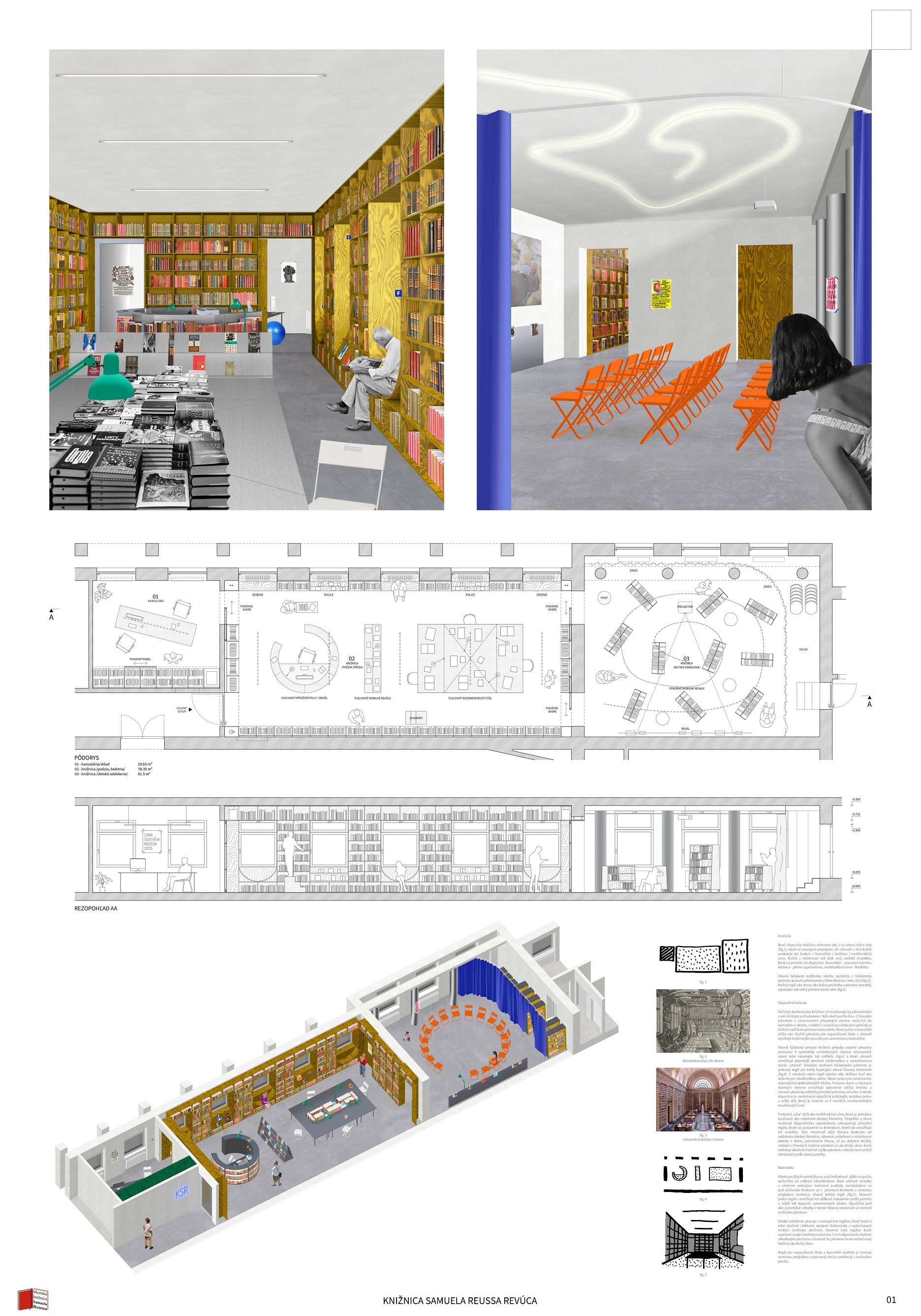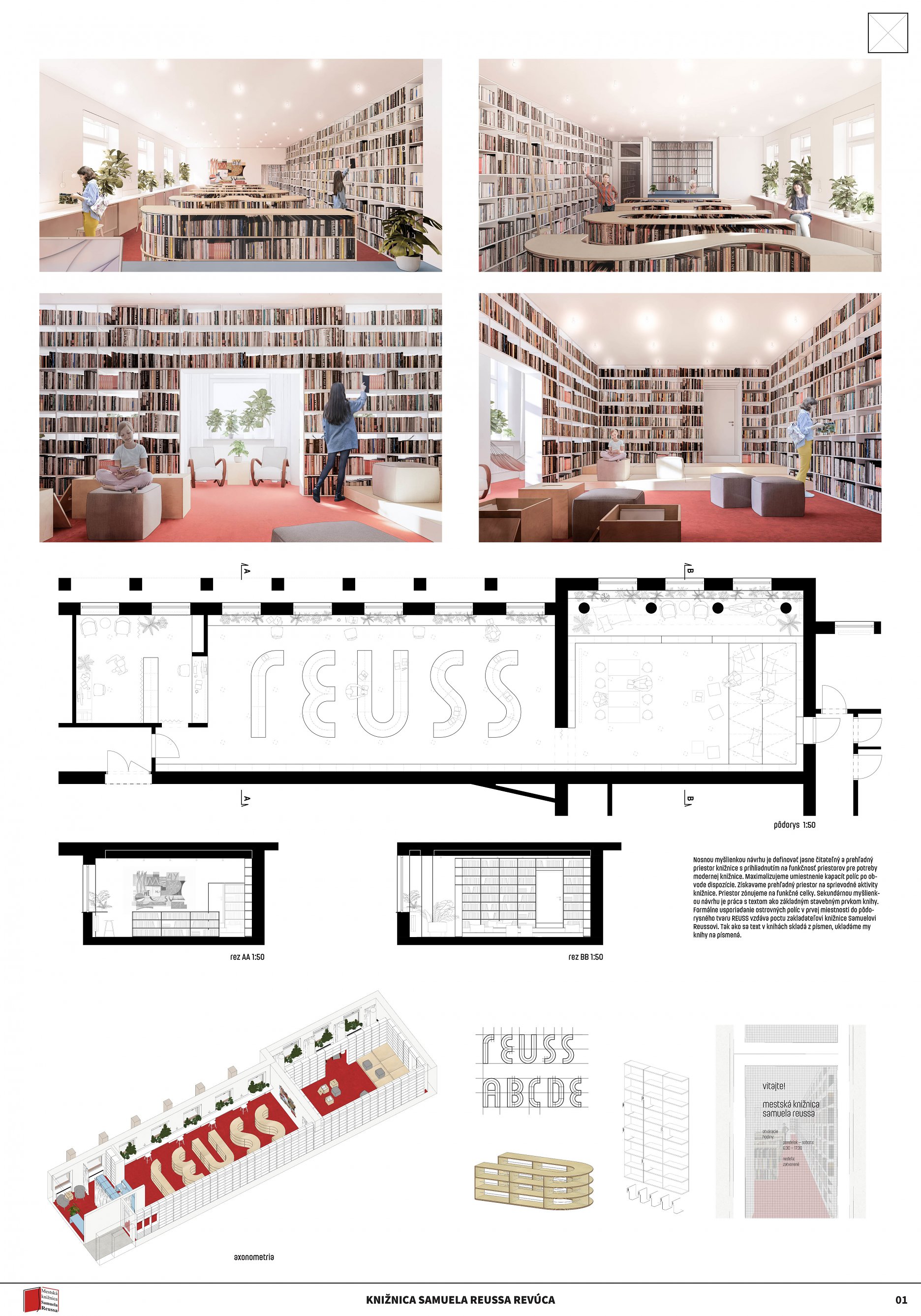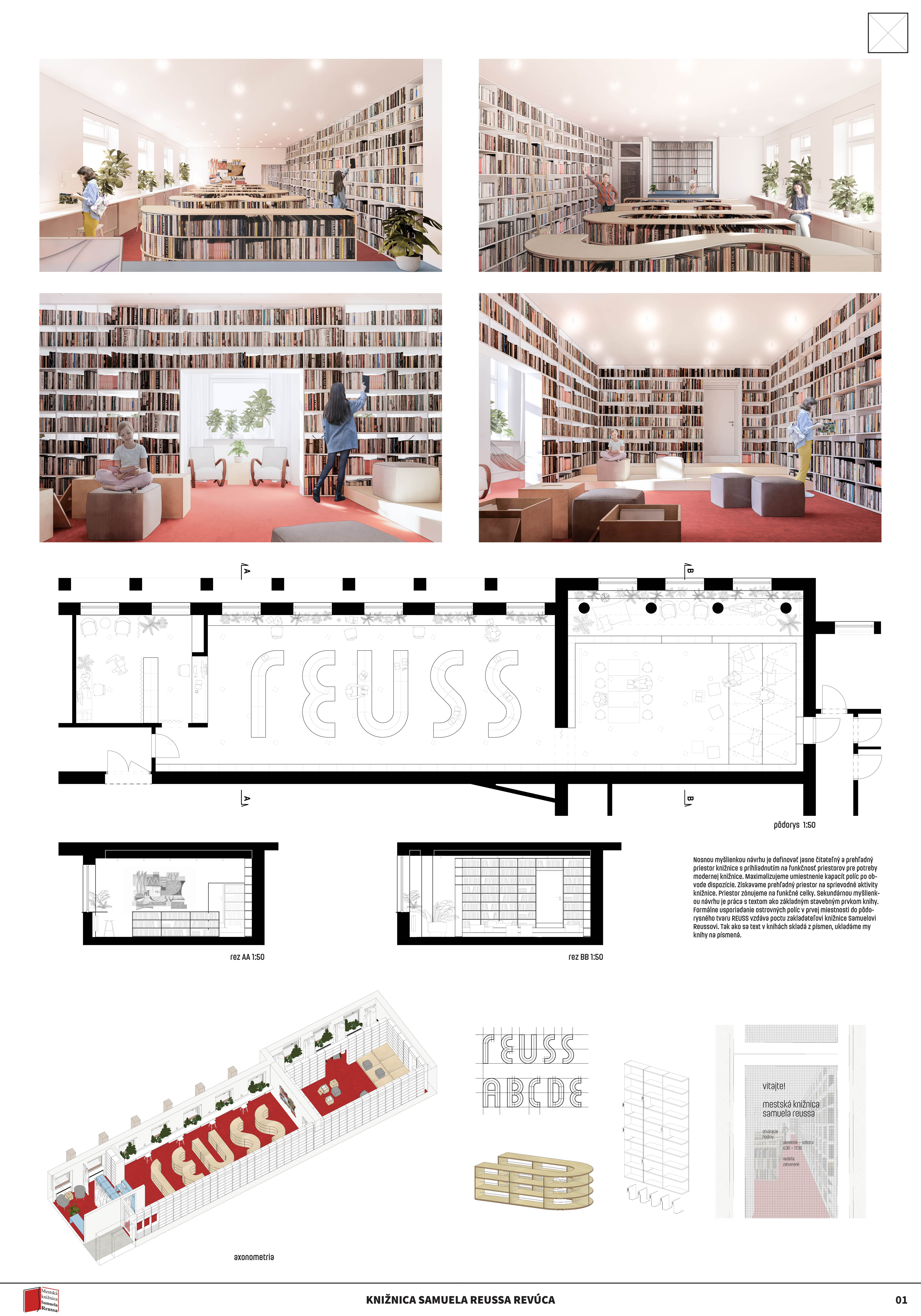 Jednoduchým konceptom návrhu knižnice sa autori snažia v čo najvyššej miere využiť obvodové steny riešeného priestoru. Jedným priebežným regálom na celú výšku miestnosti prepájajú dva hlavné priestory knižnice. V miestnosti pre deti tento regál obchádza celý priestor a necháva vyčlenený reziduálny priestor pri oknách ako introvertnú študovňu. Priestor pre deti, ktorý je celý vymedzený vysokým regálom, aby mohla vzniknúť tichá študovňa bude ale odkázaný na umelé osvetlenie. Otázna je tiež funkčnosť introvertného priestoru pri oknách v spojení s detským oddelením. V hlavnej miestnosti knižnice priestoru dominujú nízke regály do výšky parapetu okien vytvárajúce nápis “reuss” ako odkaz na revúckeho autora diela Hviezdoveda. Typografická myšlienka je použitá aj ako vizuálna identita celej knižnice. Napriek kreatívnemu prevedeniu pôsobí toto gesto ťažkopádne a zväzujúco. Vznikajú úzke a zle prístupné priestory medzi regálmi a nezdá sa, že je dané riešenie pre čitateľov prínosné. Pracovisko knihovníkov s knihovníckym pultom je kompaktné, ale na druhú stranu príliš vyčlenené zo samotného priestoru knižnice. Návrh svojim konceptom striktne definuje všetky priestory a člení ich spôsobom, ktorý obmedzuje variabilnejšie využitie. Pozitívom návrhu je zakomponovanie existujúceho diela do návrhu a argumentácia v prospech jeho zachovania.