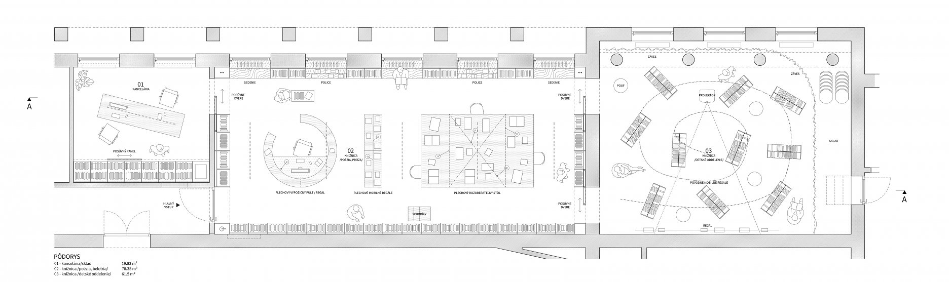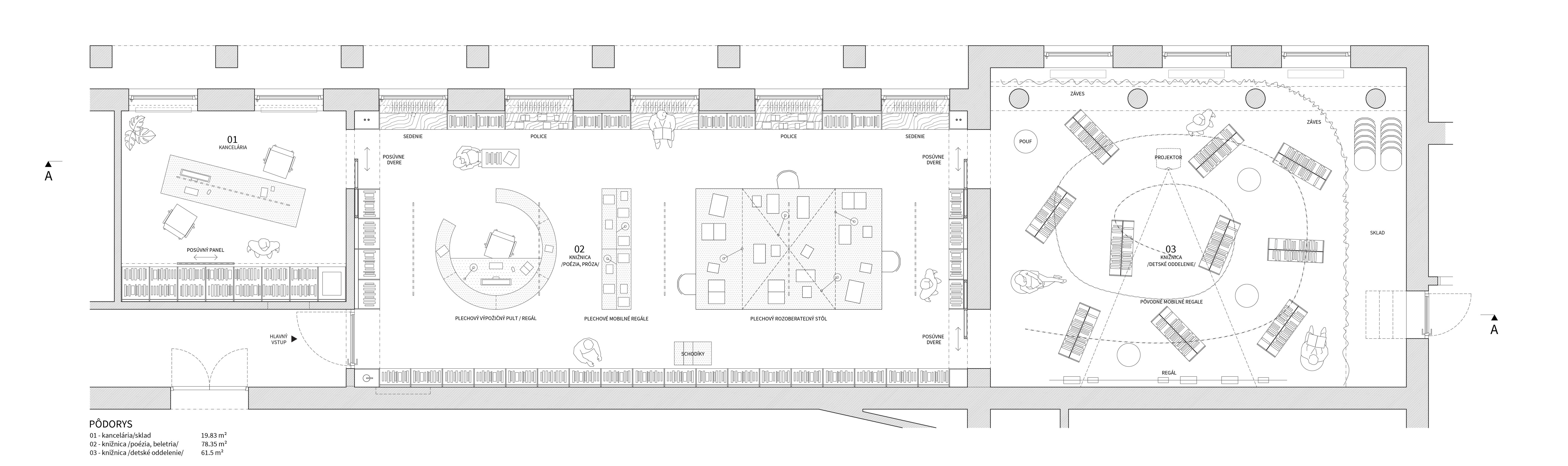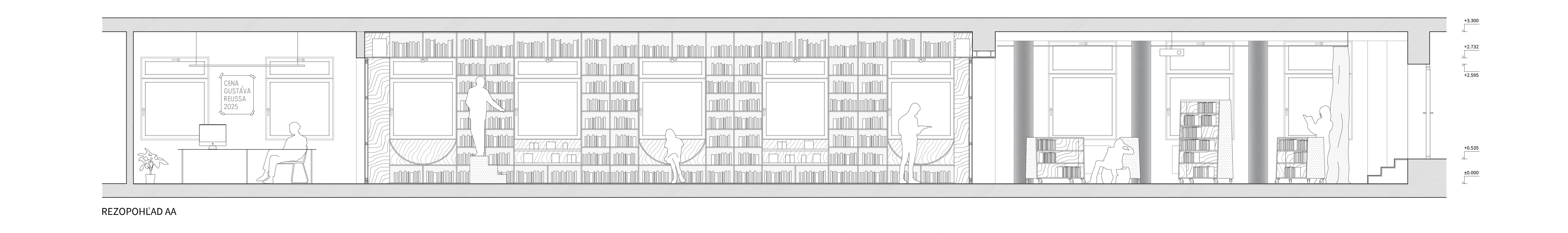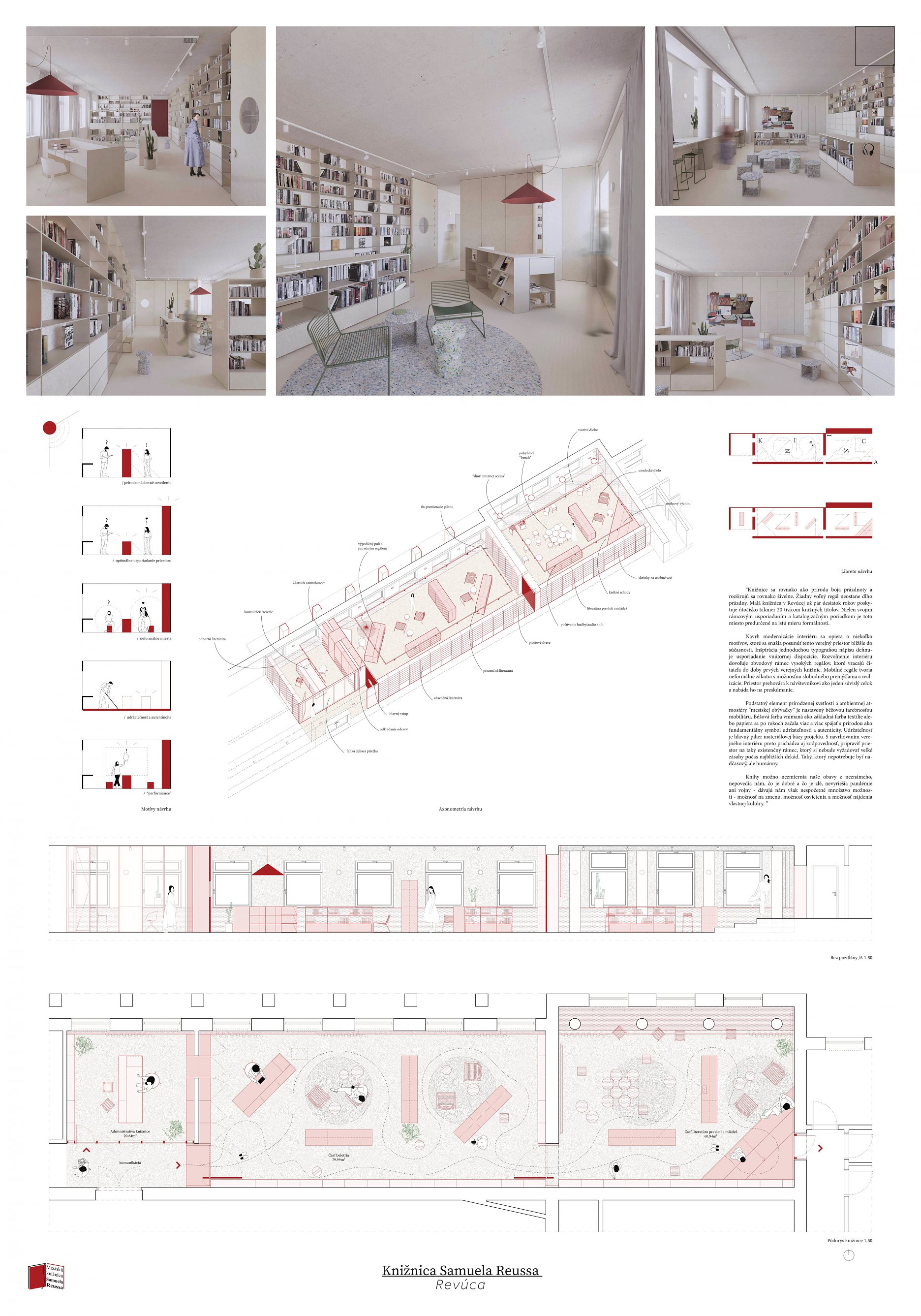 Jednoduchým konceptom návrhu knižnice sa autori snažia v čo najvyššej miere využiť obvodové steny riešeného priestoru. Jedným priebežným regálom na celú výšku miestnosti prepájajú dva hlavné priestory knižnice. V miestnosti pre deti tento regál obchádza celý priestor a necháva vyčlenený reziduálny priestor pri oknách ako introvertnú študovňu. Priestor pre deti, ktorý je celý vymedzený vysokým regálom, aby mohla vzniknúť tichá študovňa bude ale odkázaný na umelé osvetlenie. Otázna je tiež funkčnosť introvertného priestoru pri oknách v spojení s detským oddelením. V hlavnej miestnosti knižnice priestoru dominujú nízke regály do výšky parapetu okien vytvárajúce nápis “reuss” ako odkaz na revúckeho autora diela Hviezdoveda. Typografická myšlienka je použitá aj ako vizuálna identita celej knižnice. Napriek kreatívnemu prevedeniu pôsobí toto gesto ťažkopádne a zväzujúco. Vznikajú úzke a zle prístupné priestory medzi regálmi a nezdá sa, že je dané riešenie pre čitateľov prínosné. Pracovisko knihovníkov s knihovníckym pultom je kompaktné, ale na druhú stranu príliš vyčlenené zo samotného priestoru knižnice. Návrh svojim konceptom striktne definuje všetky priestory a člení ich spôsobom, ktorý obmedzuje variabilnejšie využitie. Pozitívom návrhu je zakomponovanie existujúceho diela do návrhu a argumentácia v prospech jeho zachovania.