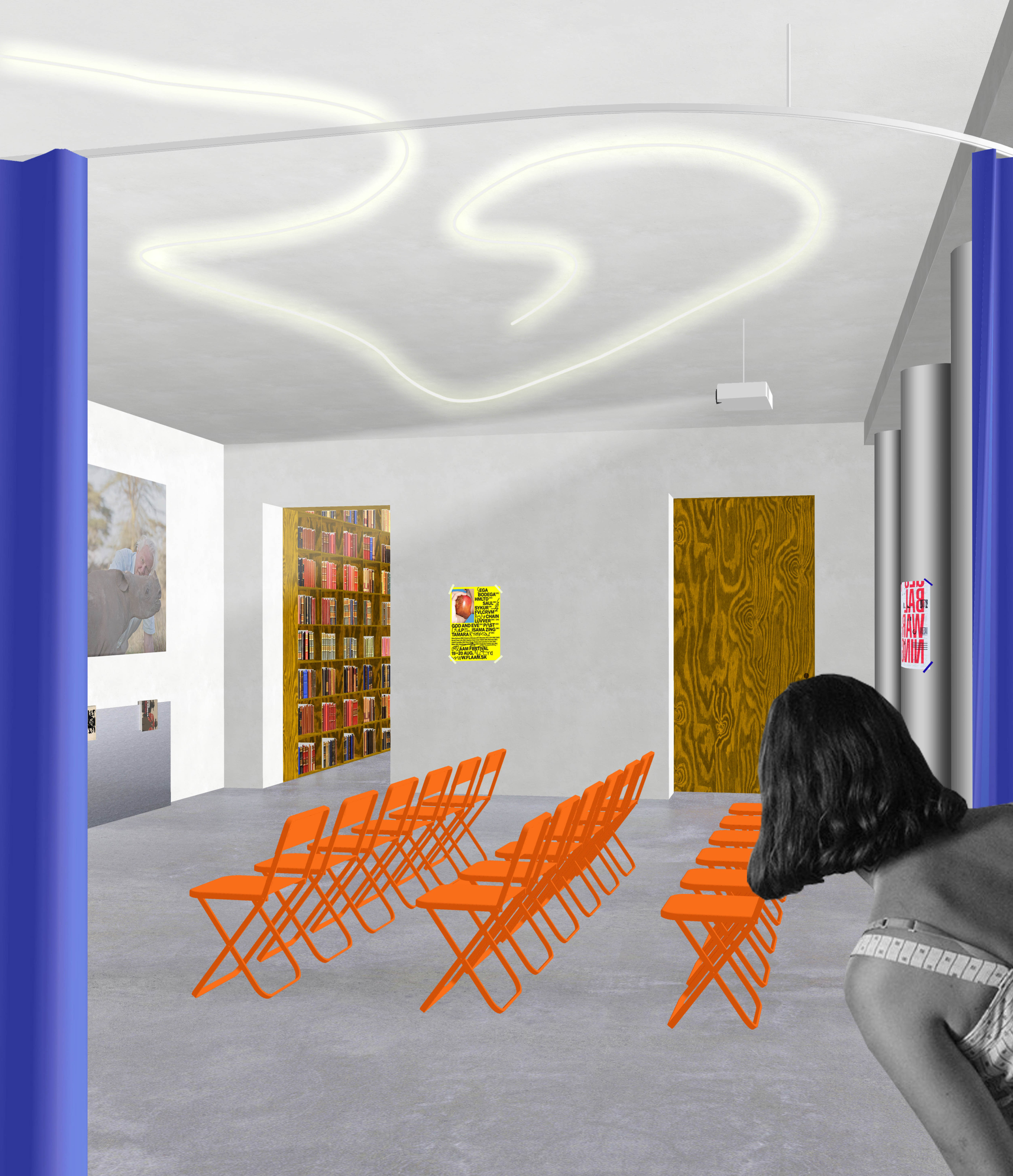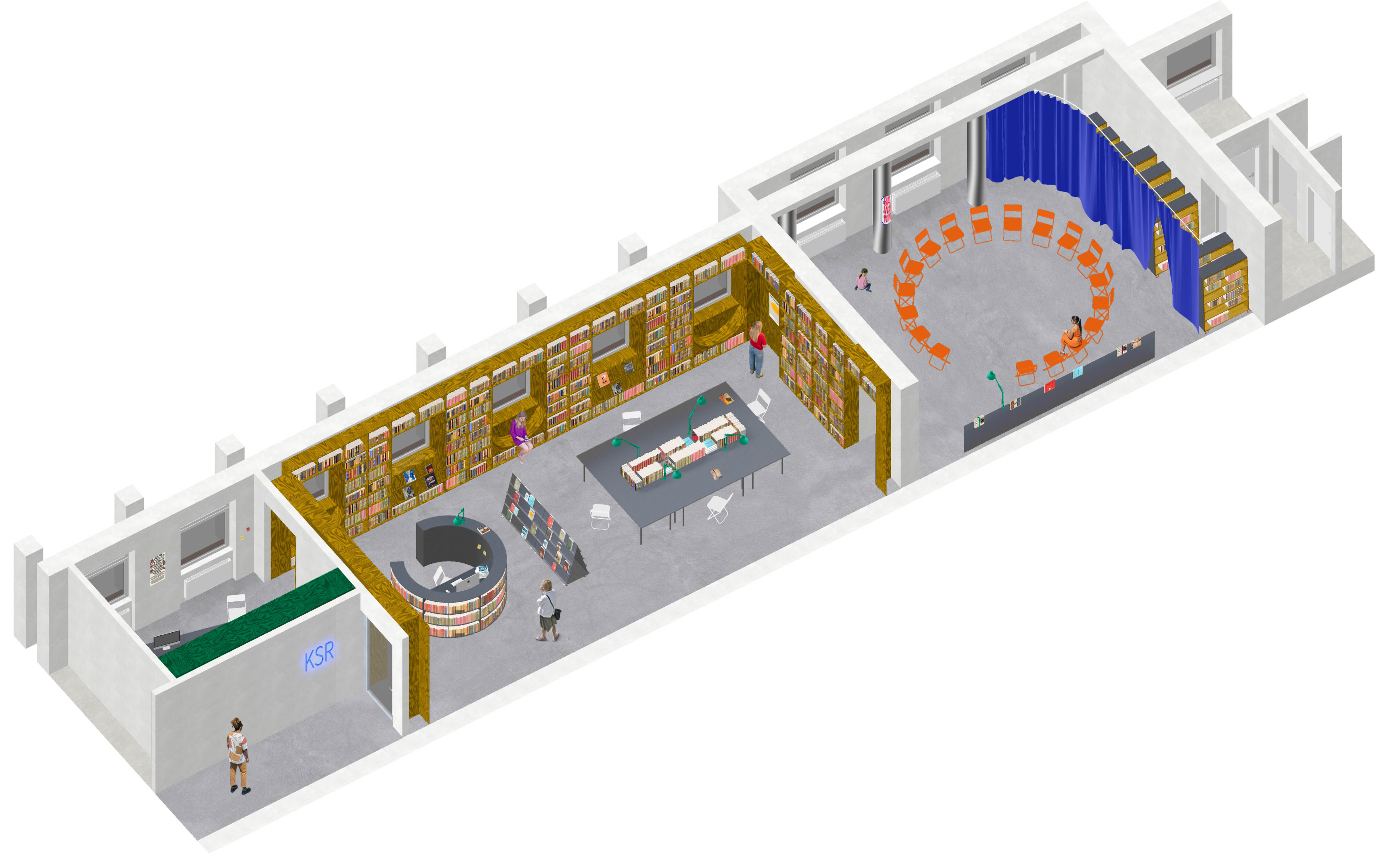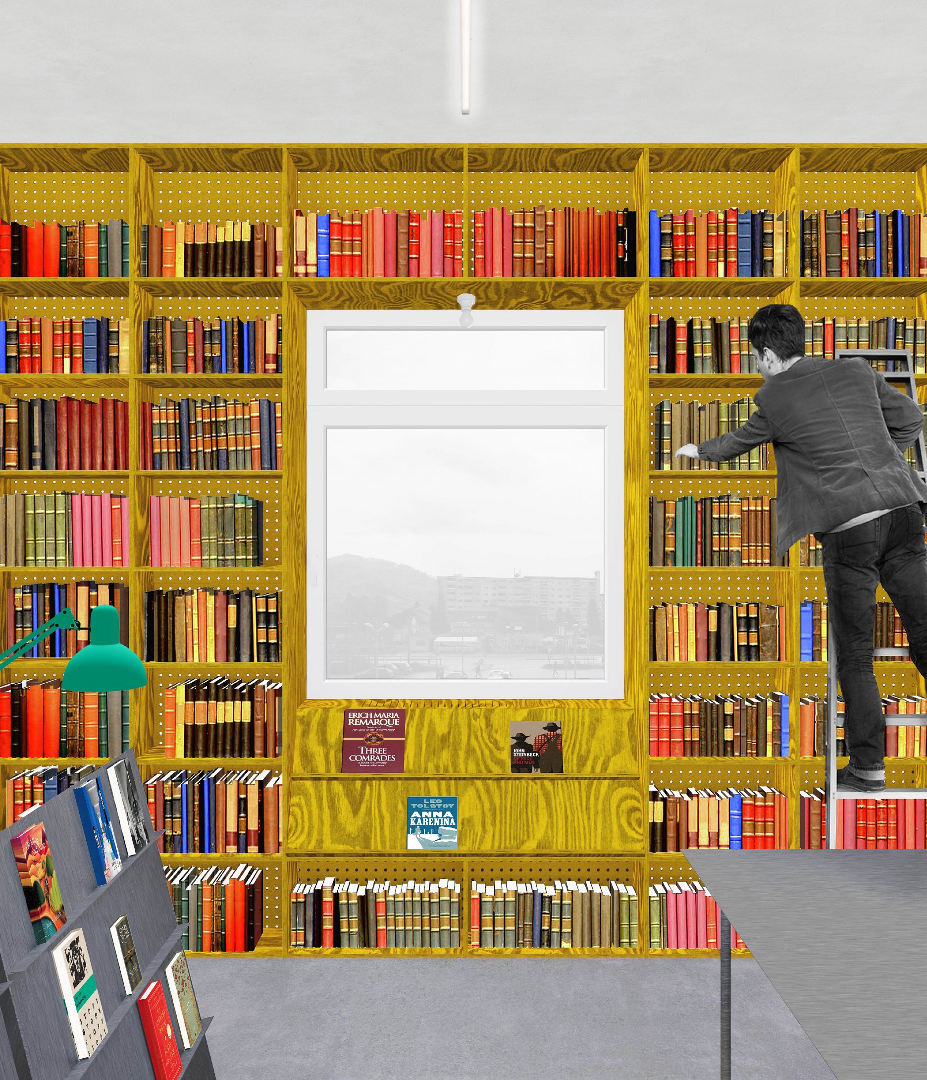Návrh vychádza z konceptu “Wunderkammer”. Pri zariaďovaní interiéru to znamená v čo najväčšej miere využiť pre vybavenie plochy stien, aby sa uvoľnil samotný priestor. Autor takto pristupuje k zariadeniu hlavnej miestnosti knižnice. Tá je po celom obvode lemovaná regálovým systémom, ktorý tvorí základnú prezentáciu kníh. Okolo okenných otvorov sú doplnené v regáloch miesta na sedenie. Centrálne sú umiestnené len výpožičný pult, nižšie regále a stolový systém. Porota odporúča prehodnotiť materialitu návrhu. Stavebná morená borovicová preglejka s výraznou kresbou vyzerá síce na kolážach príťažlivo, no v kontexte solídnej materiality samotnej stavby kultúrneho domu, pôsobí rozpačito. Zvolená materialita bude mať za následok aj redukciu prirodzeného osvetlenia. Otázna je aj nutnosť stavebného zásahu do nosnej konštrukcie objektu. Miestnosť venovaná pre aktivity knižnice je ponechaná skôr v pôvodnom charaktere a je doplnená solitérnymi prvkami, ktoré umožňujú jednoducho meniť jej usporiadanie. Pozitívne vnímaná je práca s pôvodnými knižnými regálmi v danej miestnosti, z ktorých sa stali mobilné police. Návrh ako jediný pracuje s odlišnosťou a individuálnym potenciálom jednotlivých miestností (kancelária, čitáreň, miestnosť pre aktivity) a používa daný prístup pre jasnejšie programové definovanie priestorov. Táto odlišnosť zároveň umožňuje v prípade potreby etapizáciu realizácie. Návrh bohužiaľ s existujúcim umeleckým dielom vôbec nepočíta.