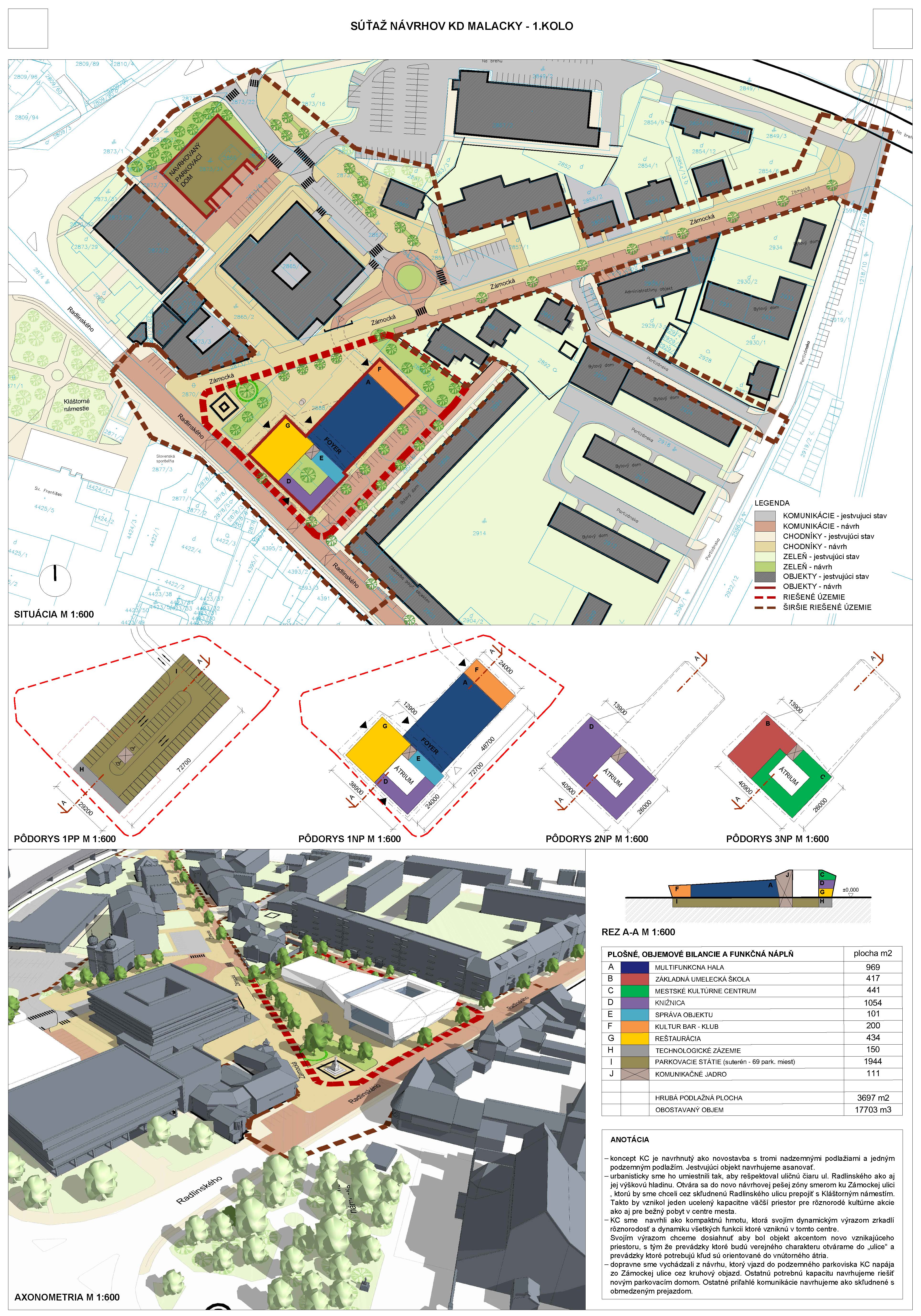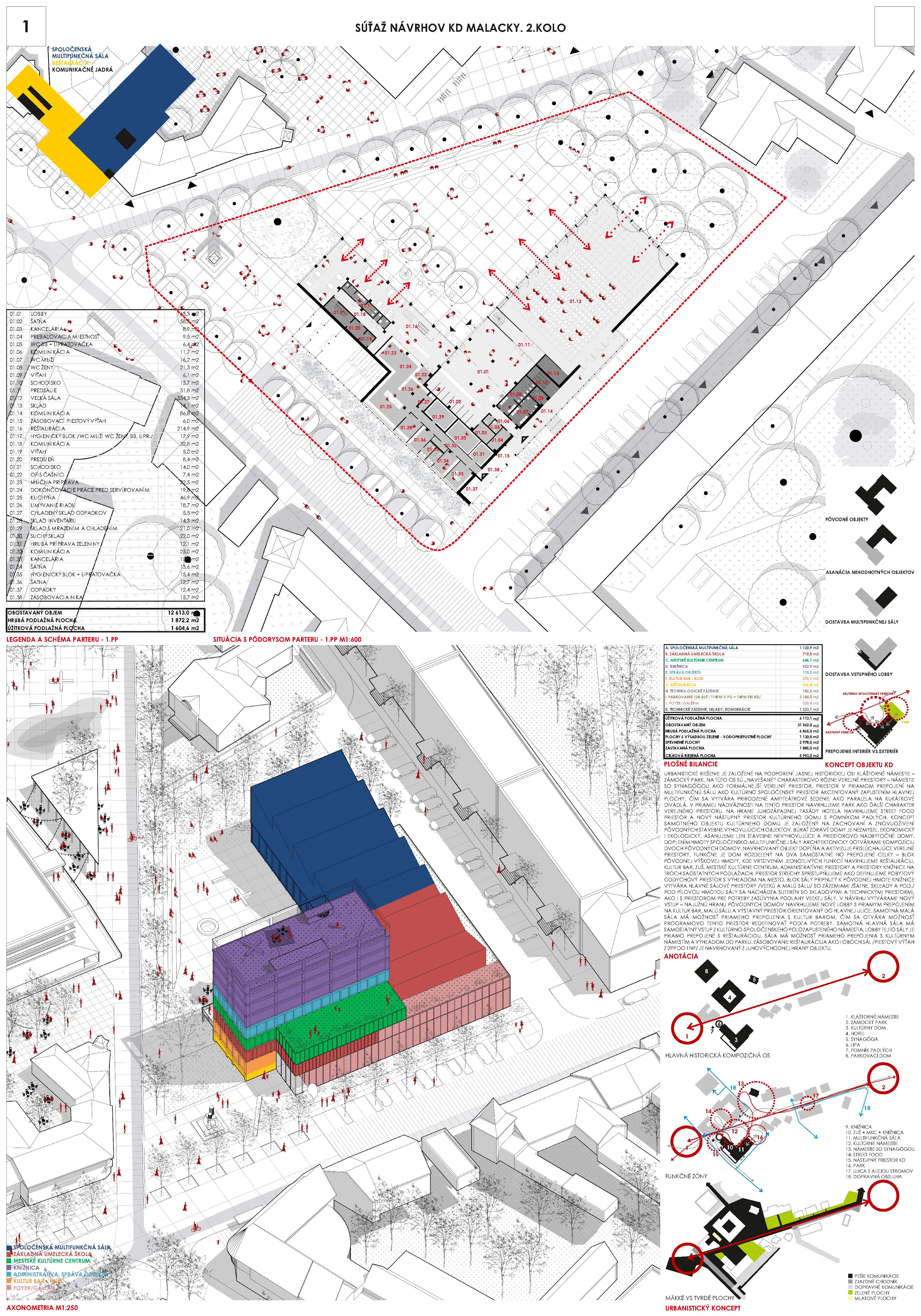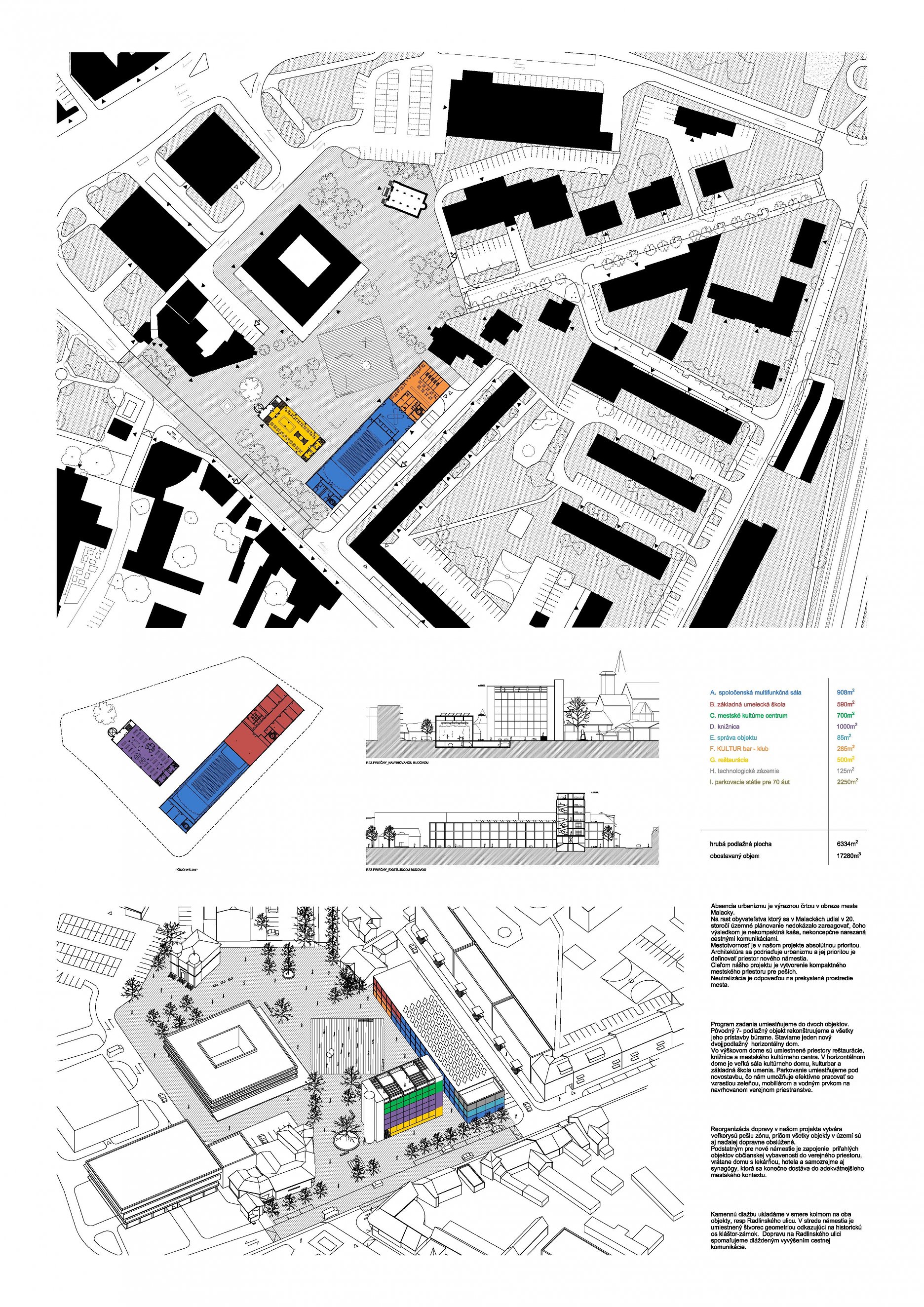 Návrh v porovnaní s prvým kolom figúru kultúrneho centra zjednodušil do pôdorysného tvaru písmena L –tak vzniká plocha nástupného plató ktorá sa orientuje na kompozičnú os zámockej ulice. Plató je artikulované znížením oproti nivelete Zámockej ulice. Zároveň sa znížením tejto nivelety dostane jestvujúce pozemné podlažie výškového domu zo severnej strany fasády na parter.