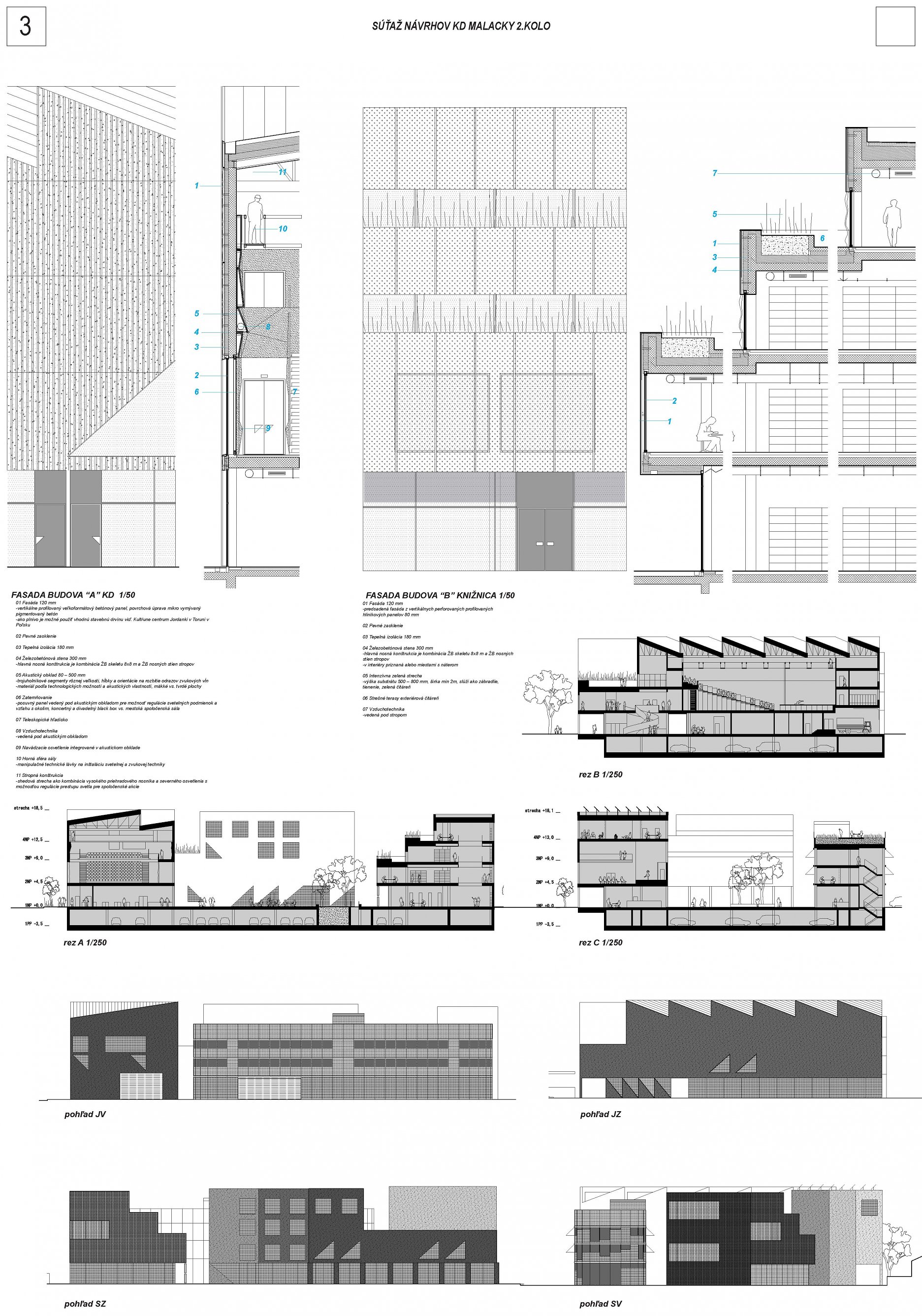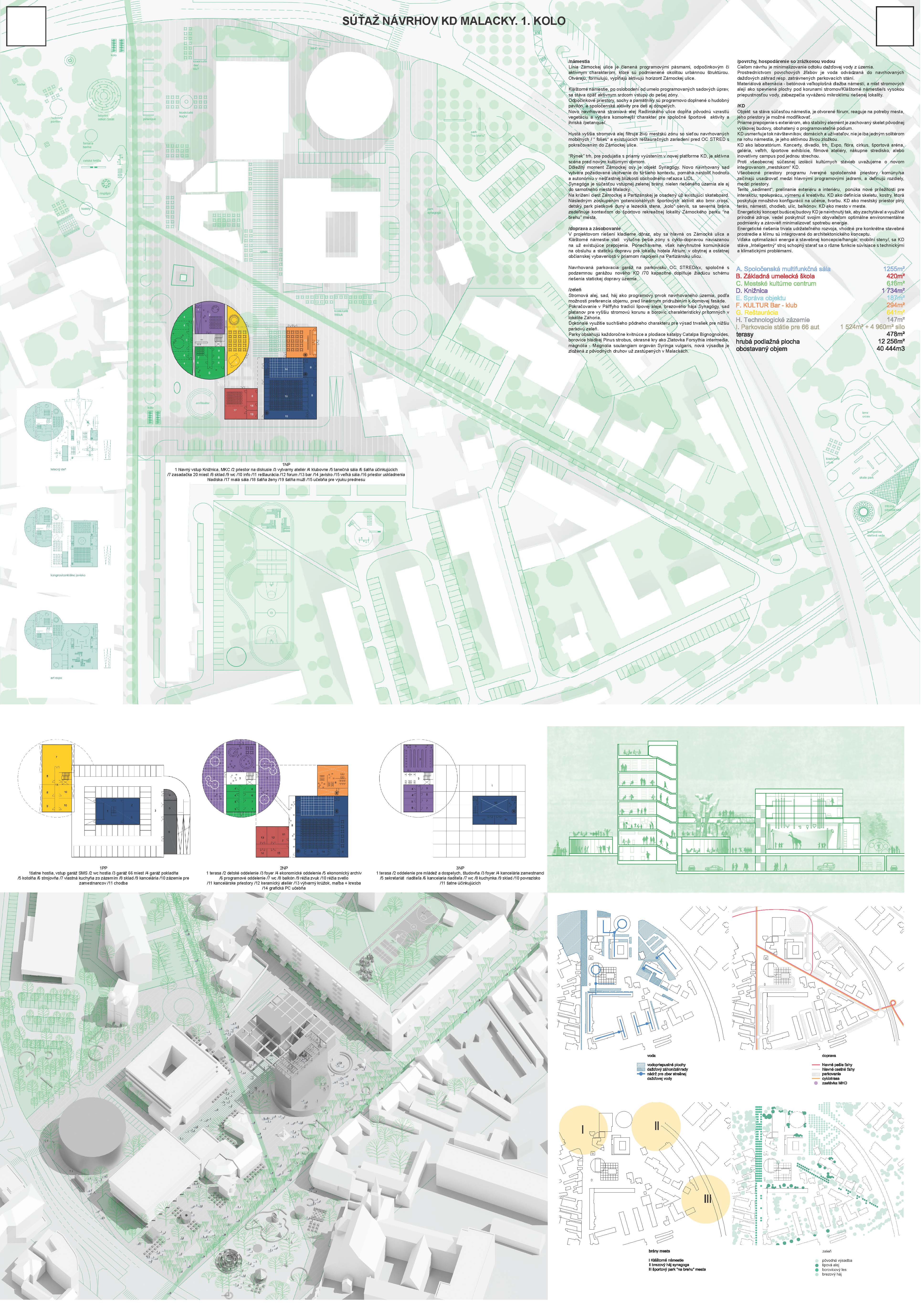 Ze soutěžního návrhu je patrný zřejmý důraz na sledovaný význam koncepčního urbanisticko-architektonického řešení úkolu a rovněž tak i provozního a dispozičního řešení jednotlivých budov. Prezentovaný charakter a vizuální podoba kulturního centra, ZUŠ i knihovny se však jeví jako velmi schematické, formální a zatím postrádající potřebný nosný názorový potenciál. Přestože je princip souboru individualizovaných solitérů sestavených do městského bloku jedním z klíčových východisek pro celý návrh, nepromítá se tento princip do charakterové individualizace budovy ZUŠ od vlastní budovy kulturního centra, což celkově silný koncept oslabuje a obě budovy zbytečně monumentalizuje. Porota proto doporučuje důslednou individualizaci charakteru jednotlivých budov a doporučuje volit charakter více instrumentální a méně monumentální.