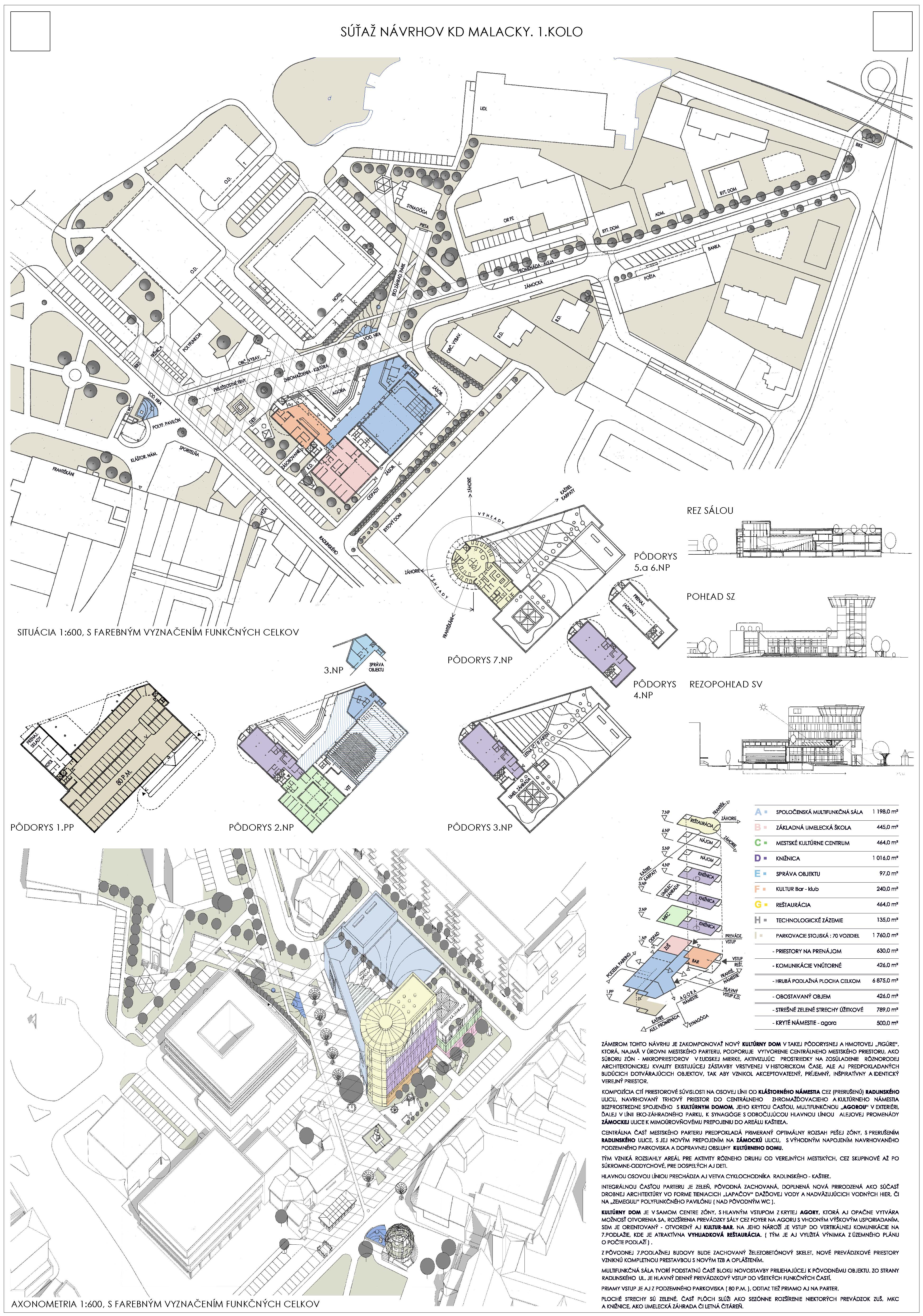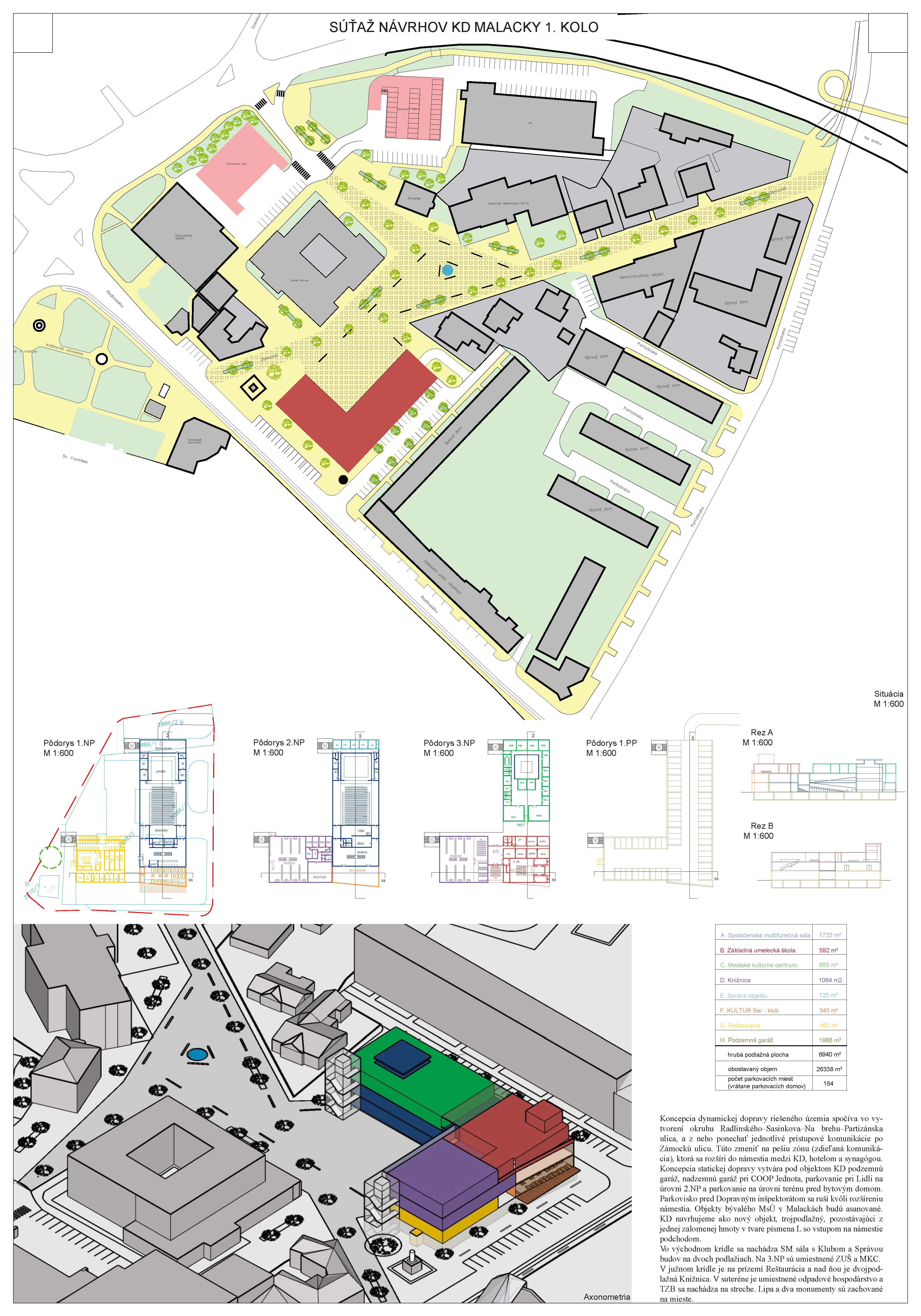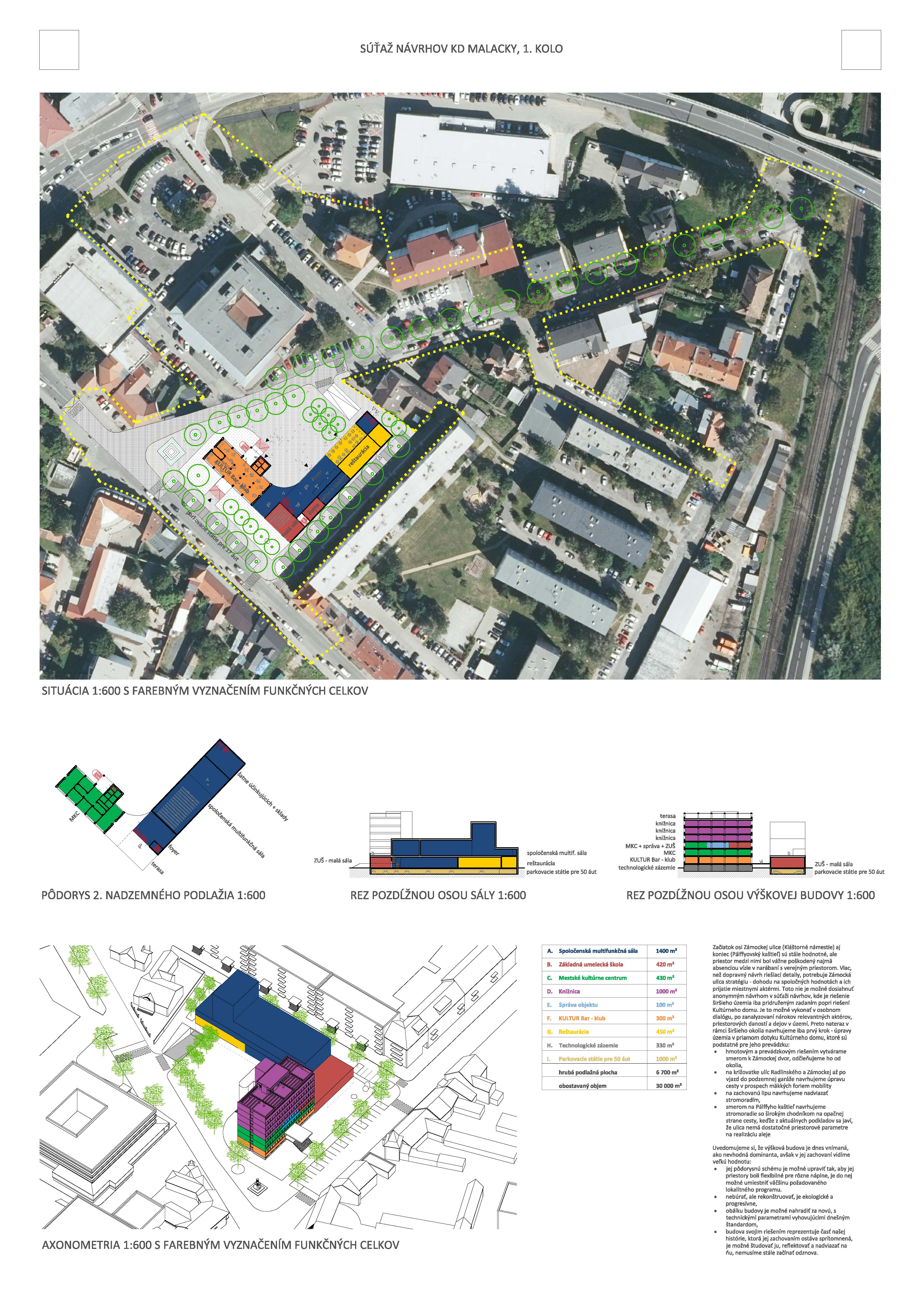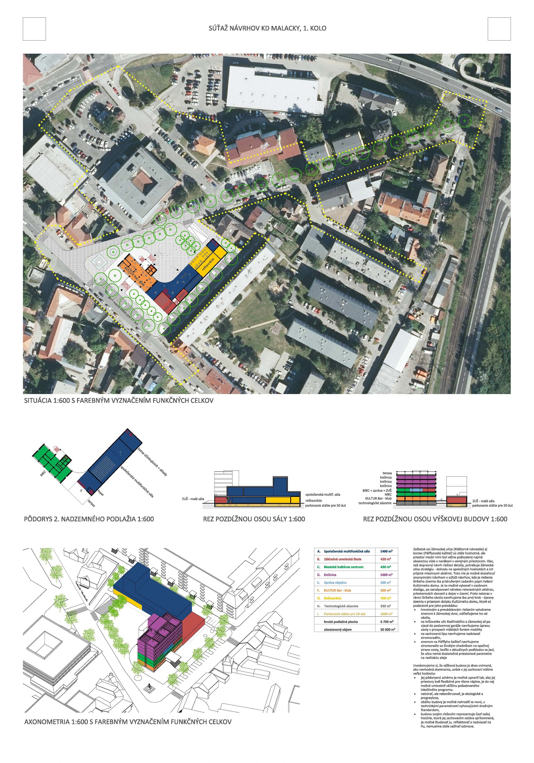 Návrh predstavuje formáciu dvoch objektov - prestavby existujúcej budovy bývalého Mestského úradu a novostavby kultúrneho domu. Je pragmatický, ekonomický a z pohľadu výstavby veľmi realistický. Súčasne deklaruje ambíciu byť ekologicky a kultúrne udržateľným. V súvislosti s tým porota oceňuje prejavenú zodpovednosť a odvahu zachovať predmetnú budovu napriek tomu, že súčasná verejná mienka je skôr za jej odstránenie. Veľmi pozitívne je hodnotené aj jednoznačné umiestnenie nového objektu kultúrneho domu pozdĺž bytového domu, čím dochádza k zamedzeniu potenciálne konfliktného vzťahu obytnej štruktúry s budúcim rušným verejným priestranstvom.