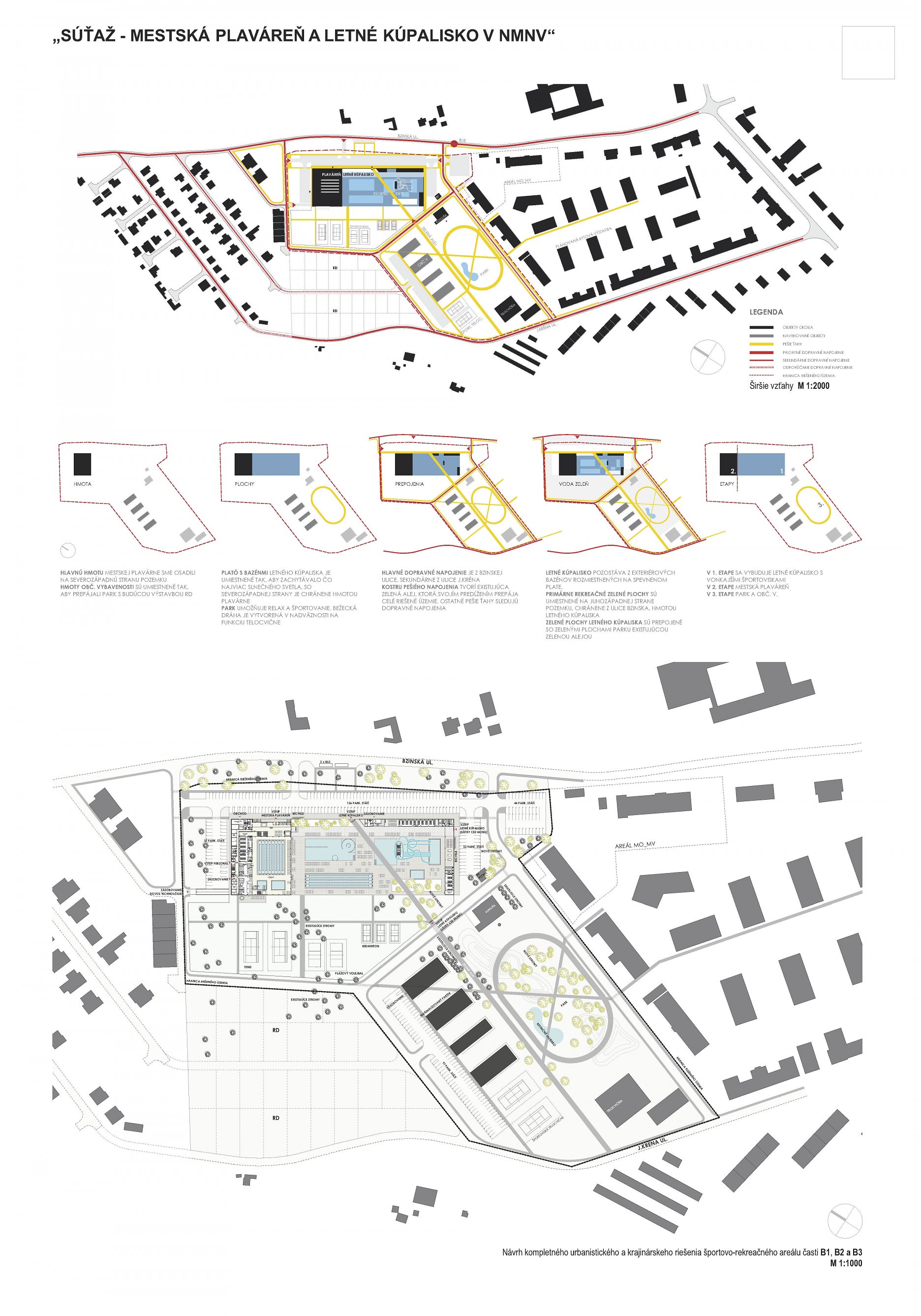 Víťazný návrh charakterizuje silný koncept jednoznačne čitateľný vo vznikajúcej urbanistickej štruktúre tejto časti mesta. Návrh najlepšie naplnil urbanistické, architektonické a krajinárske požiadavky vyplývajúce zo zadania v súťažných podmienkach vrátane väzieb na širšie okolie, ako aj požiadavky vyhlasovateľa na funkčno-priestorové a prevádzkové riešenie a efektivitu prevádzky. Umiestnenie stavieb, členenie areálu do funkčných zón a nadväzujúce dopravné riešenie je logické, prehľadné umožňujúce vzájomné prepojenie, interakciu, ako aj autonómnosť prevádzky jednotlivých funkčných celkov plavárne s kúpaliskom a verejného parku s vybavenosťou. Umne je riešené križovanie hlavného severo-južného pešieho ťahu a obslužnej komunikácie cez upokojenú dopravnú plochu. Kumulovanie zástavby do minimálneho počtu stavieb v primeranej mierke umožňuje dosiahnuť priestorovú a ekonomickú efektívnosť požadovanú vyhlasovateľom a ponecháva maximum prírodného a krajinársky upraveného prostredia v rámci revitalizácie riešeného areálu. Architektonické riešenie budov je striedme, tvaroslovné vyjadrovacie prostriedky sú volené v súlade s funkčnou náplňou budov tak, aby si dlhodobo udržali nadčasový charakter. Kapacity a vybavenie vnútorných aj vonkajších bazénov sú navrhnuté optimálne, v súlade s požiadavkami vyhlasovateľa. Silnou stránkou návrhu sú jeho environmentálne parametre, ako v krajinárskej koncepcii, tak i z hľadiska vodozádržných opatrení, využívaní alternatívnych zdrojov energie, energetickej úspornosti vrátane systému tienenia bazénovej haly na línii vonkajšej ochodze a i. Návrh je realizovateľný ako celok, ako aj po etapách s čiastočnou prevádzkou.