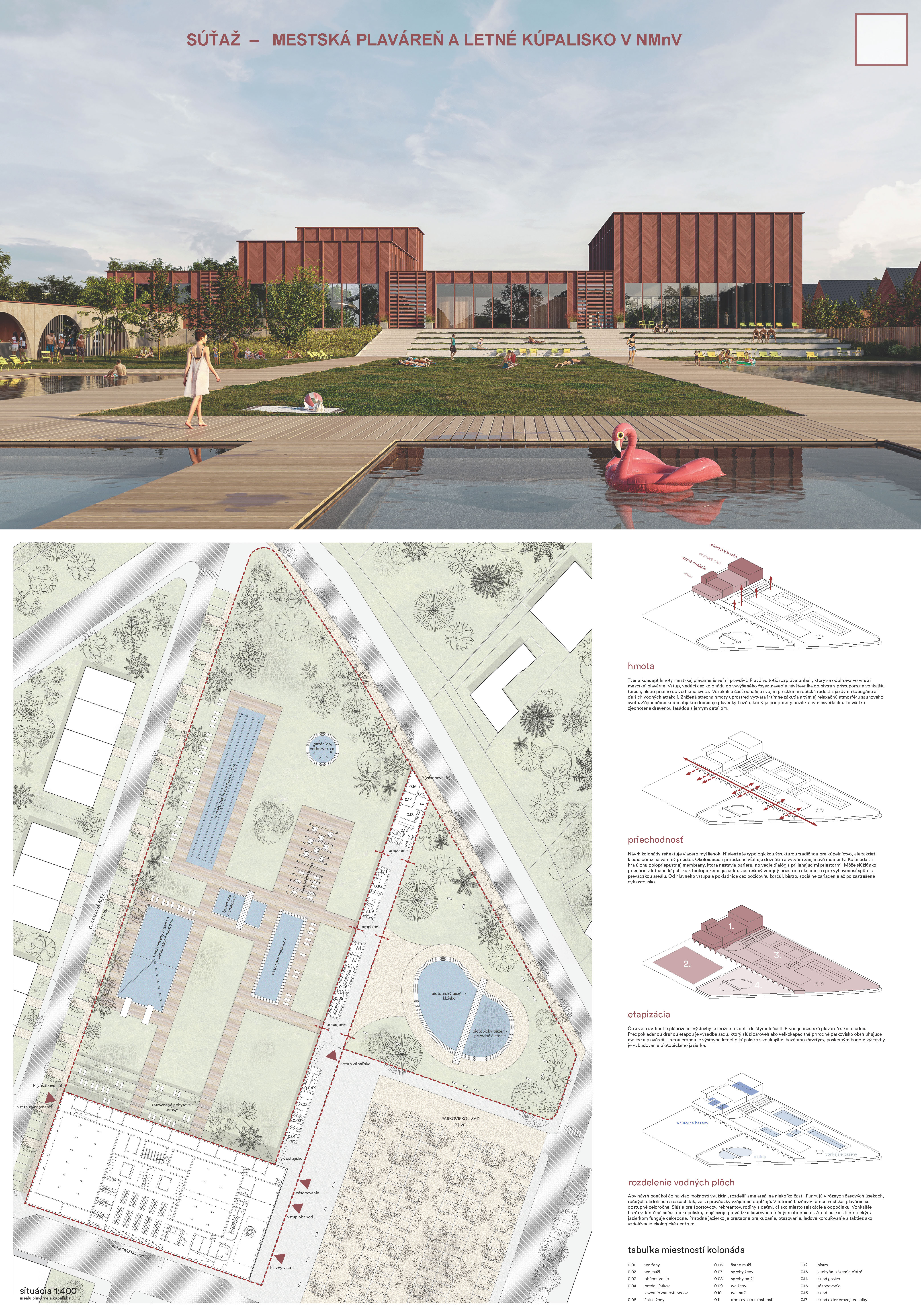 Urbanistické riešene v kontexte okolitej zástavby a orientácia letnej plavárne smerom na západ k obytnej zóne sa nejavia v tomto návrhu ako ideálne.