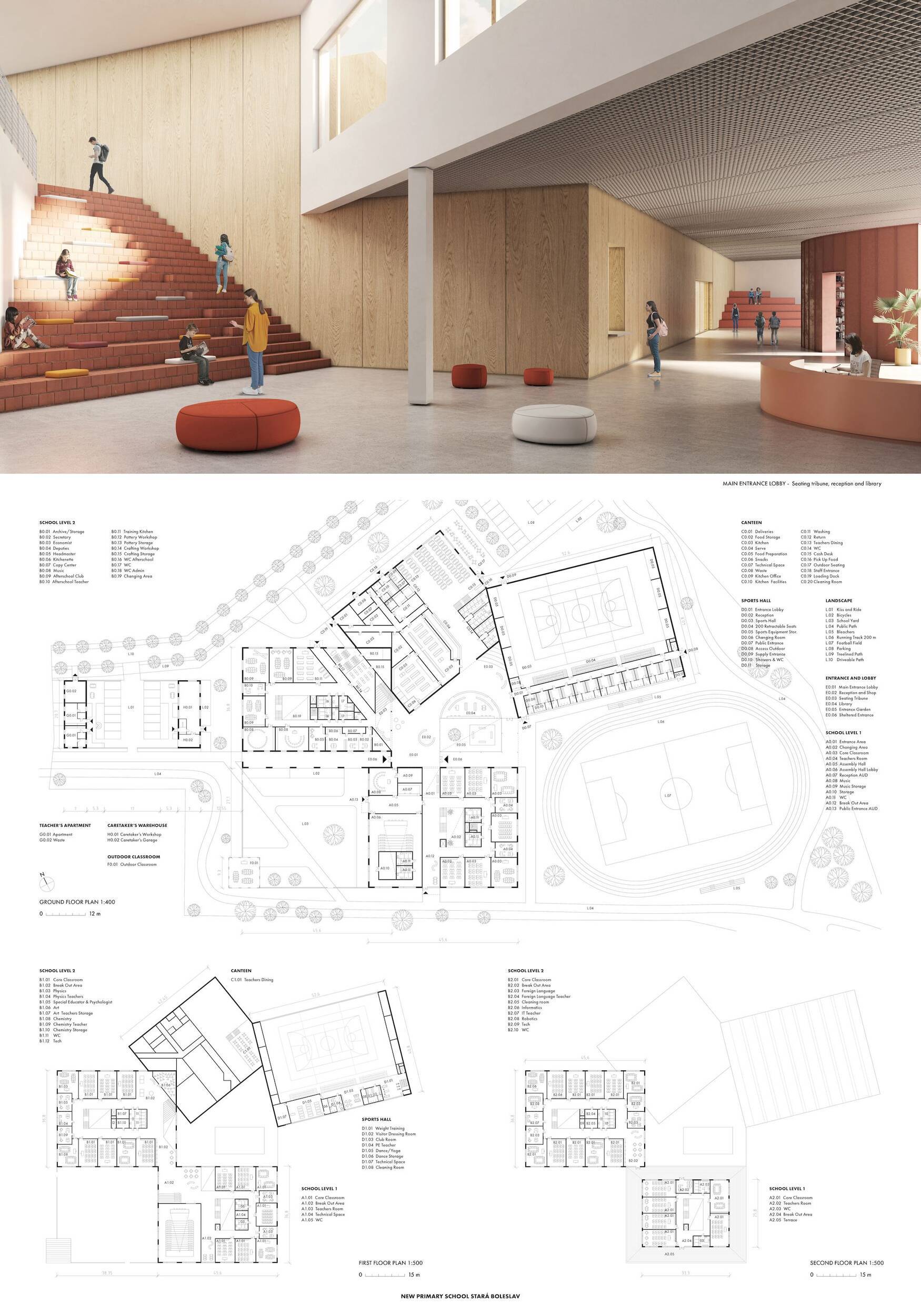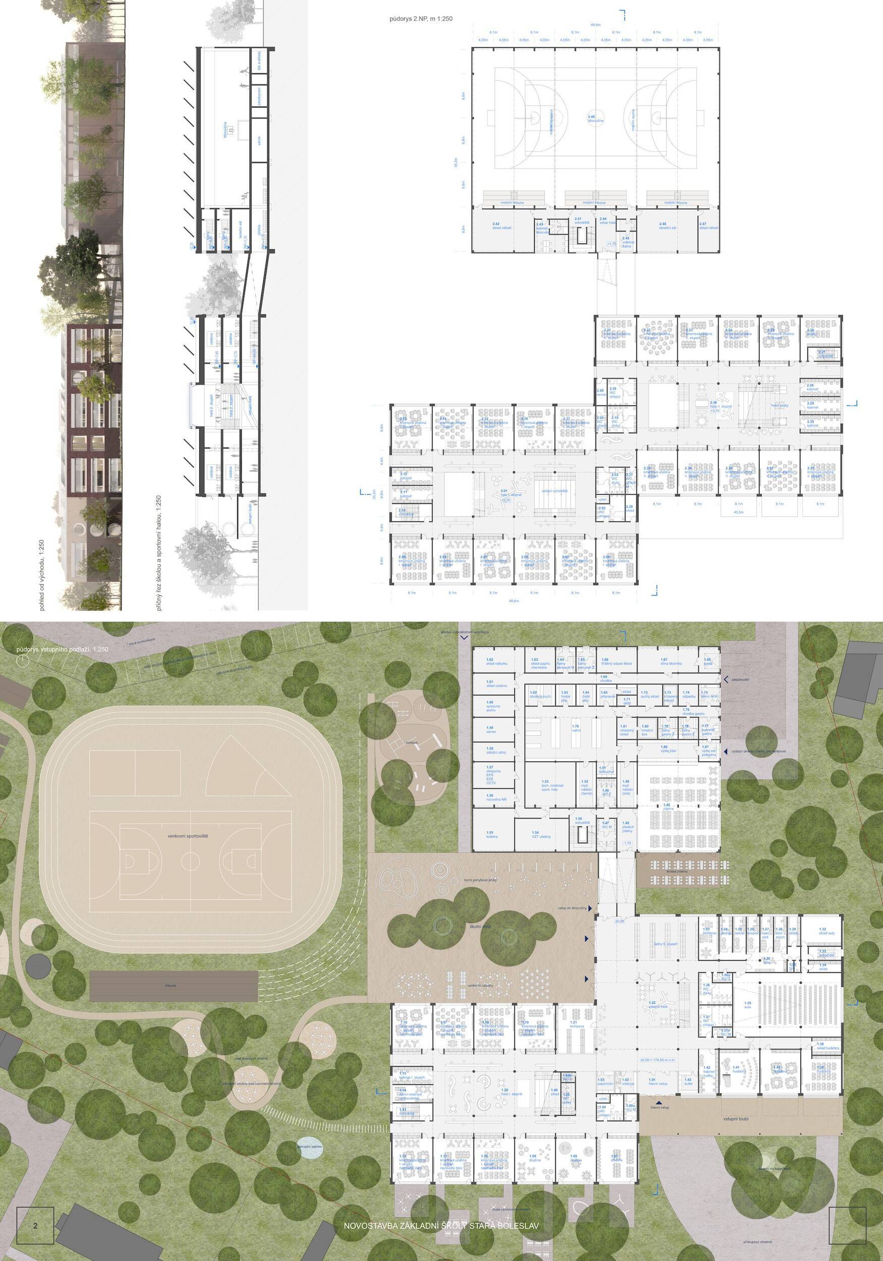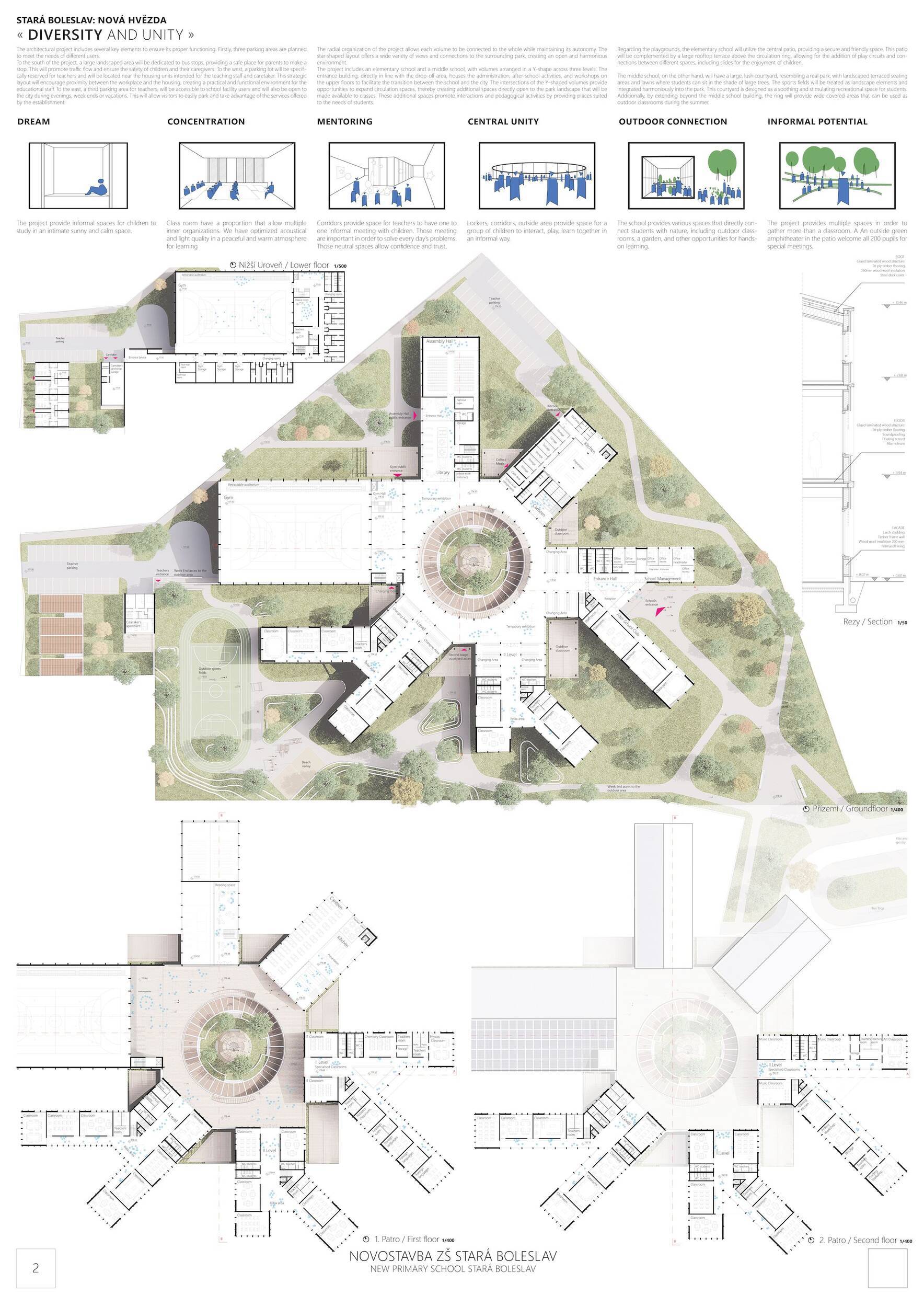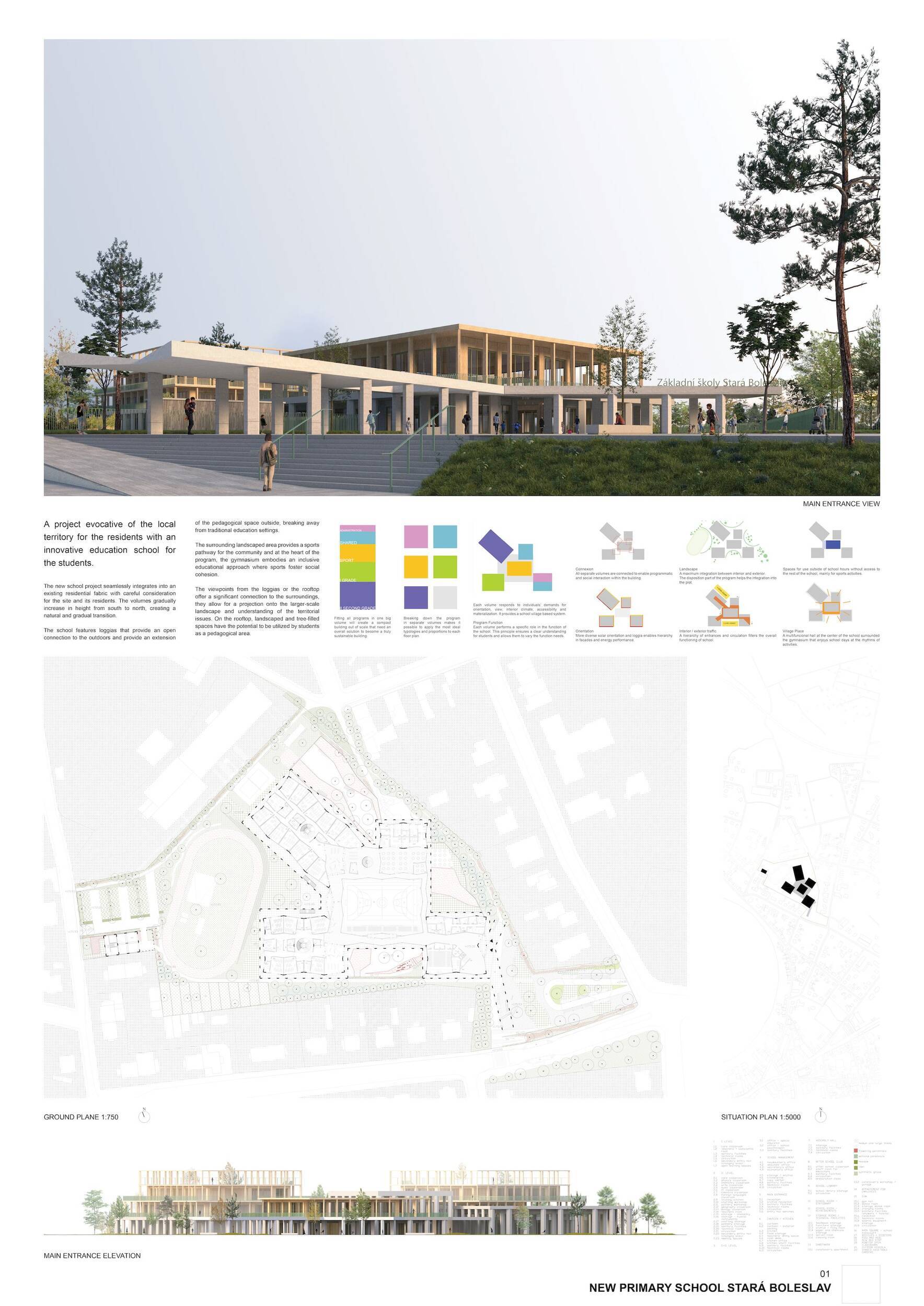 Architektonické uspořádání, které porota vysoce oceňuje, vyniká díky svému začlenění do okolního prostředí. Koncept budovy je založen na opakujících se skupinách, které propojují jihovýchodní a severozápadní rohy parcely - přístupové body - prostřednictvím elegantně zakřivené diagonály. Přízemí bylo navrženo tak, aby zajistilo průchodnost do sportovního areálu na severu a chráněný venkovní prostor. Díky své orientaci a umístění na pozemku sportovní hala organicky zapadá do celkové koncepce. V přízemí se nachází společenské prostory pro komunitní využití, zatímco v prvním a druhém patře jsou sice funkčně odděleny stupně základní školy, ale navzájem jsou minimálně vizuálně propojeny atrii. Tento koncept organizace se promítá také do klastrů, kde jsou třídy otevřeně orientovány směrem k venkovnímu prostoru, což umožňuje spontánní využití prostoru v souladu s konkrétními výukovými potřebami. Dle názoru poroty se jedná o výjimečně myšlenkově i koncepčně kompaktní projekt, který si zaslouží budoucí péči při svém dopracování a úpravách a který se pak může podařit proměnit ve školu, kterou budou mít její žáci i pedagogičtí pracovníci a zaměstnanci školy rádi. Podstatné je tento projekt dále rozvíjet ve spolupráci s budoucími uživateli a přitom zachovávat jeho klíčové přednosti. Jedněmi z cílů jsou redukce vnitřních cest, přímá dostupnost tělocvičny pro všechny třídy, nebo udržení otevřeného prostoru v přízemí čí revize zásobování a dostatečného osvětlení kuchyně.