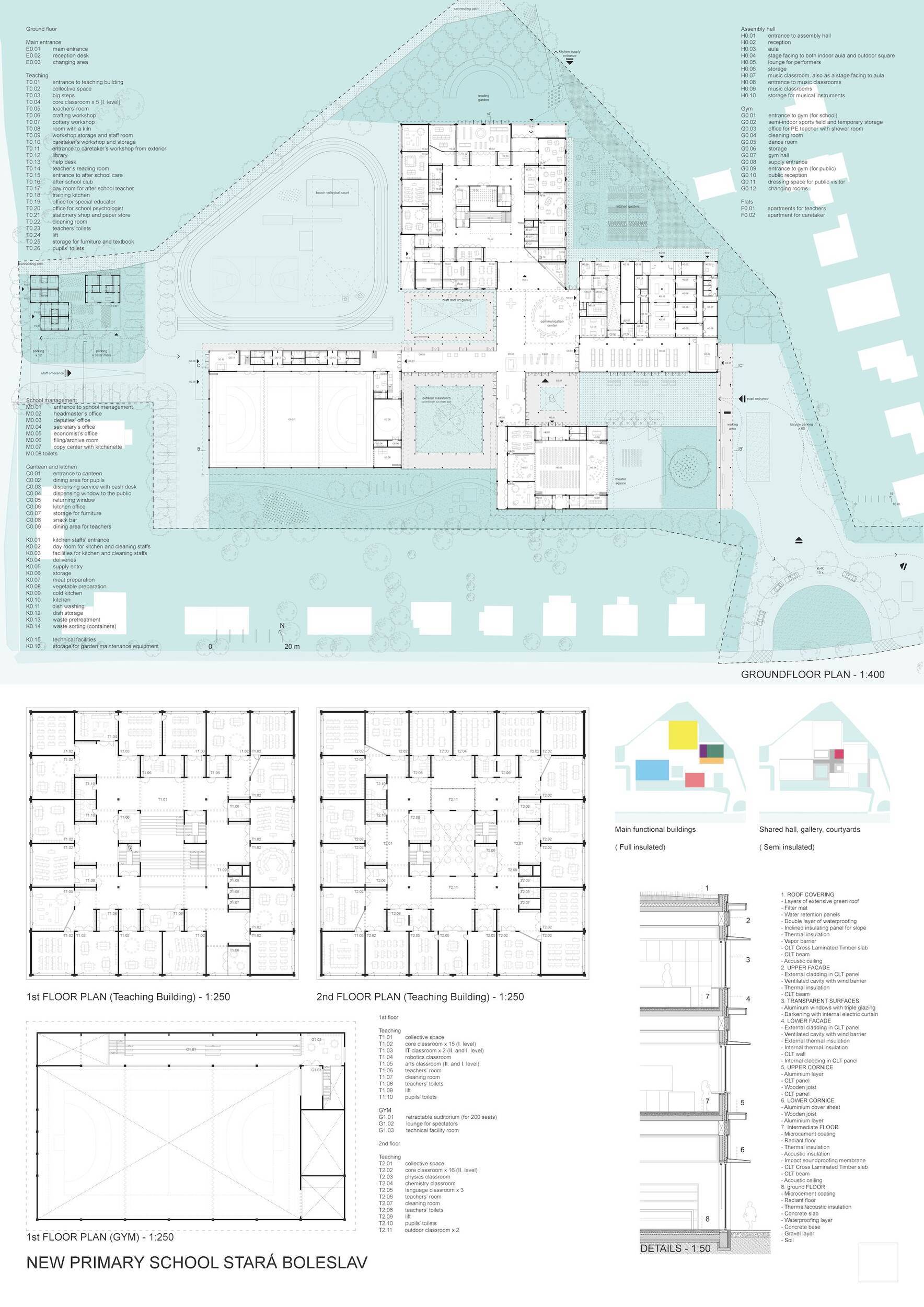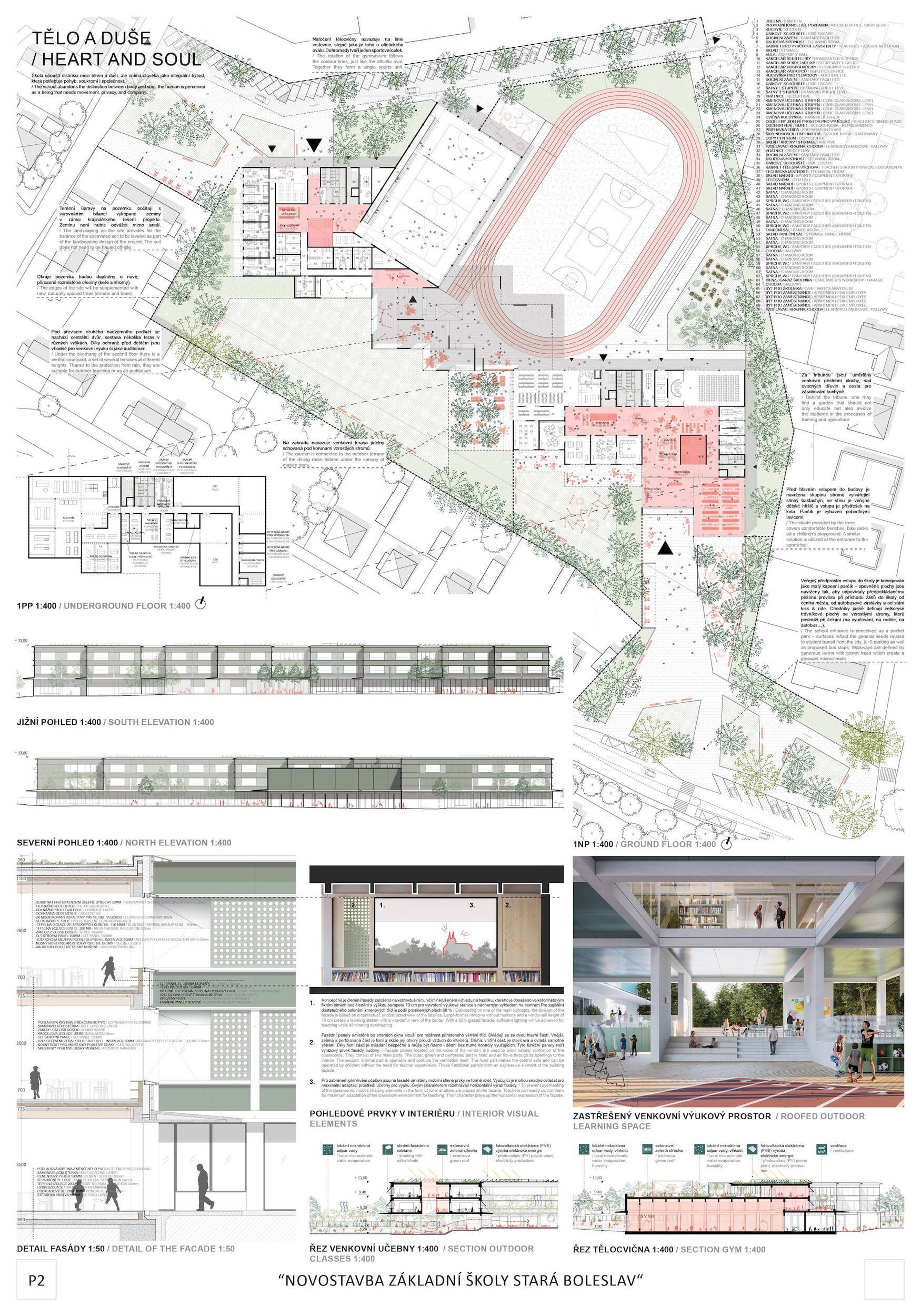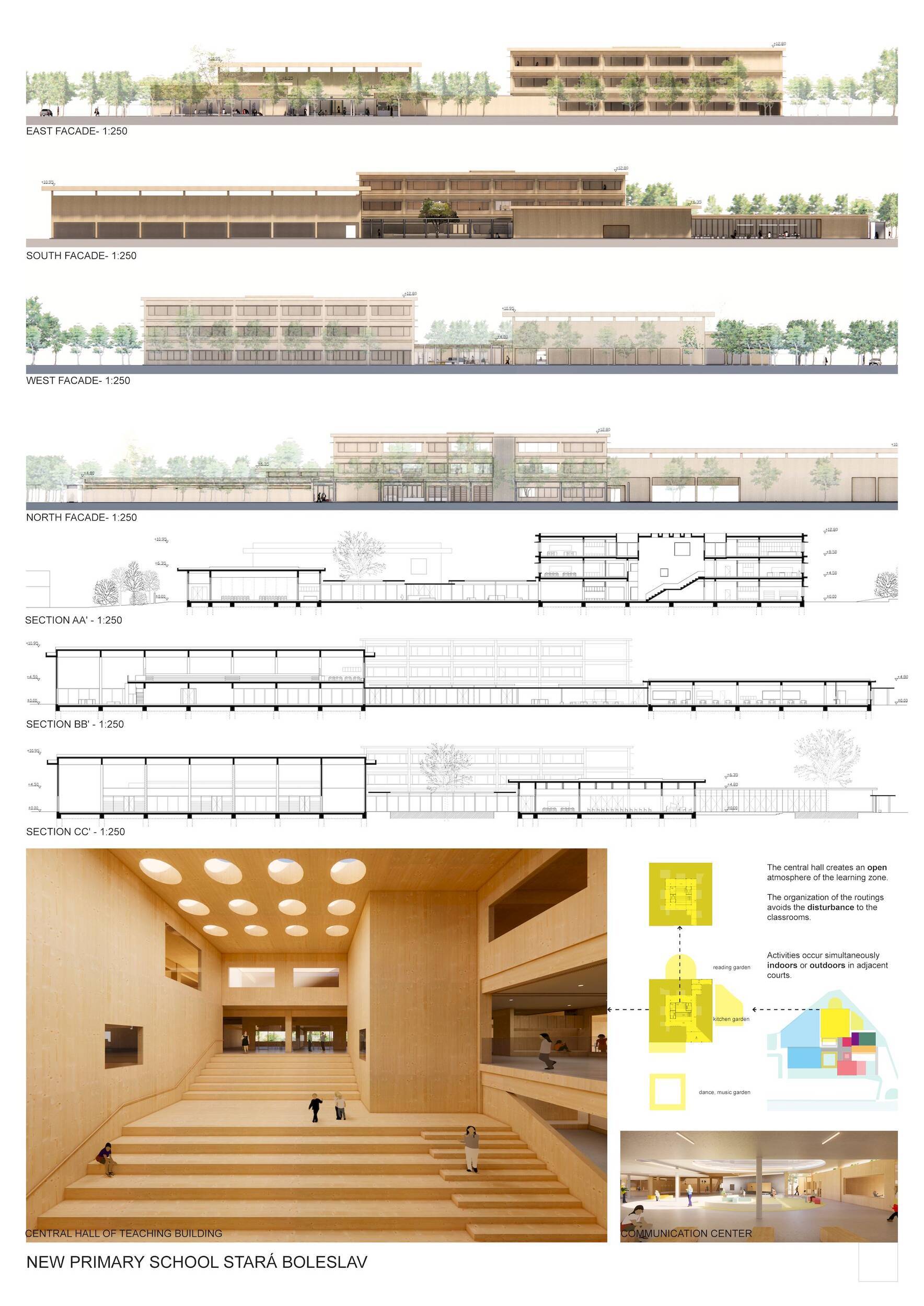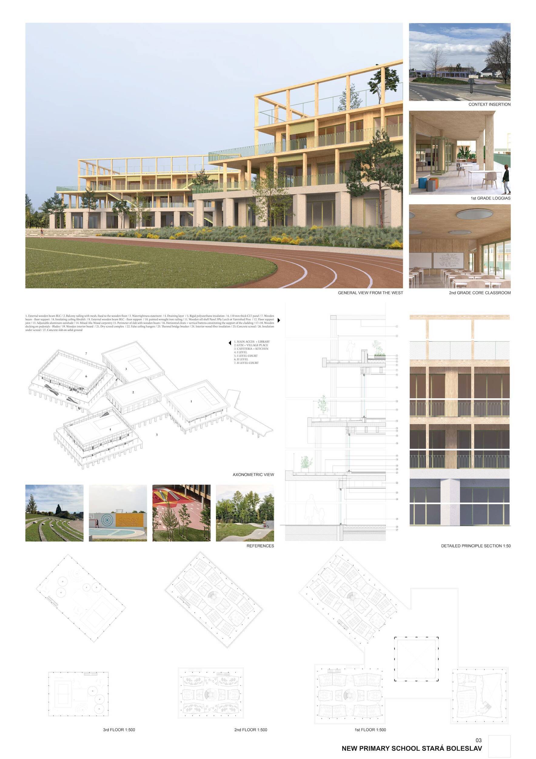 Architektonické uspořádání, které porota vysoce oceňuje, vyniká díky svému začlenění do okolního prostředí. Koncept budovy je založen na opakujících se skupinách, které propojují jihovýchodní a severozápadní rohy parcely - přístupové body - prostřednictvím elegantně zakřivené diagonály. Přízemí bylo navrženo tak, aby zajistilo průchodnost do sportovního areálu na severu a chráněný venkovní prostor. Díky své orientaci a umístění na pozemku sportovní hala organicky zapadá do celkové koncepce. V přízemí se nachází společenské prostory pro komunitní využití, zatímco v prvním a druhém patře jsou sice funkčně odděleny stupně základní školy, ale navzájem jsou minimálně vizuálně propojeny atrii. Tento koncept organizace se promítá také do klastrů, kde jsou třídy otevřeně orientovány směrem k venkovnímu prostoru, což umožňuje spontánní využití prostoru v souladu s konkrétními výukovými potřebami. Dle názoru poroty se jedná o výjimečně myšlenkově i koncepčně kompaktní projekt, který si zaslouží budoucí péči při svém dopracování a úpravách a který se pak může podařit proměnit ve školu, kterou budou mít její žáci i pedagogičtí pracovníci a zaměstnanci školy rádi. Podstatné je tento projekt dále rozvíjet ve spolupráci s budoucími uživateli a přitom zachovávat jeho klíčové přednosti. Jedněmi z cílů jsou redukce vnitřních cest, přímá dostupnost tělocvičny pro všechny třídy, nebo udržení otevřeného prostoru v přízemí čí revize zásobování a dostatečného osvětlení kuchyně.