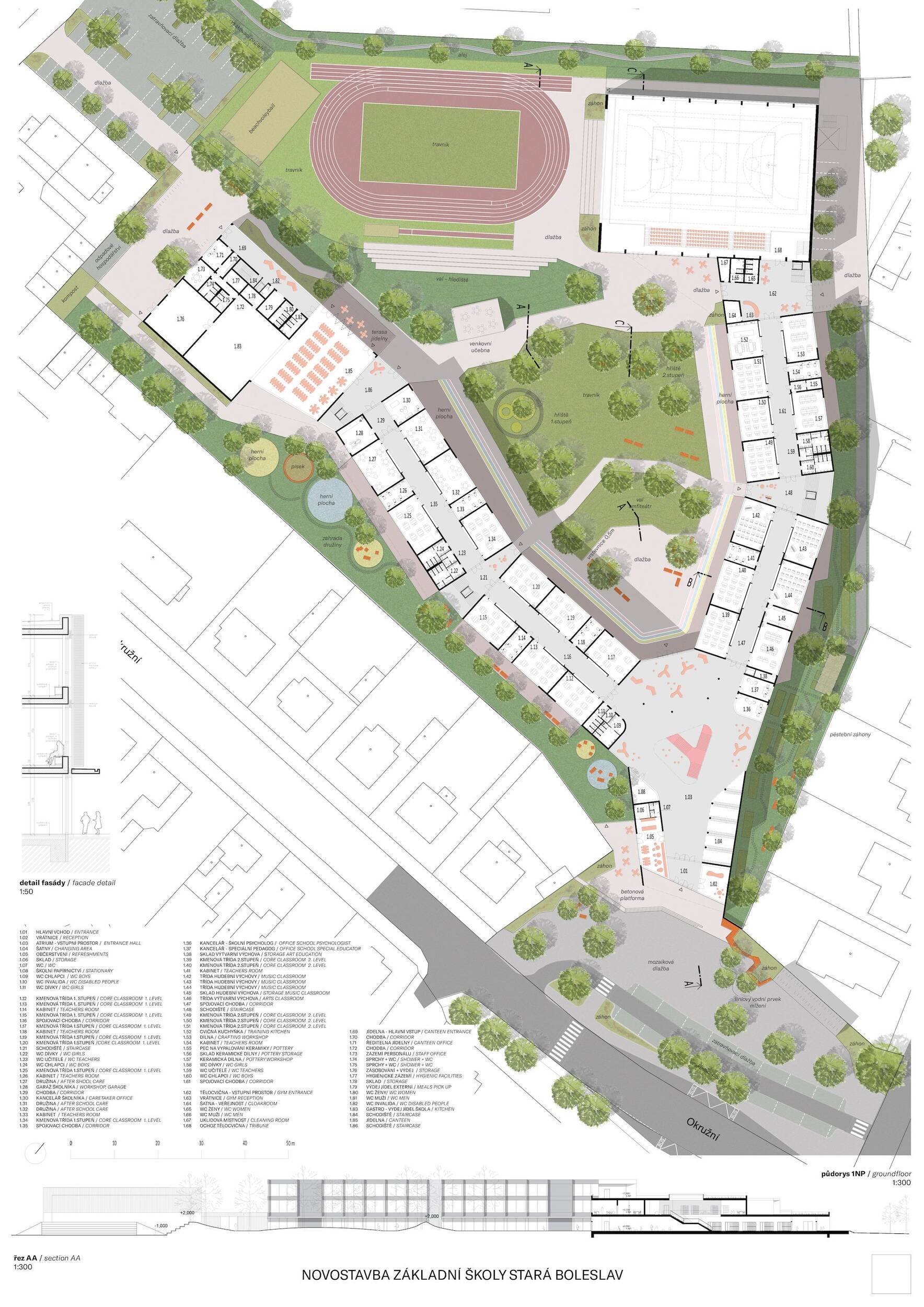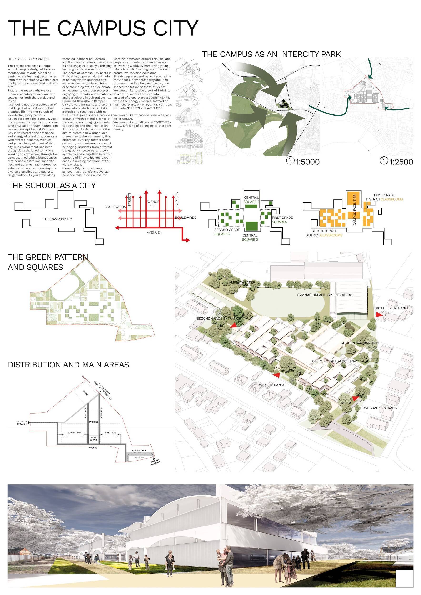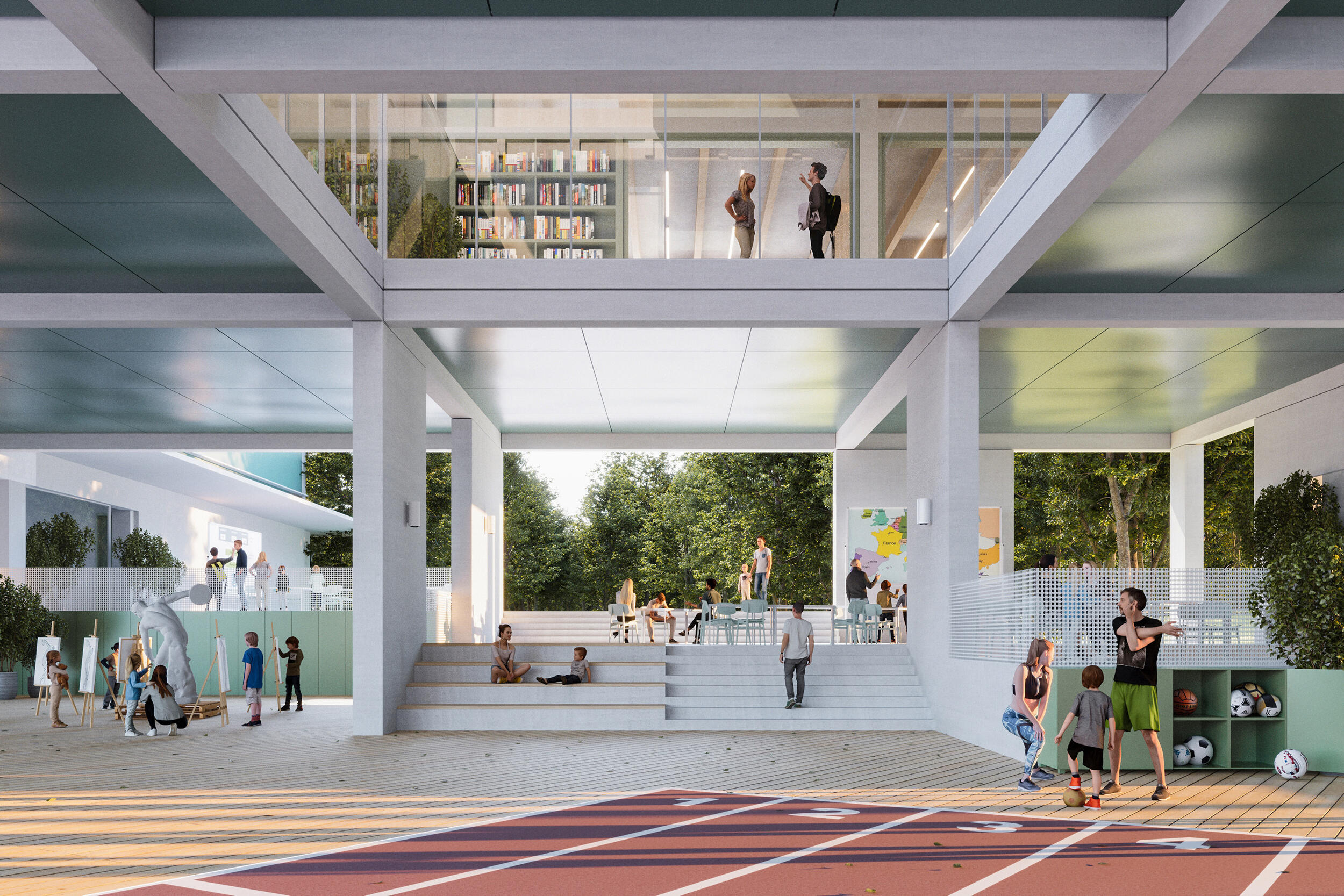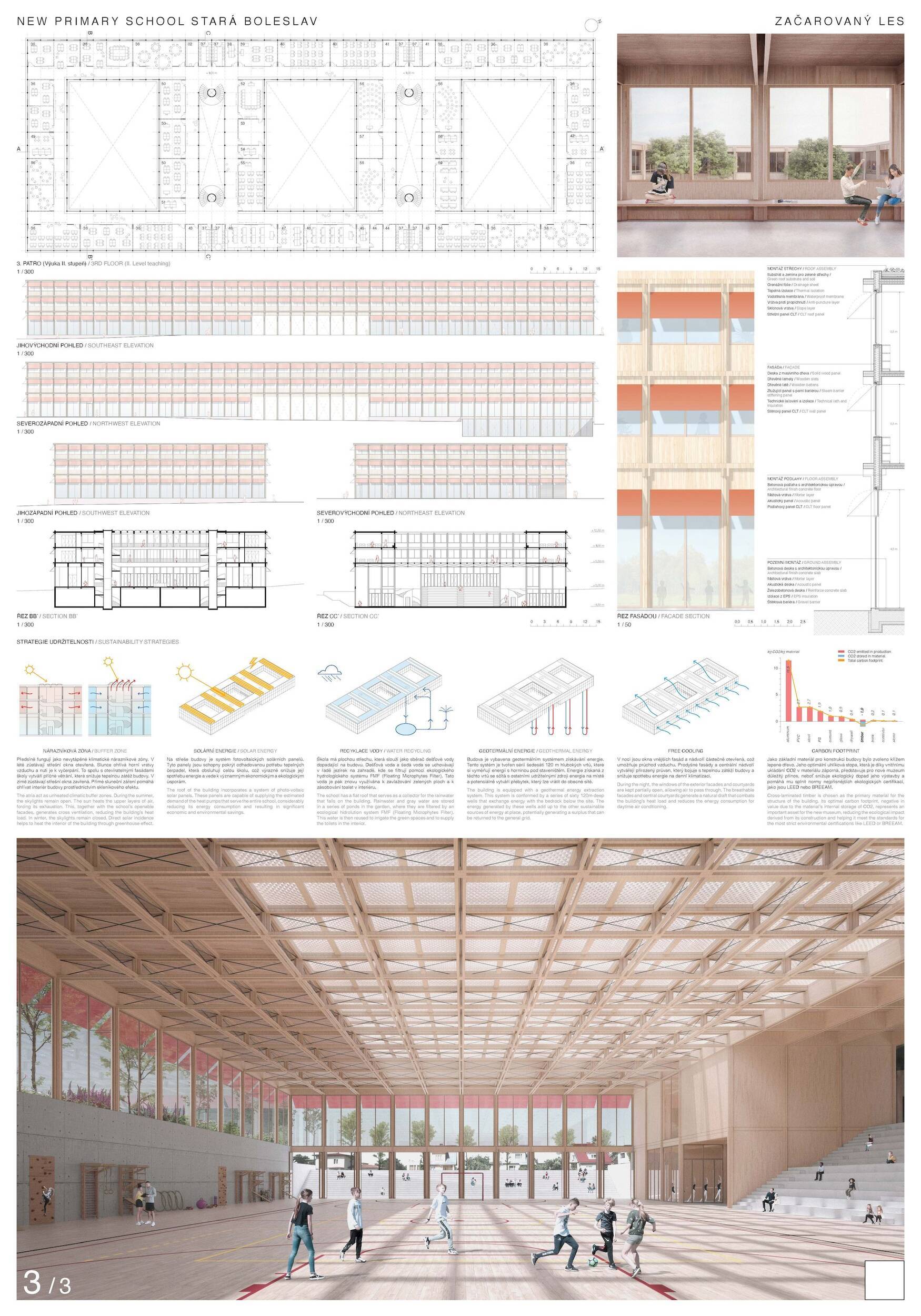 Architektonické uspořádání, které porota vysoce oceňuje, vyniká díky svému začlenění do okolního prostředí. Koncept budovy je založen na opakujících se skupinách, které propojují jihovýchodní a severozápadní rohy parcely - přístupové body - prostřednictvím elegantně zakřivené diagonály. Přízemí bylo navrženo tak, aby zajistilo průchodnost do sportovního areálu na severu a chráněný venkovní prostor. Díky své orientaci a umístění na pozemku sportovní hala organicky zapadá do celkové koncepce. V přízemí se nachází společenské prostory pro komunitní využití, zatímco v prvním a druhém patře jsou sice funkčně odděleny stupně základní školy, ale navzájem jsou minimálně vizuálně propojeny atrii. Tento koncept organizace se promítá také do klastrů, kde jsou třídy otevřeně orientovány směrem k venkovnímu prostoru, což umožňuje spontánní využití prostoru v souladu s konkrétními výukovými potřebami. Dle názoru poroty se jedná o výjimečně myšlenkově i koncepčně kompaktní projekt, který si zaslouží budoucí péči při svém dopracování a úpravách a který se pak může podařit proměnit ve školu, kterou budou mít její žáci i pedagogičtí pracovníci a zaměstnanci školy rádi. Podstatné je tento projekt dále rozvíjet ve spolupráci s budoucími uživateli a přitom zachovávat jeho klíčové přednosti. Jedněmi z cílů jsou redukce vnitřních cest, přímá dostupnost tělocvičny pro všechny třídy, nebo udržení otevřeného prostoru v přízemí čí revize zásobování a dostatečného osvětlení kuchyně.