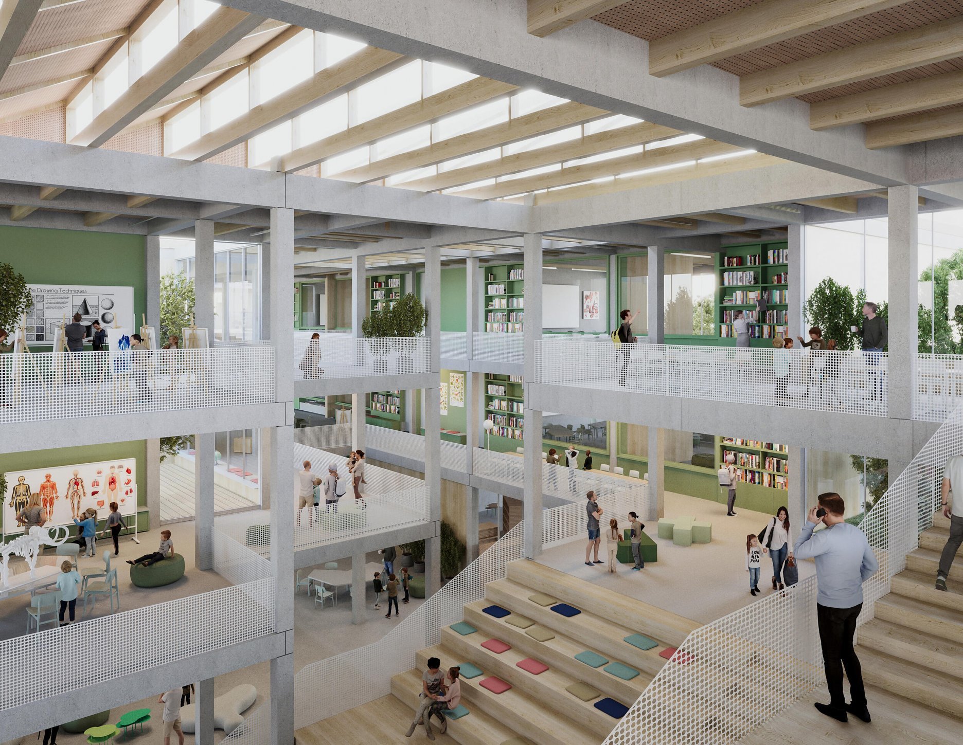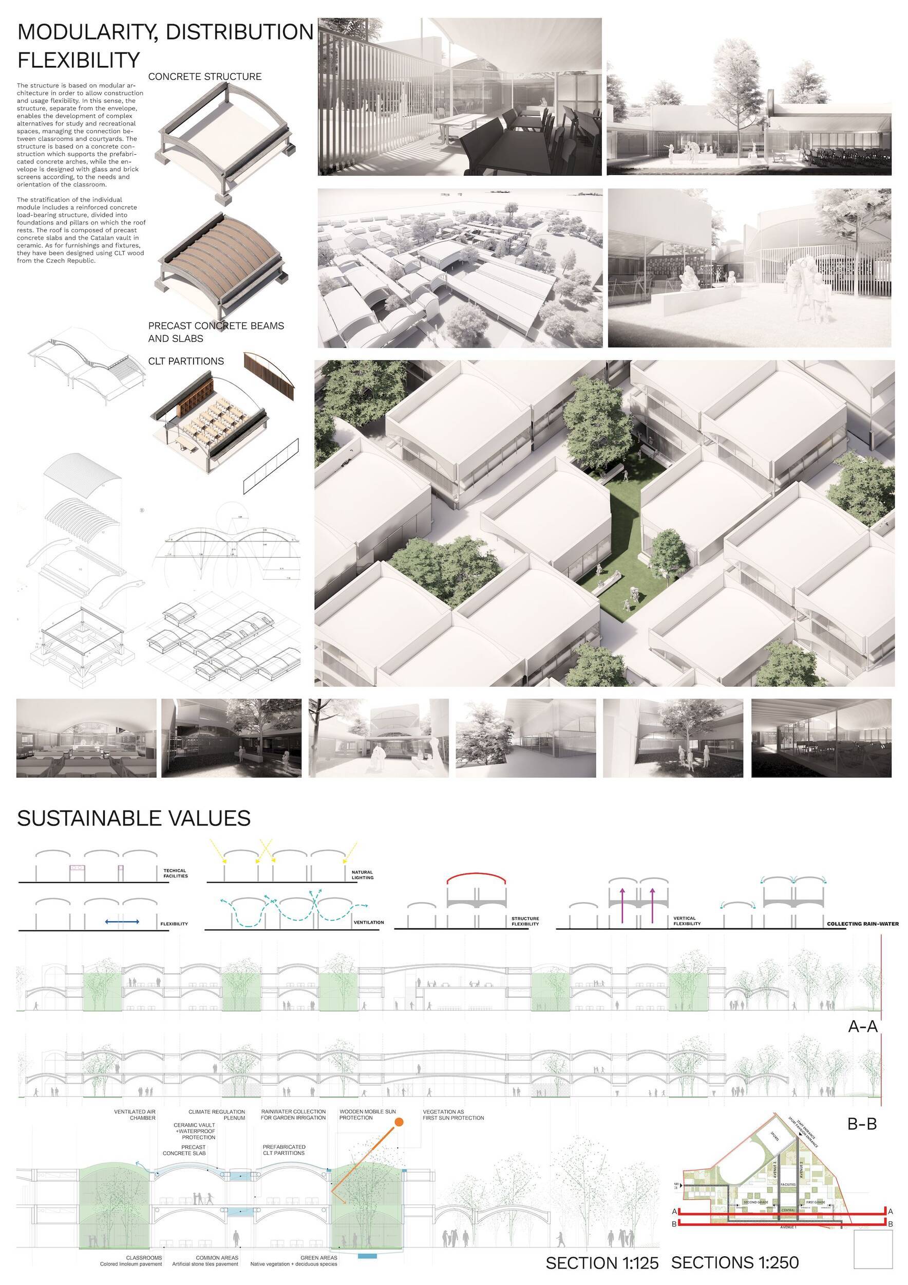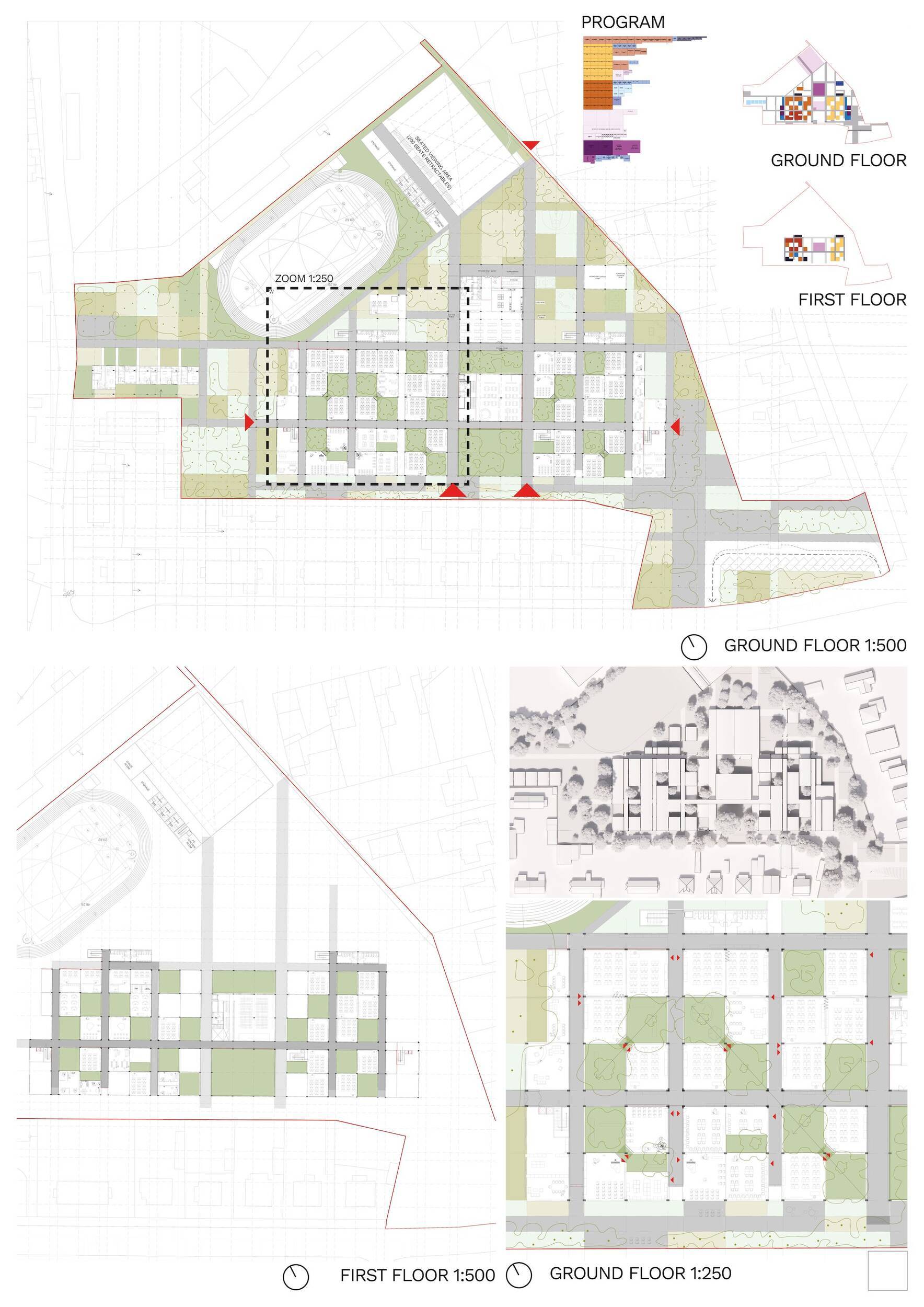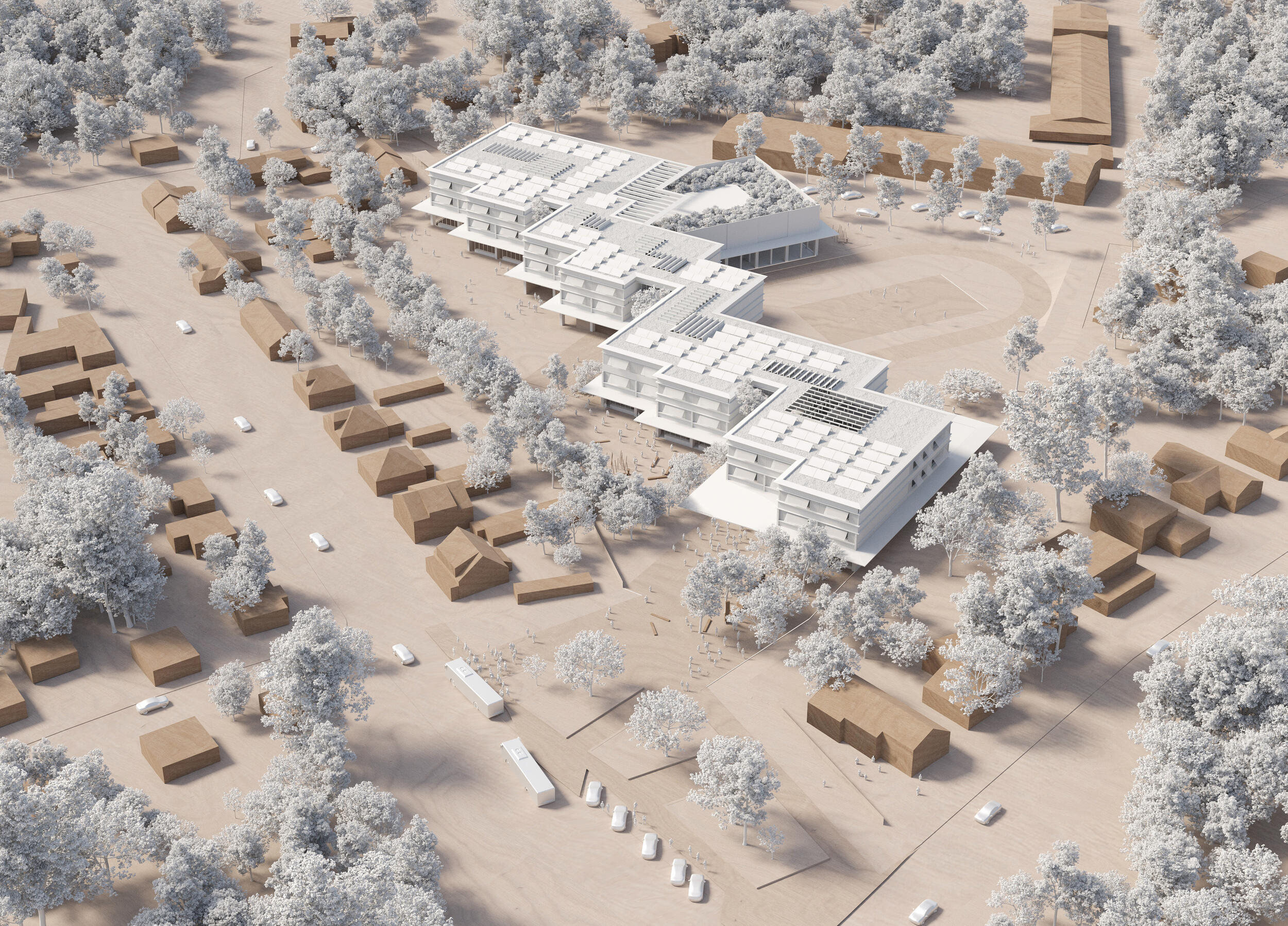Architektonické uspořádání, které porota vysoce oceňuje, vyniká díky svému začlenění do okolního prostředí. Koncept budovy je založen na opakujících se skupinách, které propojují jihovýchodní a severozápadní rohy parcely - přístupové body - prostřednictvím elegantně zakřivené diagonály. Přízemí bylo navrženo tak, aby zajistilo průchodnost do sportovního areálu na severu a chráněný venkovní prostor. Díky své orientaci a umístění na pozemku sportovní hala organicky zapadá do celkové koncepce. V přízemí se nachází společenské prostory pro komunitní využití, zatímco v prvním a druhém patře jsou sice funkčně odděleny stupně základní školy, ale navzájem jsou minimálně vizuálně propojeny atrii. Tento koncept organizace se promítá také do klastrů, kde jsou třídy otevřeně orientovány směrem k venkovnímu prostoru, což umožňuje spontánní využití prostoru v souladu s konkrétními výukovými potřebami. Dle názoru poroty se jedná o výjimečně myšlenkově i koncepčně kompaktní projekt, který si zaslouží budoucí péči při svém dopracování a úpravách a který se pak může podařit proměnit ve školu, kterou budou mít její žáci i pedagogičtí pracovníci a zaměstnanci školy rádi. Podstatné je tento projekt dále rozvíjet ve spolupráci s budoucími uživateli a přitom zachovávat jeho klíčové přednosti. Jedněmi z cílů jsou redukce vnitřních cest, přímá dostupnost tělocvičny pro všechny třídy, nebo udržení otevřeného prostoru v přízemí čí revize zásobování a dostatečného osvětlení kuchyně.