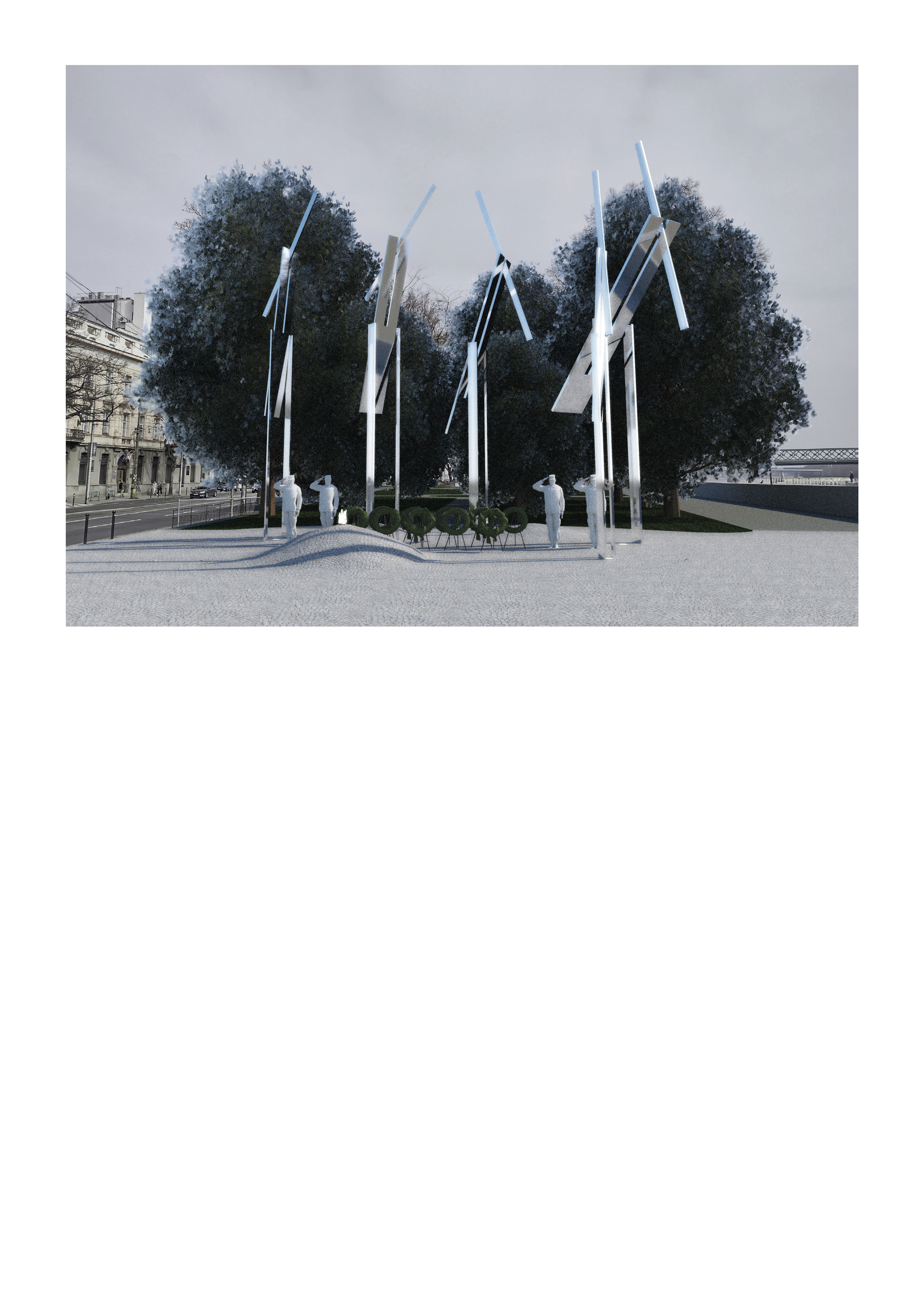 Autorský kolektív súťažného návrhu vychádzal v čo najväčšej miere zo zadania a podkladov, ktoré určil vyhlasovateľ súťaže. Zámerom bolo vytvorenie trvalého symbolického miesta úcty a dôstojnosti, veno-vané neznámym hrdinom, ktorí obetovali životy za slobodu a spravodlivosť v našich dejinách. Hlavným akcentom diela je sochárske zhmotnenie idey v troch písmenách, ktoré nesú v sebe odkaz proti vojnovým kataklizmám a na večnú pamiatku neznámeho vojaka. Vytvorené je z fragmentov dobových aj súčasných zbraní. Dielo zahŕňa v sebe posolstvo súčasníkom aj nasledujúcim generáciám a je stvárnením všeľud-ských etických hodnôt.