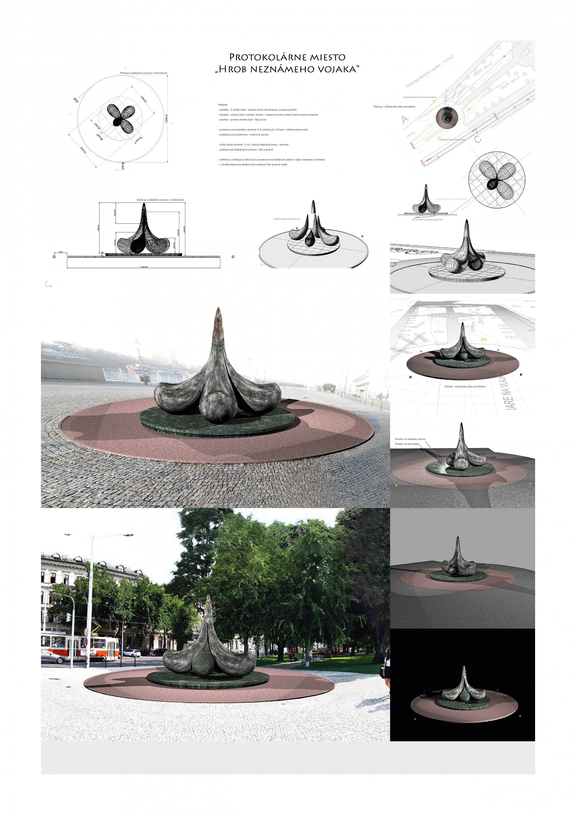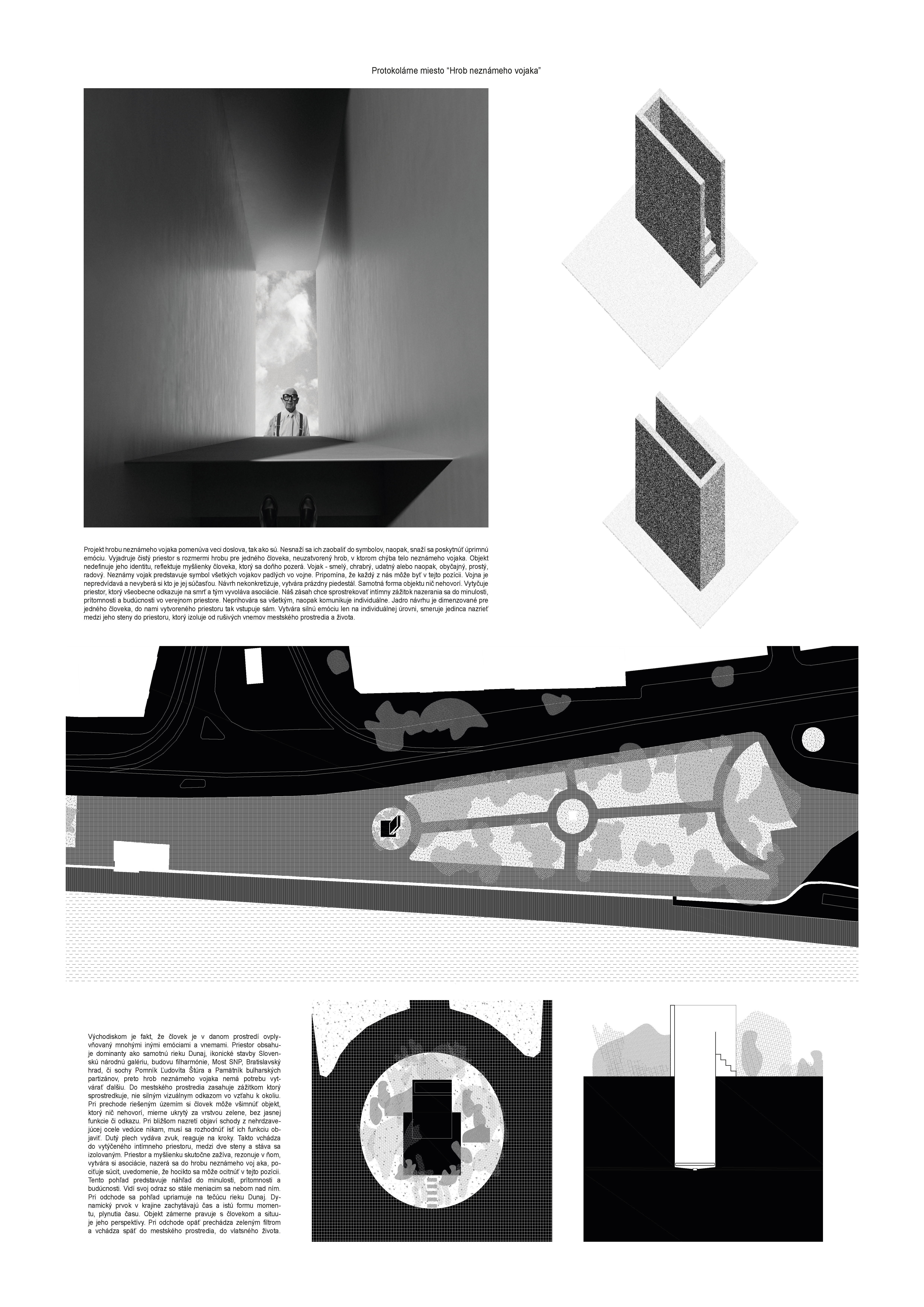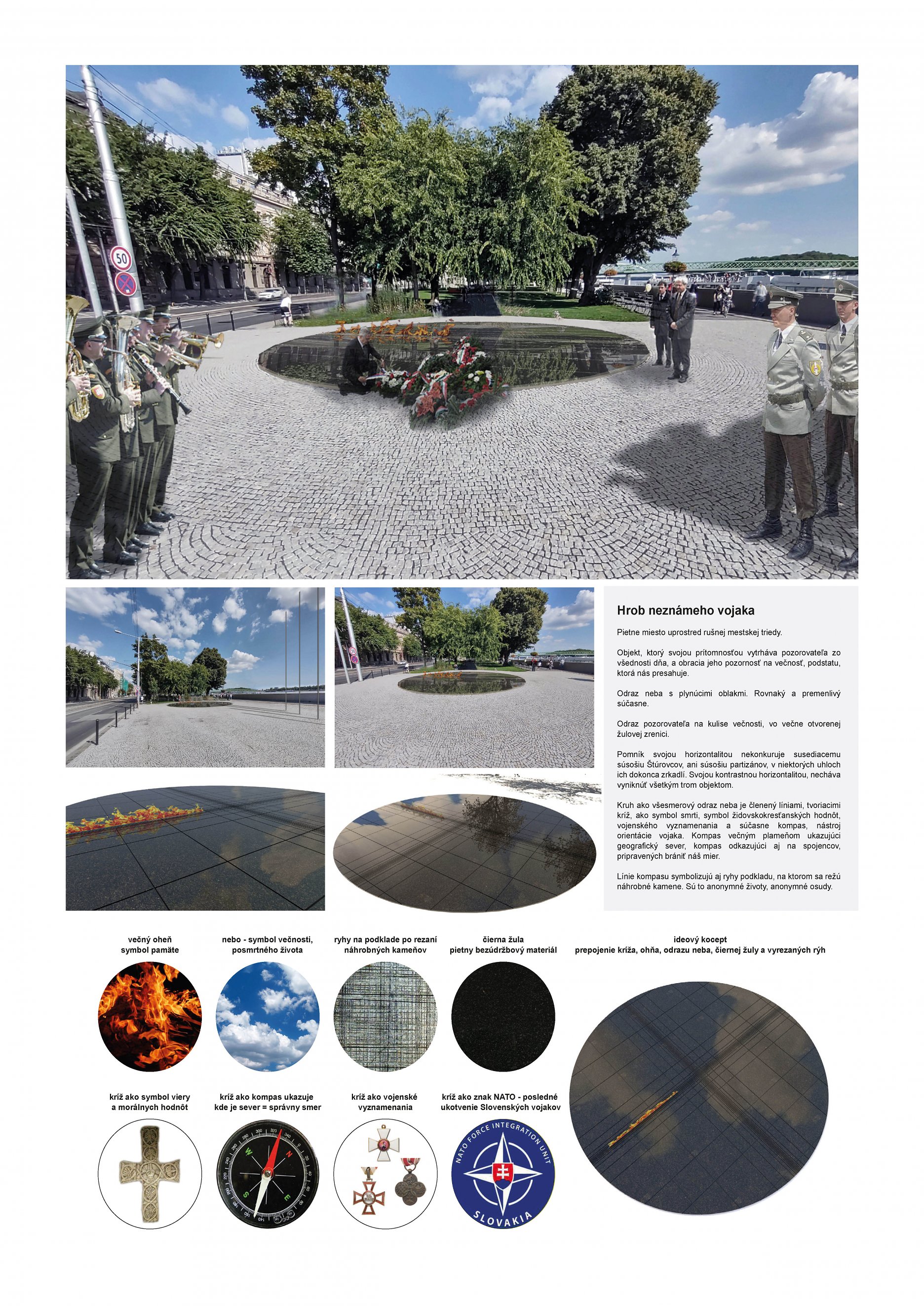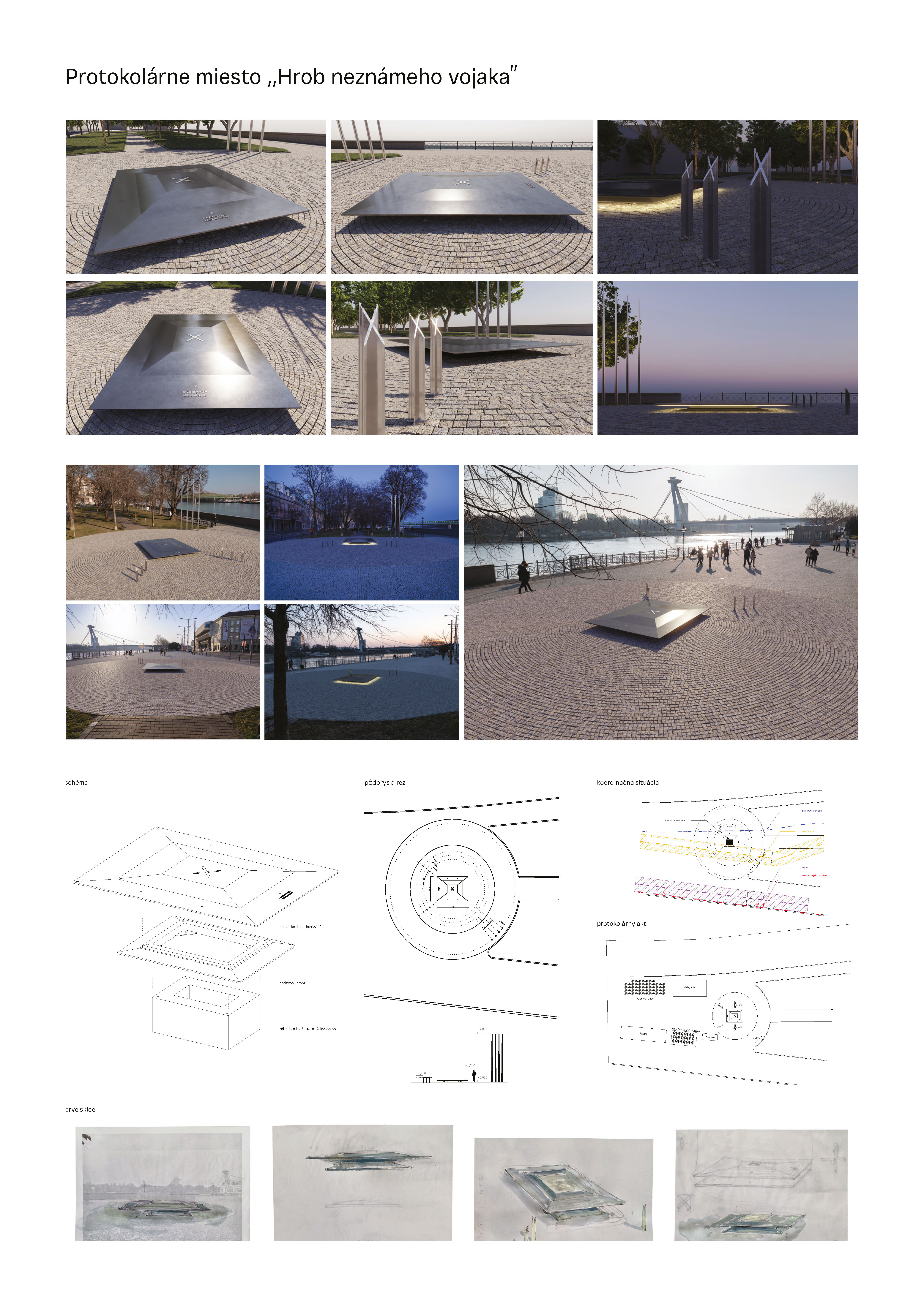 Návrh protokolárneho miesta „Hrob neznámeho vojaka“ je koncipovaný ako kontemplatívny priestor vnorený pod úroveň zeme. Primárnym cieľom, vytvorením podúrovňového priestoru, je strata horizontu, kontaktu s prostredím ulice. Predstavuje zostúpenie smerom k posmrtnému rozmeru. Horizontálna úroveň zeme predstavuje pomyselnú hranicu. Objekt je osovo súmerný, v strede sa nachádza hlavný pylón, ktorý je ukončený otvorom, z ktorého horí večný oheň. Pylón končí vo výške zábradlia, v jednej rovine. Os nástupu vedie smerom k Slovenskému národnému múzeu. Na stene pod nástupom, ktorú nevidíme, sa nachádza priestor na kladenie (zavesenie) vencov. Na protiľahlej stene, ktorú vidíme od nastupovania na rampu, je priestor na zvečnenie idey, básne, vety, ktorá bude dotvárať ideu hrobu neznámeho vojaka.