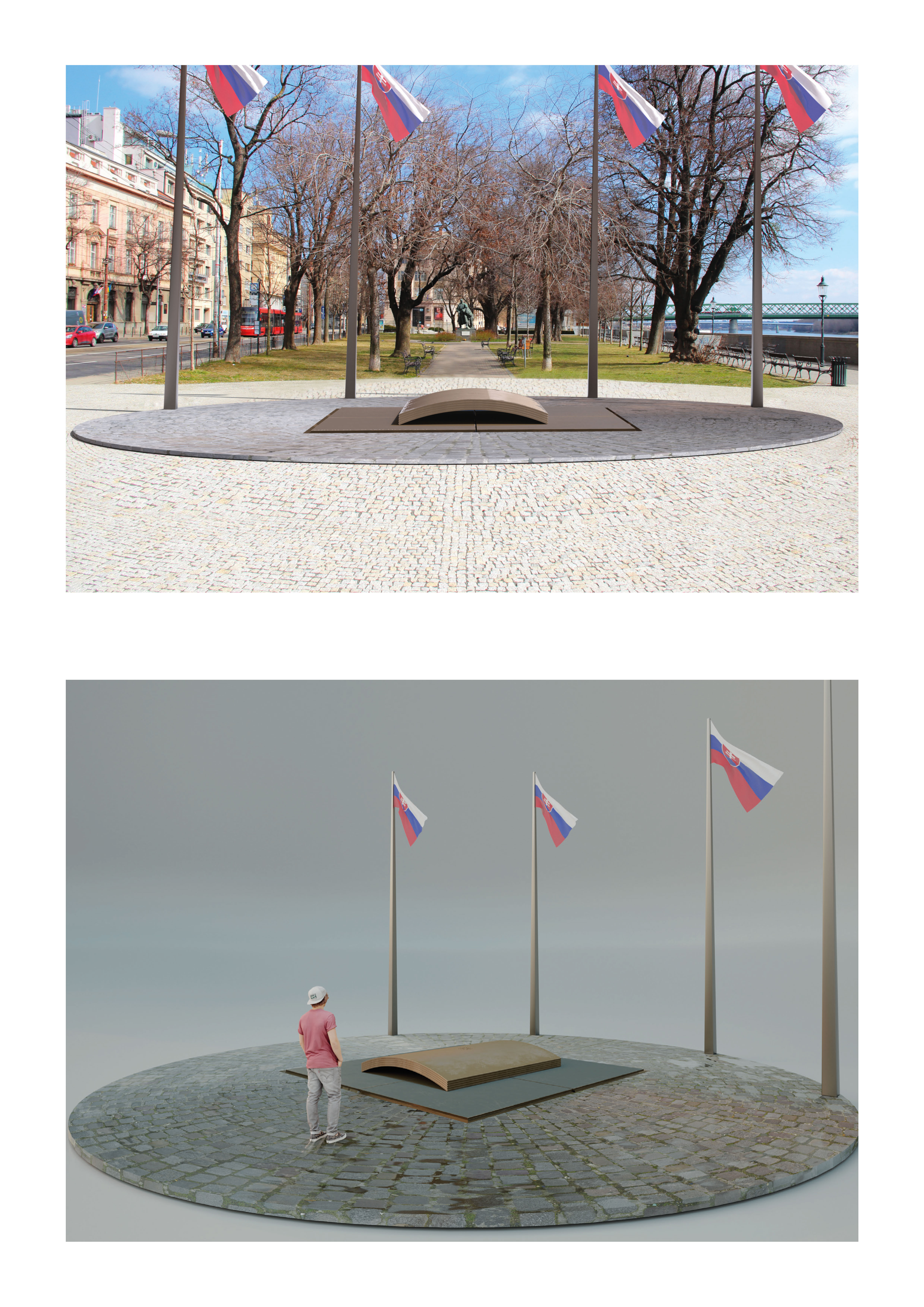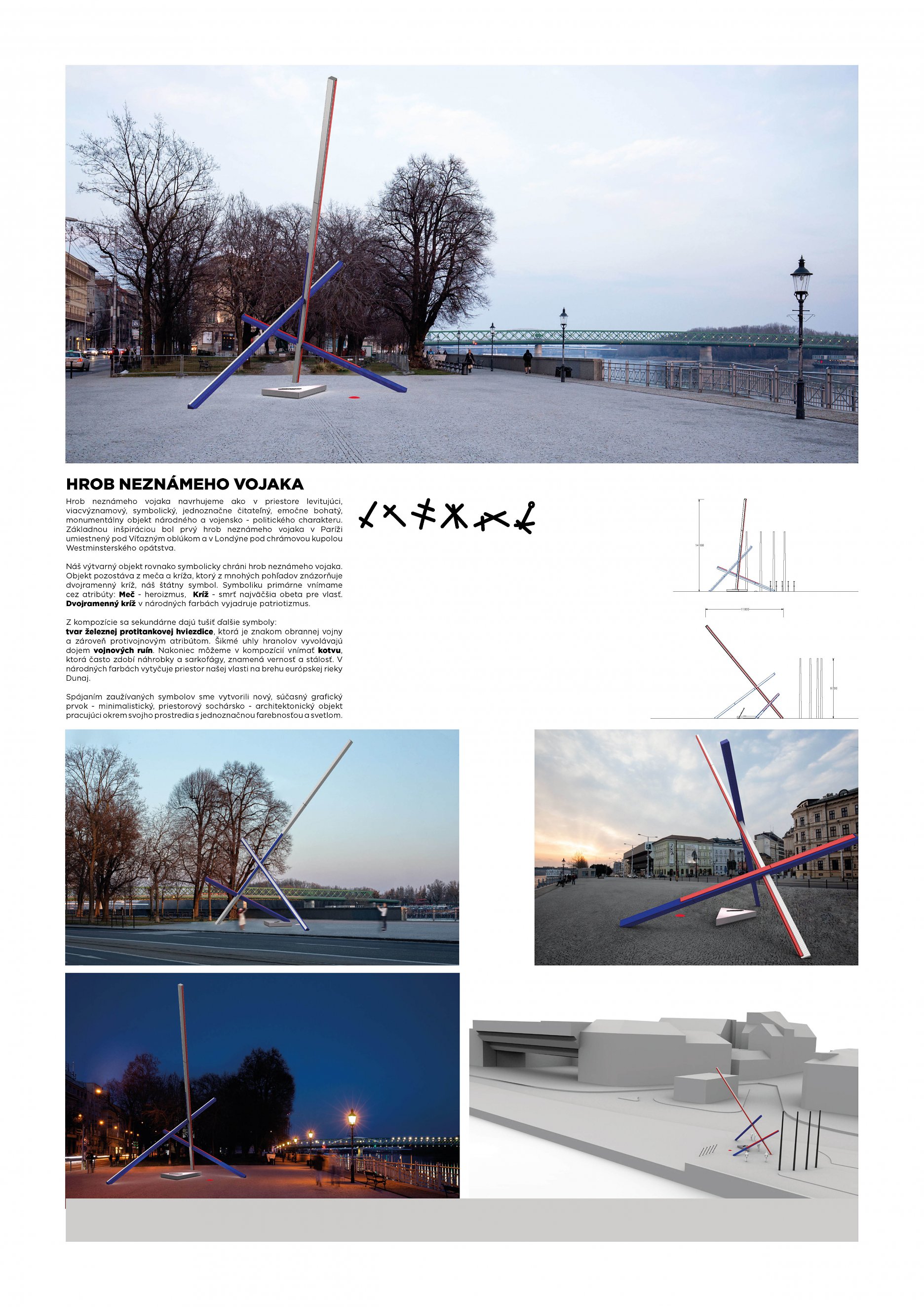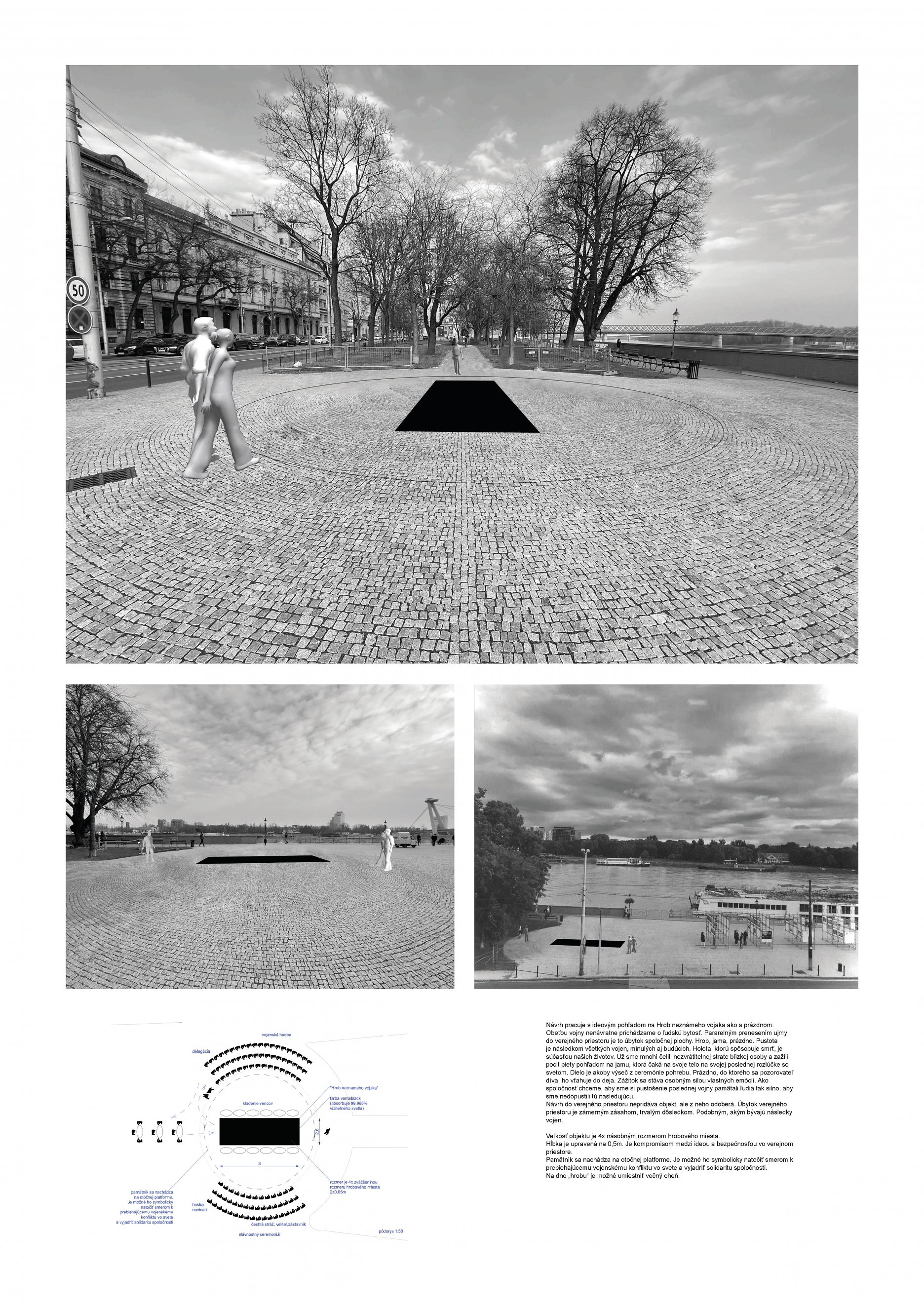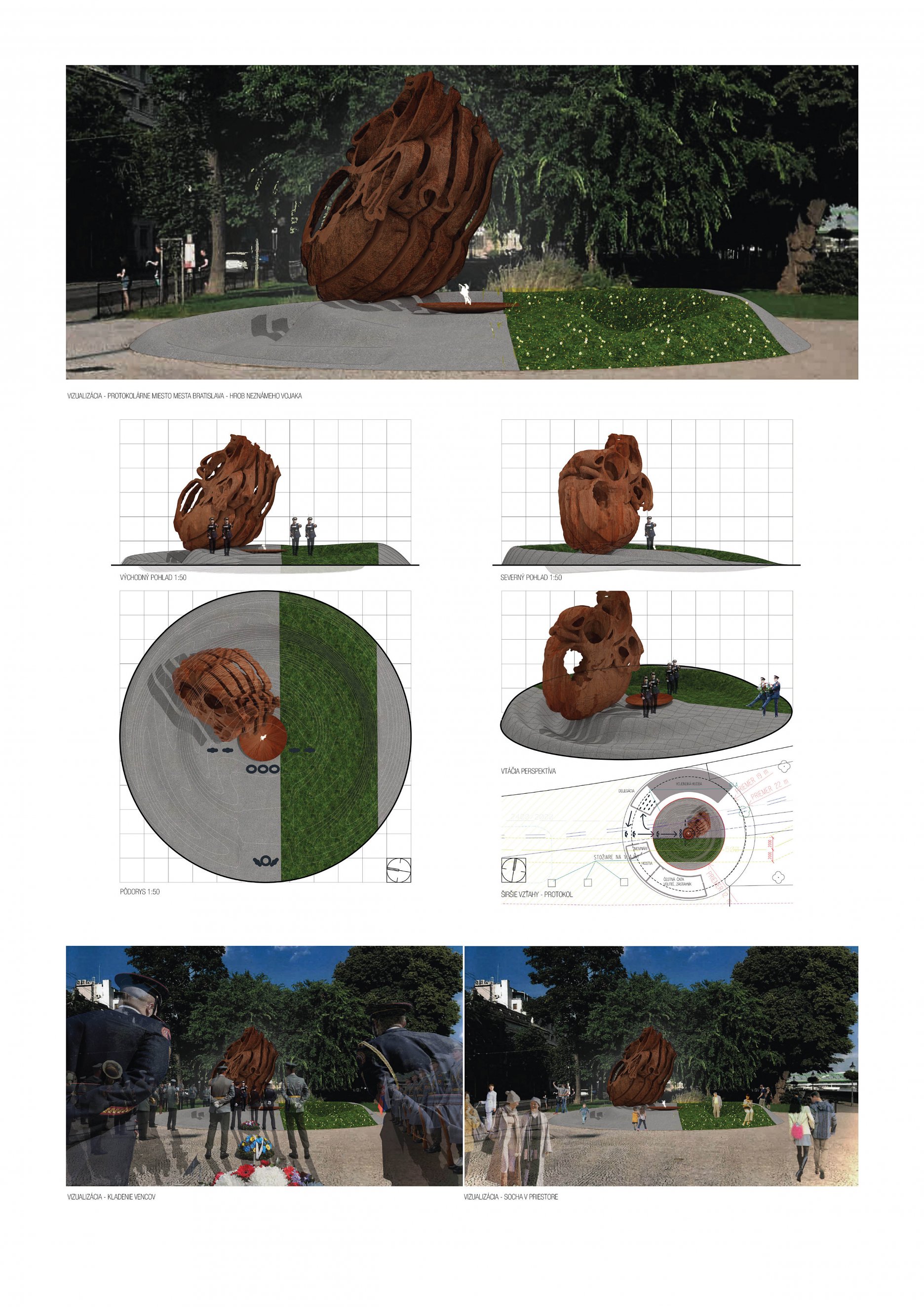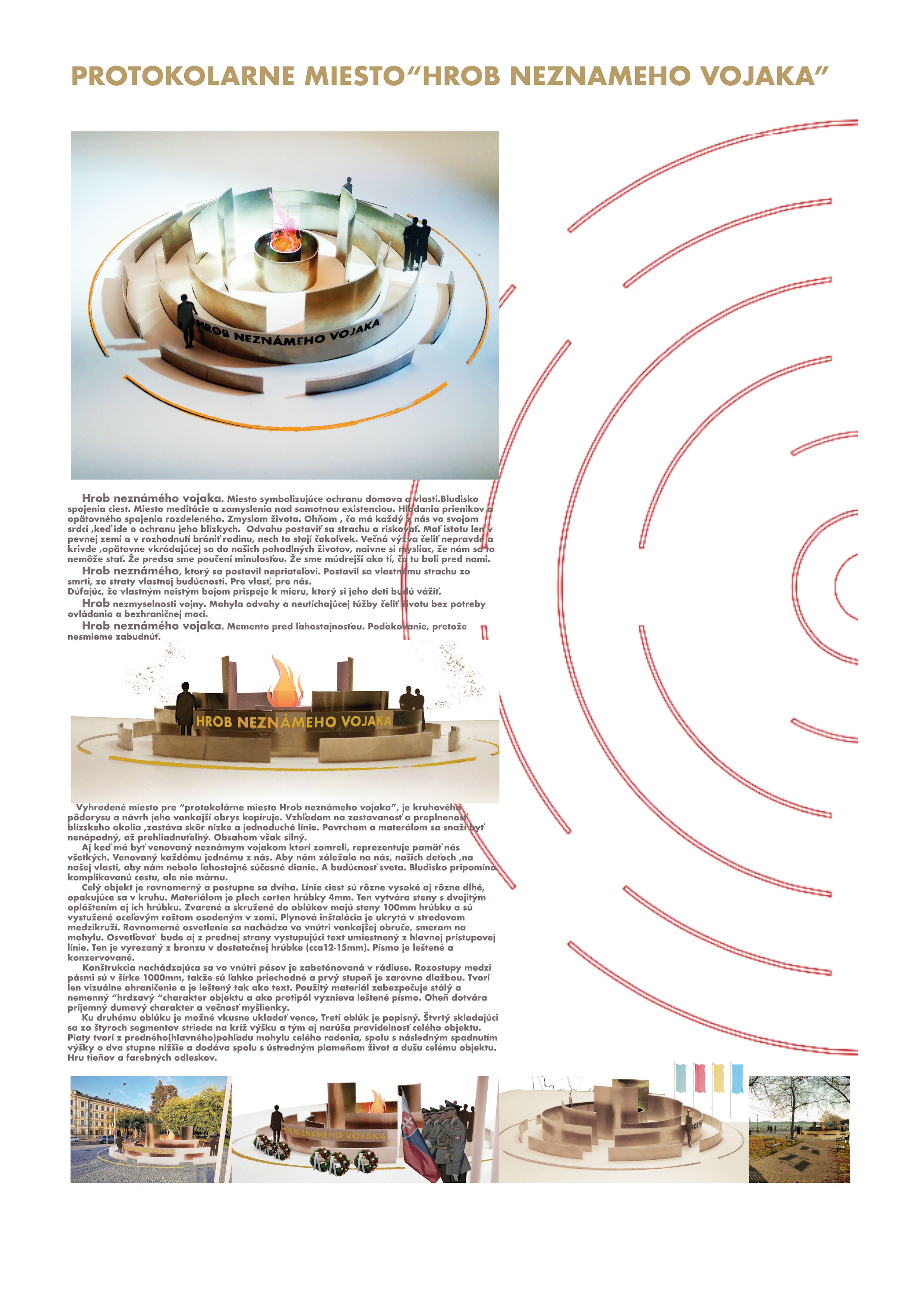Návrh protokolárneho miesta „Hrob neznámeho vojaka“ je koncipovaný ako kontemplatívny priestor vnorený pod úroveň zeme. Primárnym cieľom, vytvorením podúrovňového priestoru, je strata horizontu, kontaktu s prostredím ulice. Predstavuje zostúpenie smerom k posmrtnému rozmeru. Horizontálna úroveň zeme predstavuje pomyselnú hranicu. Objekt je osovo súmerný, v strede sa nachádza hlavný pylón, ktorý je ukončený otvorom, z ktorého horí večný oheň. Pylón končí vo výške zábradlia, v jednej rovine. Os nástupu vedie smerom k Slovenskému národnému múzeu. Na stene pod nástupom, ktorú nevidíme, sa nachádza priestor na kladenie (zavesenie) vencov. Na protiľahlej stene, ktorú vidíme od nastupovania na rampu, je priestor na zvečnenie idey, básne, vety, ktorá bude dotvárať ideu hrobu neznámeho vojaka.