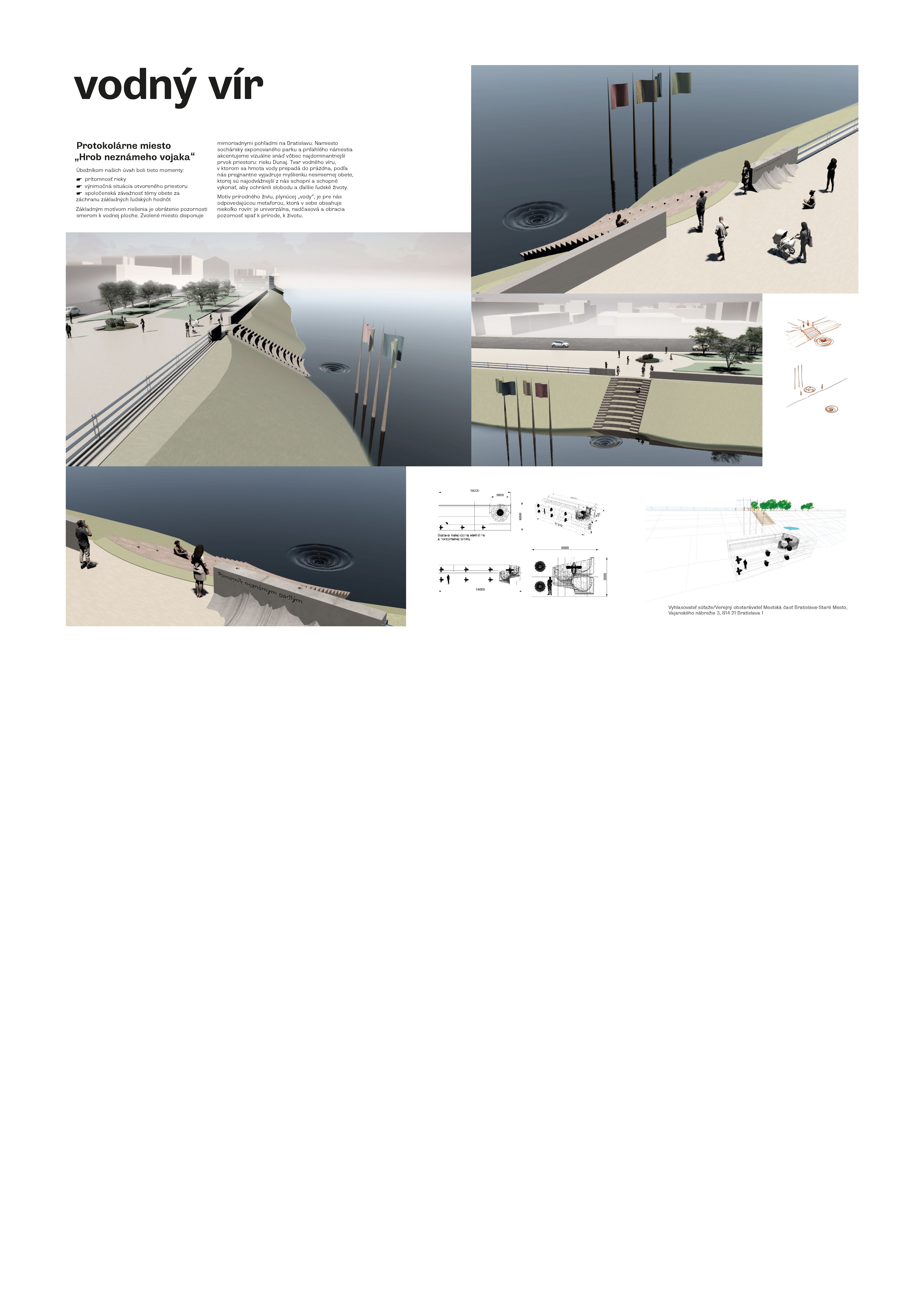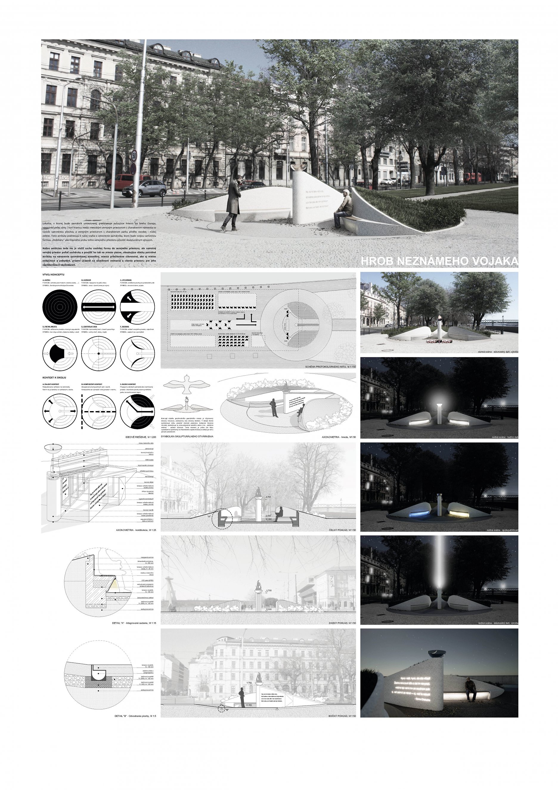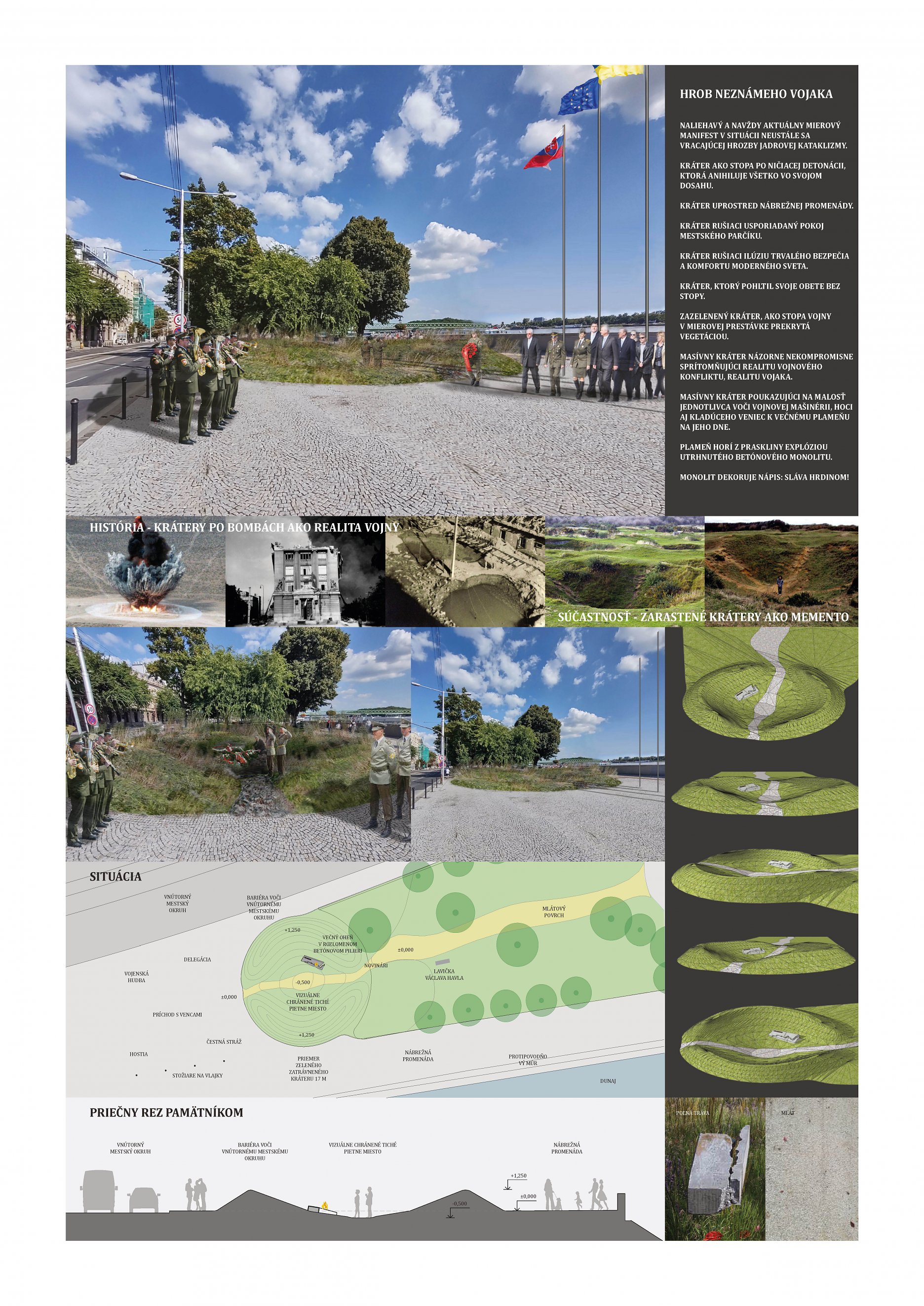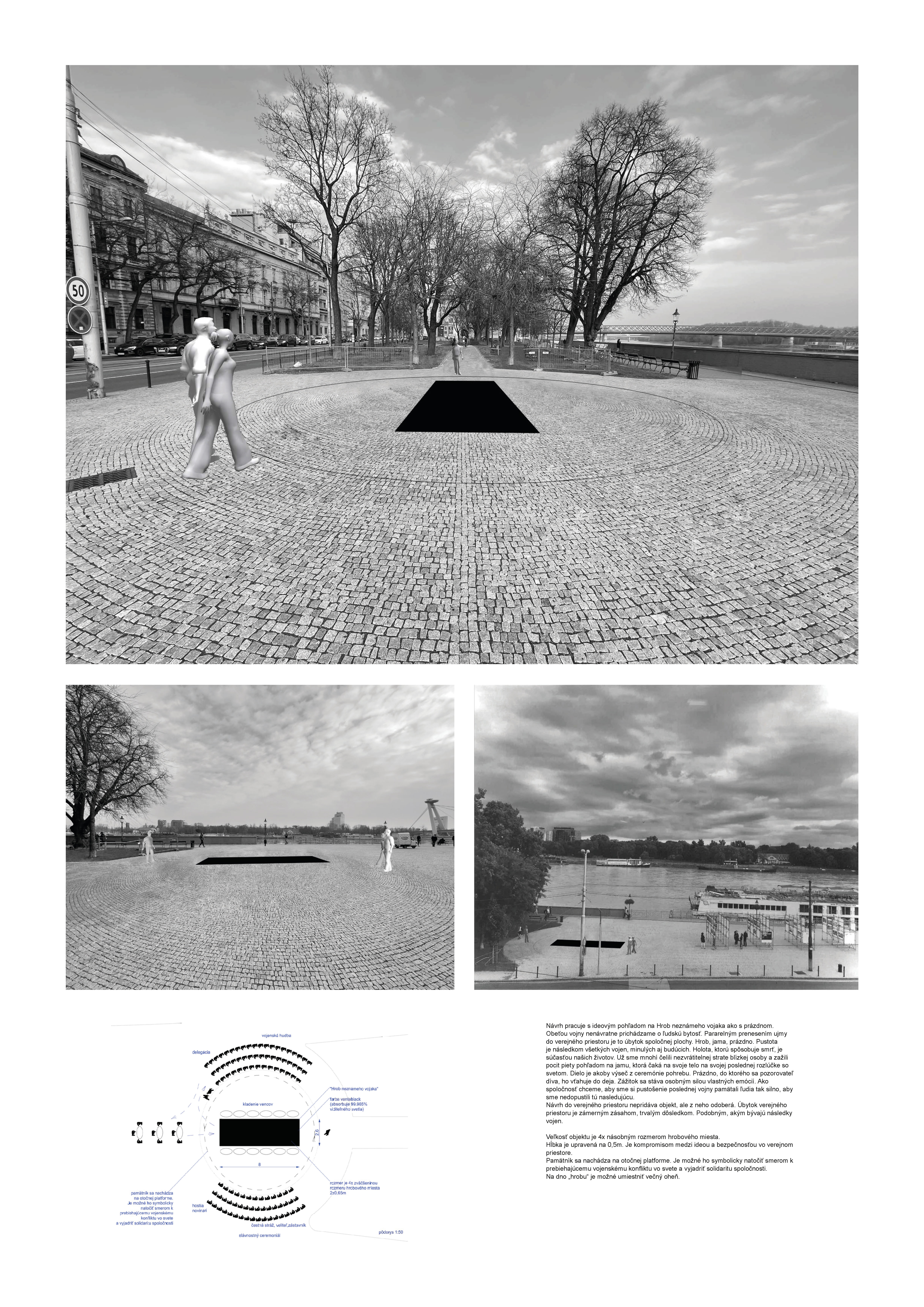 Návrh protokolárneho miesta „Hrob neznámeho vojaka“ je koncipovaný ako kontemplatívny priestor vnorený pod úroveň zeme. Primárnym cieľom, vytvorením podúrovňového priestoru, je strata horizontu, kontaktu s prostredím ulice. Predstavuje zostúpenie smerom k posmrtnému rozmeru. Horizontálna úroveň zeme predstavuje pomyselnú hranicu. Objekt je osovo súmerný, v strede sa nachádza hlavný pylón, ktorý je ukončený otvorom, z ktorého horí večný oheň. Pylón končí vo výške zábradlia, v jednej rovine. Os nástupu vedie smerom k Slovenskému národnému múzeu. Na stene pod nástupom, ktorú nevidíme, sa nachádza priestor na kladenie (zavesenie) vencov. Na protiľahlej stene, ktorú vidíme od nastupovania na rampu, je priestor na zvečnenie idey, básne, vety, ktorá bude dotvárať ideu hrobu neznámeho vojaka.