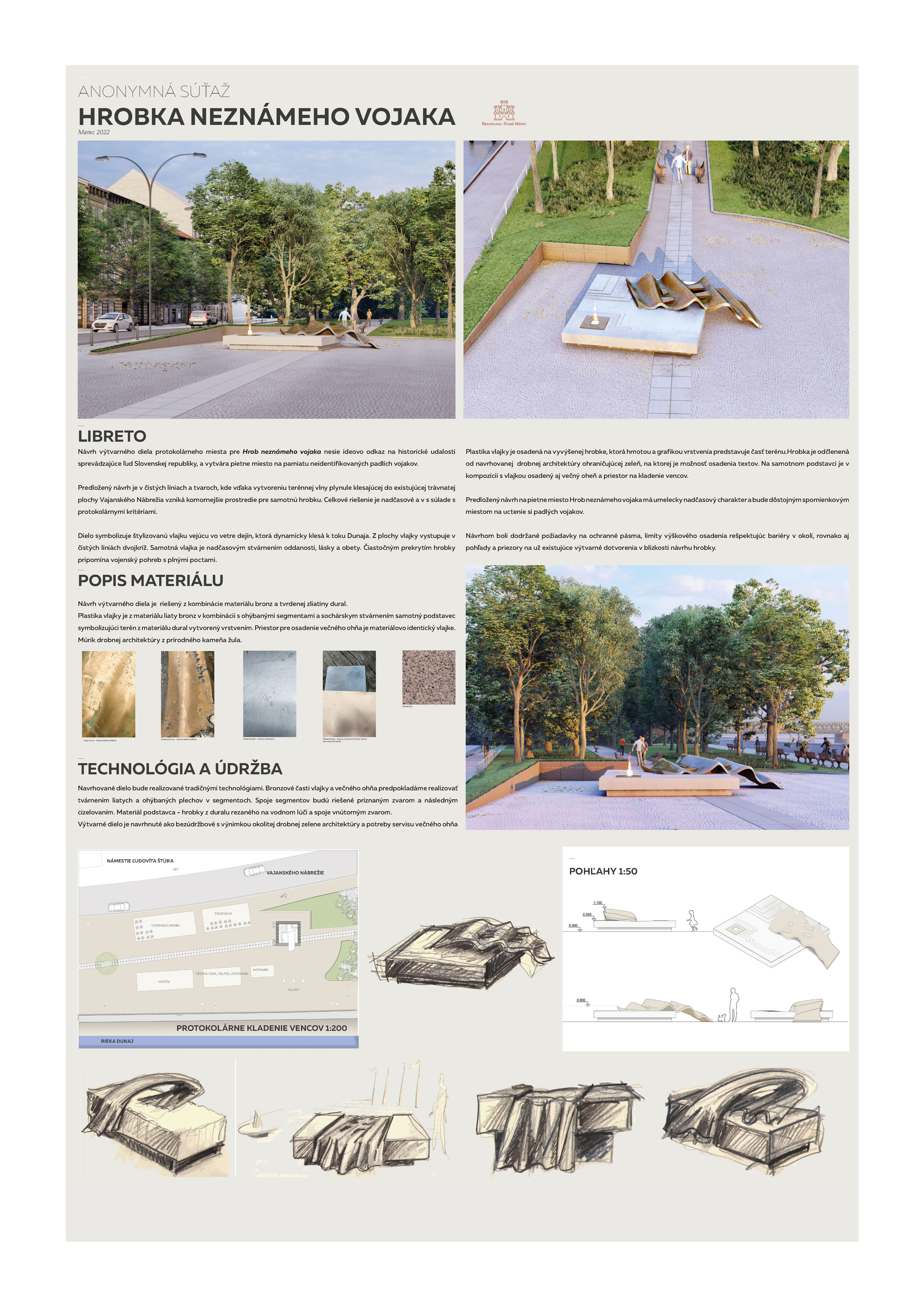Tragédia na Ukrajine sa nás bytostne dotýka. Reflexia vojnovej témy sa dnes môže javiť takmer anachronicky; no práve súčasná doba – digitálne exploatovaná, a predsa hodnotovo vyprázdnená; doba krízou (nech už predstavuje čokoľvek) zneistená, čoraz naliehavejšie volá po varovne vztýčenom prste: akoby nám unikalo, že bezhlavá civilizačná jazda nevyhnutne končieva fatálnym rozuzlením. Pietne miesto ,,Hrob neznámeho vojaka“ je nepochybne silným výtvarným námetom. Predkladaný návrh tvorí jasnú referenciu vojnovej pamäti a hlbokej úcty k tým neznámym vojakom, ktorí položili život za našu slobodu. Sloboda nám nepadla z neba, milióny za ňu padli a padajú aj v tejto chvíli.