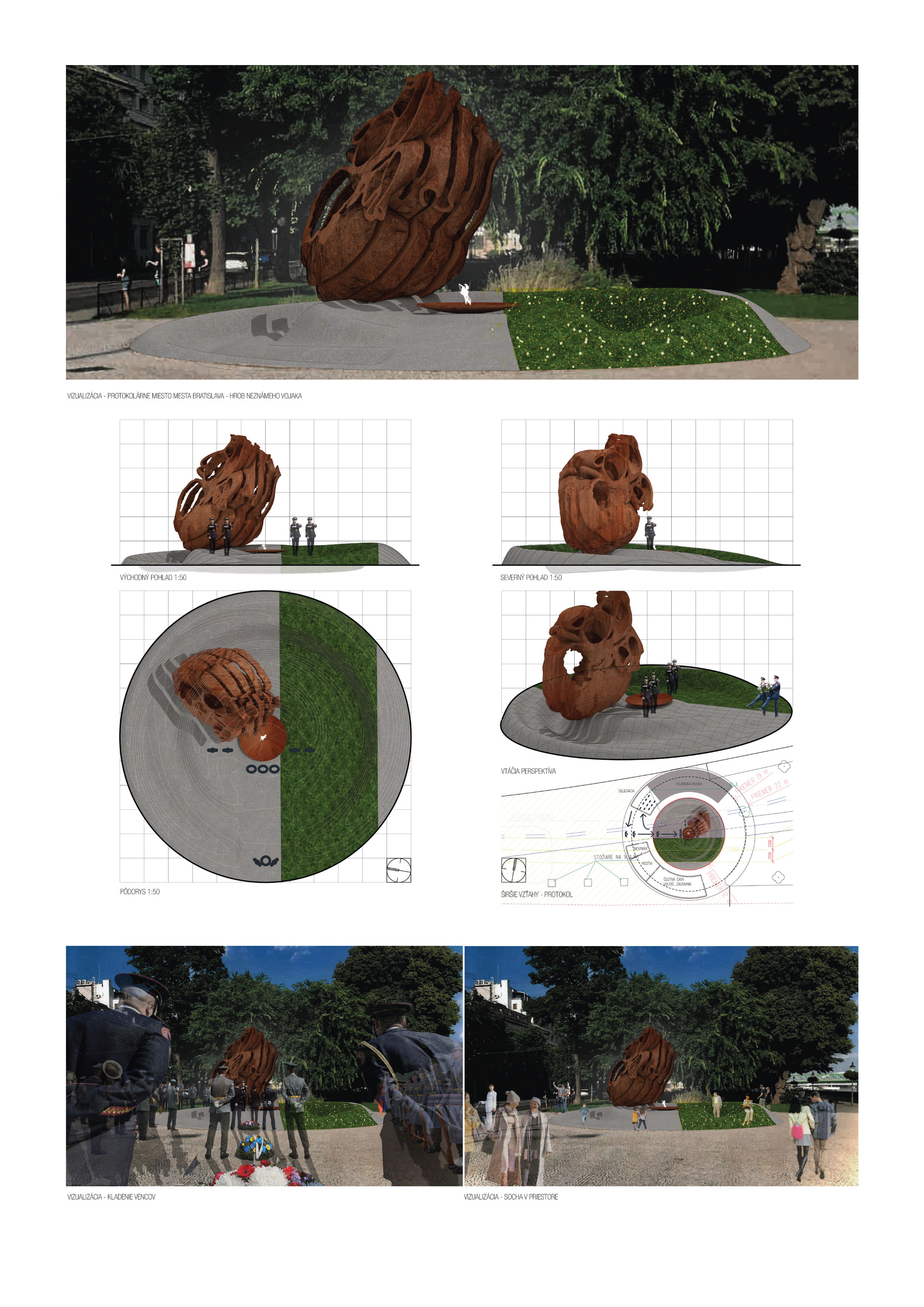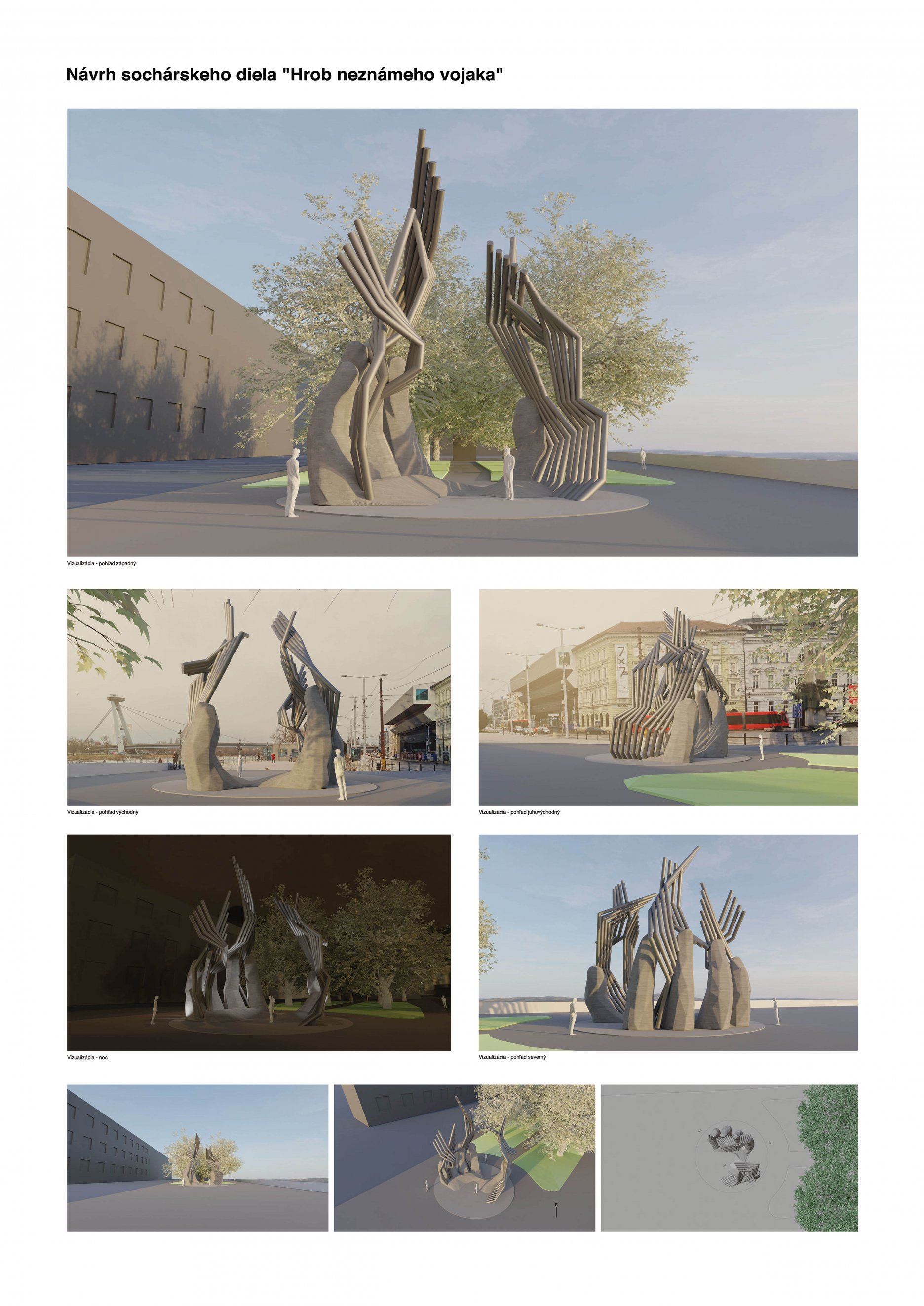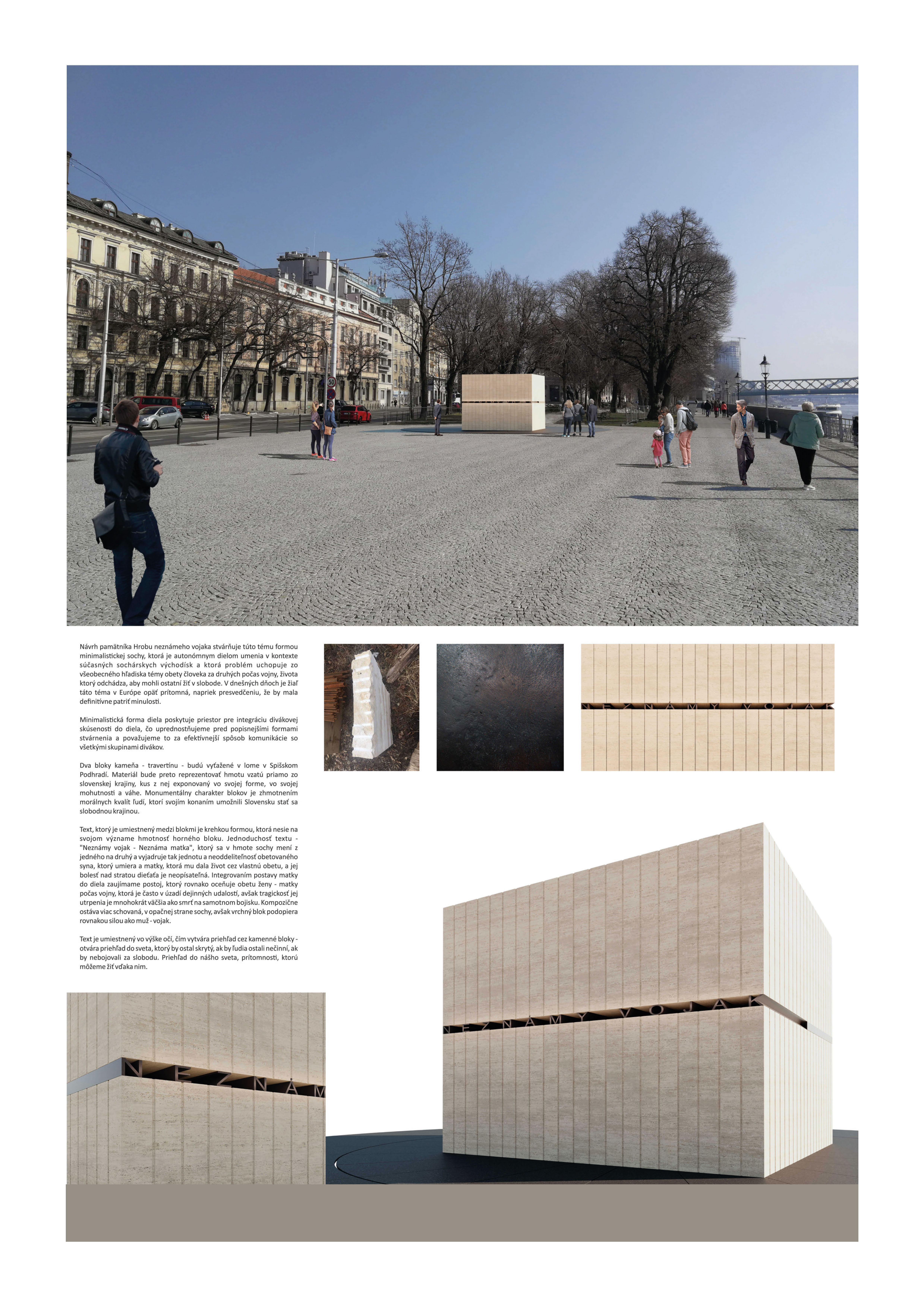 Návrh pamätníka „Hrobu neznámeho vojaka“ stvárňuje túto tému formou minimalistickej sochy, ktorá je autonómnym dielom umenia v kontexte súčasných sochárskych východísk, a ktorá problém uchopuje zo všeobecného hľadiska témy obety človeka za druhých počas vojny, života, ktorý odchádza, aby mohli ostatní žiť v slobode. V dnešných dňoch je, žiaľ, táto téma v Európe opäť prítomná, napriek presvedčeniu, že by mala definitívne patriť minulosti. Minimalistická forma diela poskytuje priestor pre integráciu divákovej skúsenosti do diela, čo uprednostňujeme pred popisnejšími formami stvárnenia a považujeme to za efektívnejší spôsob komunikácie so všetkými skupinami divákov.
