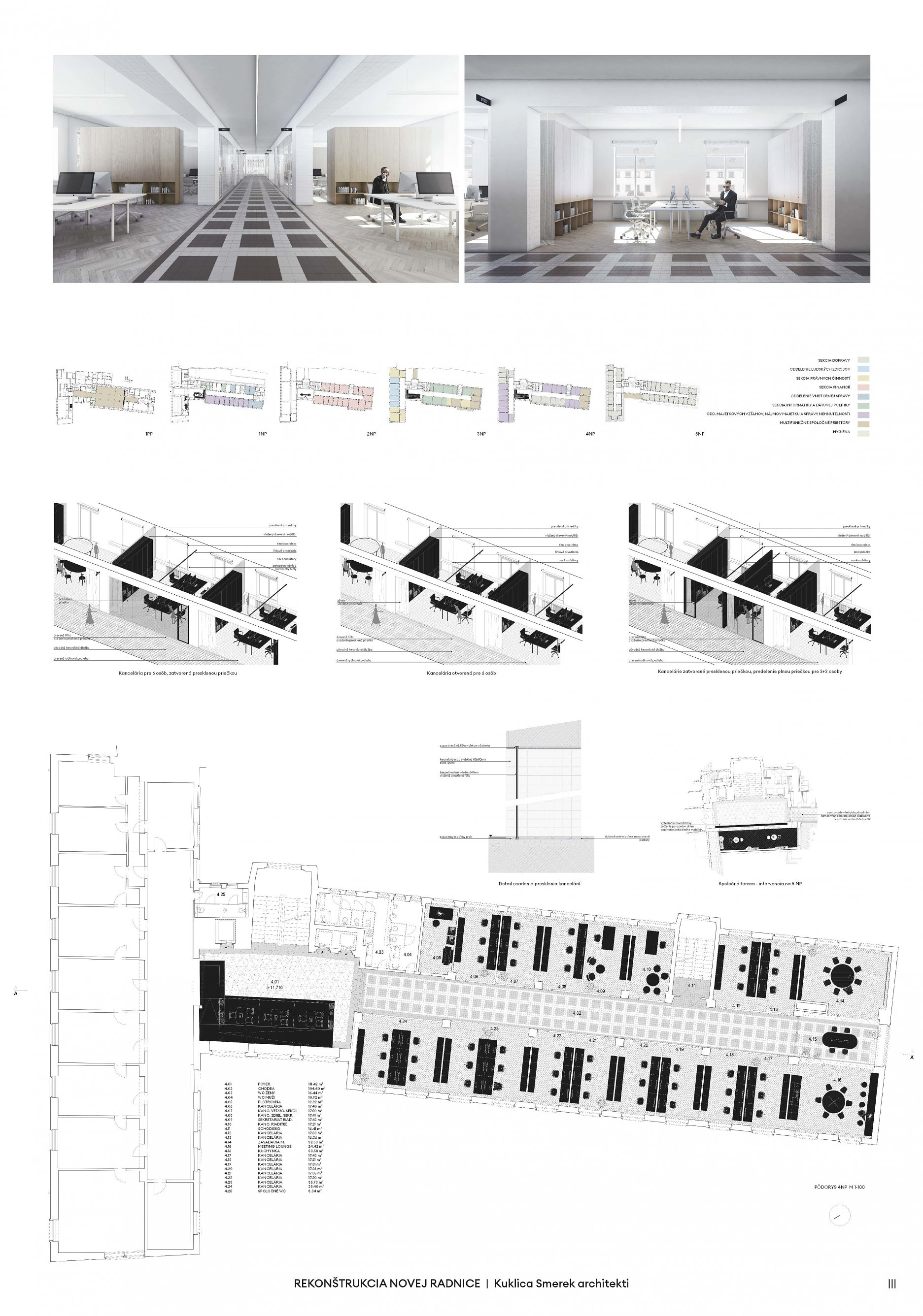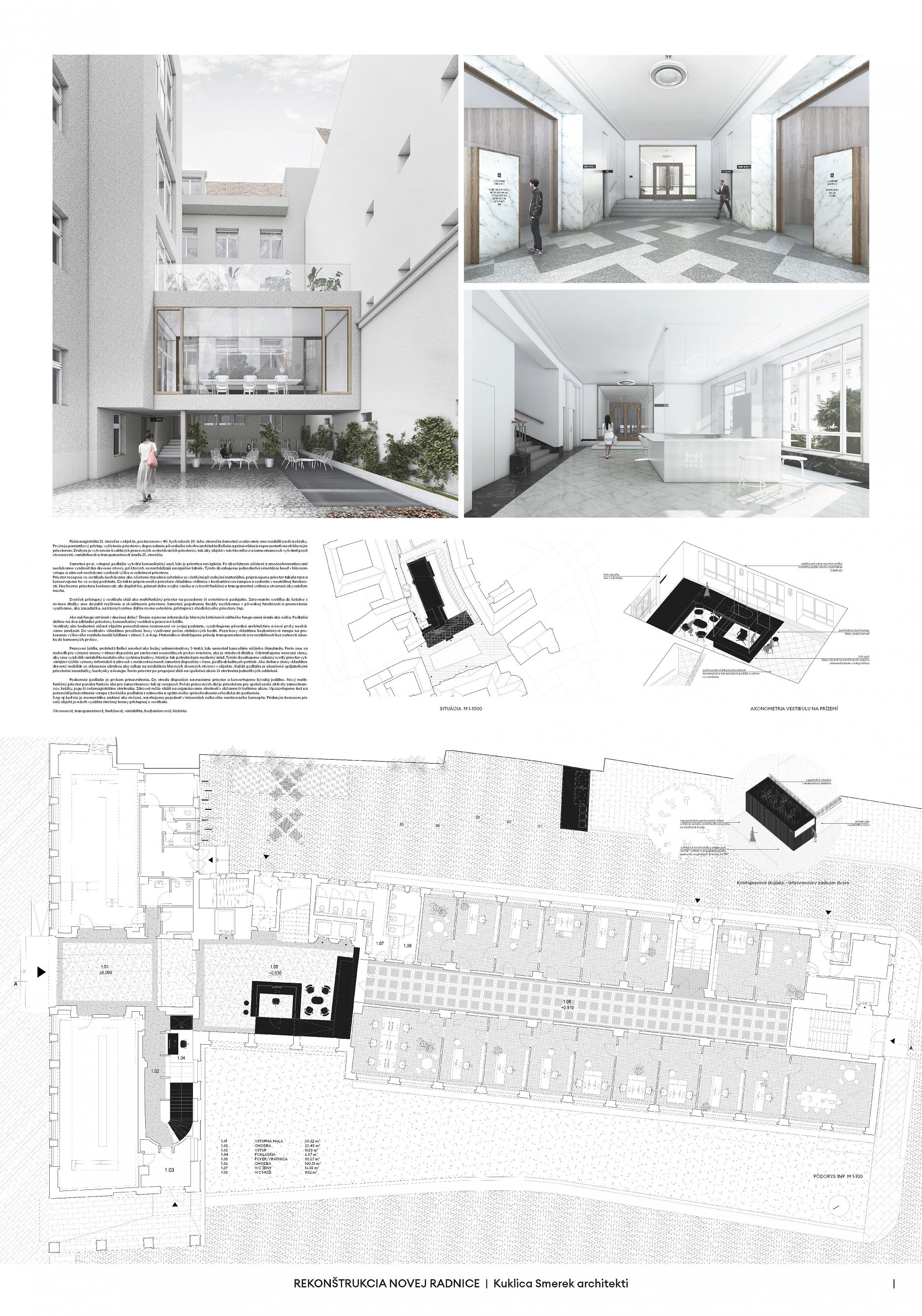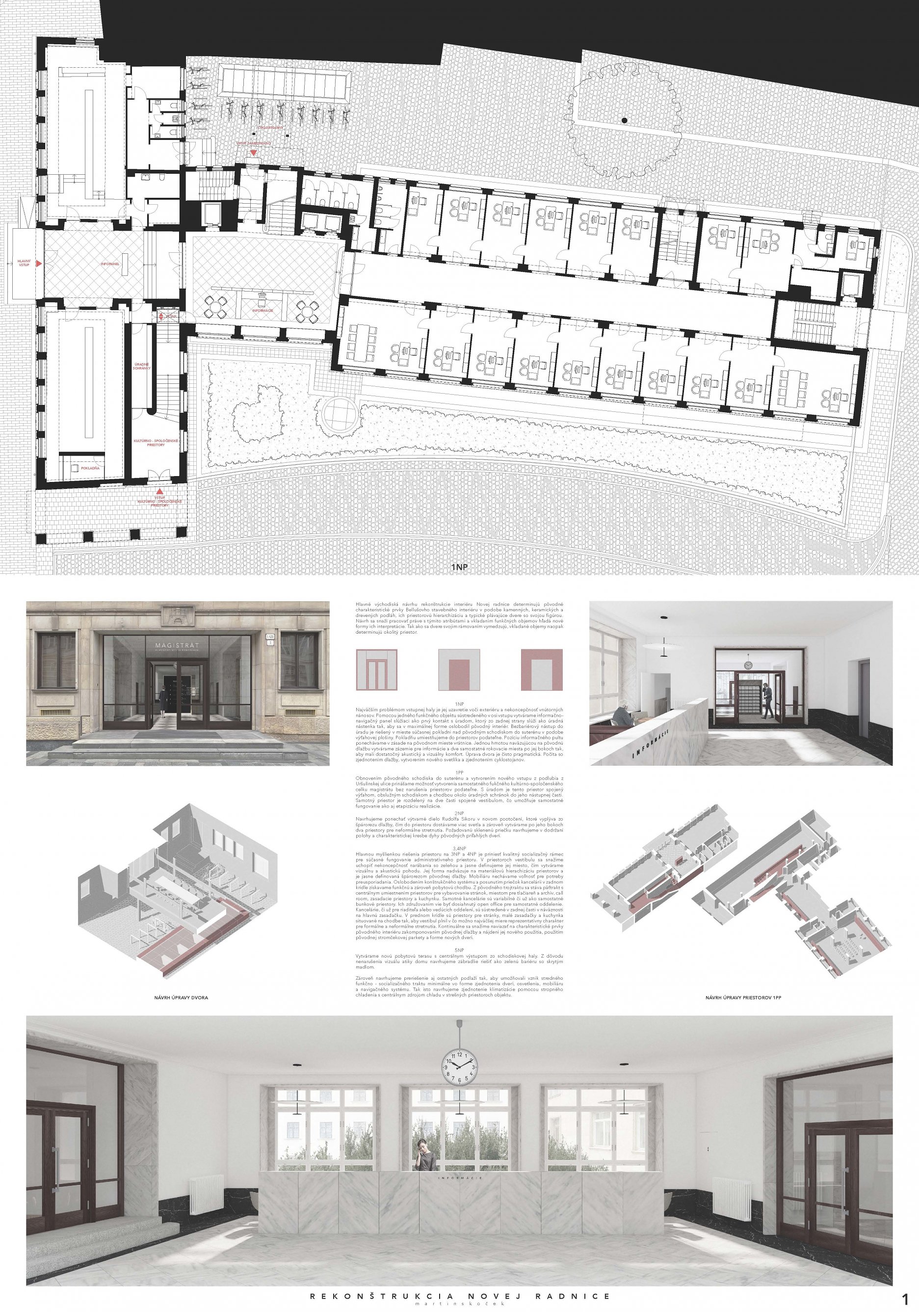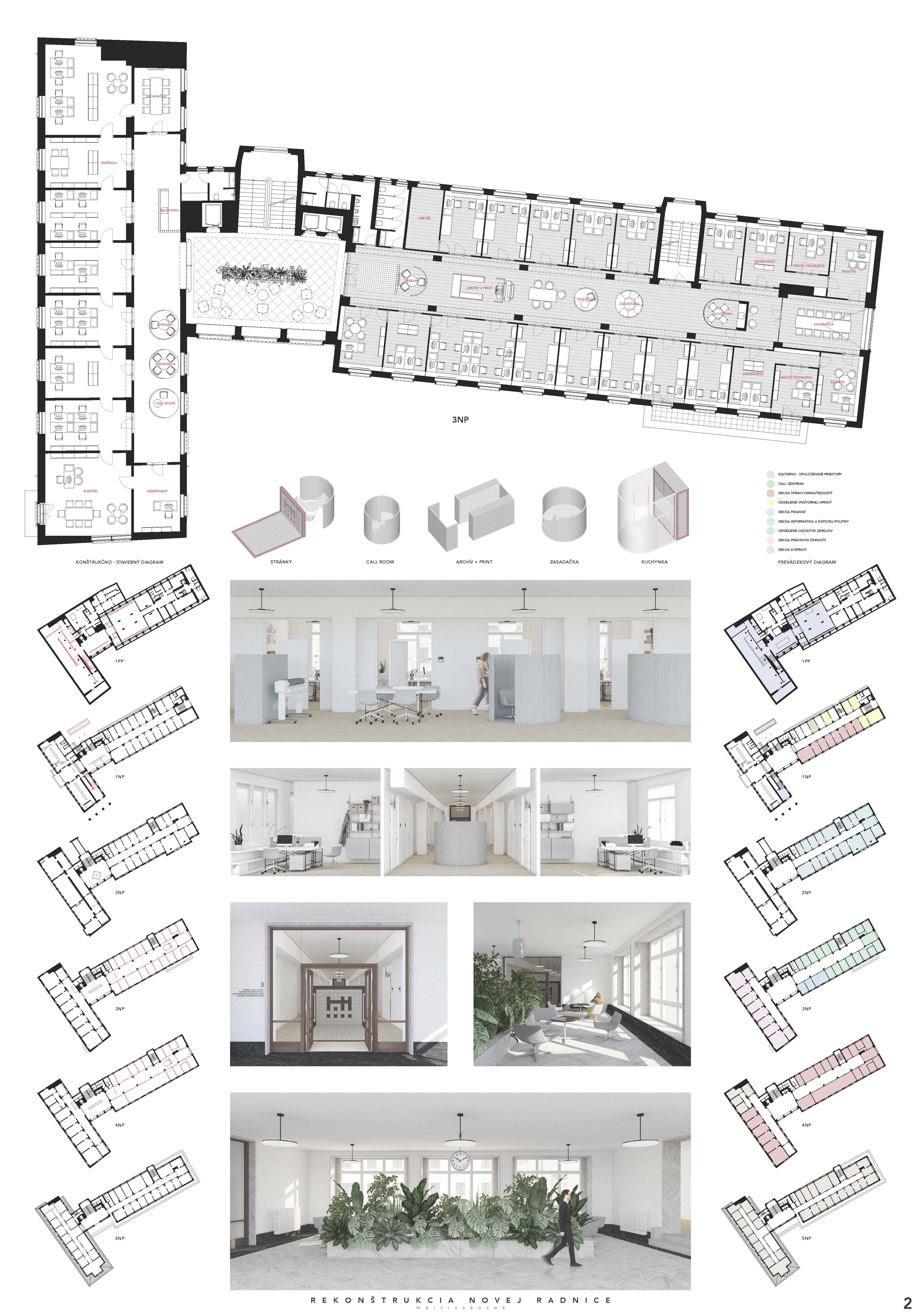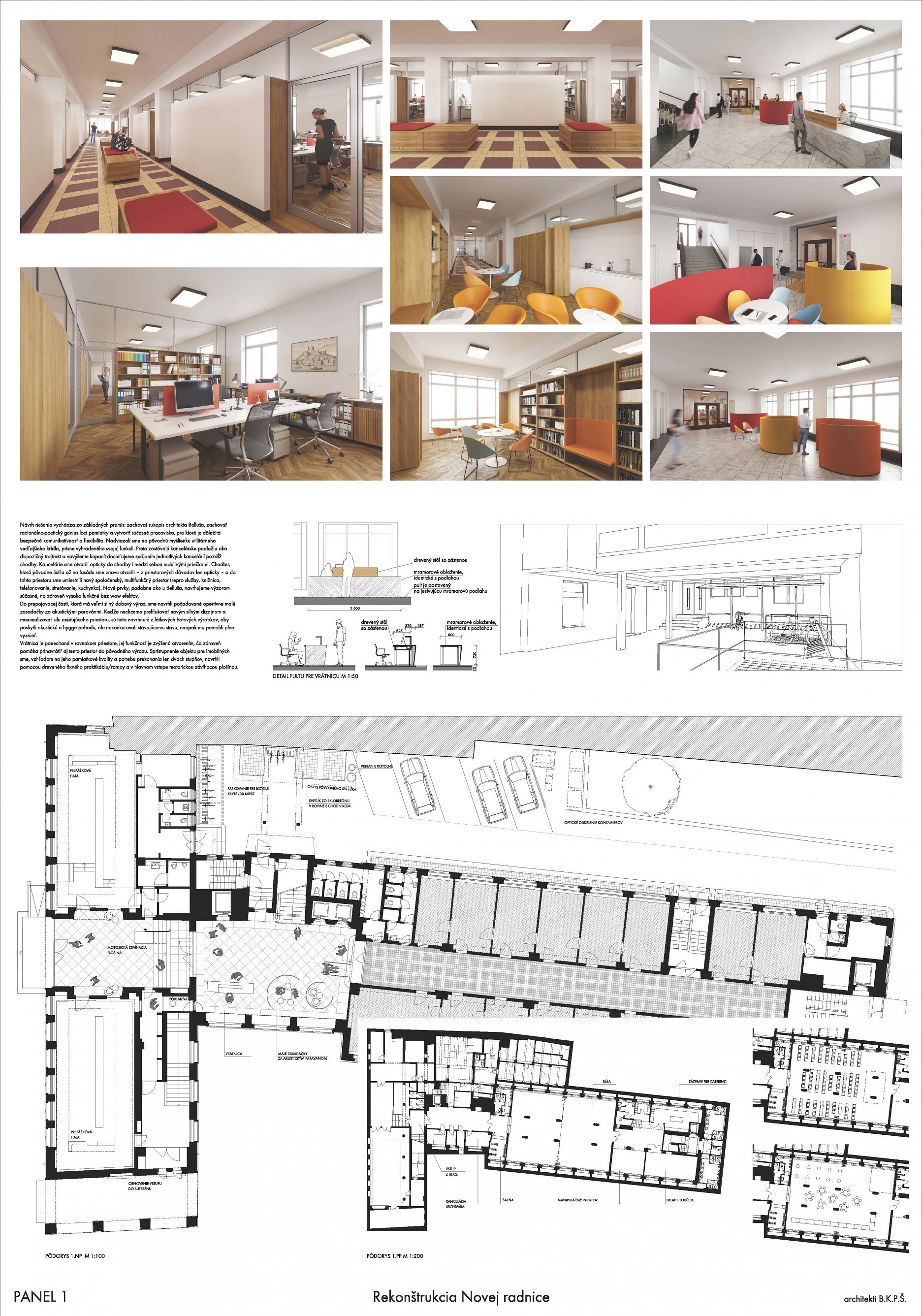 Návrh pracuje s budovou architekta E. Belluša ponechaním pôvodného členenia objektu a konštrukcií. Návrh zaujal variabilitou riešenia kancelársky priestorov, ktoré ponúkajú rôzne mierky pracovných priestorov pre zamestnancov. Autori ponúkli aj škálu doplnkových priestorov pre rôznu formu a obsah práce. Porota vníma ako pozitívum situovanie časti kuchynky v zadnej časti traktu. Riešenie spoločnej chodby doplnením o sedenie, ktoré je zároveň aj úložným priestorom, sa javí ako málo využiteľný priestor a otázne je jeho reálne využitie pri bežnom chode magistrátu. Koridor chodby preto pôsobí skôr ako čakáreň a zdá sa, akoby potenciál tohto priestoru nebol využitý napr. na konzultácie alebo neformálne stretávanie sa zamestnancov. Riešenie priestoru pri recepcii pôsobí nevhodne v nadväznosti na jednotlivé funkcie priestoru. Autori neadekvátne riešili bezbariérovosť priestorov prostredníctvom robustných rámp. Rovnako je na zváženie farebnosť a výber typových prvkov mobiliáru doplňujúcich spoločné priestory- spojovaciu časť medzi traktami.