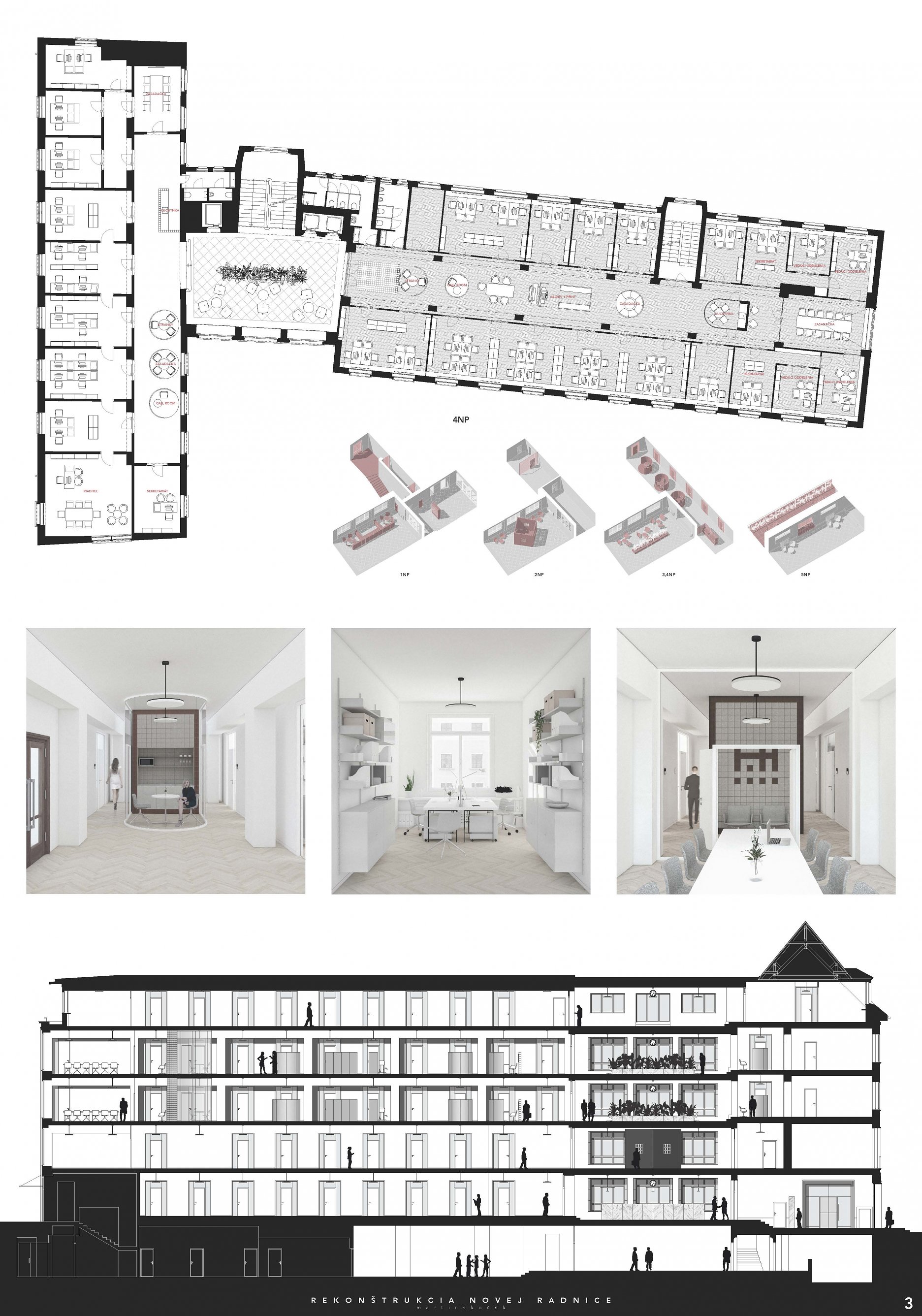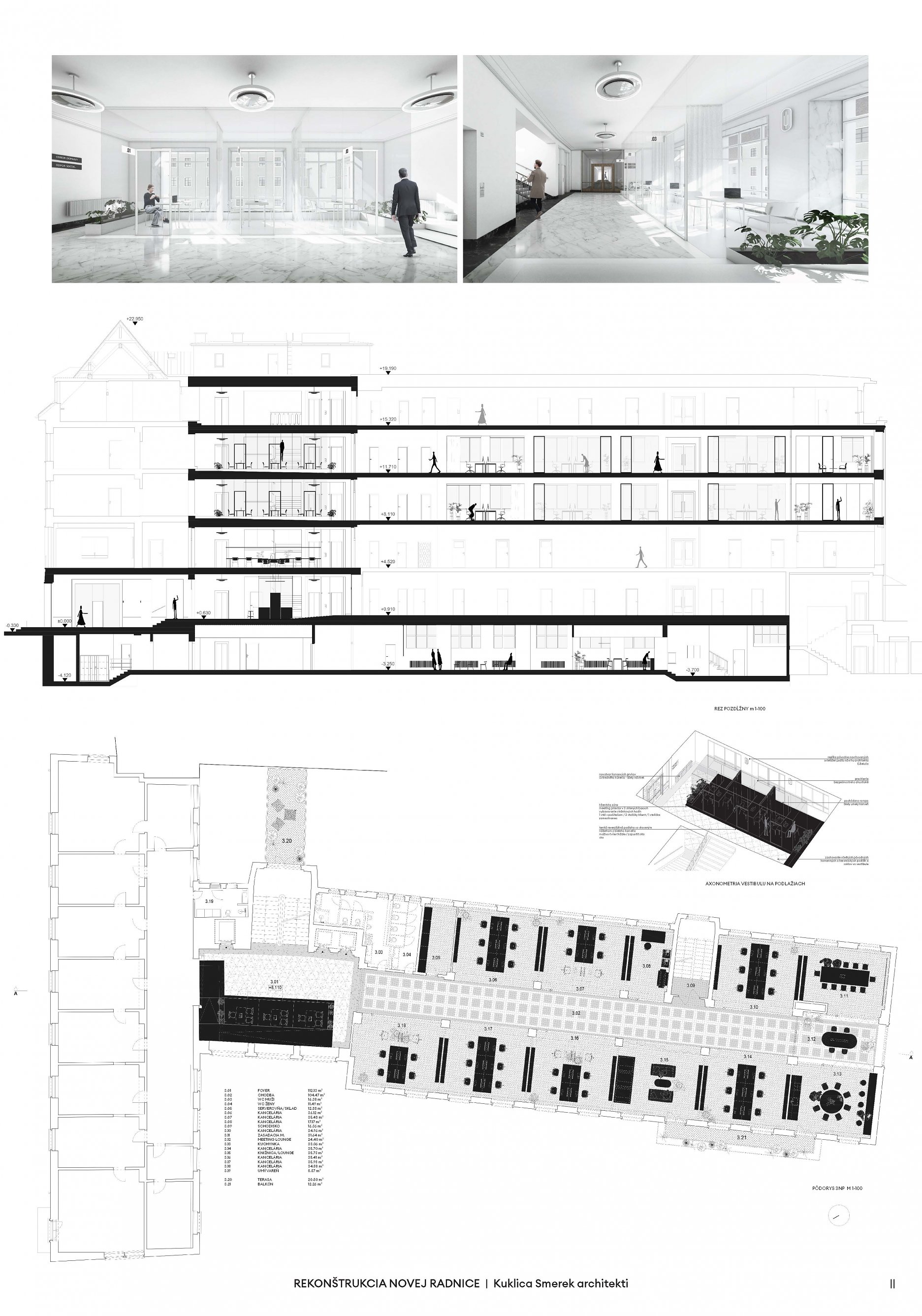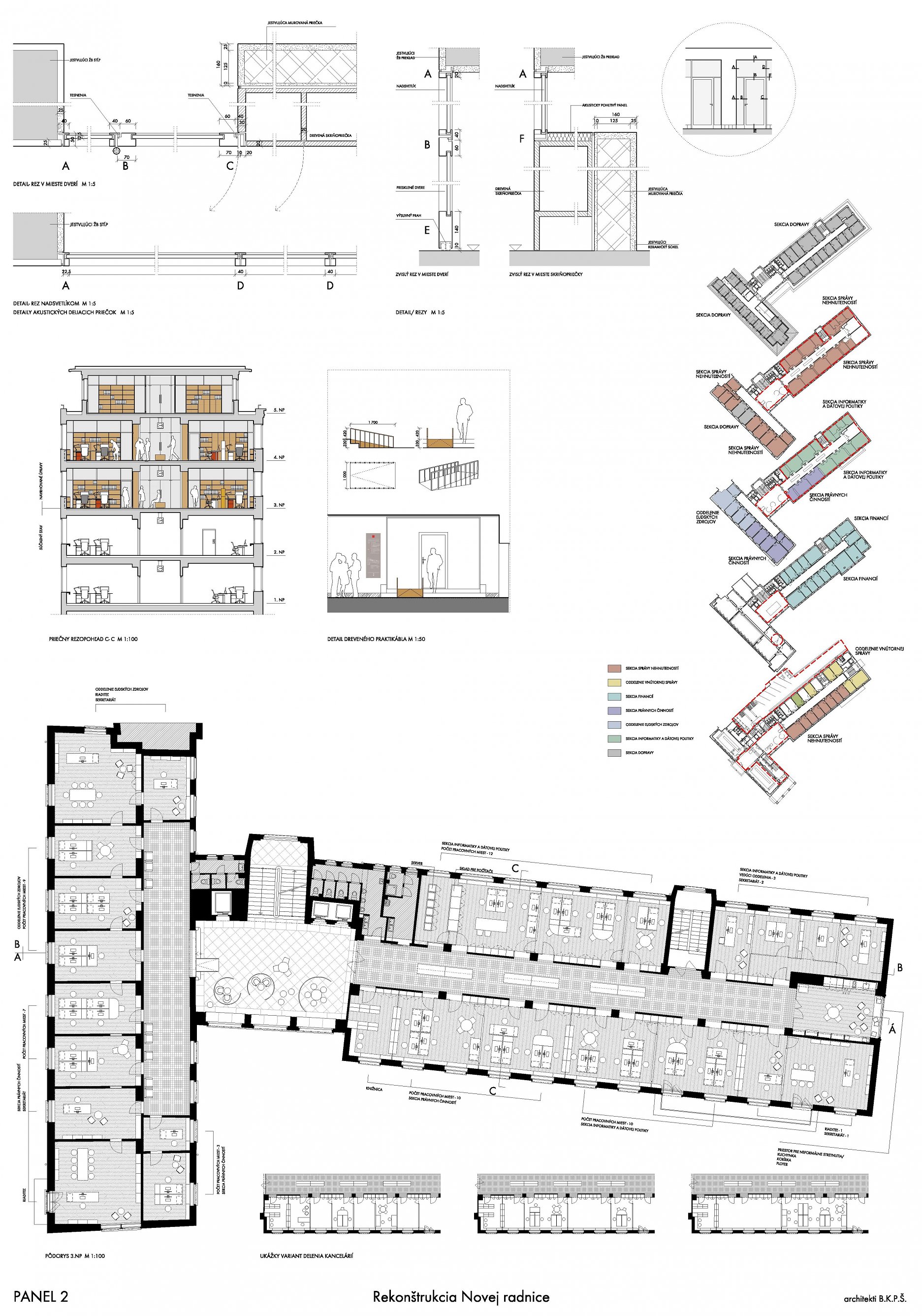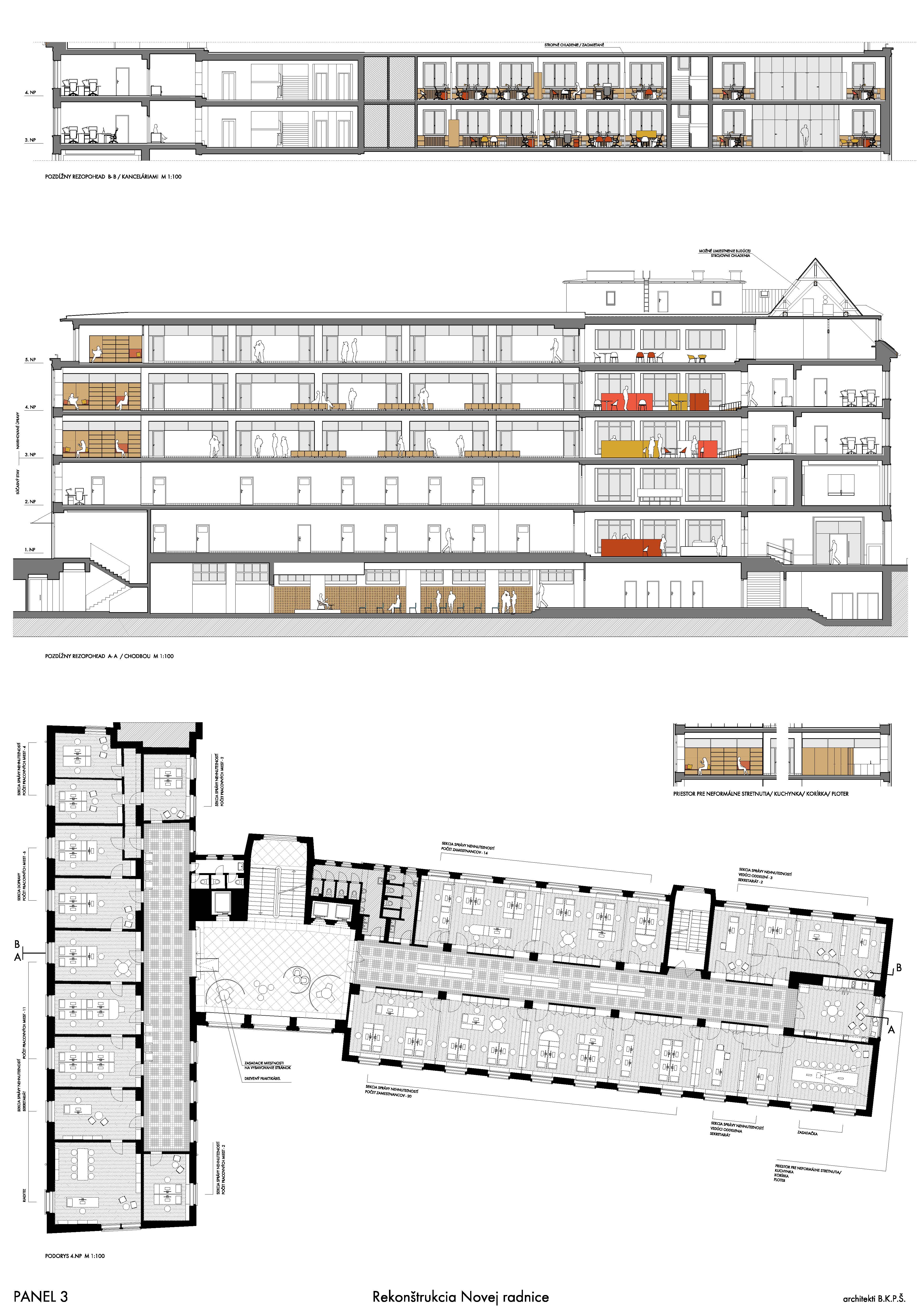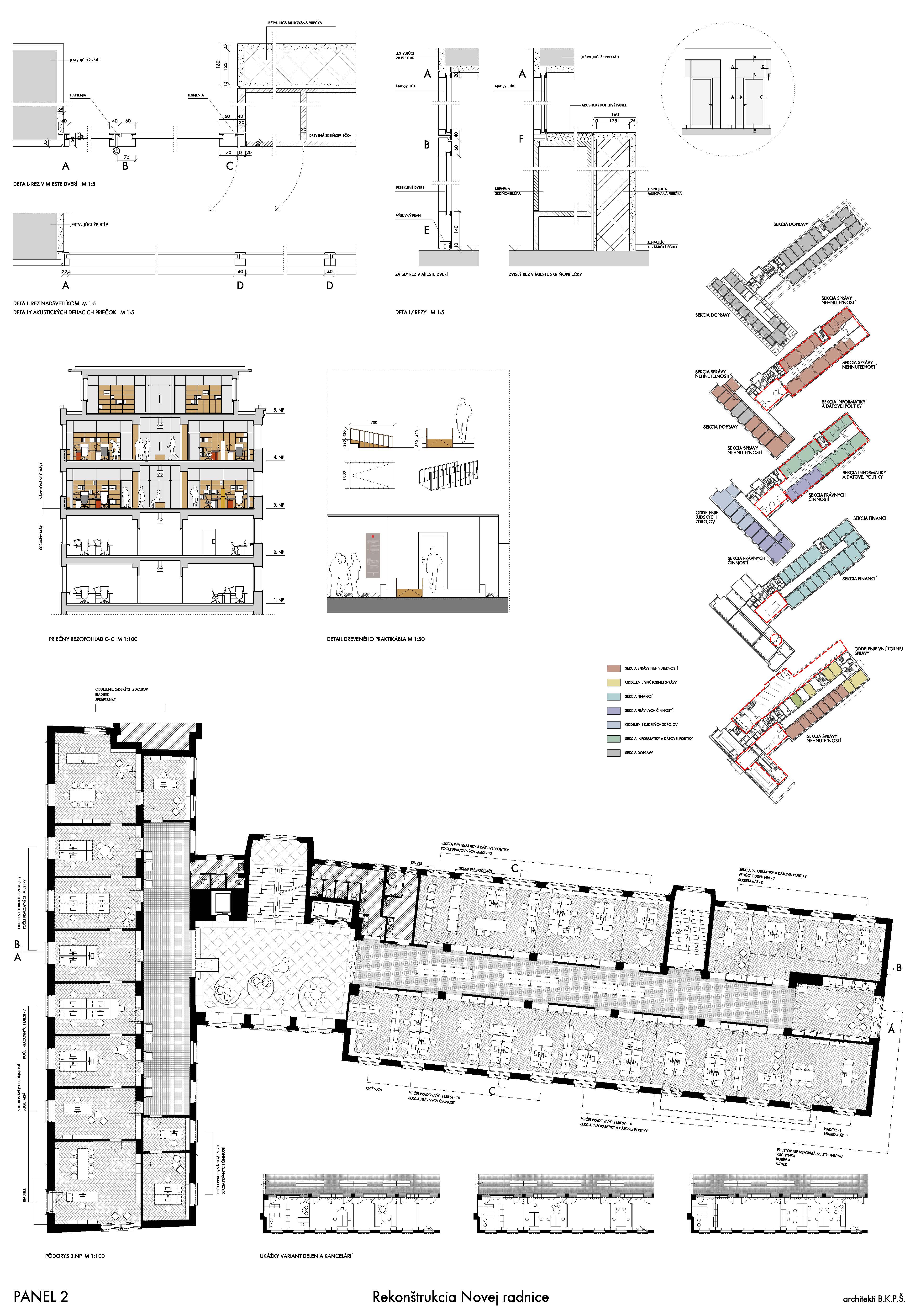 Návrh pracuje s budovou architekta E. Belluša ponechaním pôvodného členenia objektu a konštrukcií. Návrh zaujal variabilitou riešenia kancelársky priestorov, ktoré ponúkajú rôzne mierky pracovných priestorov pre zamestnancov. Autori ponúkli aj škálu doplnkových priestorov pre rôznu formu a obsah práce. Porota vníma ako pozitívum situovanie časti kuchynky v zadnej časti traktu. Riešenie spoločnej chodby doplnením o sedenie, ktoré je zároveň aj úložným priestorom, sa javí ako málo využiteľný priestor a otázne je jeho reálne využitie pri bežnom chode magistrátu. Koridor chodby preto pôsobí skôr ako čakáreň a zdá sa, akoby potenciál tohto priestoru nebol využitý napr. na konzultácie alebo neformálne stretávanie sa zamestnancov. Riešenie priestoru pri recepcii pôsobí nevhodne v nadväznosti na jednotlivé funkcie priestoru. Autori neadekvátne riešili bezbariérovosť priestorov prostredníctvom robustných rámp. Rovnako je na zváženie farebnosť a výber typových prvkov mobiliáru doplňujúcich spoločné priestory- spojovaciu časť medzi traktami.