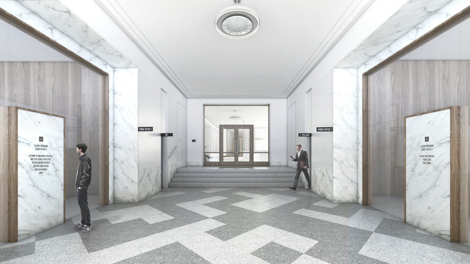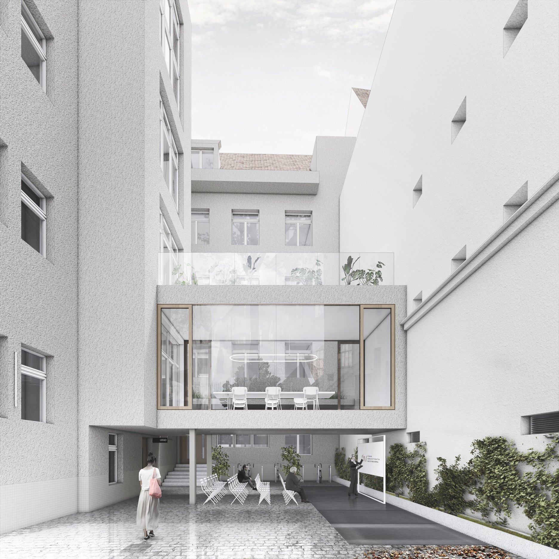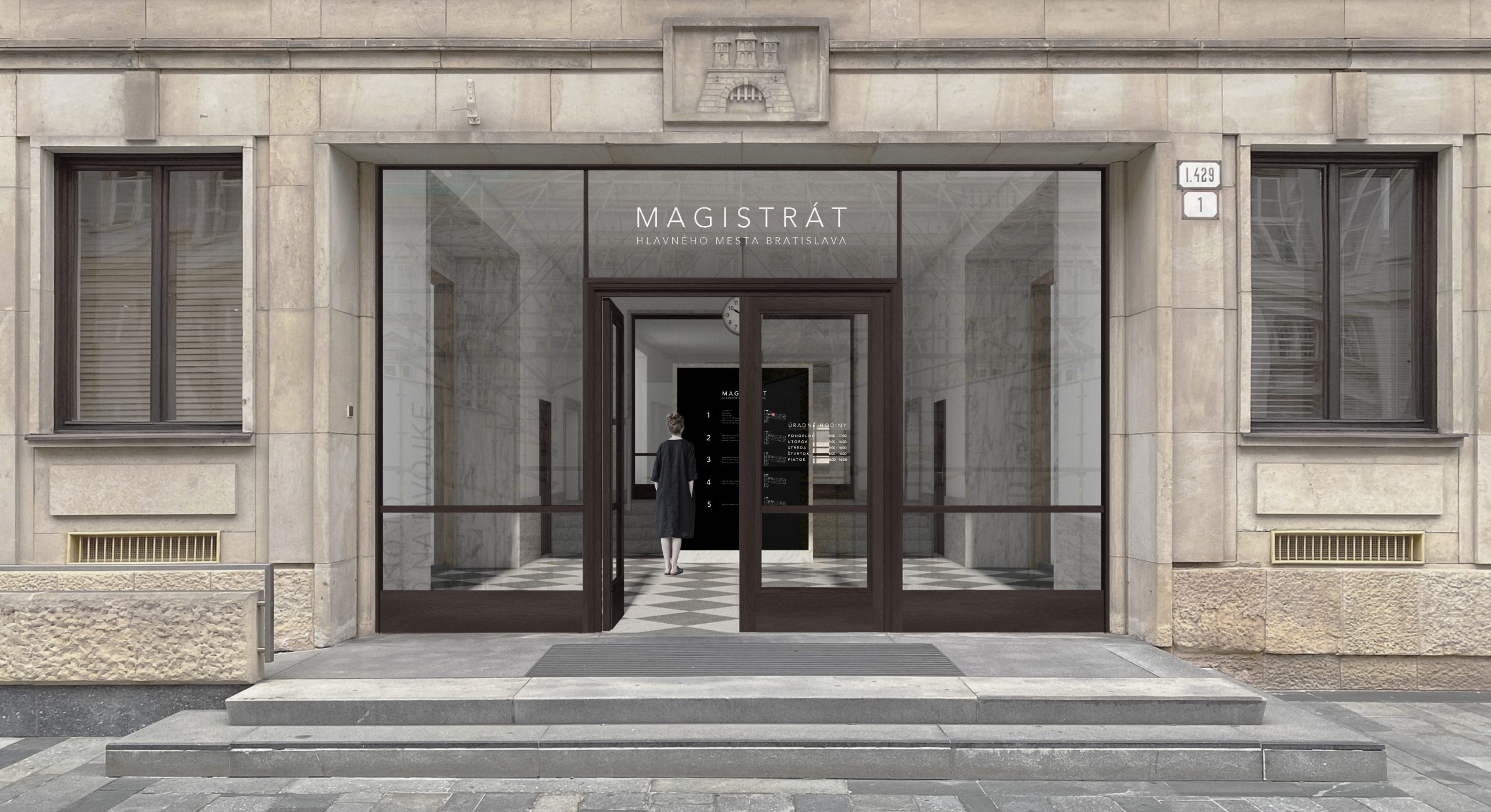 Na prvý pohľad je architektonické stvárnenie budovy citlivé a reprezentatívne, čo je kritérium, ktoré má prislúchať budove Magistrátu hlavného mesta. Spojovacia hala na vyšších podlažiach je využitá na konzultačné účely. Ich situovanie v tejto časti ponúka novú zasadaciu zónu, (určenú aj na stretávanie sa s obyvateľmi). Otázna je úmernosť zásahu, použitie materiálov, použitie nových objemov, sterilita a riešenie akustiky. Administratívne krídla na 3. a 4. NP ponechávajú v pôvodnom členení, kancelárie otvárajú do chodby, niektoré sú oddelené presklenou zástenou, doplnenou len striedmym závesom, ktorý v prípade koncentrovanej práce dokáže utlmiť rušivé vplyvy z chodby. Kancelárie sa dajú ale flexibilne prispôsobiť meniacej sa kapacitnej situácii magistrátu , avšak toto riešenie sa zdá technicky a finančne náročnejšie. Architekti síce zaujímavo pracujú s priestormi kancelárií avšak koridor chodby ostáva nevyužitý, čo vníma porota ako negatívum. V návrhu absentujú rôzne druhy zasadacích miestností, priestor na telefonovanie a priestor na samostatnú sústrednú prácu. Porota však oceňuje citlivú a dômyselnú prácu s priestorom strešnej časti, ktorá by mohla slúžiť ako ďalší exteriérový priestor určený zamestnancom. Autori veľmi dobre pracovali s dvorom a dávajú Z návrhu je cítiť snahu o “vyčistenie a upratanie” vstupného priestoru od vizuálnych nánosov, unifikujú informačný systém. Porota oceňuje zakomponovanie pôvodnej materiality v podlahách a vyjadrenie sa k bezbariérovosti objektu na všetkých podlažiach. Otázna je však robustnosť a citlivosť tohto riešenia. Porota napriek tomu diskutovala o potenciáli poskytnutých riešení. Zásadným sa jej zdal ale sterilný prístup autorov. Otázna je samotná realizovateľnosť riešenia vzhľadom na finančnú náročnosť návrhu.