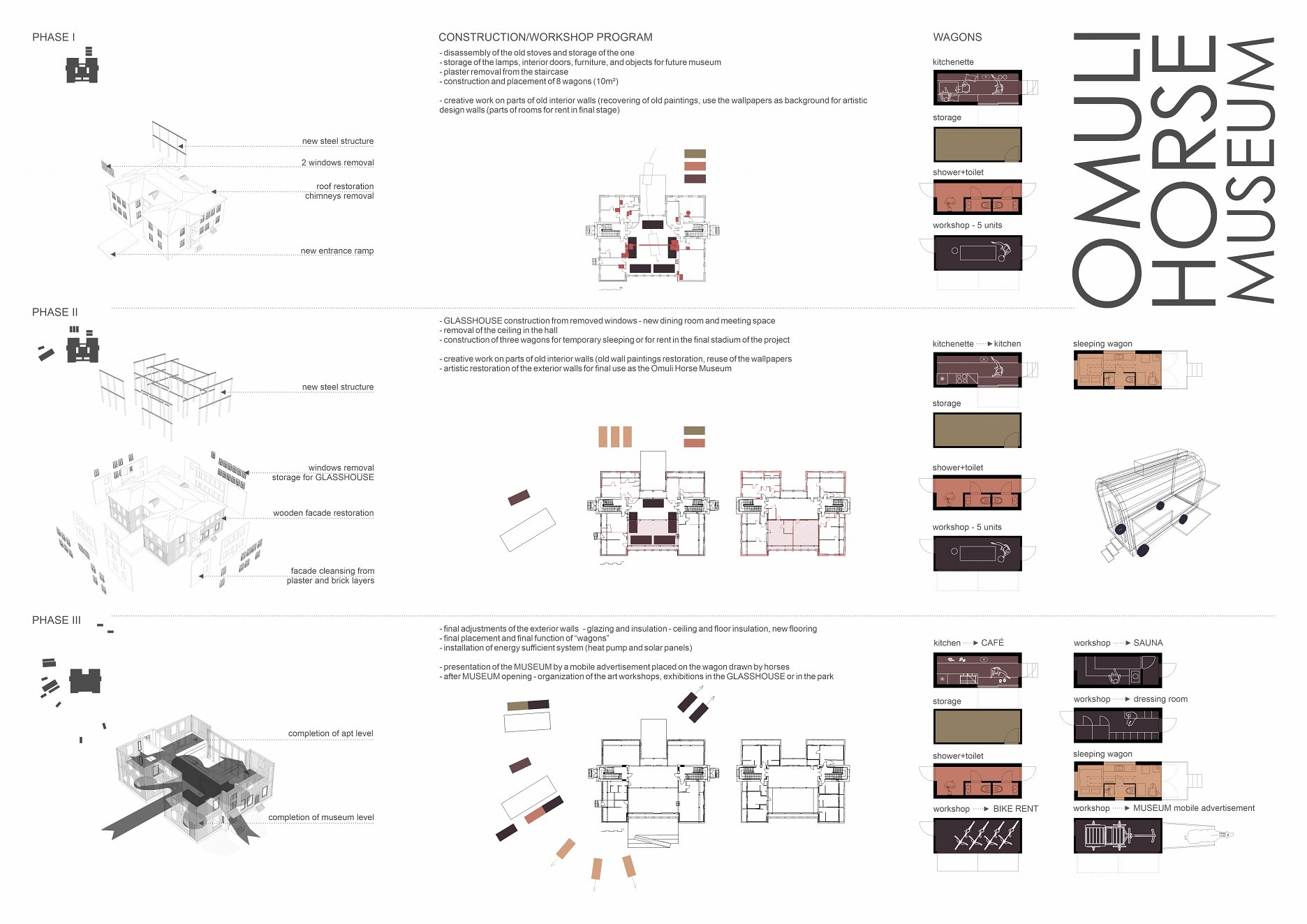 During the process of recovering Omuli School and its transformation to Omuli Horse Museum, there are designed 11 small wagons – inspired by those drawn by horses, which are changing their function and after opening stays in the area as stable or flexible part of the new operation. As well, the removed original windows are used for the design of the new additional space created near to main building - Glasshouse, which together with restoration of wooden stall and stone cellar makes upcycling the main theme of this project.