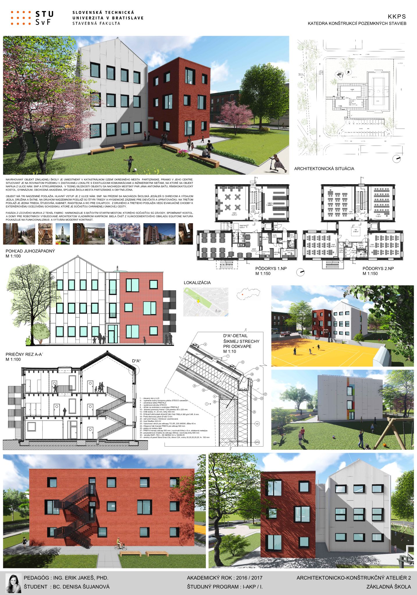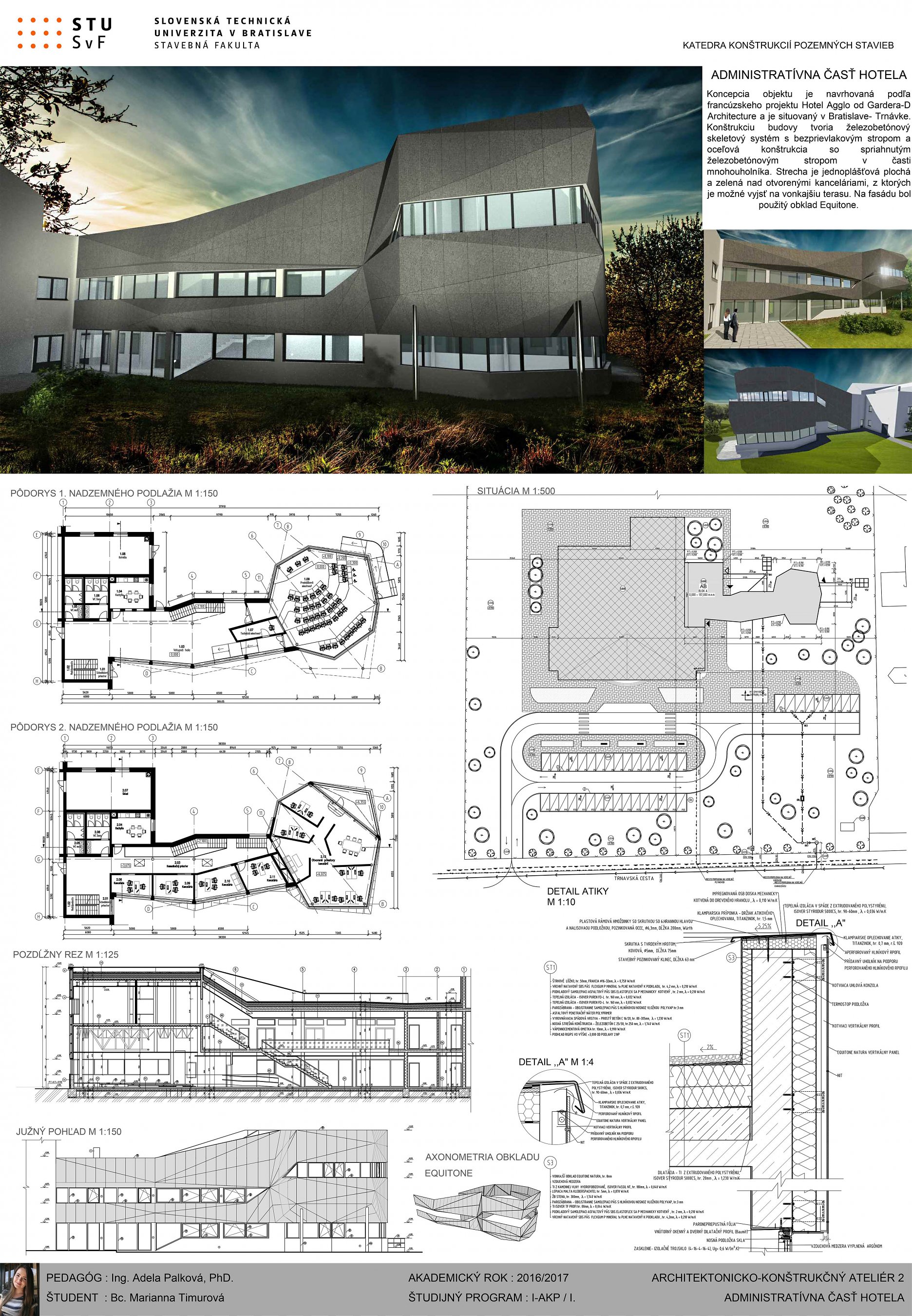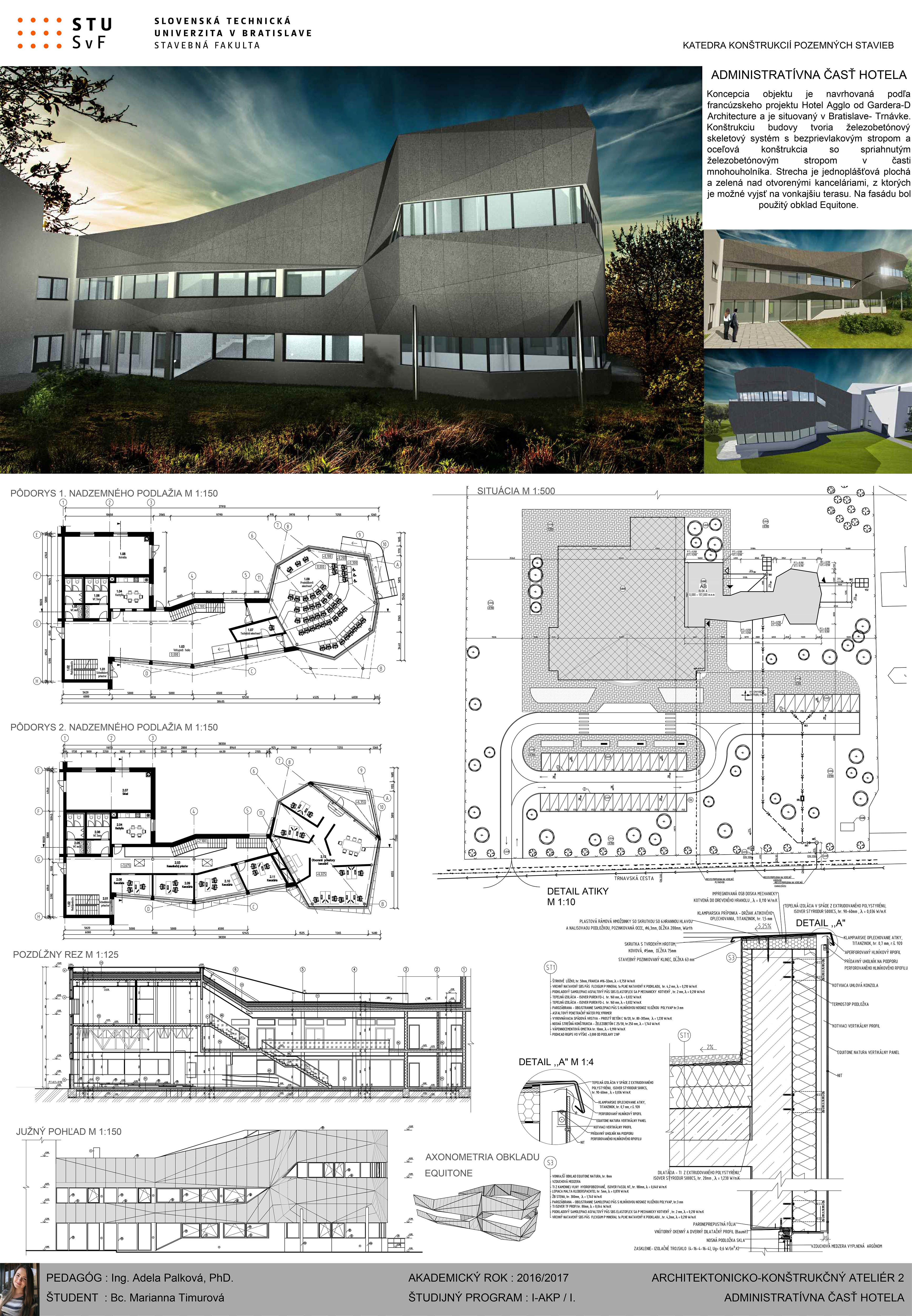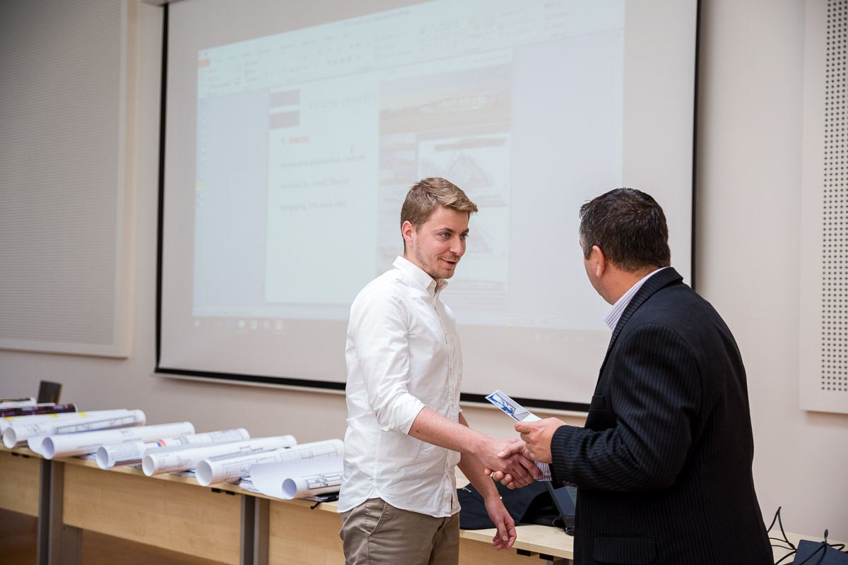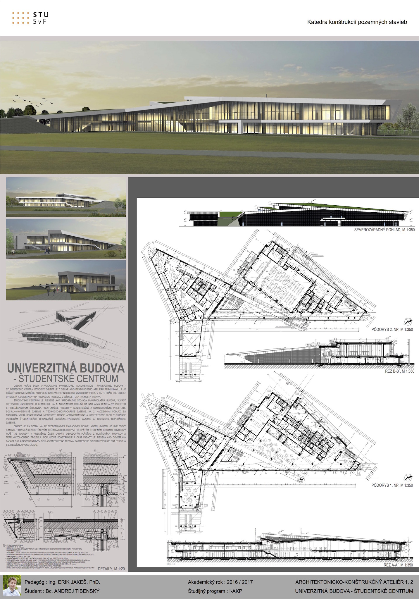 Víťaz súťaže nenavrhoval samotnú architektúru univerzitnej budovy – študentského centra, ale riešil technickú stránku a celé poňatie a koncept projektu. Juraj Palamarčuk to hodnotí nasledovne: „Na výhernej práci nás predovšetkým zaujalo skombinovanie obkladového materiálu so sklom, pričom študent veľmi zaujímavo zvládol dynamický tvar a riešenie objektu. Vyzdvihol by som aj napojenie centra na infraštruktúru, pričom výherca vo svojom projekte nezabudol ani na dostatok zelene či oddychových zón v okolí budovy.“ Študentské centrum je založené na železobetónovej základovej doske, nosný systém je skeletový s monolitickými železobetónovými stĺpmi a monolitickými predpätnými stropnými doskami. Obvodový plášť je tvorený v prevažnej časti z hliníkových profilov a tepelnoizolačného trojskla. Doplnkové konštrukcie a časť fasády je riešená ako odvetraná fasáda s vláknocementovým obkladom EQUITONE Tectiva. „Equitone fasádne dosky sú moderný materiál so širokou farebnou škálou. Okrem prírodných odtieňov ponúka firma rôzne farebné variácie, vďaka čomu vieme architektúru budovy vyskladať pomerne jednoducho, efektne a zaujímavo. Navyše je to materiál s výbornými vlastnosťami,“ vyzdvihuje pozitíva fasádnych dosiek Andrej. Zastrešenie objektu tvorí zelená strecha s extenzívnou vegetáciou.